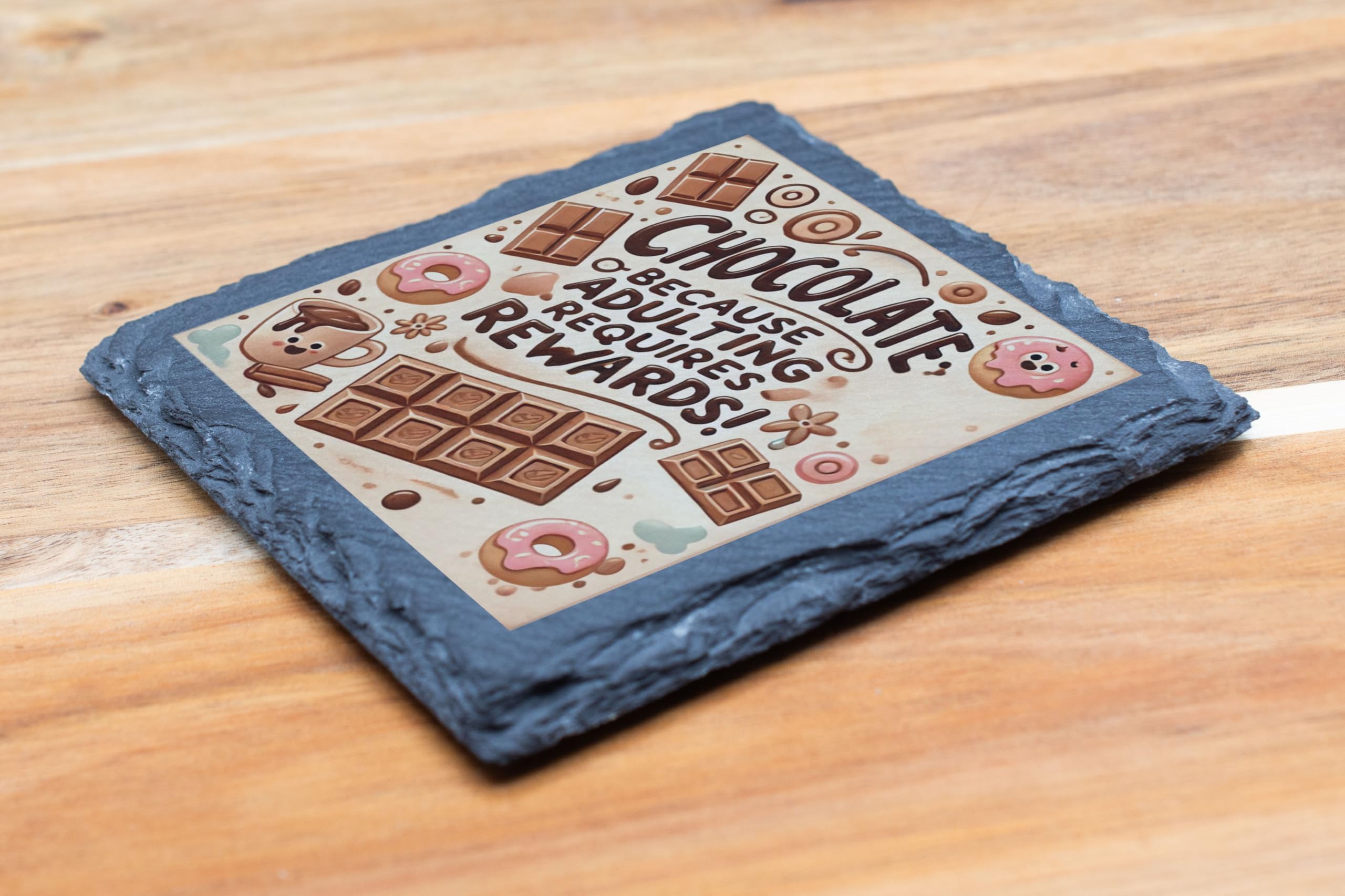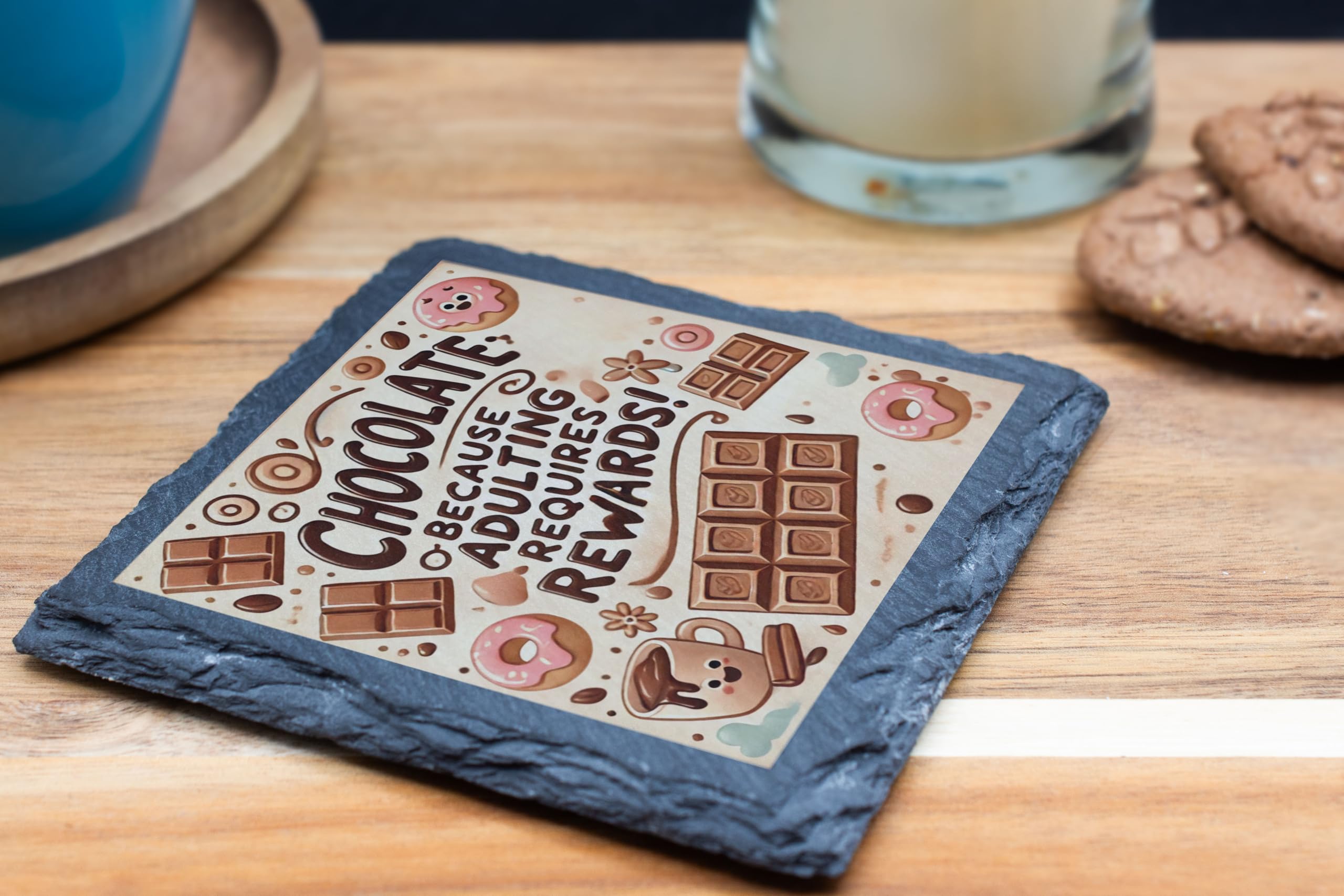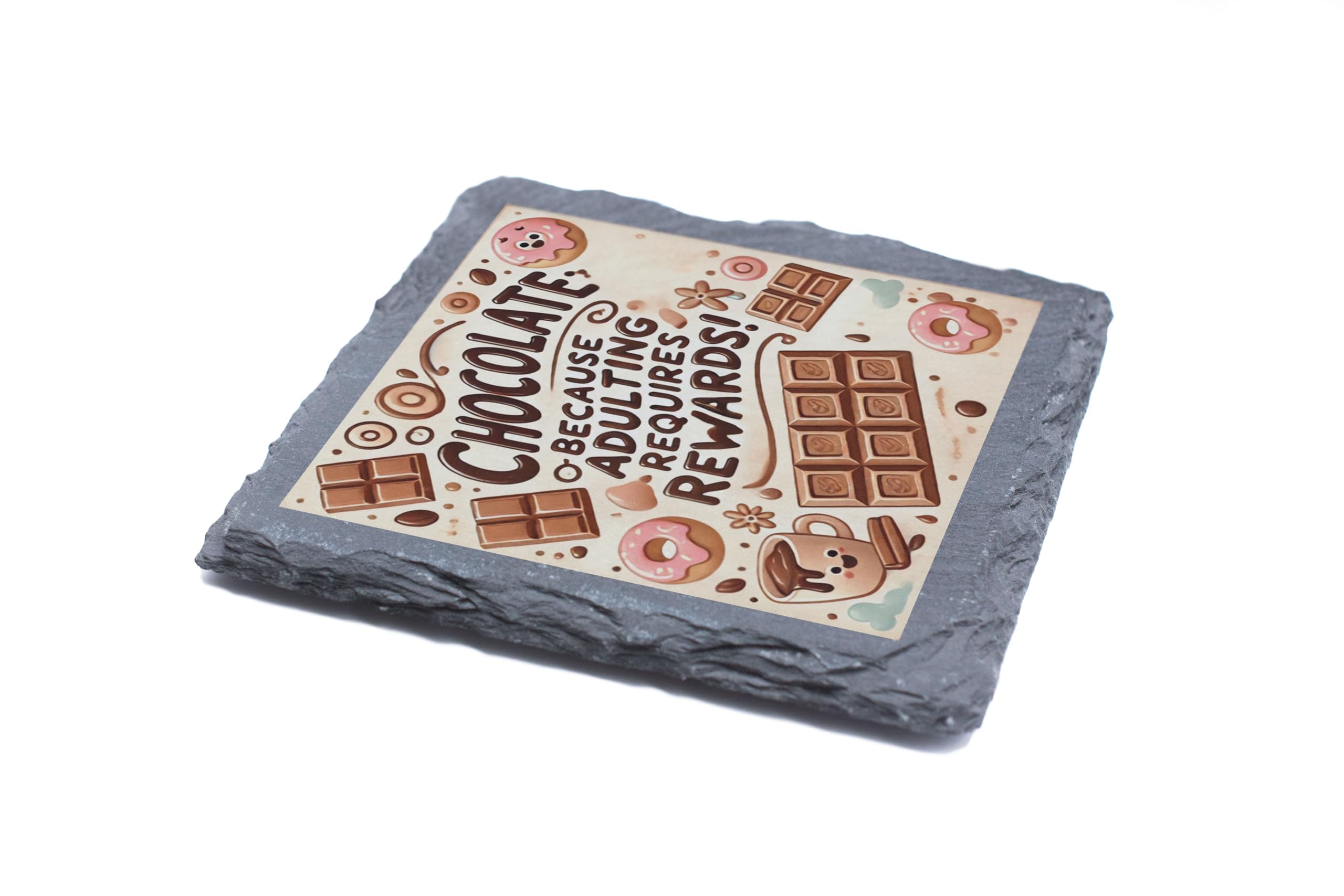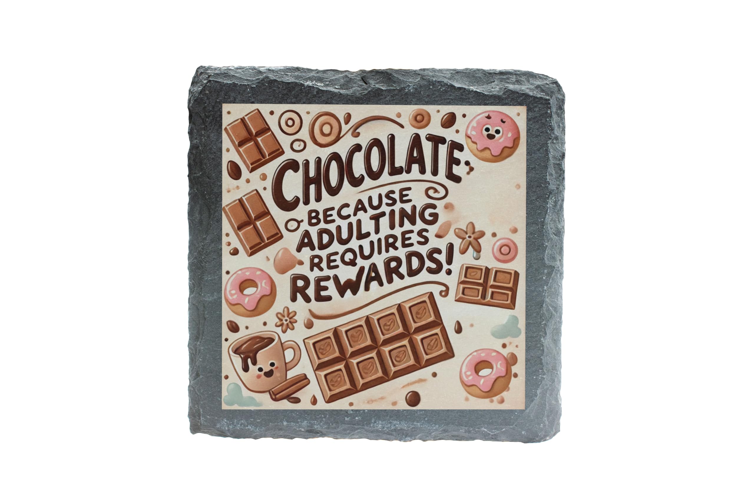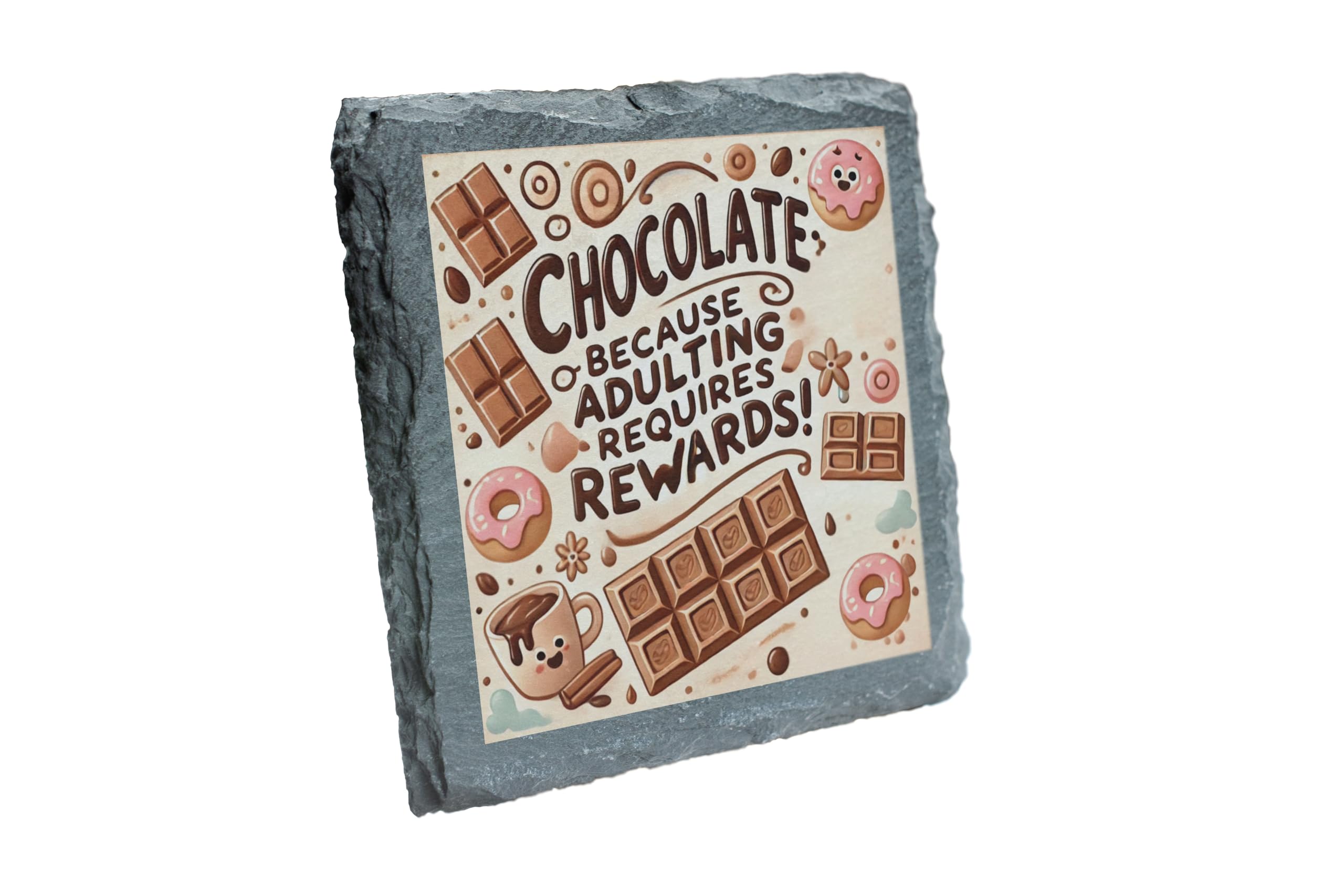 Celebrate the sweeter side of adulthood with this playful slate coaster! Featuring the humorous quote "Chocolate: Because Adulting Requires Rewards!" alongside vibrant illustrations of chocolates and donuts, this coaster is a delightful addition to any space. Crafted from durable natural slate, it combines functionality with charm, making it a great gift for chocolate enthusiasts or anyone who appreciates a touch of humor in their daily routine. Perfect for keeping furniture safe and your mood sweet!