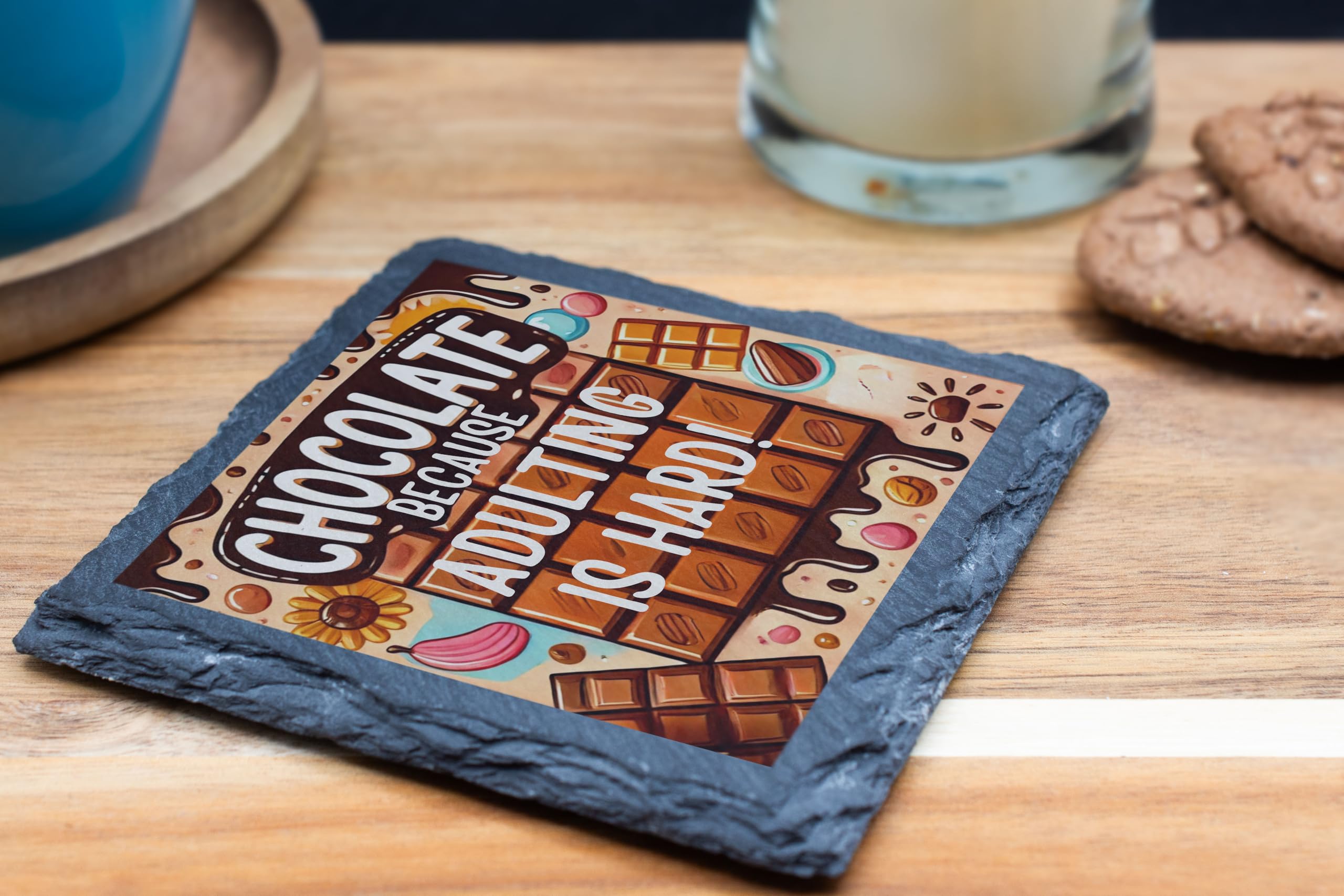 Make everyday challenges a little sweeter with this quirky slate coaster that celebrates the universal love for chocolate. Featuring the phrase "Chocolate Because Adulting is Hard!" and playful chocolate bar illustrations, it?s a must-have for those who tackle life one treat at a time. This natural slate coaster is both stylish and durable, making it the perfect blend of function and fun. Ideal as a thoughtful gift for friends, family, or coworkers who can?t resist a good laugh and a chocolate indulgence. Whether used for a cozy coffee moment or a late-night snack, this coaster is sure to bring a smile to anyone?s face.