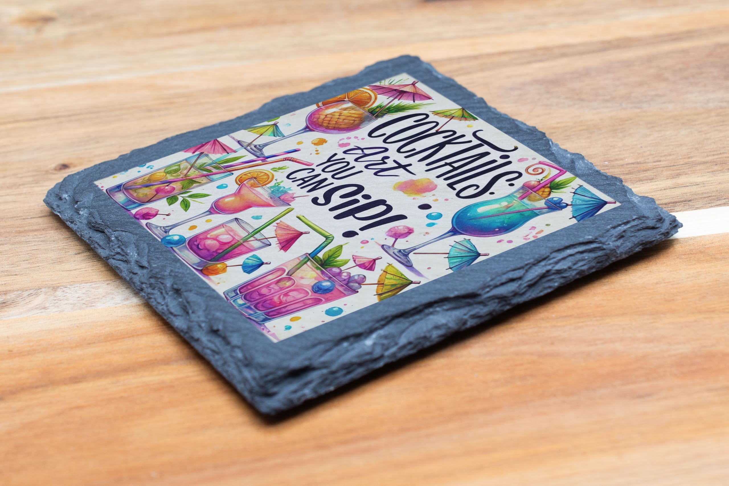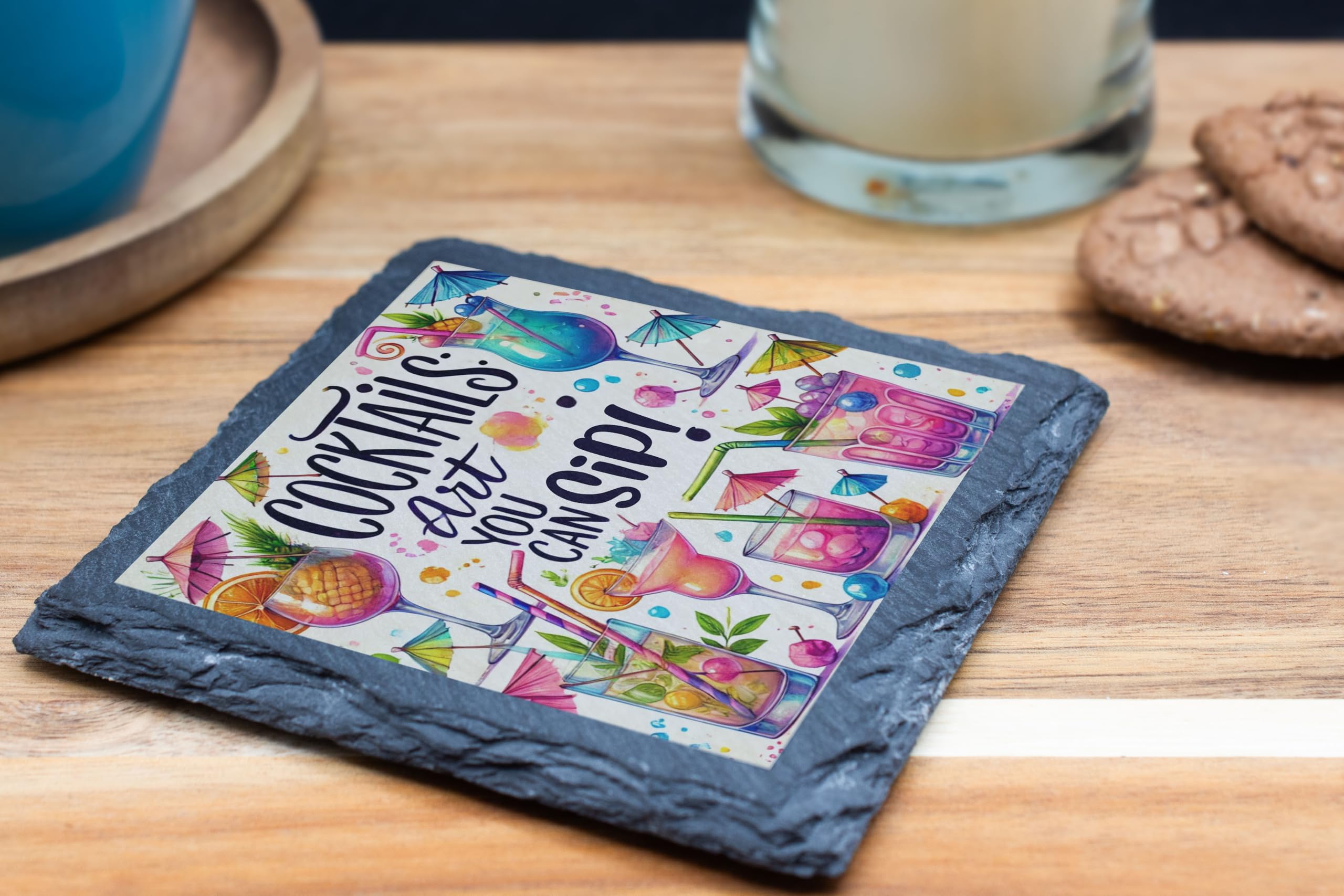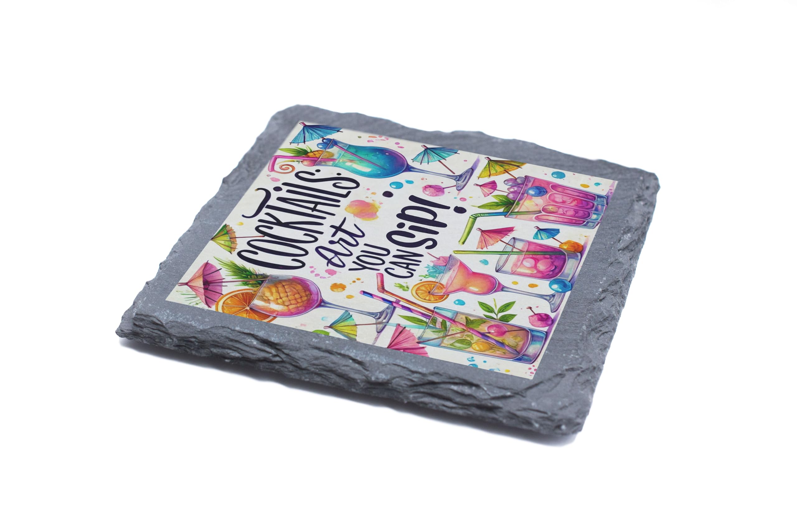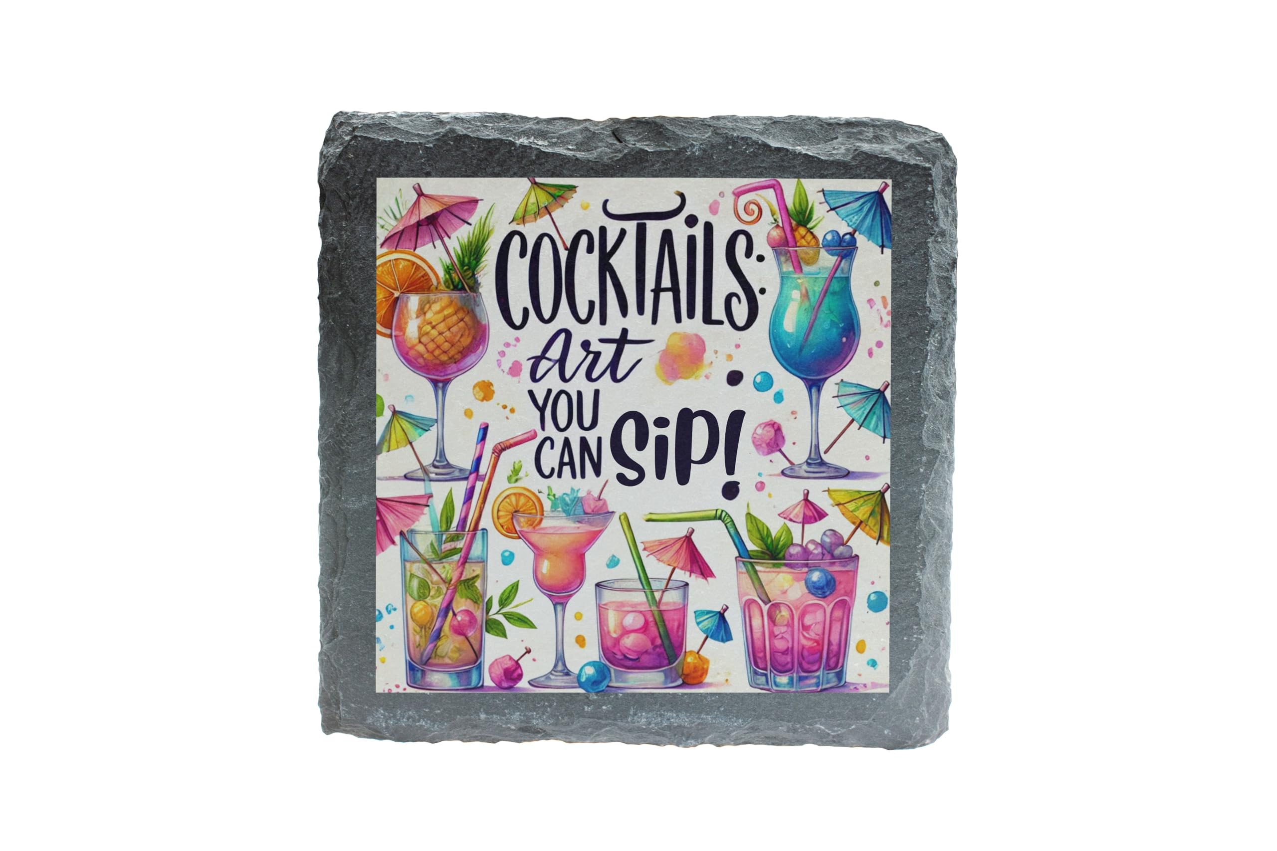 Bring a splash of color and fun to your table with this unique slate coaster! Featuring vibrant cocktail illustrations and the cheerful quote "Cocktails: Art You Can Sip!", this coaster perfectly combines practicality with artistic charm. Made from high-quality natural slate, it?s both stylish and durable, making it a great addition to your home bar, kitchen, or dining area. Whether you're hosting a party or enjoying a quiet evening drink, this coaster is a must-have for cocktail lovers and art enthusiasts alike. Cheers to functional art!