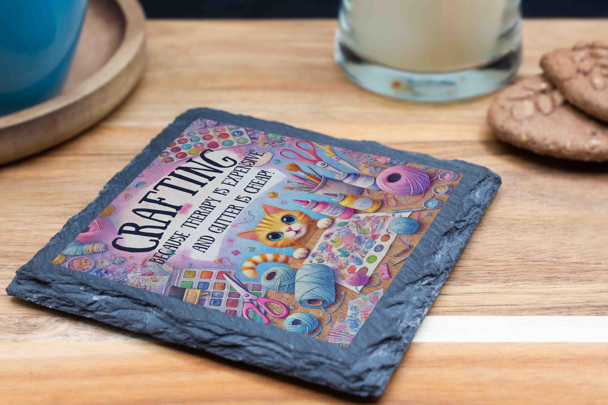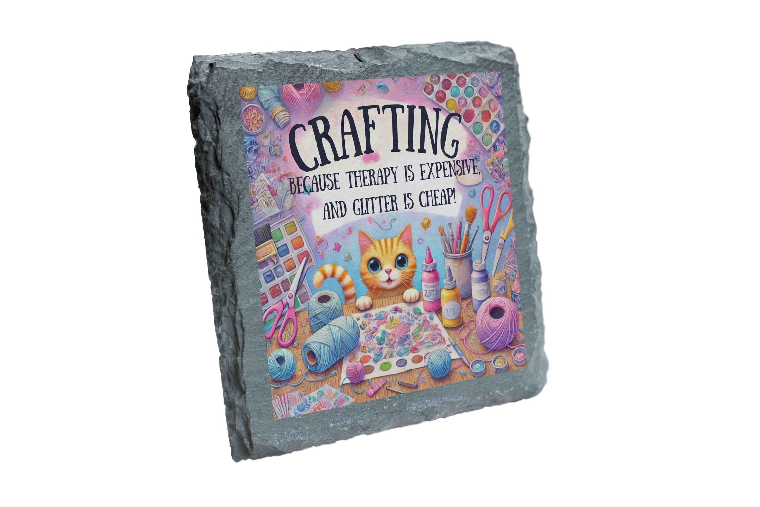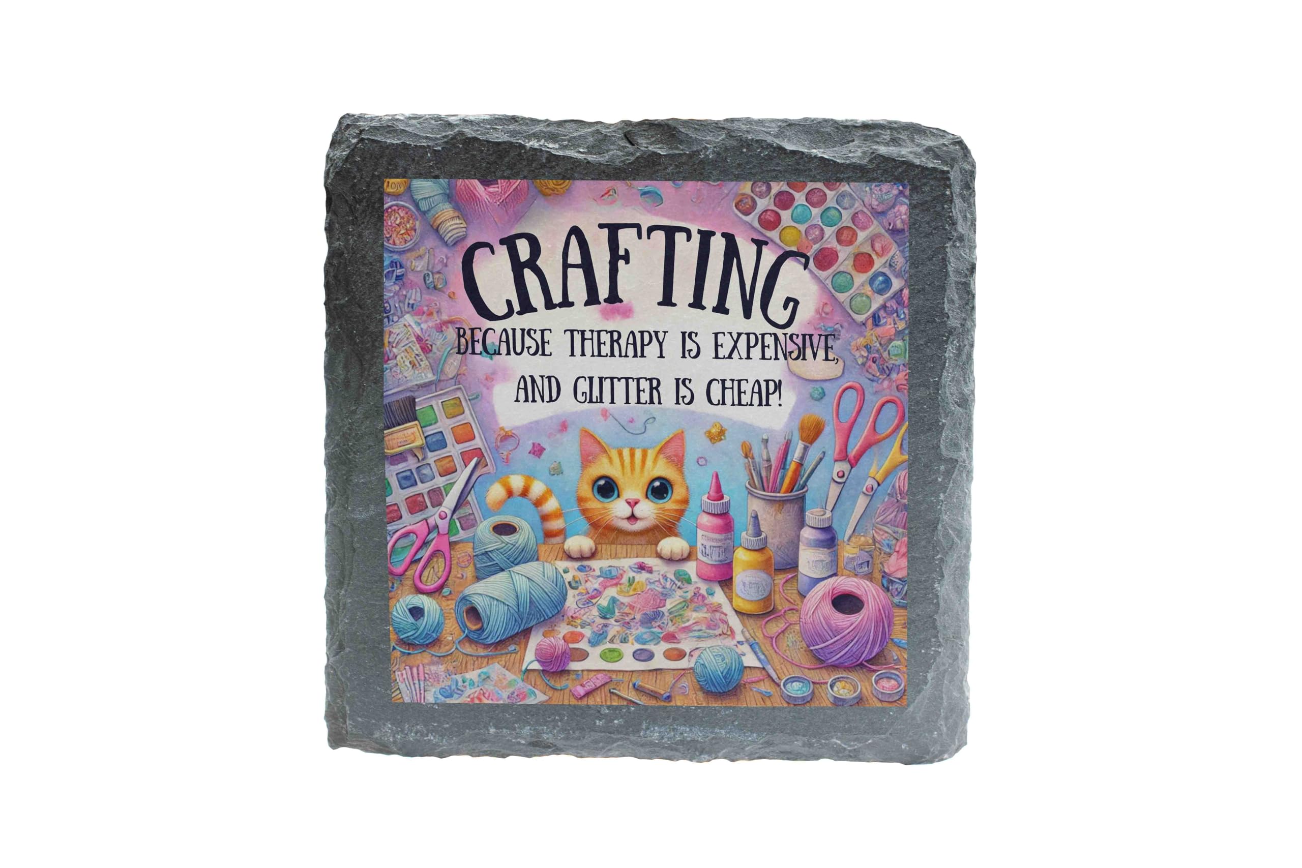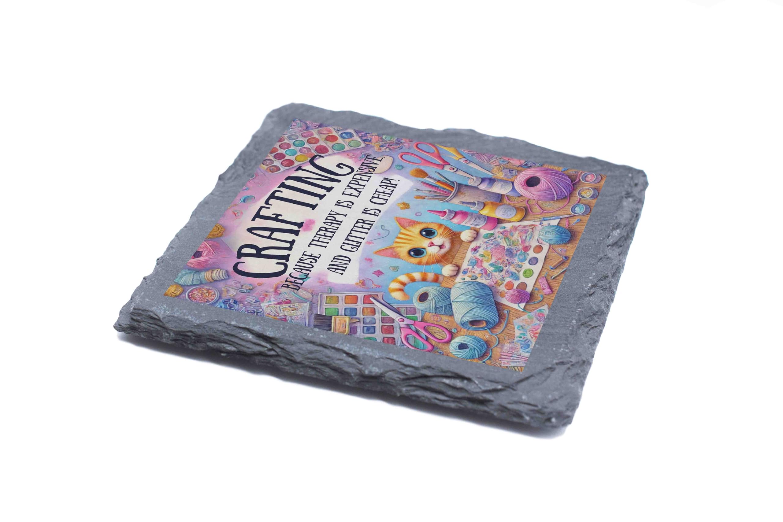 Celebrate your love for crafting with this delightful slate coaster featuring a vivid and whimsical design that combines colorful crafting essentials with a playful quote. The intricate illustration includes a cute orange cat surrounded by vibrant craft supplies like yarn, scissors, and paint, making it a perfect addition to your crafting space or coffee table. Made from natural slate, this coaster is both practical and stylish, providing a durable surface that protects your furniture from spills and stains. Its humorous sentiment, "Crafting: Because Therapy is Expensive and Glitter is Cheap," makes it a conversation starter and a thoughtful gift for friends and family who share a passion for creativity. Whether for everyday use or as a decorative piece, this slate coaster is a charming way to showcase your love for all things handmade. Perfect for birthdays, holidays, or just because?this coaster is bound to bring a smile to any crafter's face.