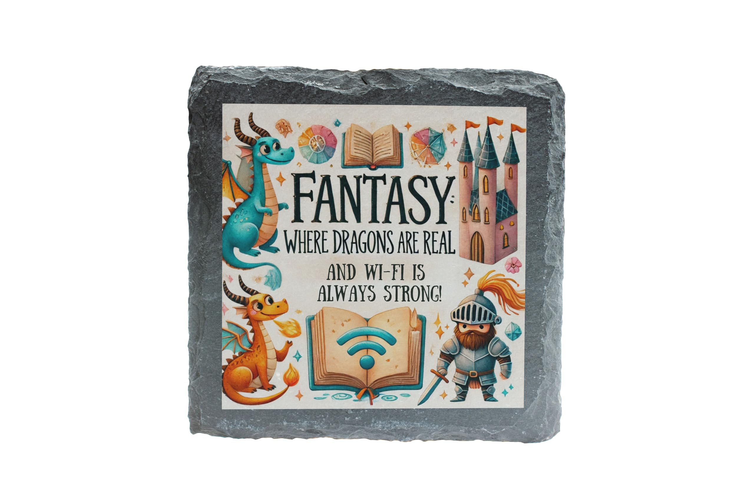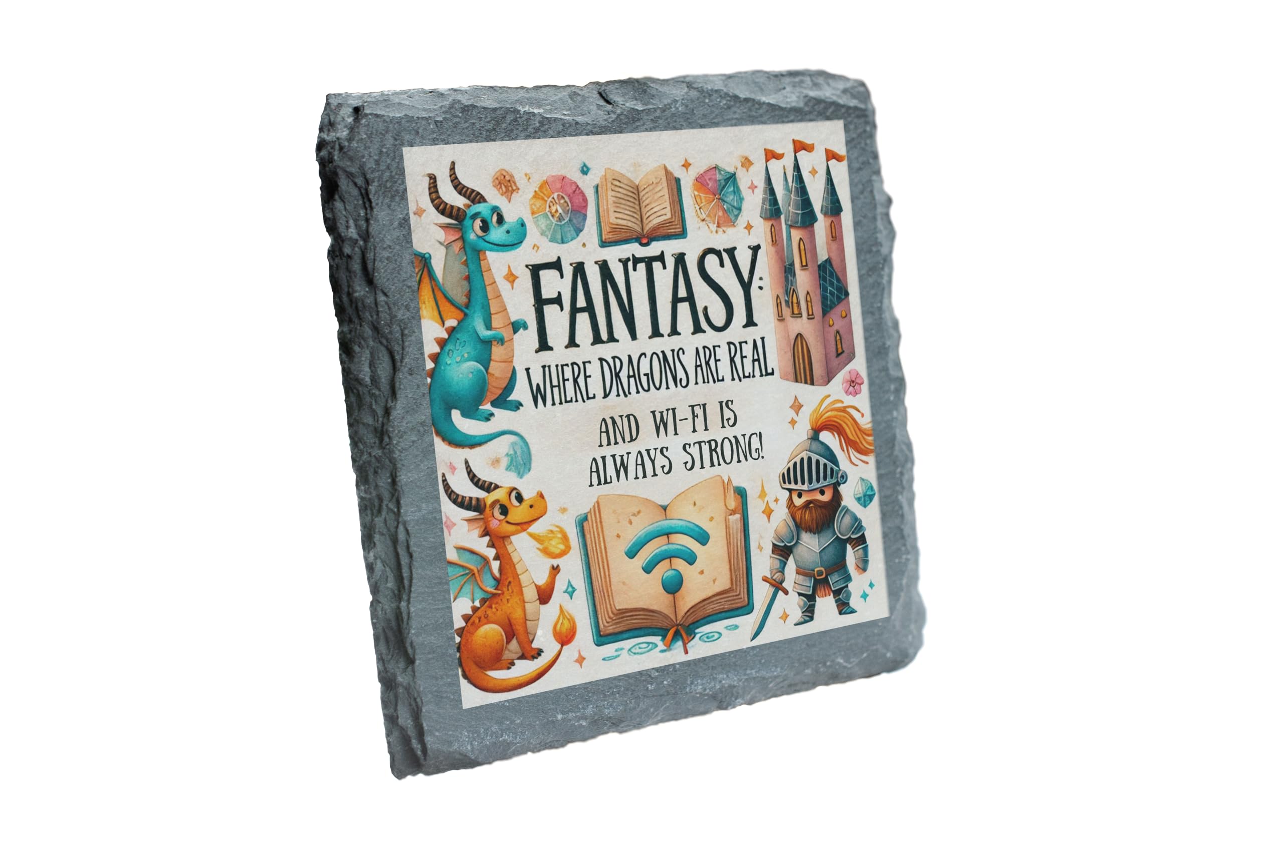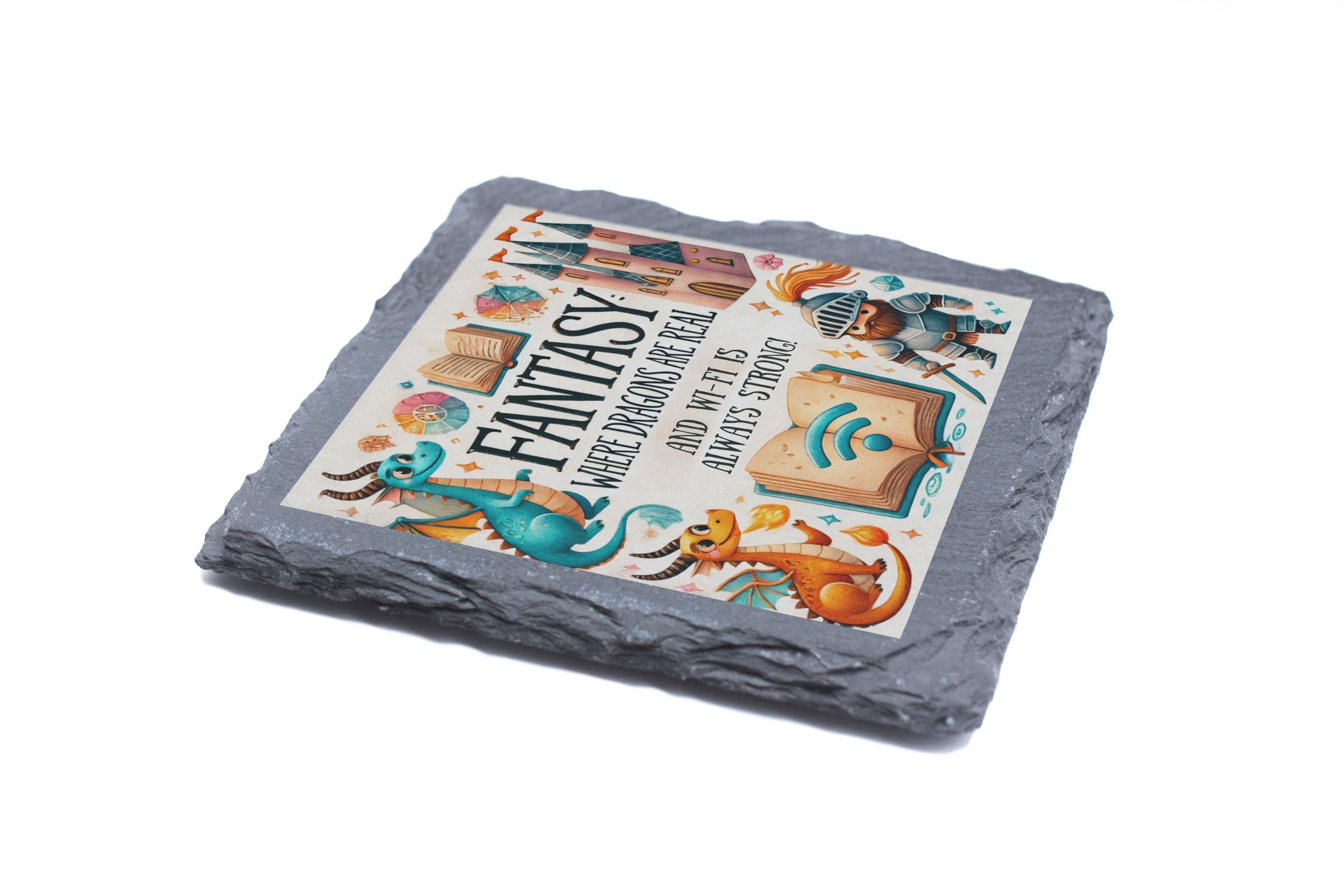 Dive into the magical realm of fantasy with this beautifully designed slate coaster that combines rustic charm with imaginative flair. Featuring playful illustrations of dragons, castles, and knights alongside the quirky phrase, "Fantasy: Where Dragons Are Real and Wi-Fi is Always Strong," this coaster is a delightful addition to your home or office. Made from natural slate, it brings a touch of medieval elegance to your tabletops while keeping them safe from spills and stains. Whether you're enjoying your morning coffee or an evening drink, this coaster sparks conversations and inspires the adventurer in you. Perfect for fans of fantasy literature, RPG gamers, or anyone who cherishes a whimsical twist on home decor, this coaster makes a thoughtful and unique gift for any occasion. Let your imagination soar while keeping your surfaces protected!