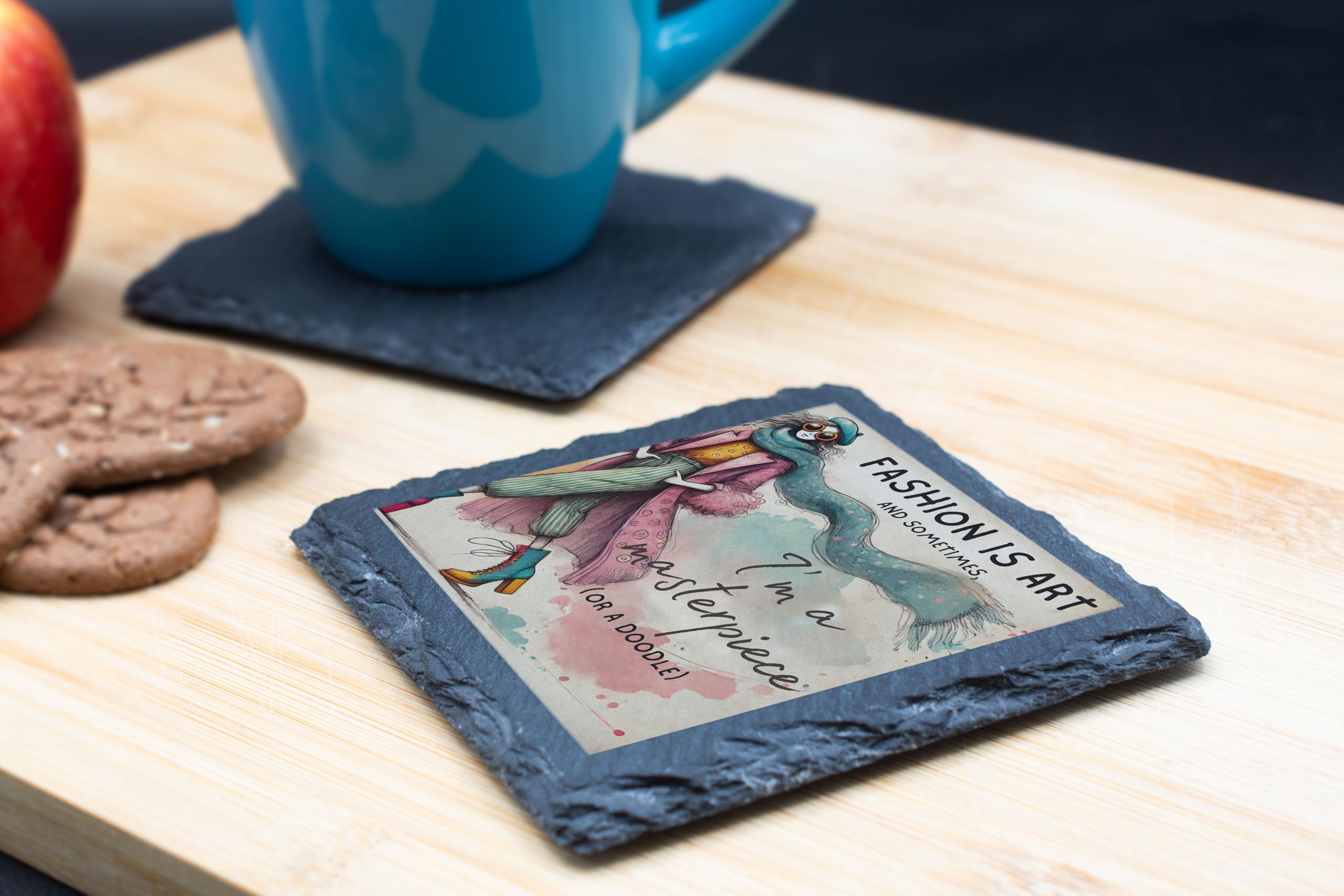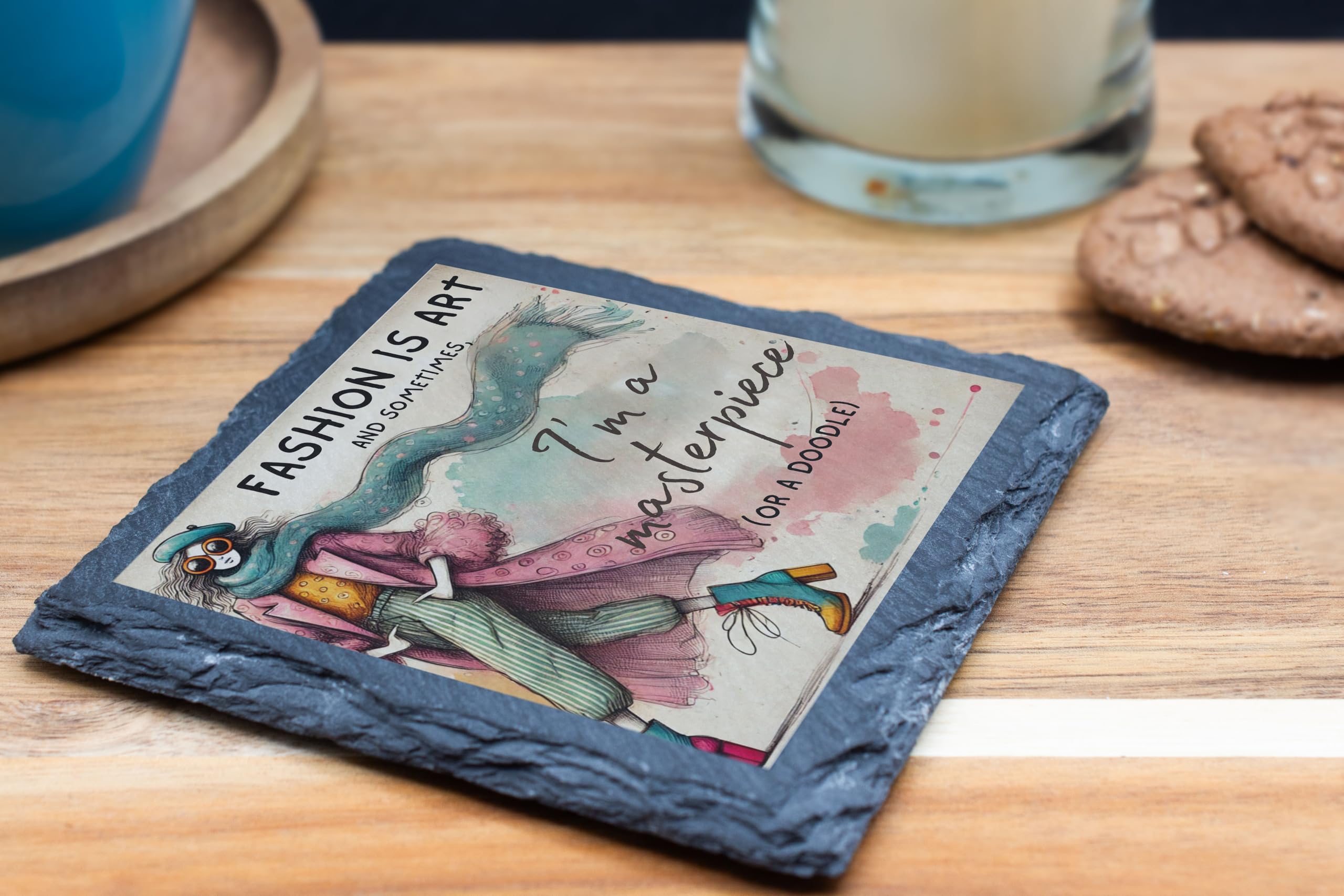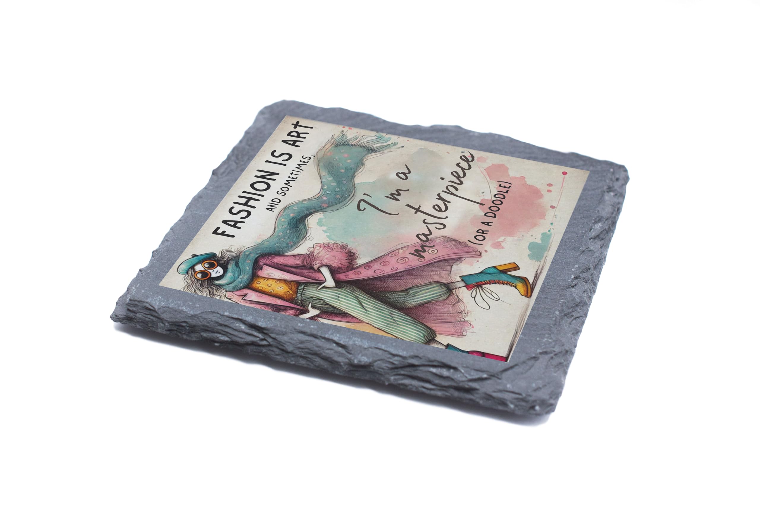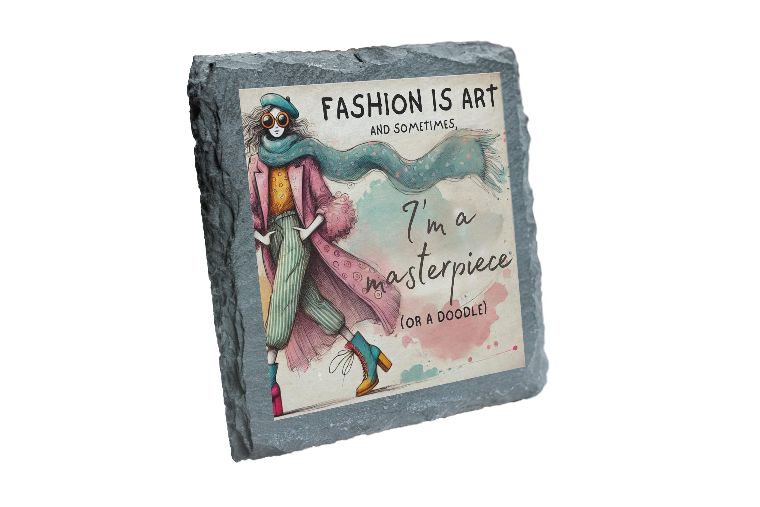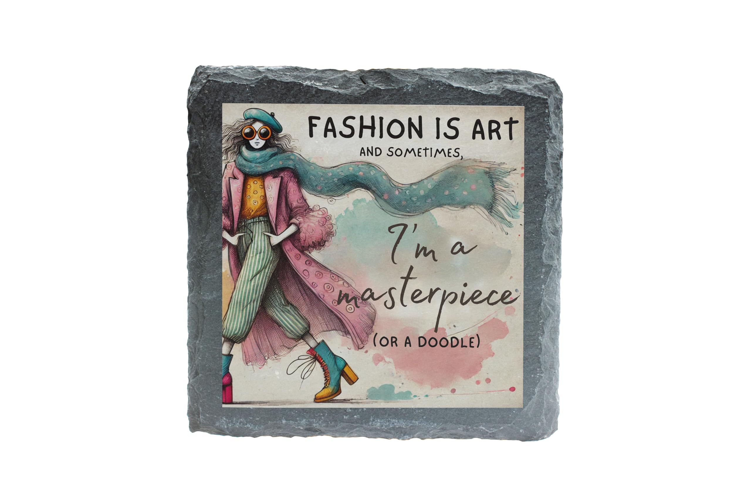 Celebrate the art of self-expression with this delightful slate coaster featuring the witty phrase "Fashion is Art: Sometimes I?m a Masterpiece (or a Doodle)." Paired with a whimsical and colorful illustration, it?s the perfect accessory for anyone who sees fashion as a creative outlet. Crafted from premium natural slate, this coaster is as durable as it is stylish. It provides excellent protection for your furniture from spills, heat, and scratches while making a bold statement. Ideal for home offices, studios, or coffee tables, it brings charm and personality to any space. This coaster is a thoughtful gift for fashion lovers, designers, or anyone who appreciates fun and quirky decor. Whether it?s for a birthday, holiday, or just because, this unique accessory is sure to delight. Elevate your space with this stylish and functional tribute to fashion?s playful side!