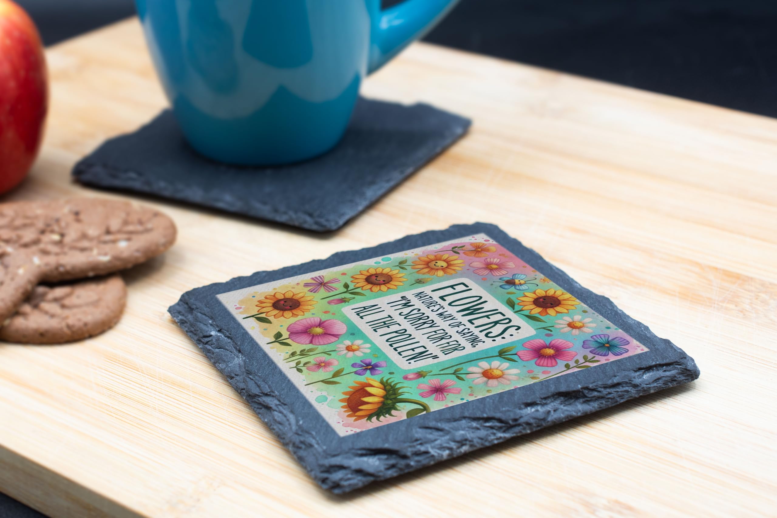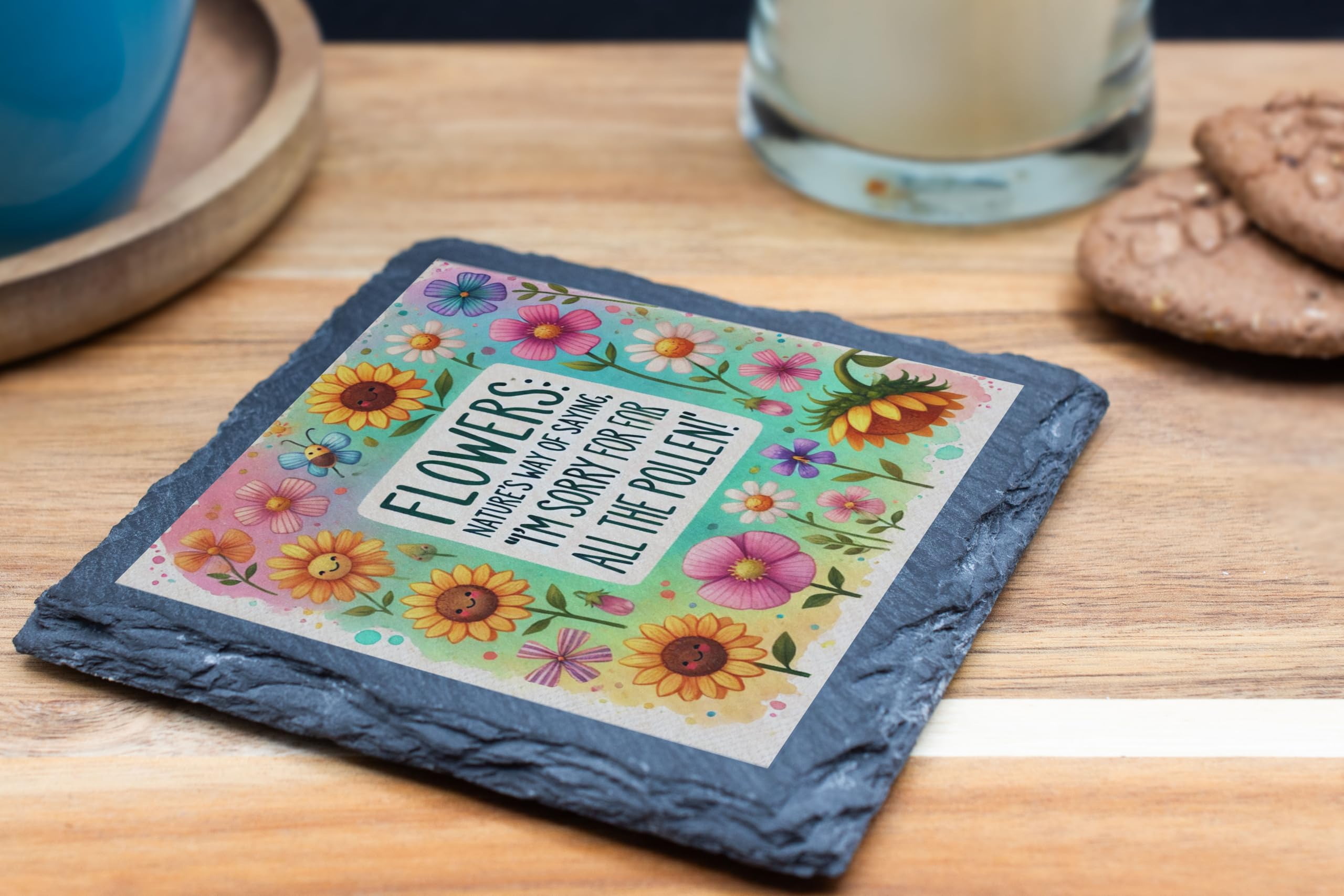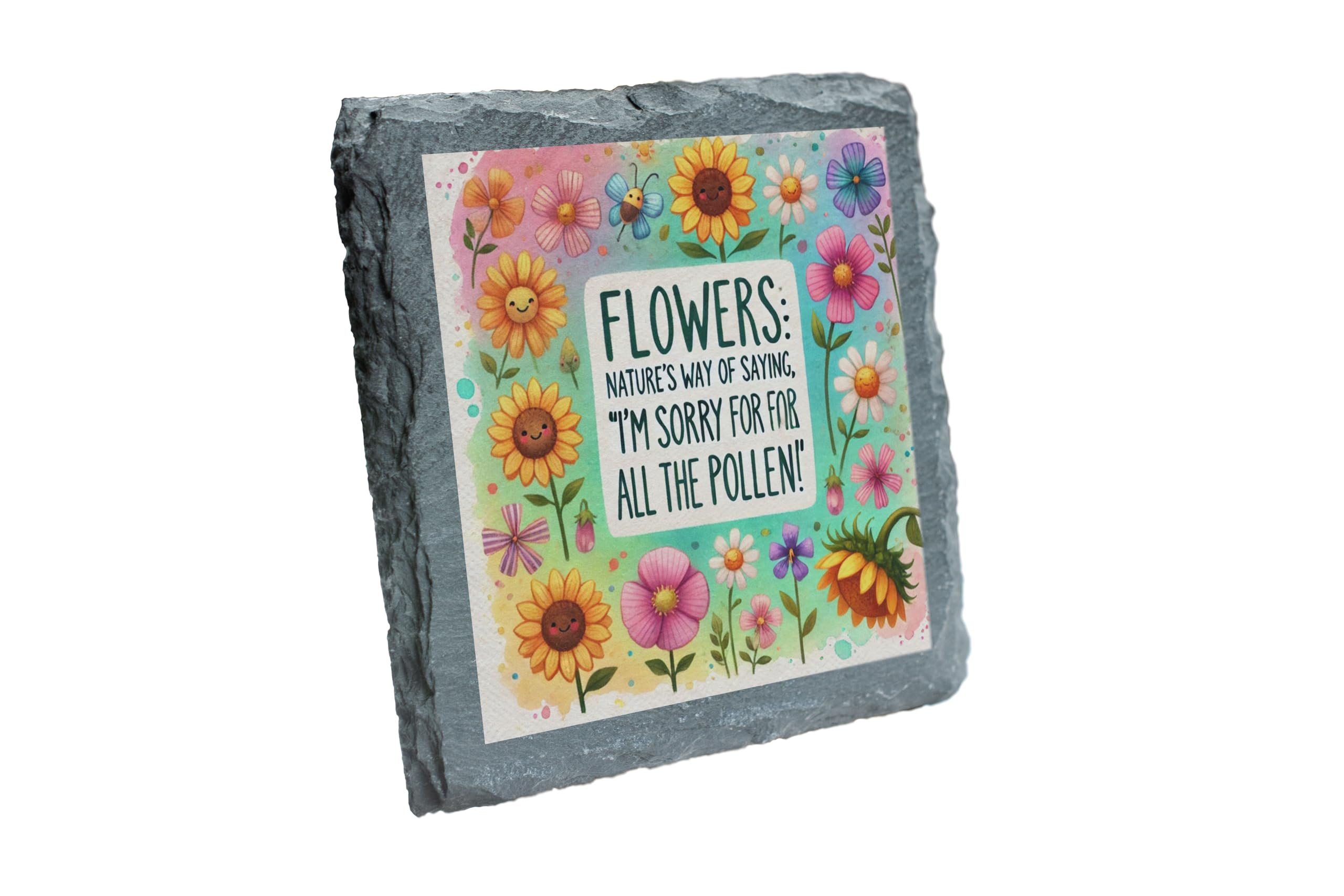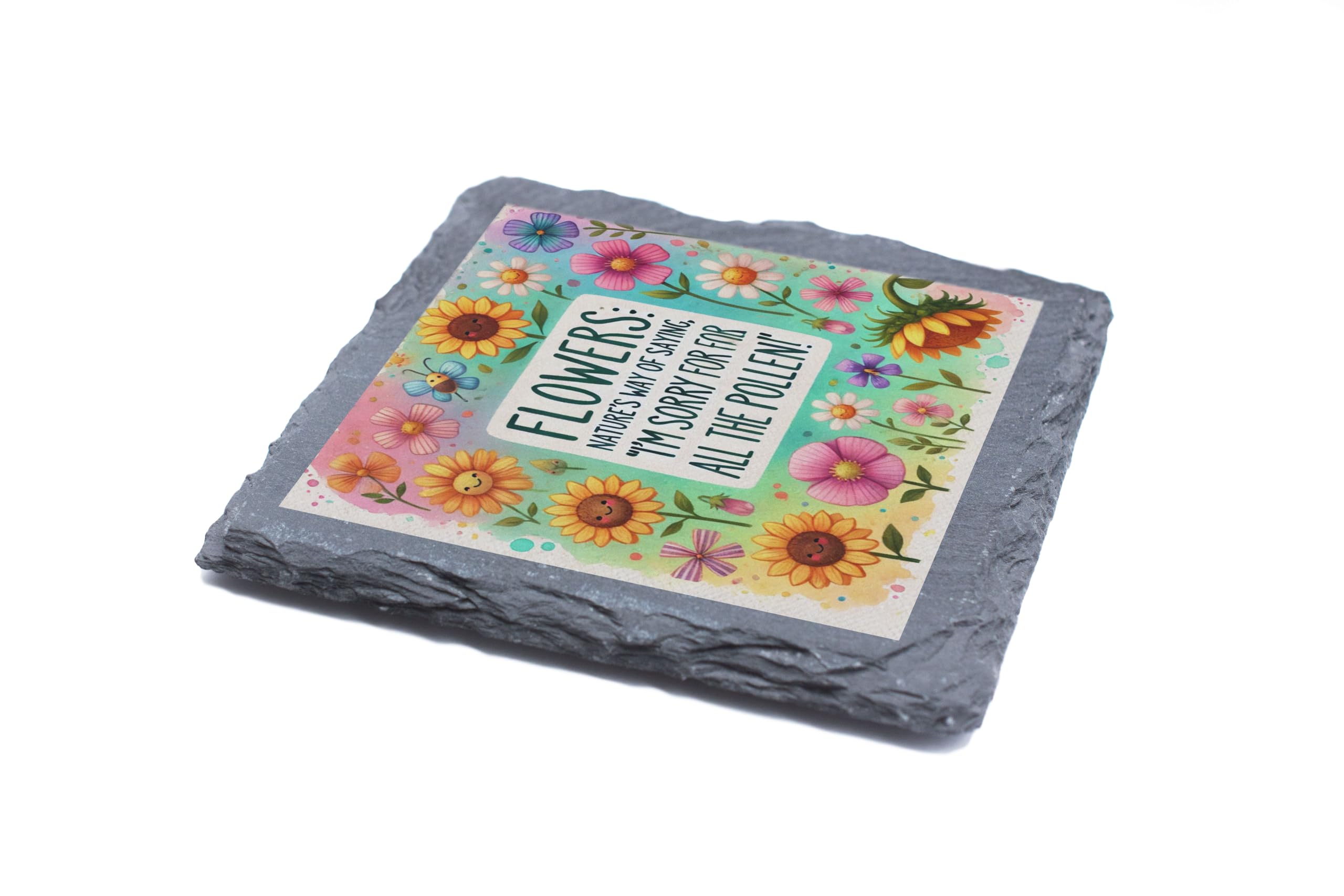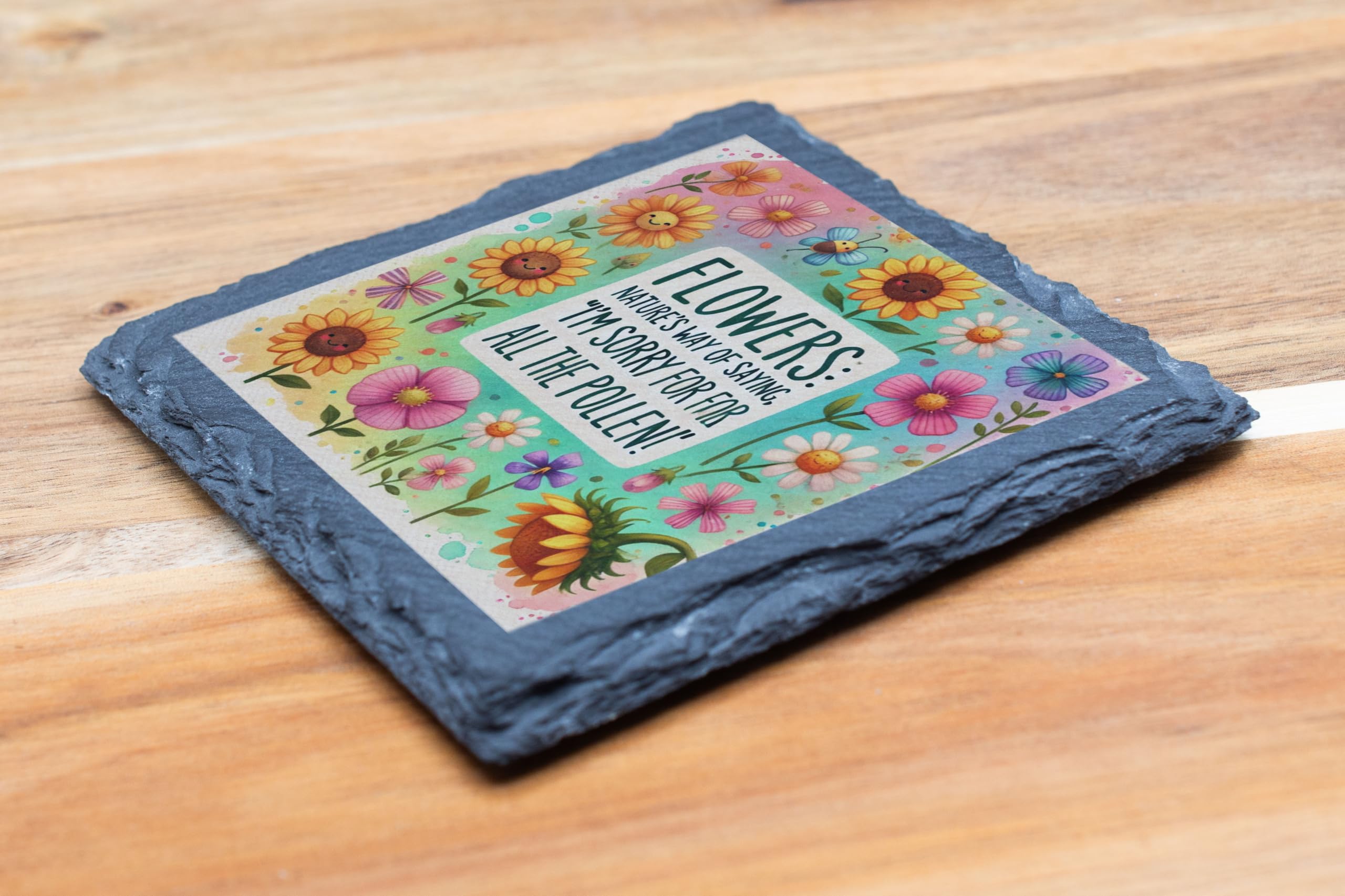 Slate Coaster - 'Flowers: Nature's Way of Saying, 'I'm Sorry for All the Pollen!' (slco-kf25-pollennathg)
