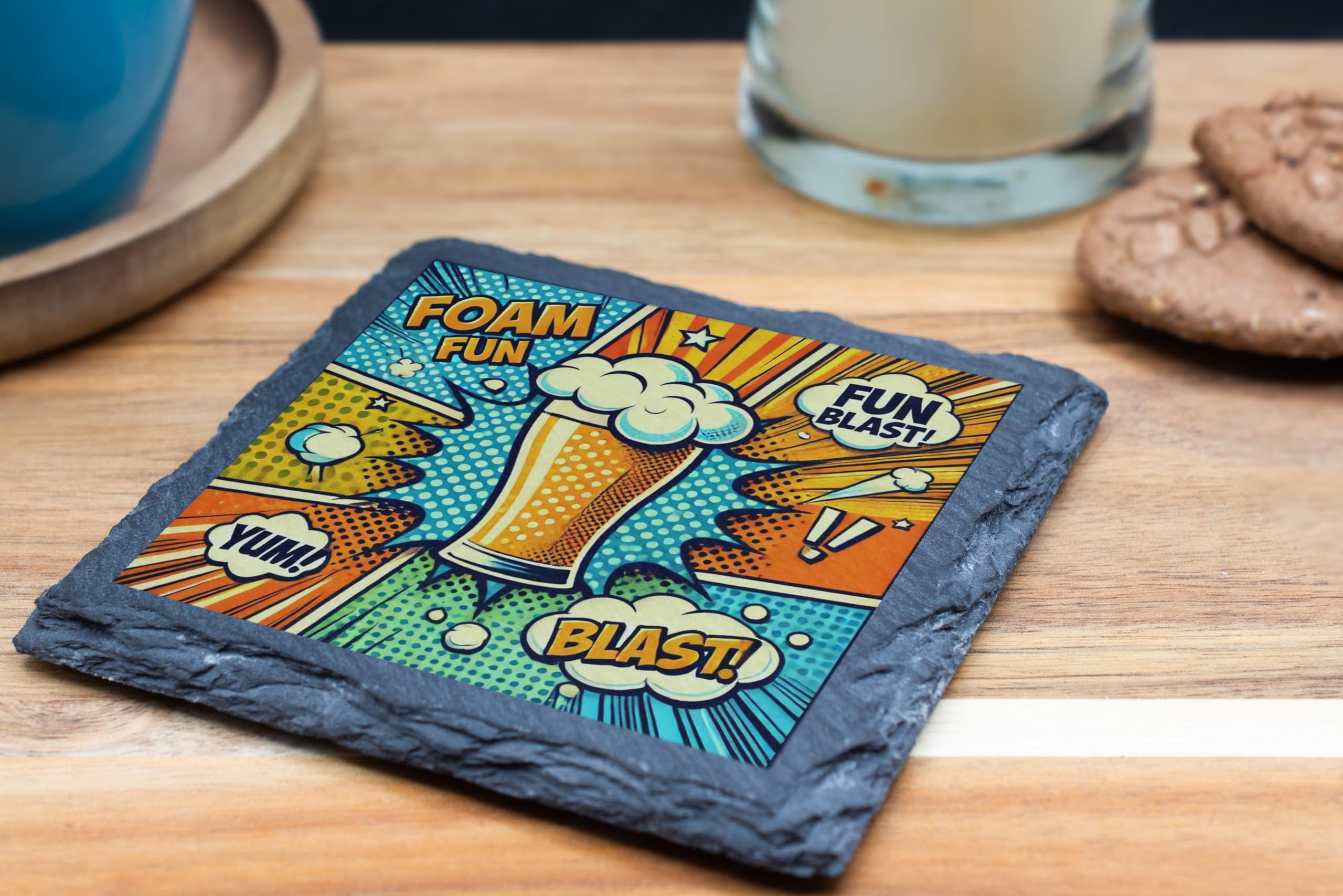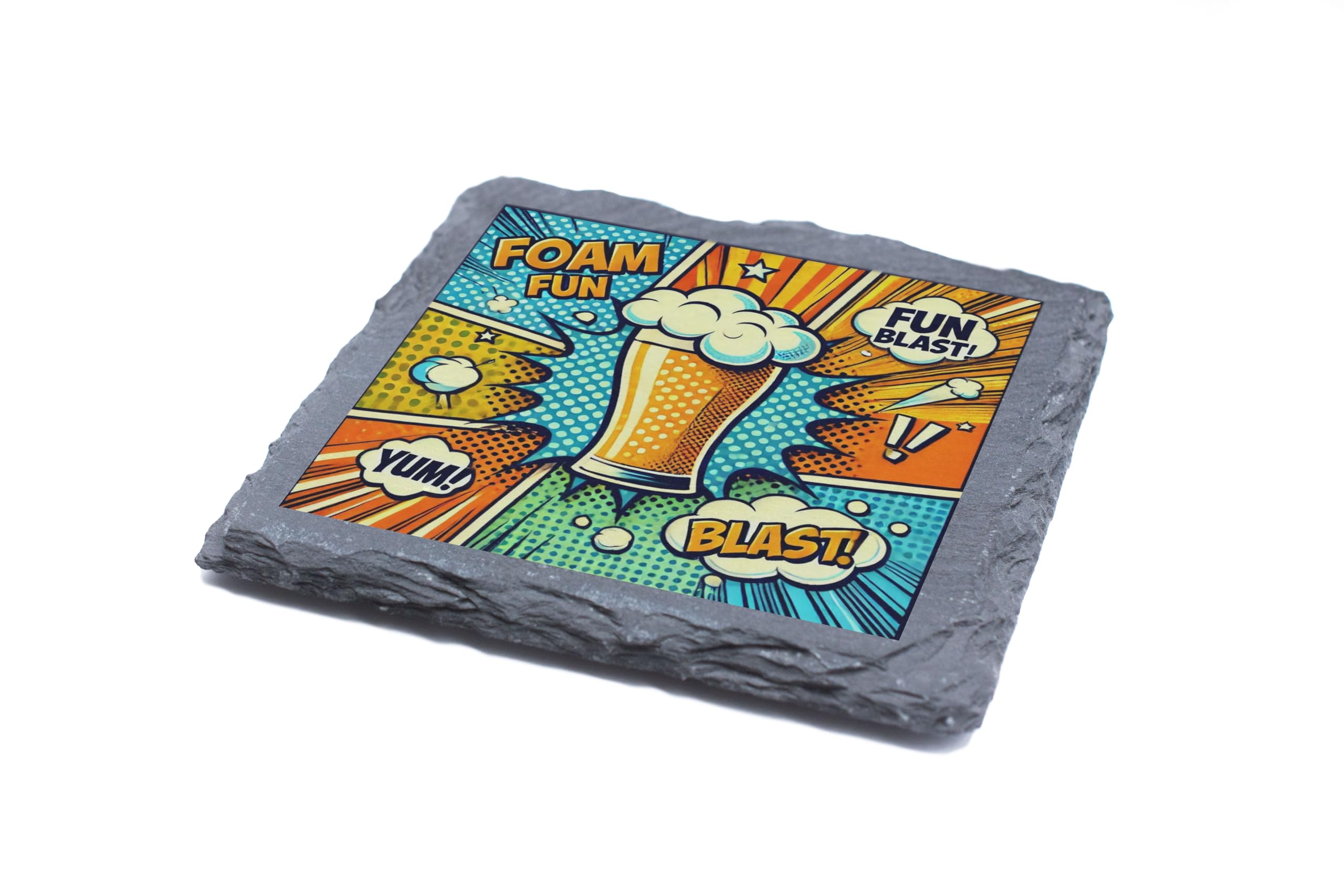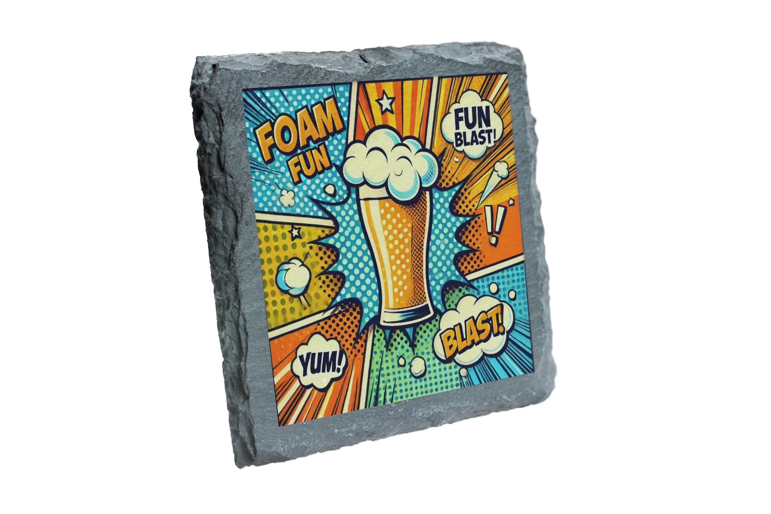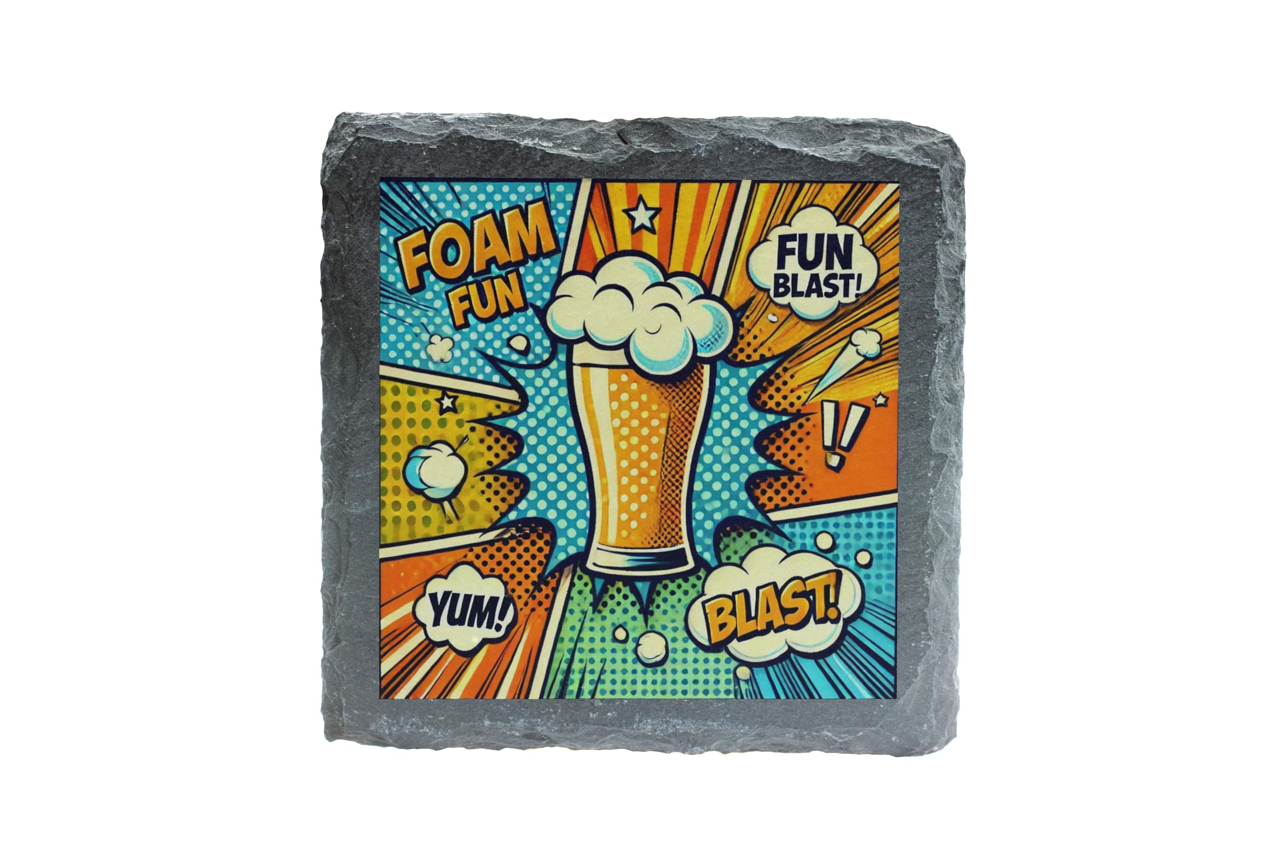 Elevate your drink game with this lively slate coaster featuring a dynamic pop art beer design. The bold colors and comic-style captions, such as "Foam Fun" and "Blast!", add a playful and energetic vibe to any setting. Crafted from natural slate, this coaster offers a durable and stylish solution to protect your surfaces from moisture, heat, and scratches. Whether you're hosting a party, relaxing with friends, or looking for the perfect gift for a beer aficionado, this coaster is a must-have. Its unique design makes it a standout piece for home bars, man caves, or even as an eye-catching decorative item. Bring fun and function together with this vibrant addition to your drinkware accessories!