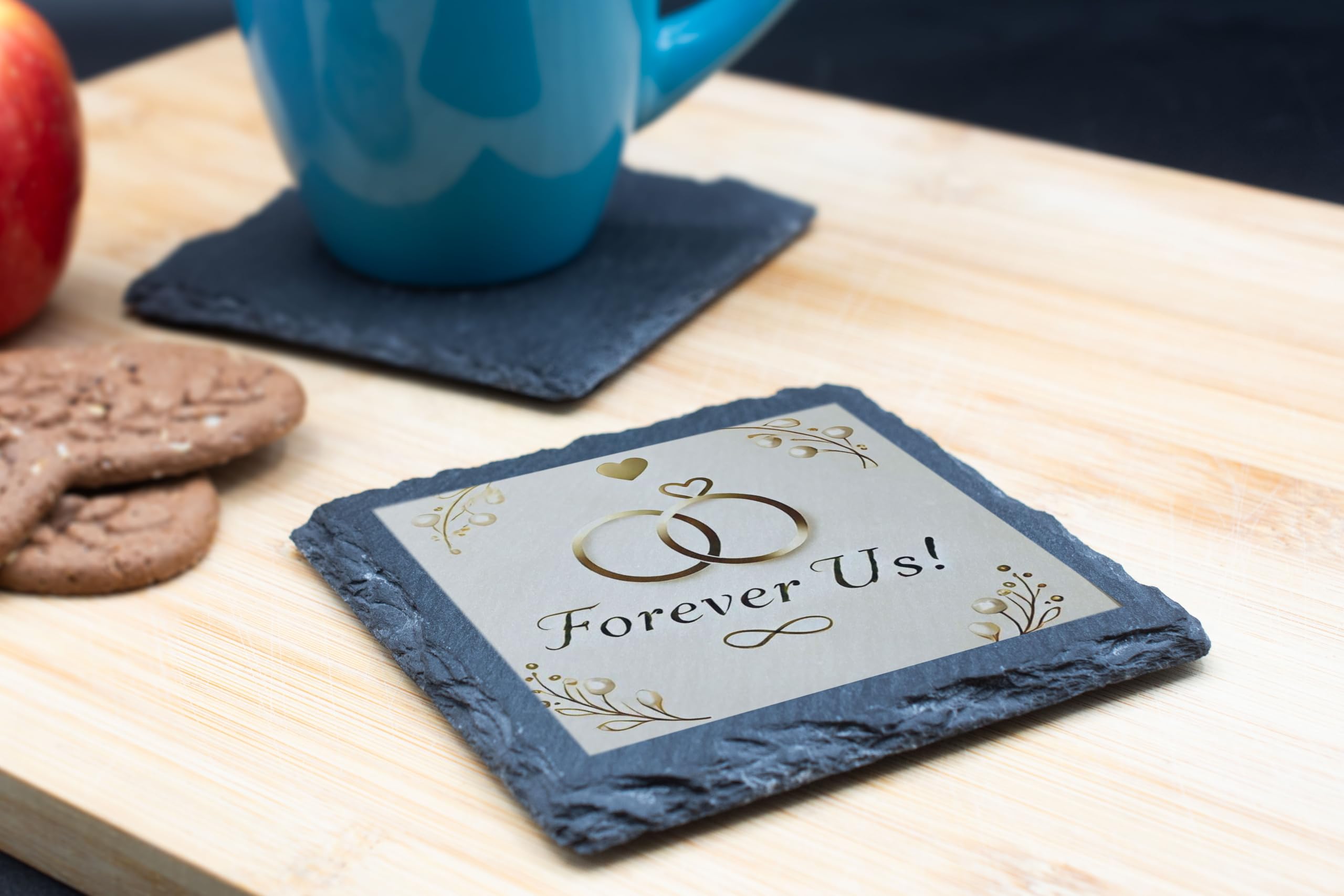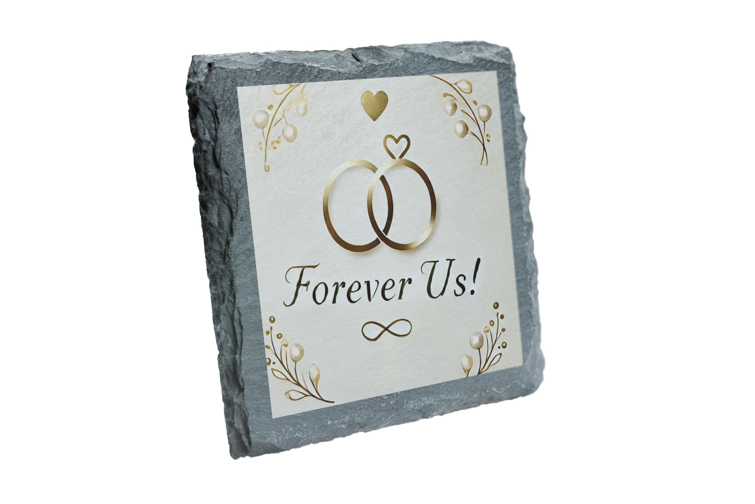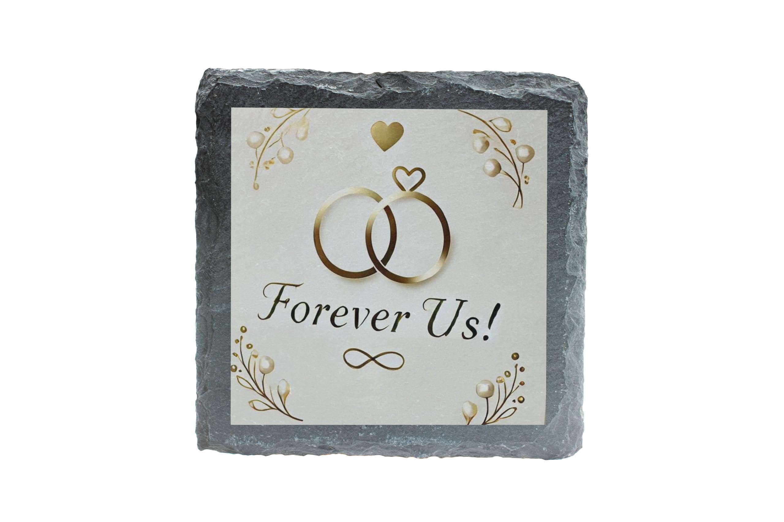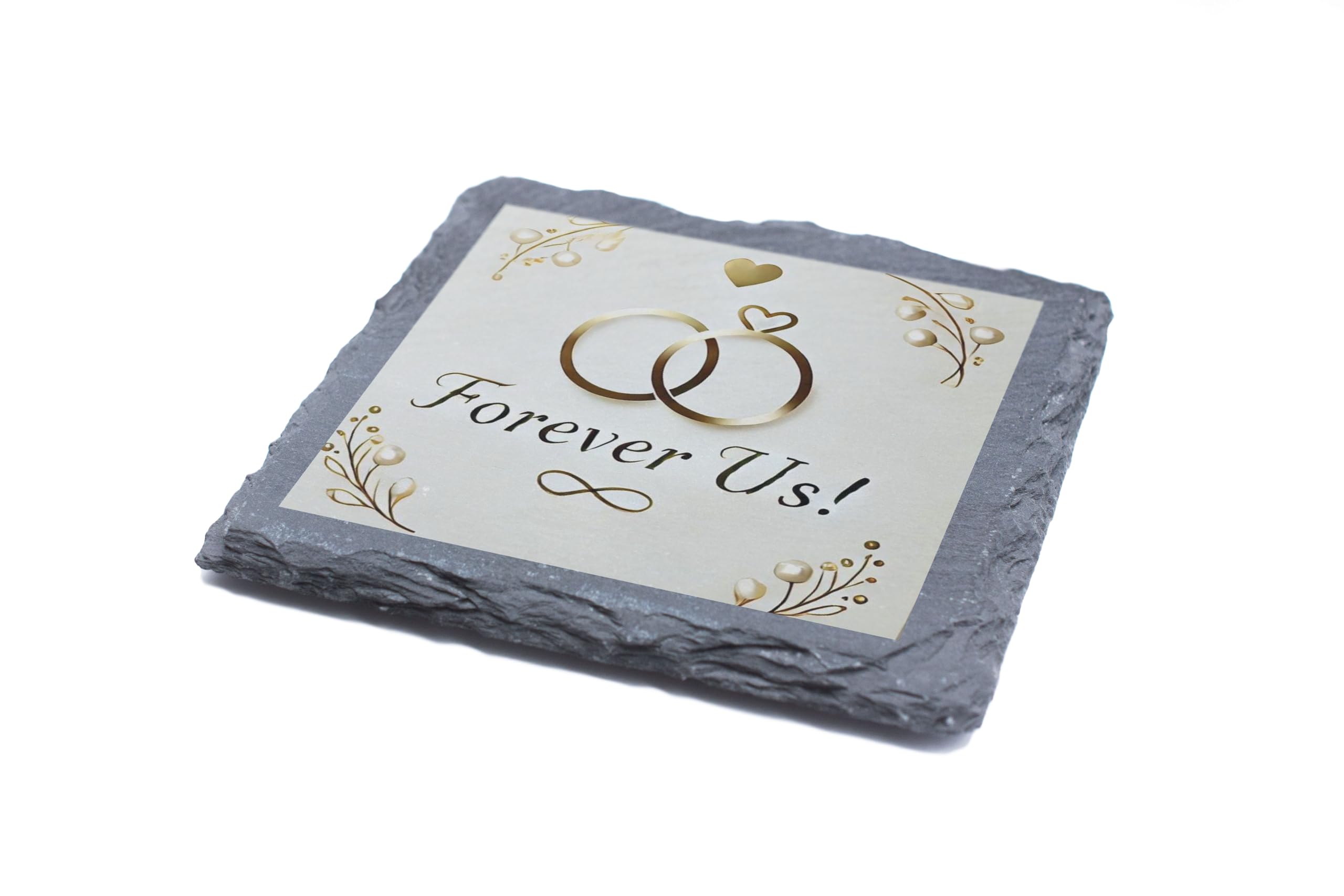 Celebrate love and commitment with this exquisite "Forever Us!" slate coaster. The timeless design showcases intertwined golden rings, delicate floral accents, and a romantic inscription that makes it a perfect gift for weddings, anniversaries, or engagements. Crafted from natural slate, this coaster is a blend of durability and charm, making it a practical yet sentimental keepsake. Whether used as a decorative piece or for everyday functionality, this coaster will forever remind couples of their eternal bond.