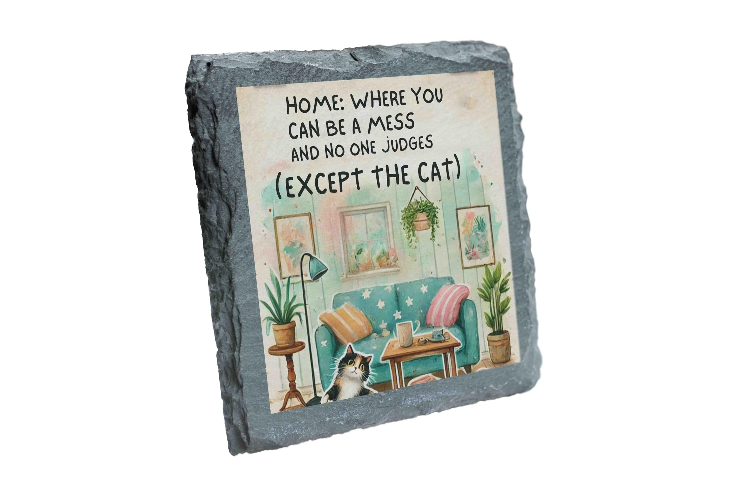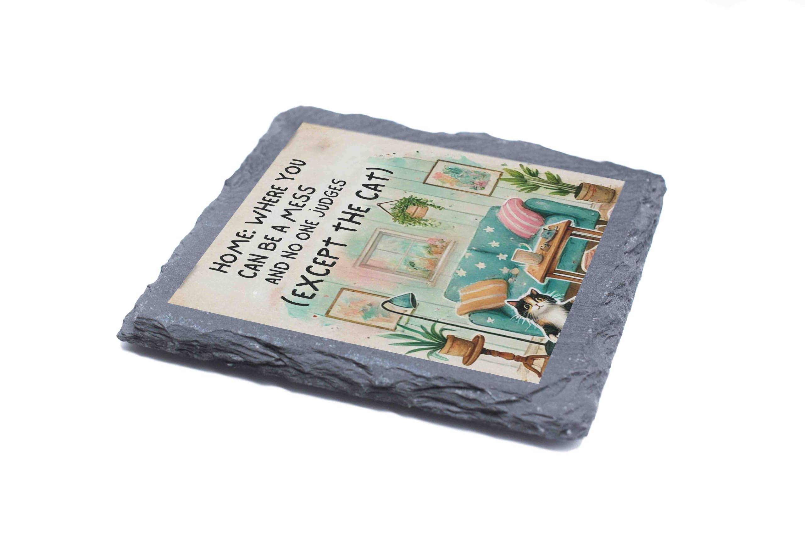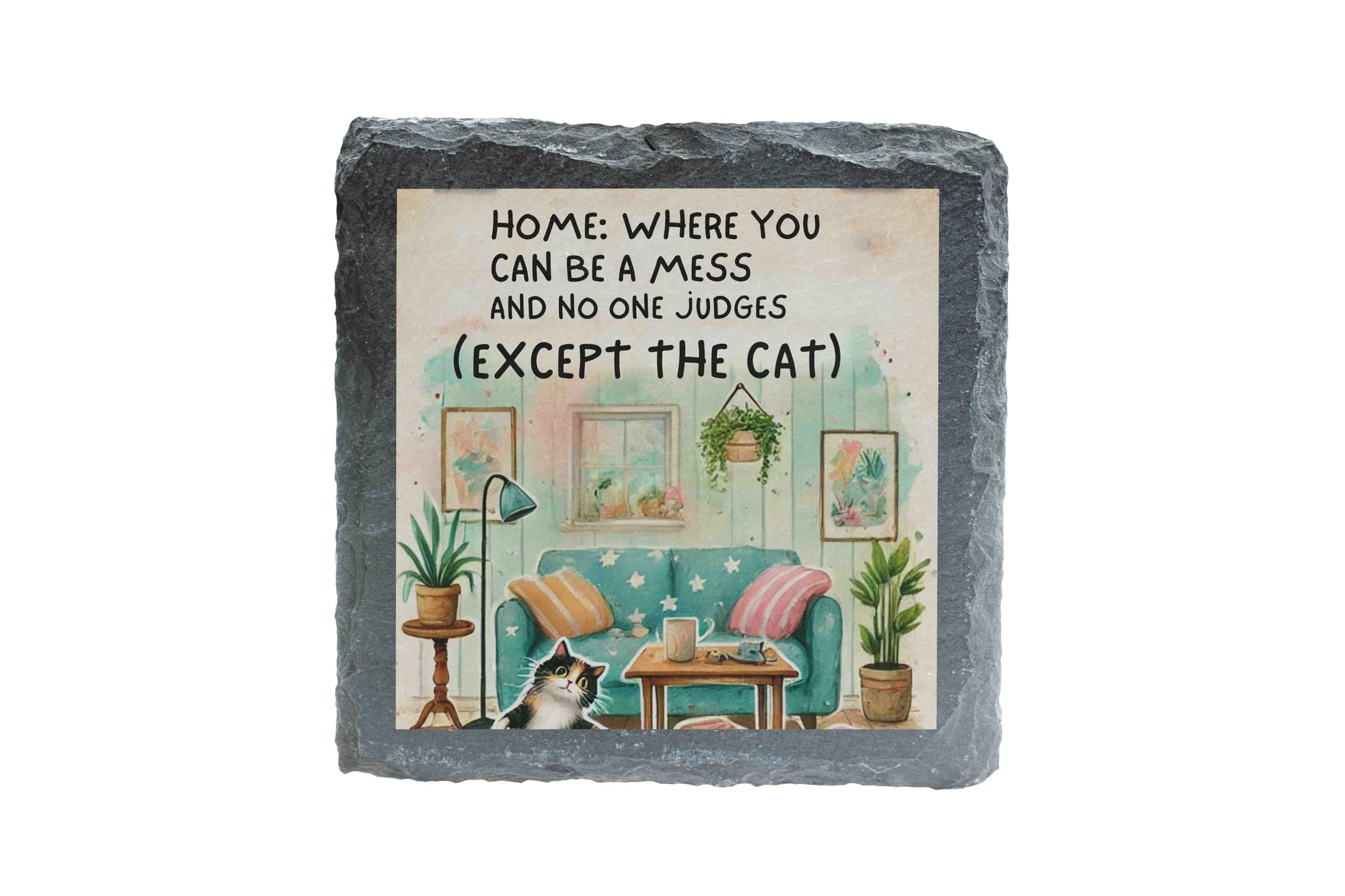 Celebrate the unspoken truth of home life with this delightful slate coaster. Showcasing the whimsical phrase "Home: Where You Can Be a Mess and No One Judges (Except the Cat)," this coaster brings warmth and humor to your living space. The cozy design features a charming cat illustration, making it a perfect choice for cat lovers and anyone who enjoys a good laugh. Crafted from high-quality natural slate, this coaster combines functionality with style. It protects your surfaces from spills and scratches while adding a rustic, homey touch to your decor. Ideal for personal use or as a gift, this coaster will resonate with anyone who knows the judgmental yet lovable stare of a feline friend. Bring a smile to your face and keep your furniture safe with this witty and practical home accessory. Perfect for everyday use or special occasions, this coaster is bound to be a conversation starter!
