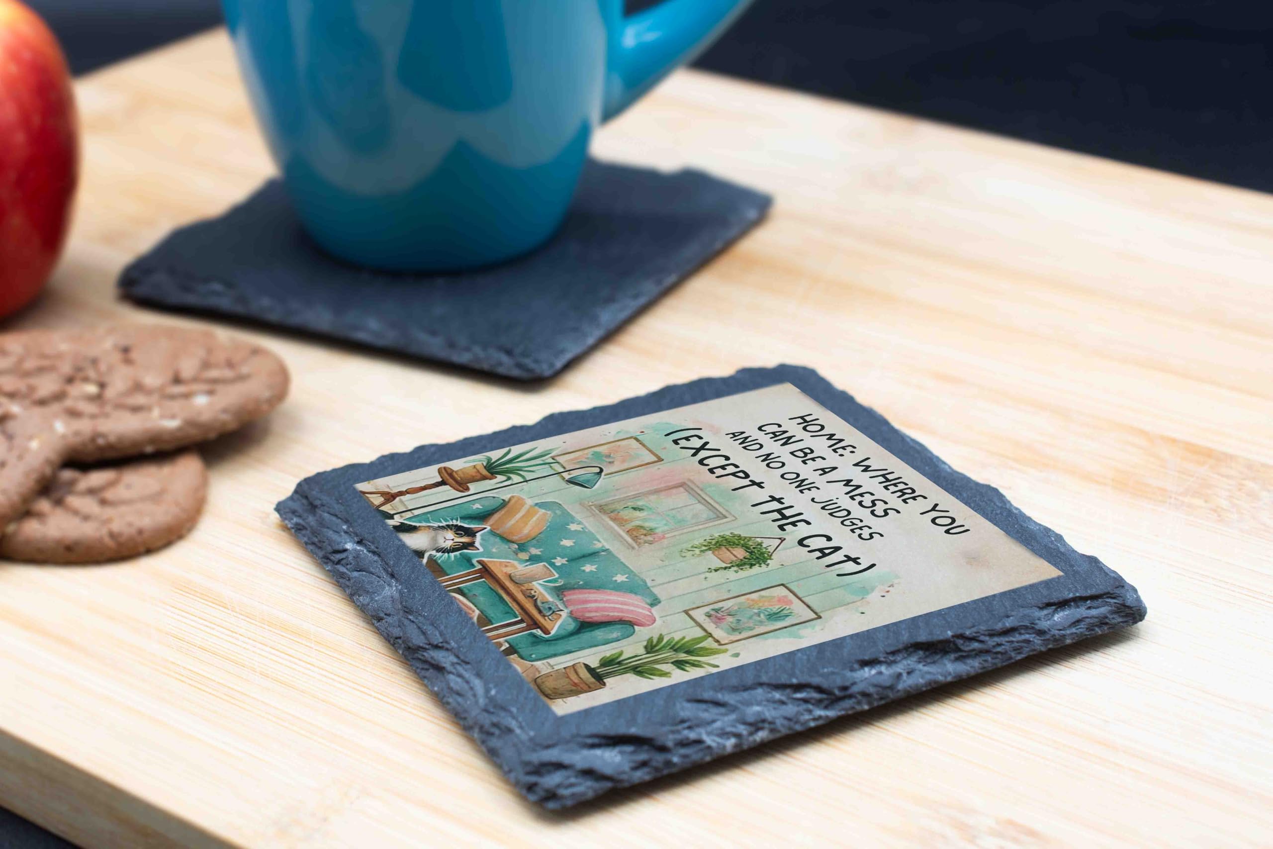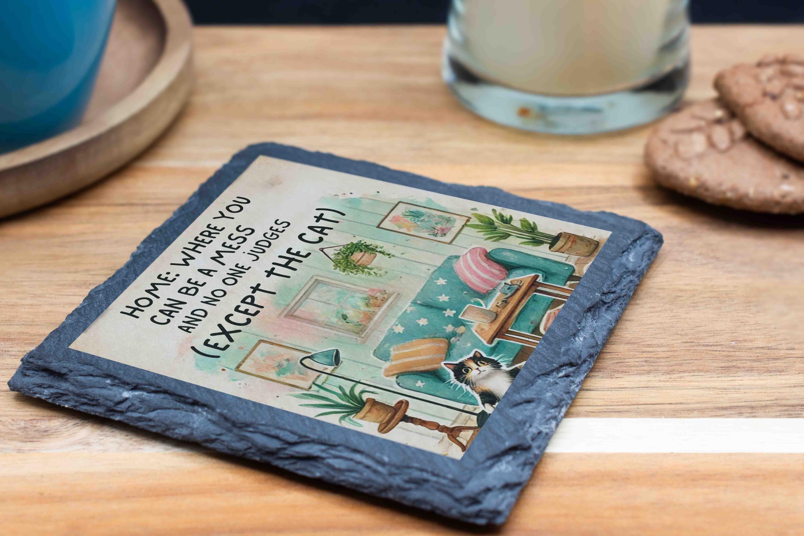 Slate Coaster - 'Home: Where You Can Be a Mess (Except the Cat)' Cozy and Humorous Design (slco-kf25-messcathg)