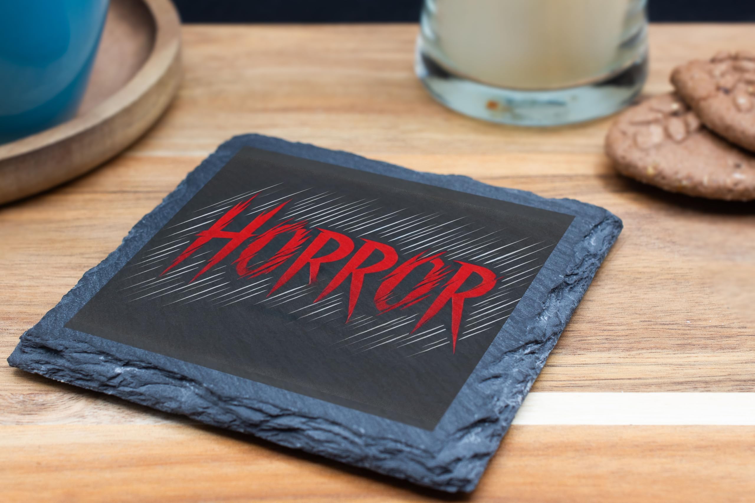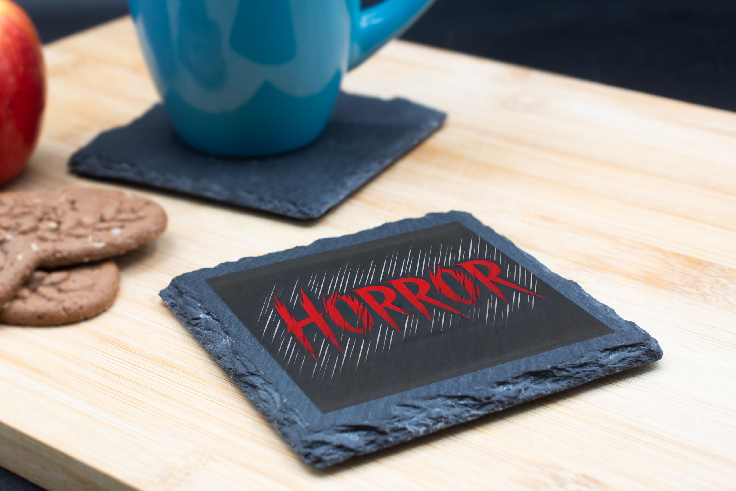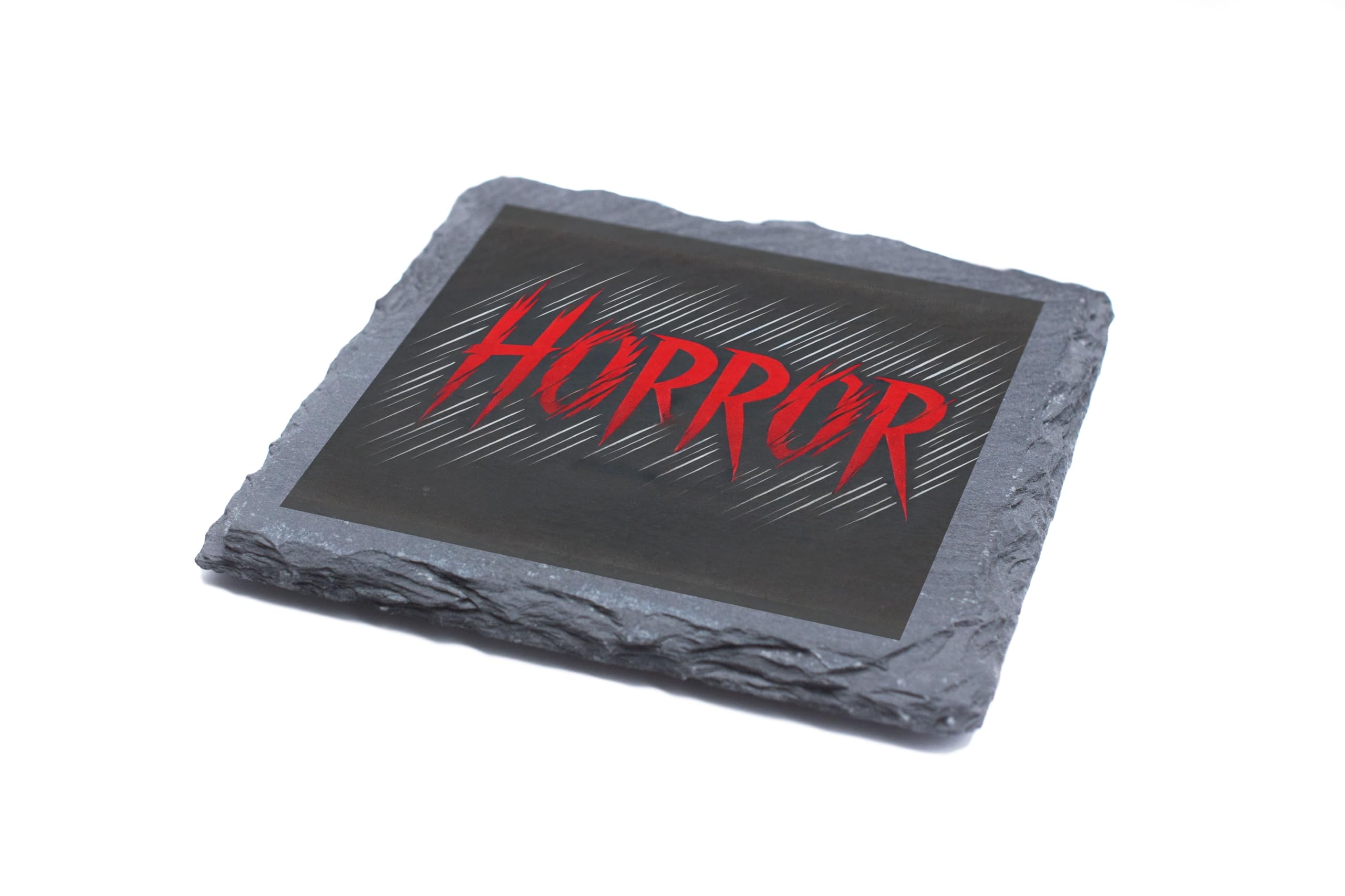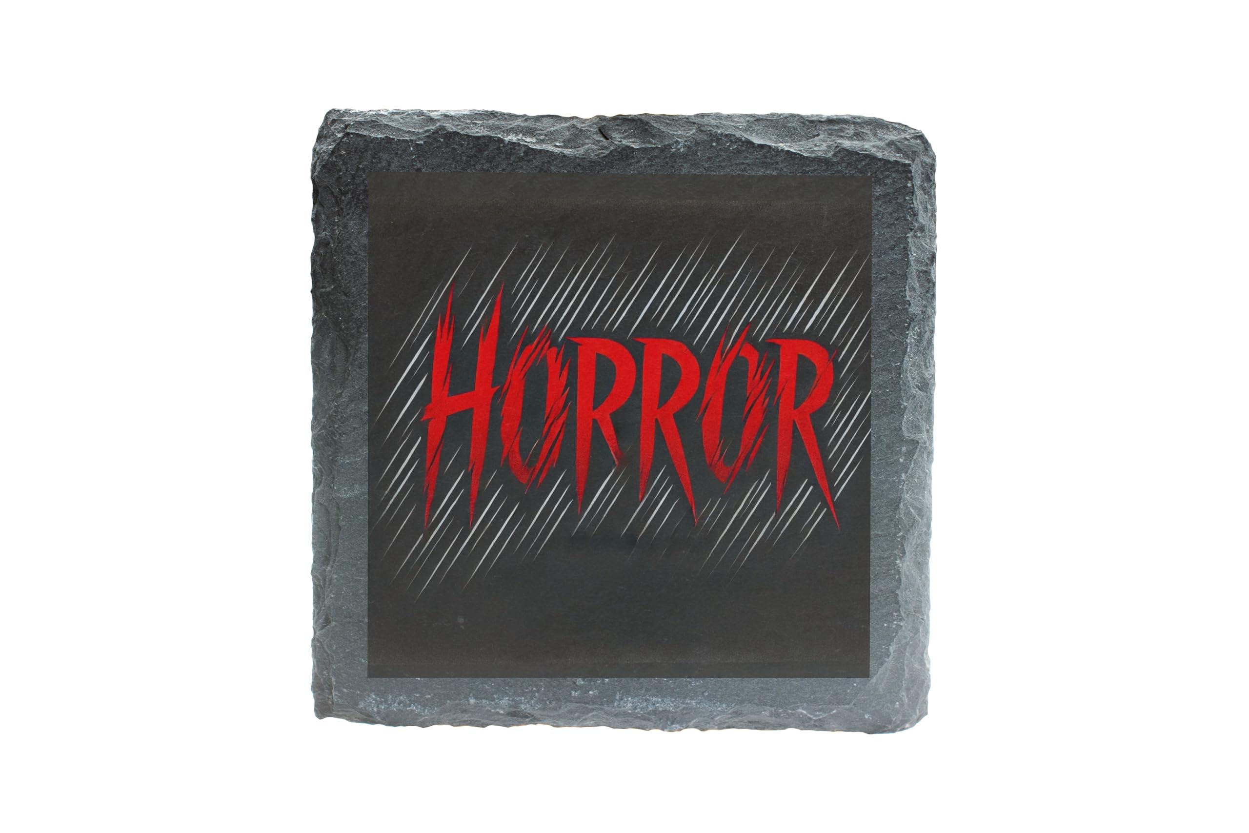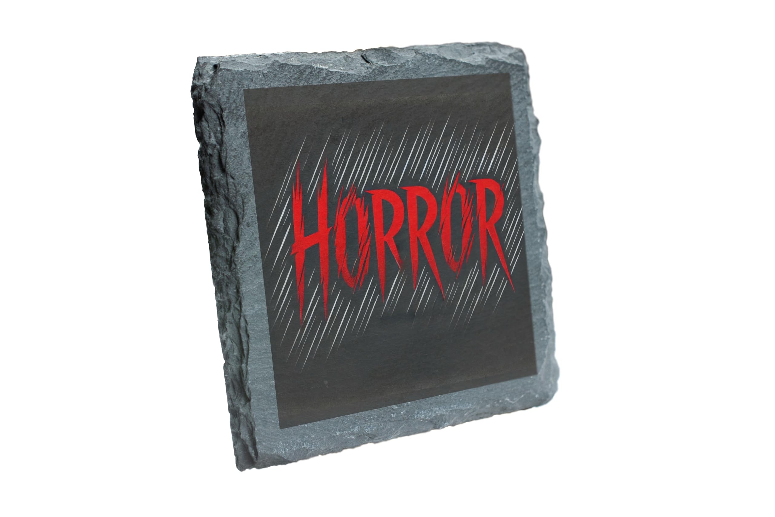 Unleash your love for all things spooky with this "Horror" slate coaster. Featuring blood-red typography slashed across a shadowy background, this coaster is perfect for setting the mood during Halloween or for horror movie marathons. Made from natural slate, its rugged design adds a touch of sophistication to the macabre. This coaster not only protects your surfaces but also serves as a conversation starter for your eerie gatherings. A must-have for horror fans who want their home decor to make a spine-tingling statement!