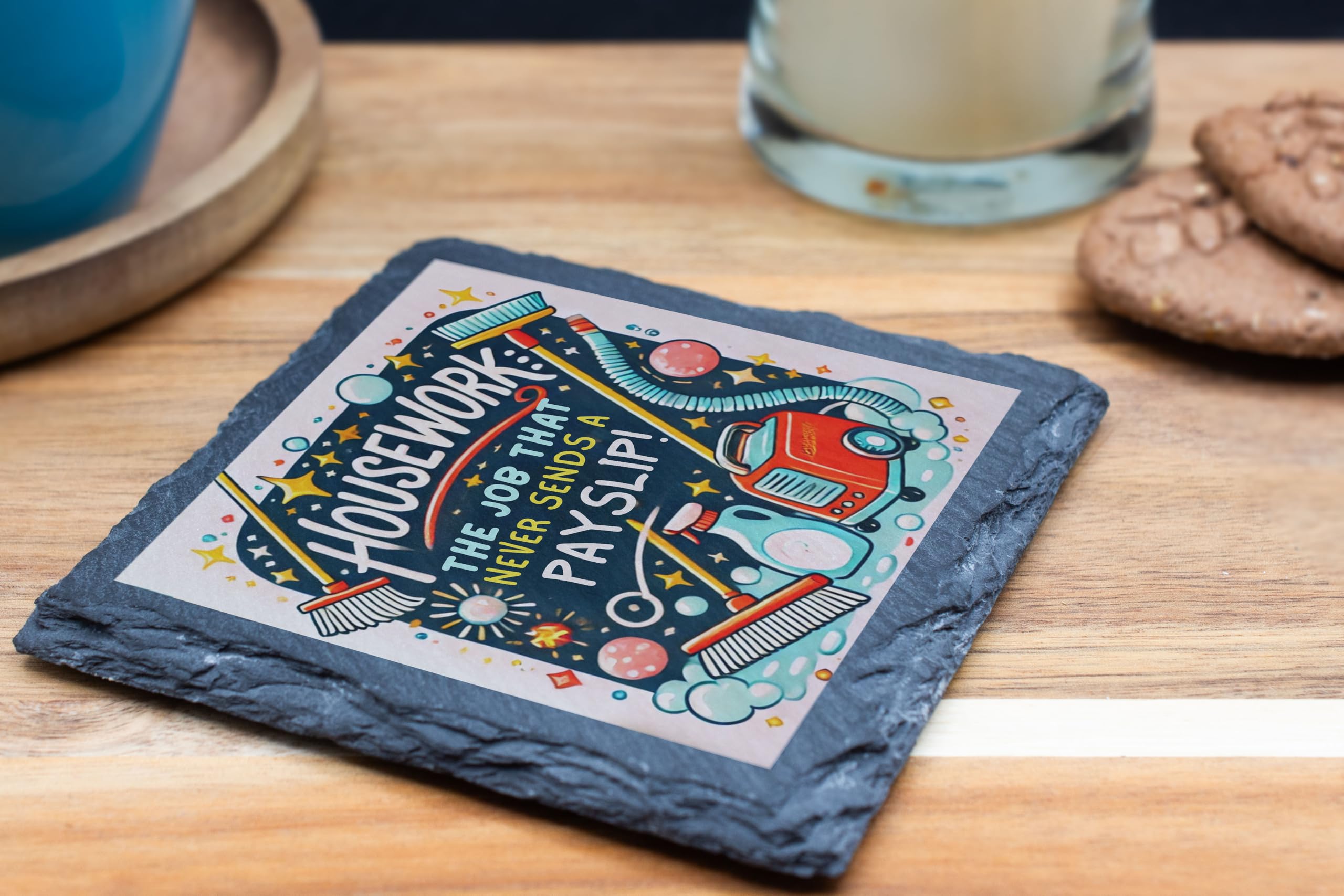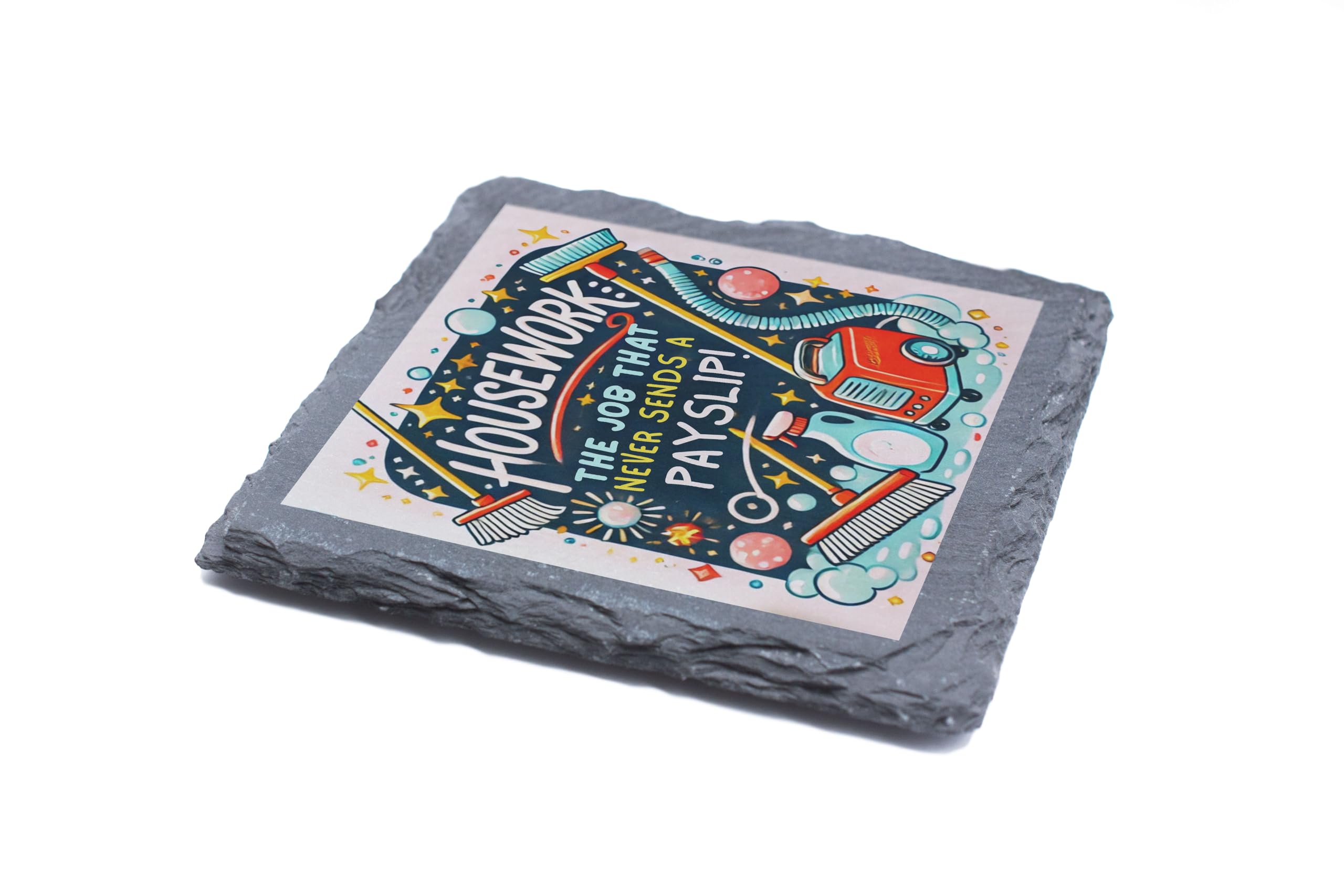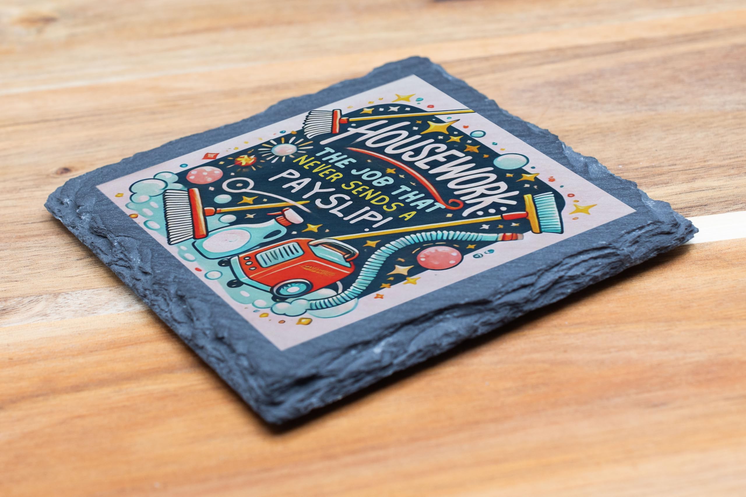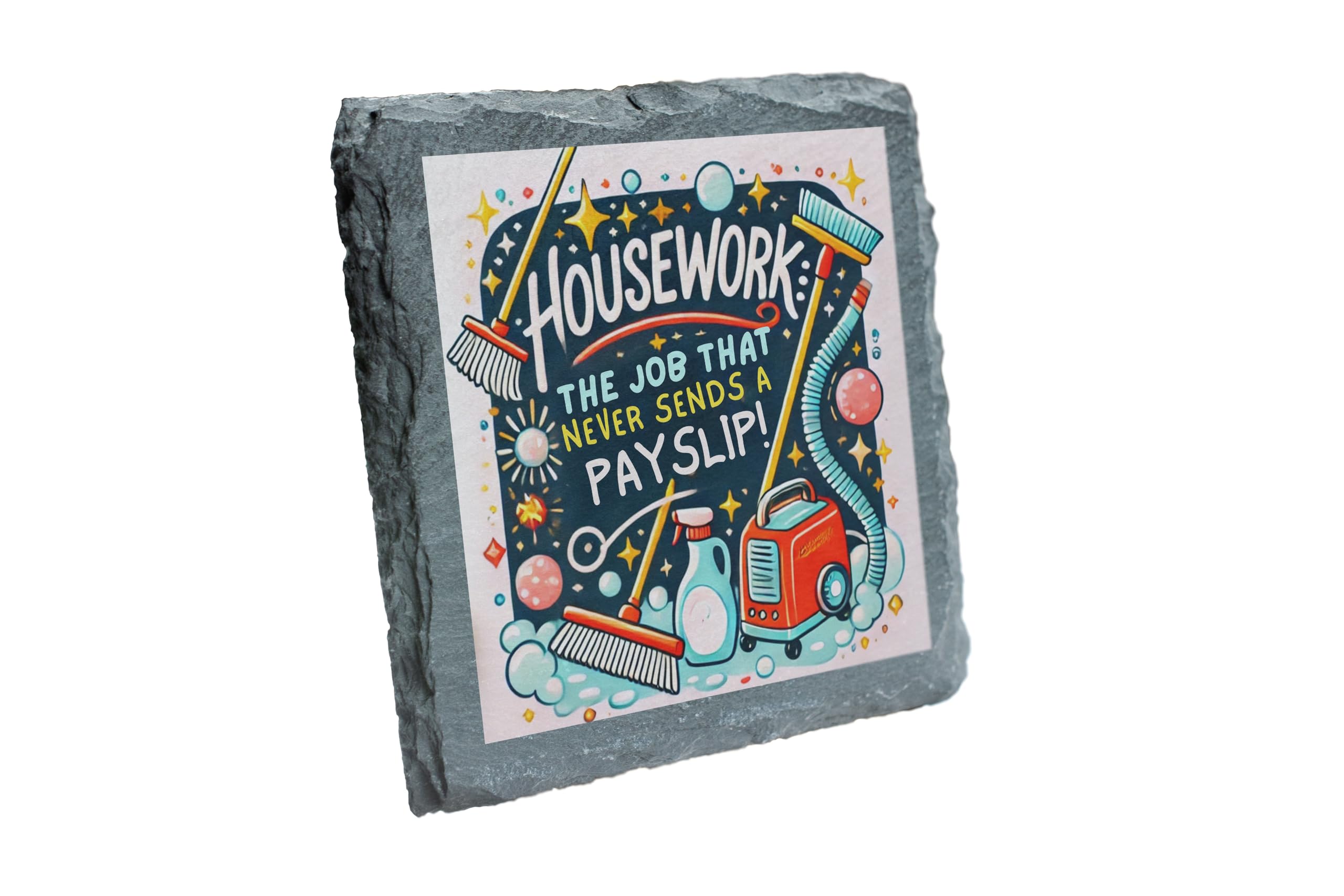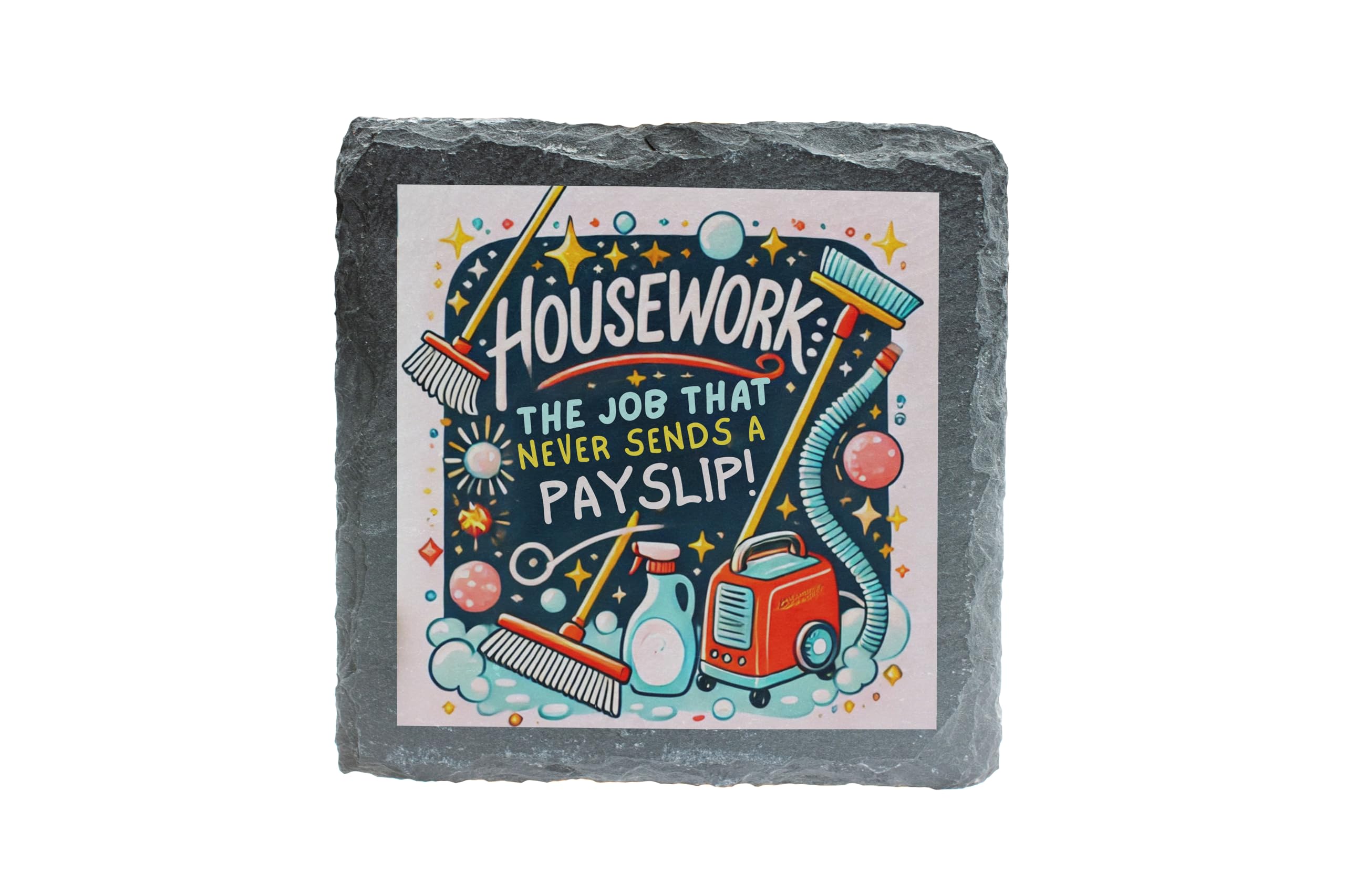 Inject a dose of humor into your everyday chores with this charming slate coaster featuring the humorous quote, "Housework: The Job That Never Sends a Payslip!" Adorned with vibrant illustrations of cleaning tools, this coaster makes a fun and functional addition to your home. Made from premium natural slate, it?s sturdy enough to protect your tables while adding a touch of personality to your decor. Perfect as a gift for anyone who can relate to the never-ending cycle of housework, this coaster is both practical and entertaining?a delightful addition to any household!