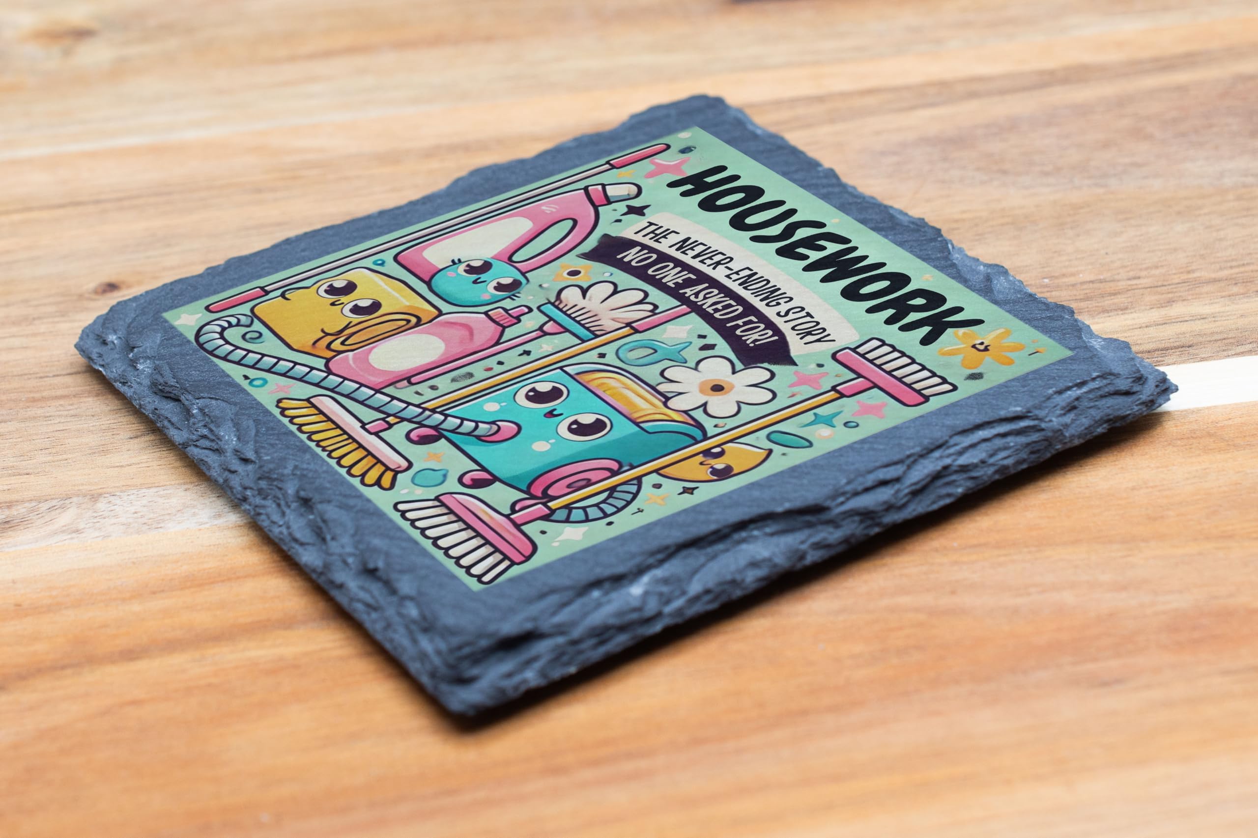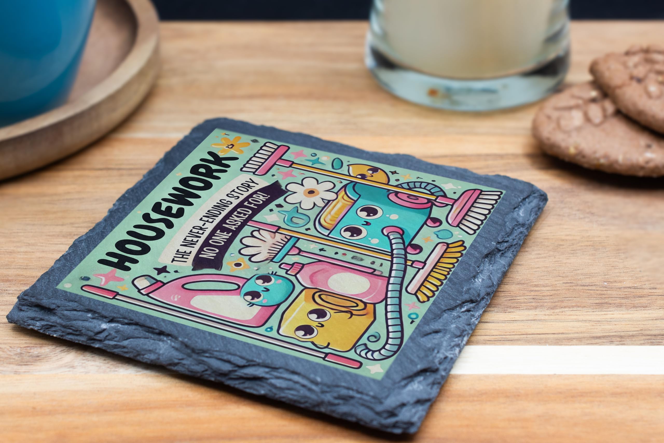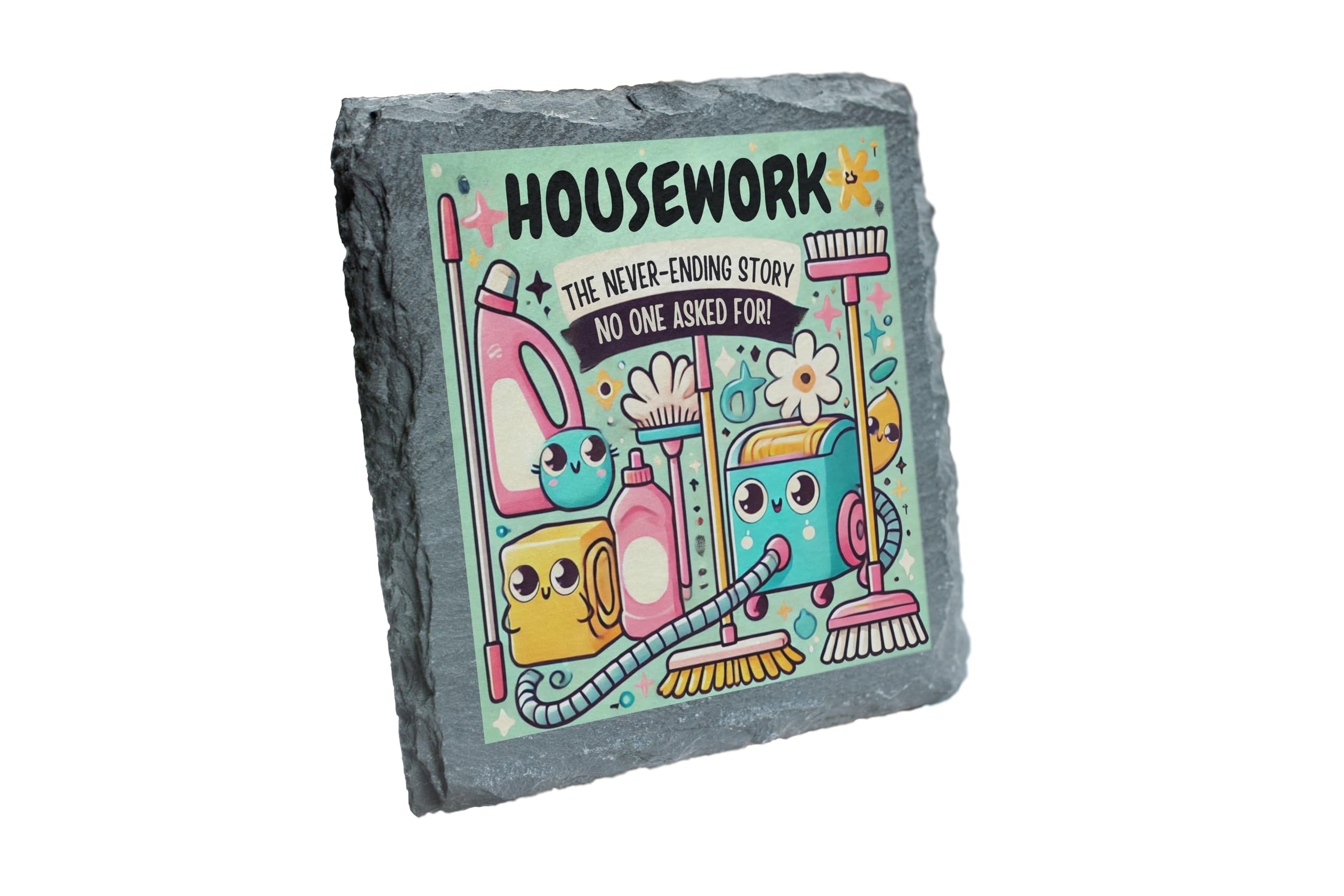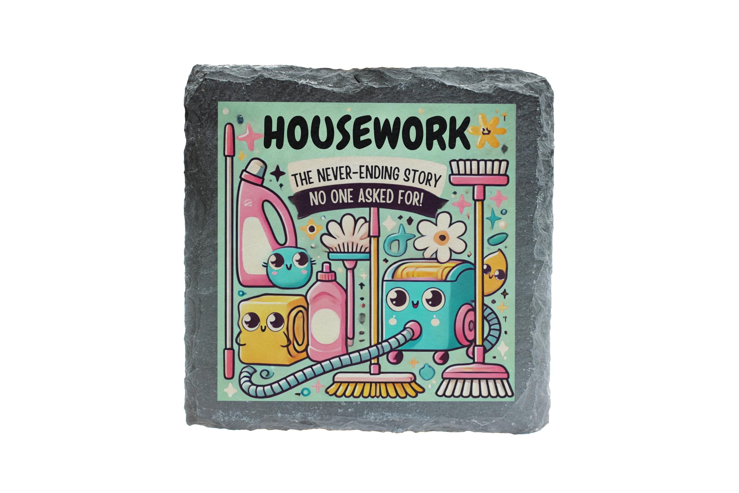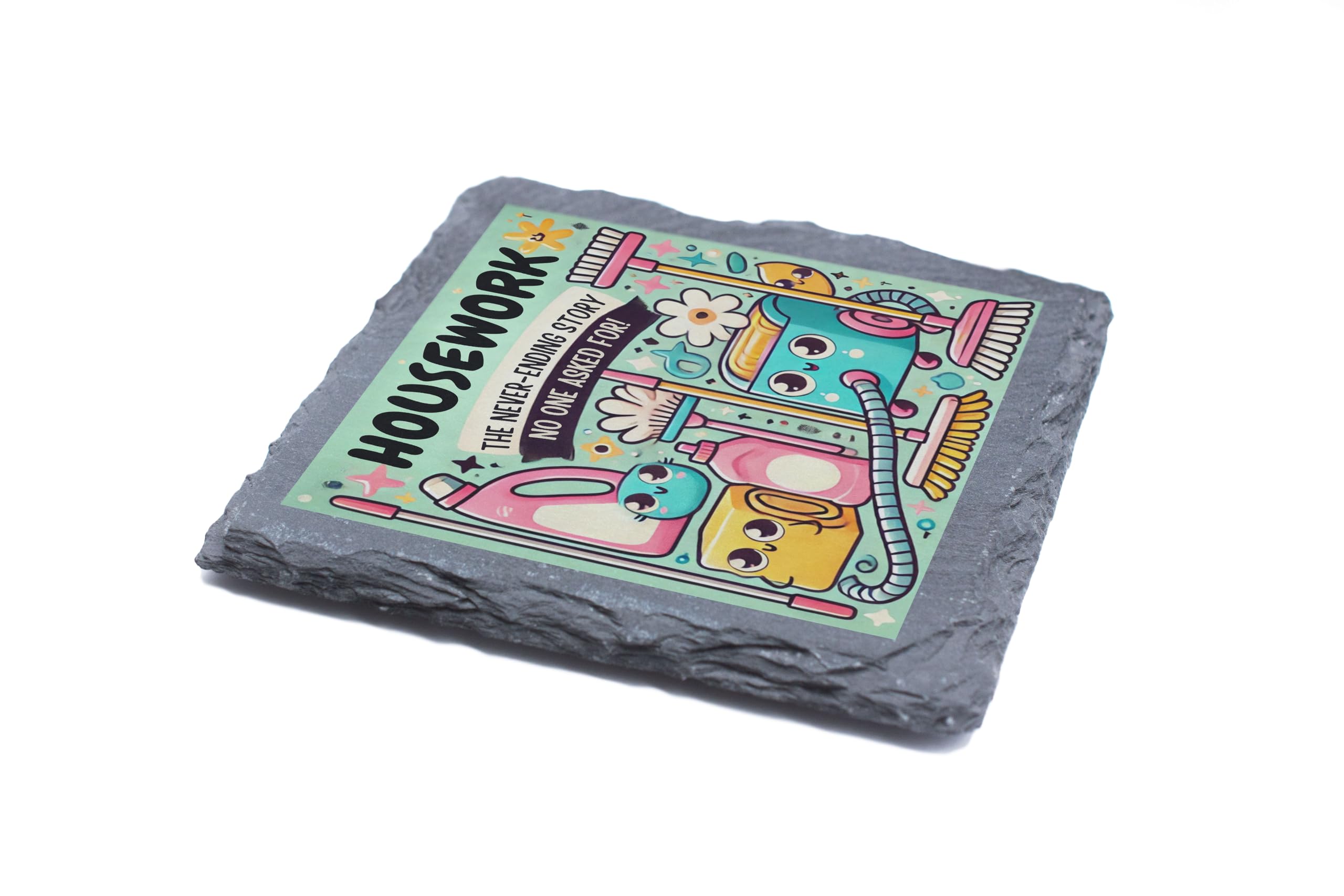 Brighten up your cleaning breaks with this delightful slate coaster! Featuring a vibrant and humorous design, it?s a playful nod to the endless cycle of housework we all endure. Made from high-quality slate, this coaster not only protects your surfaces but also brings a splash of character to your kitchen, dining area, or living room. Whether it?s a gift for yourself or a loved one, this charming coaster is perfect for anyone who appreciates a bit of humor in their daily grind. Durable, functional, and a guaranteed conversation starter, it?s the perfect way to make housework a little more fun!