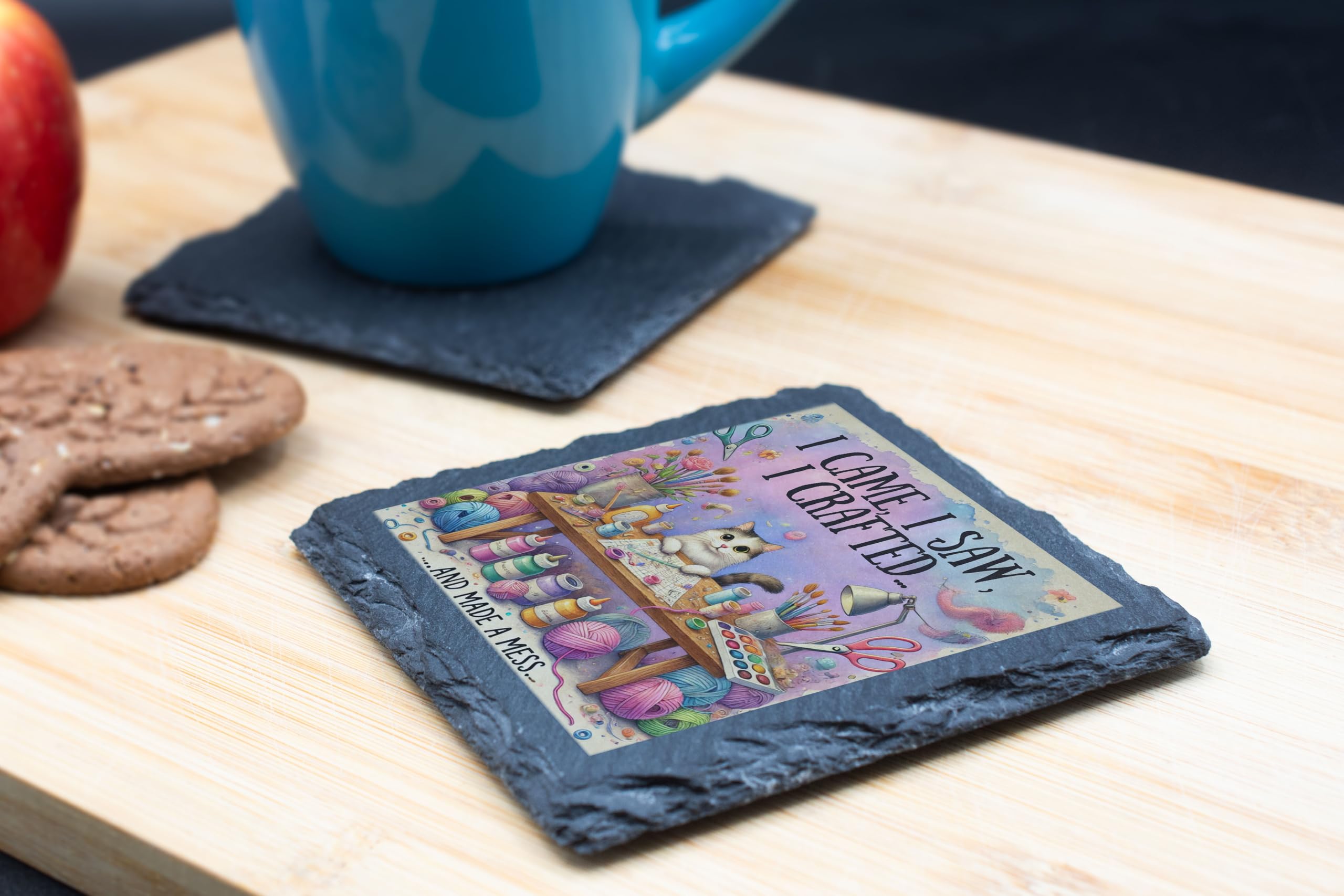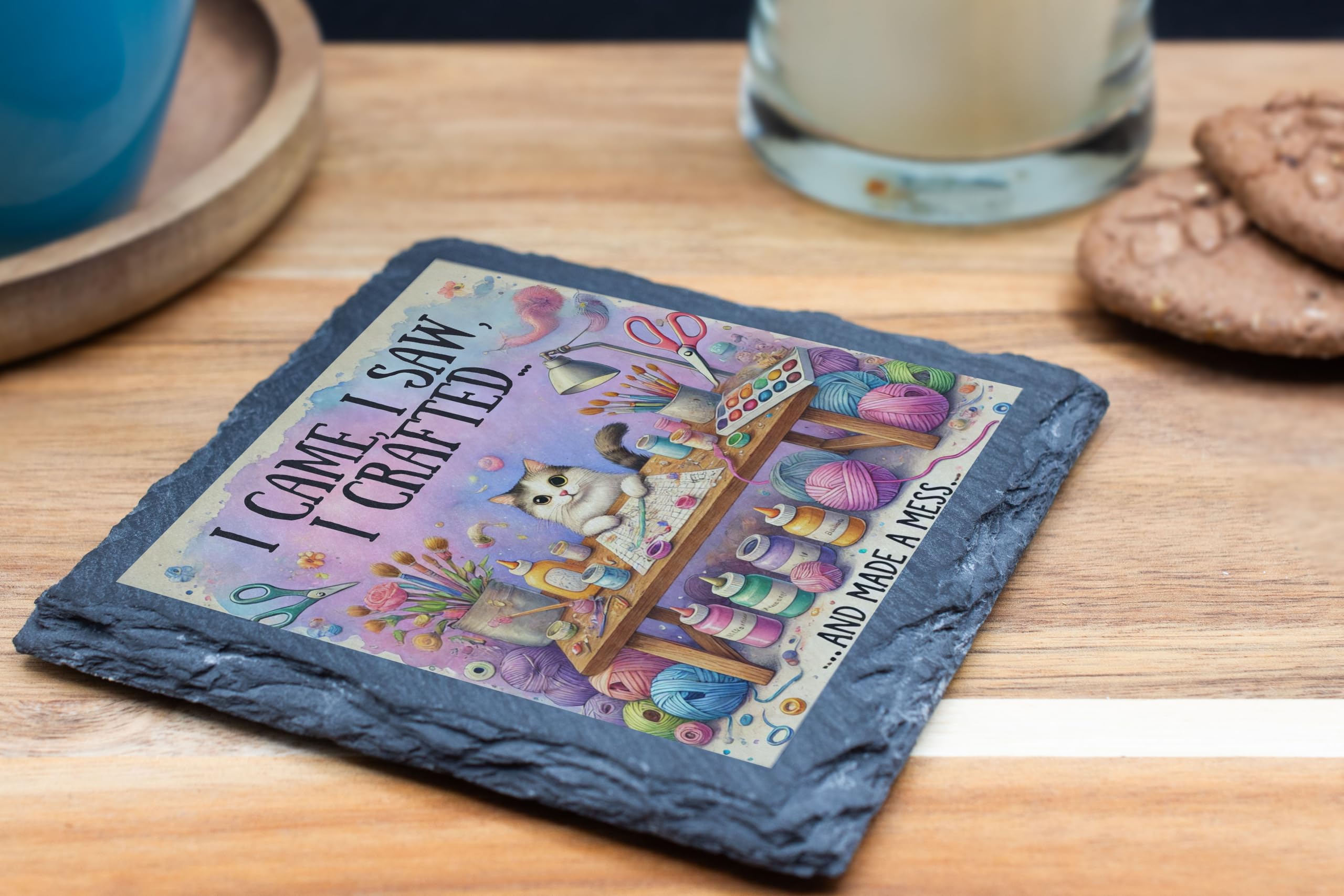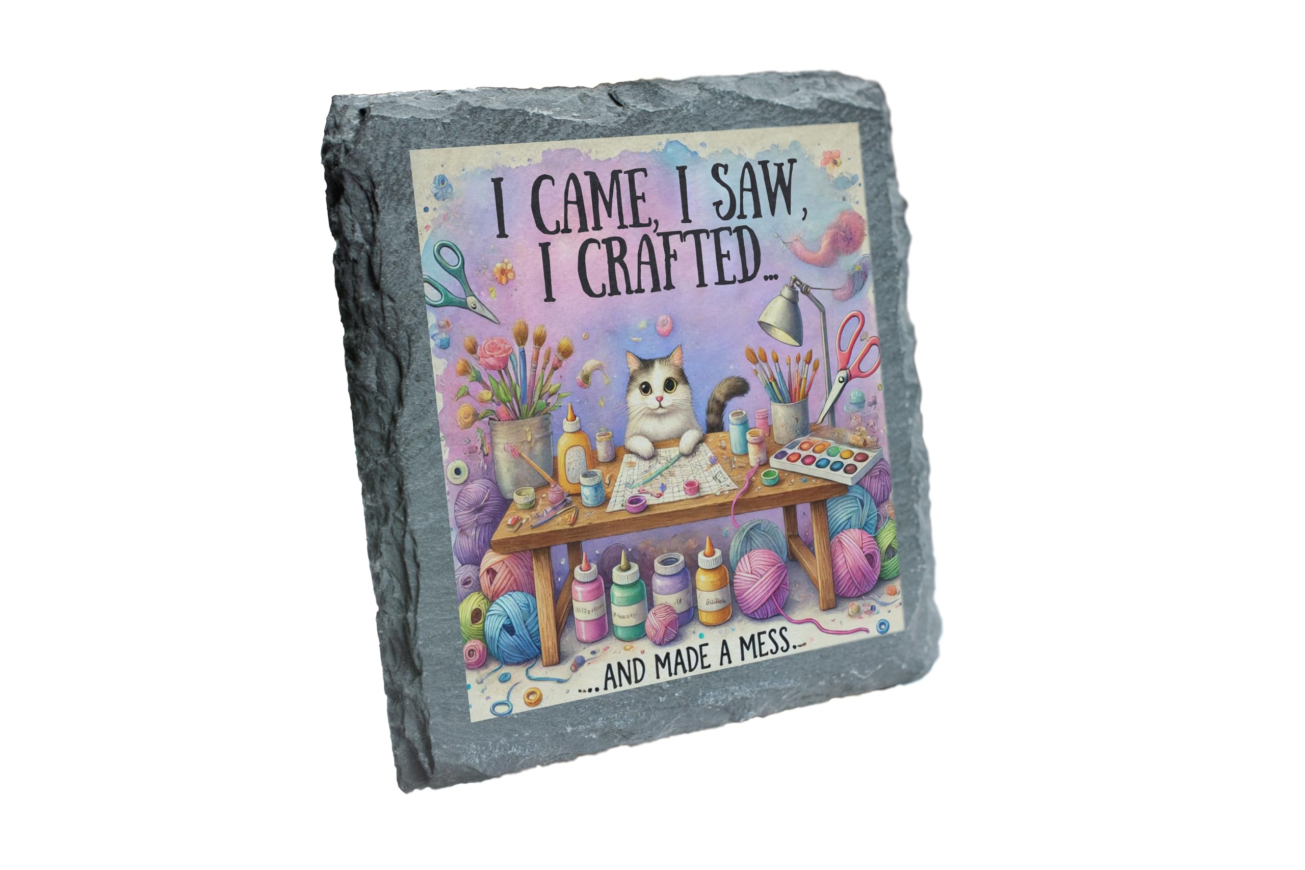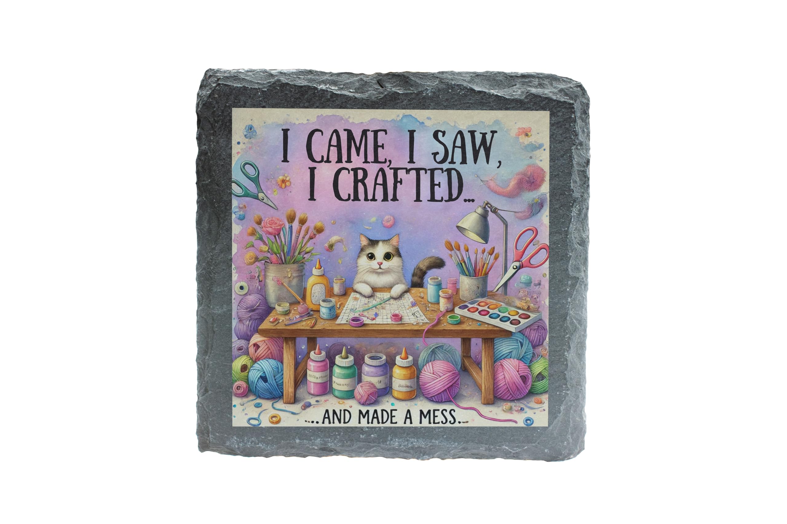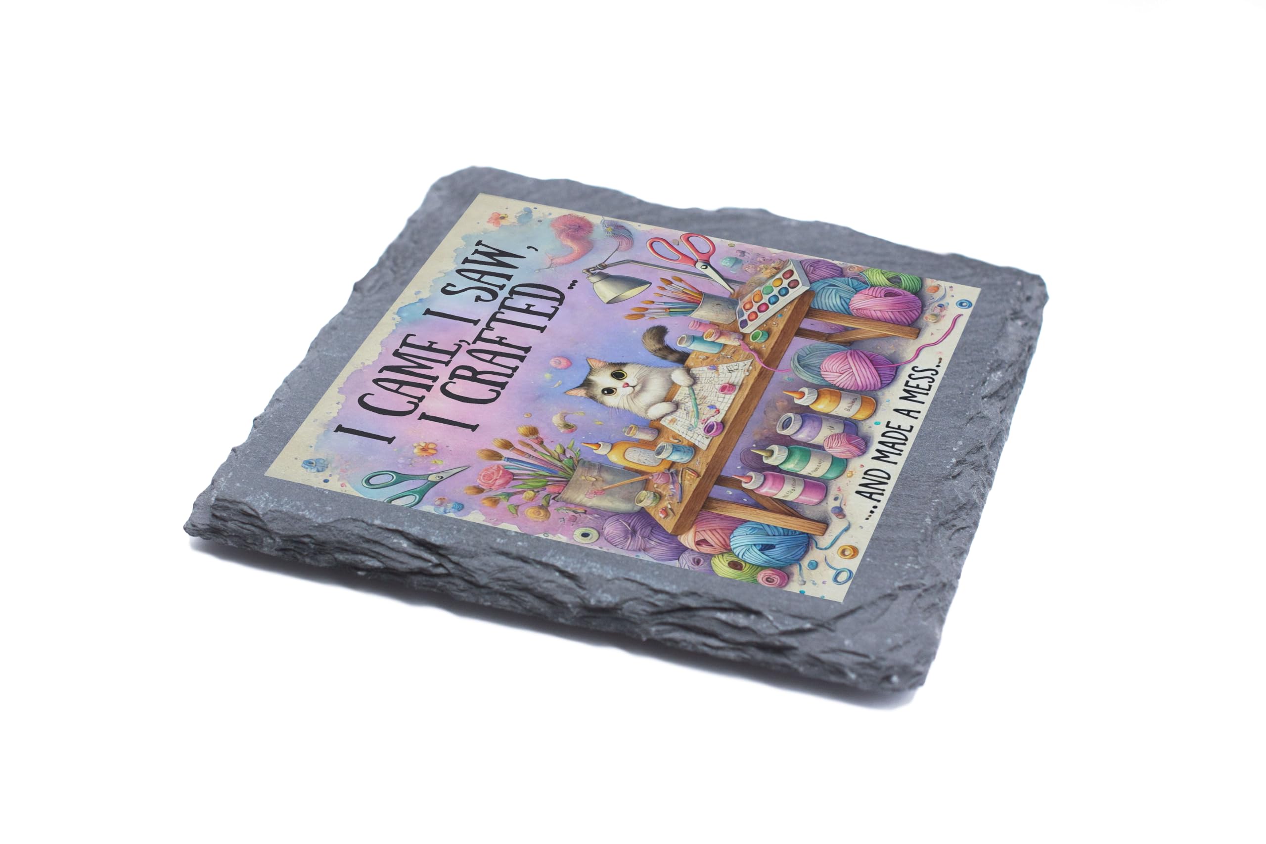 Show off your love for crafting with this delightful slate coaster, featuring the playful phrase "I Came, I Saw, I Crafted? And Made a Mess." Paired with a detailed illustration of a colorful crafting setup (complete with a curious kitty!), this coaster is perfect for adding a touch of humor and charm to any creative space. Made from durable natural slate, this coaster is as practical as it is stylish. It provides excellent protection for your surfaces from heat, spills, and scratches, while its rustic texture enhances its artistic appeal. Whether used in a craft room, home office, or studio, this coaster is a must-have for those who live to create. This slate coaster also makes an excellent gift for friends and family who love DIY projects, scrapbooking, painting, or any creative pursuit. Celebrate the joys of crafting (and the occasional mess) with this unique and functional accessory that?s as inspiring as your next masterpiece!