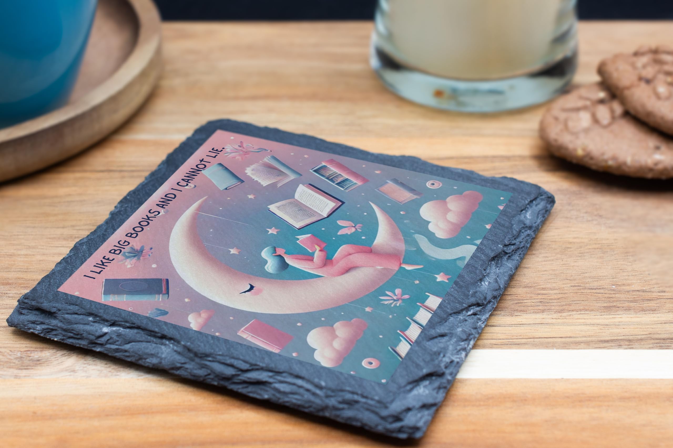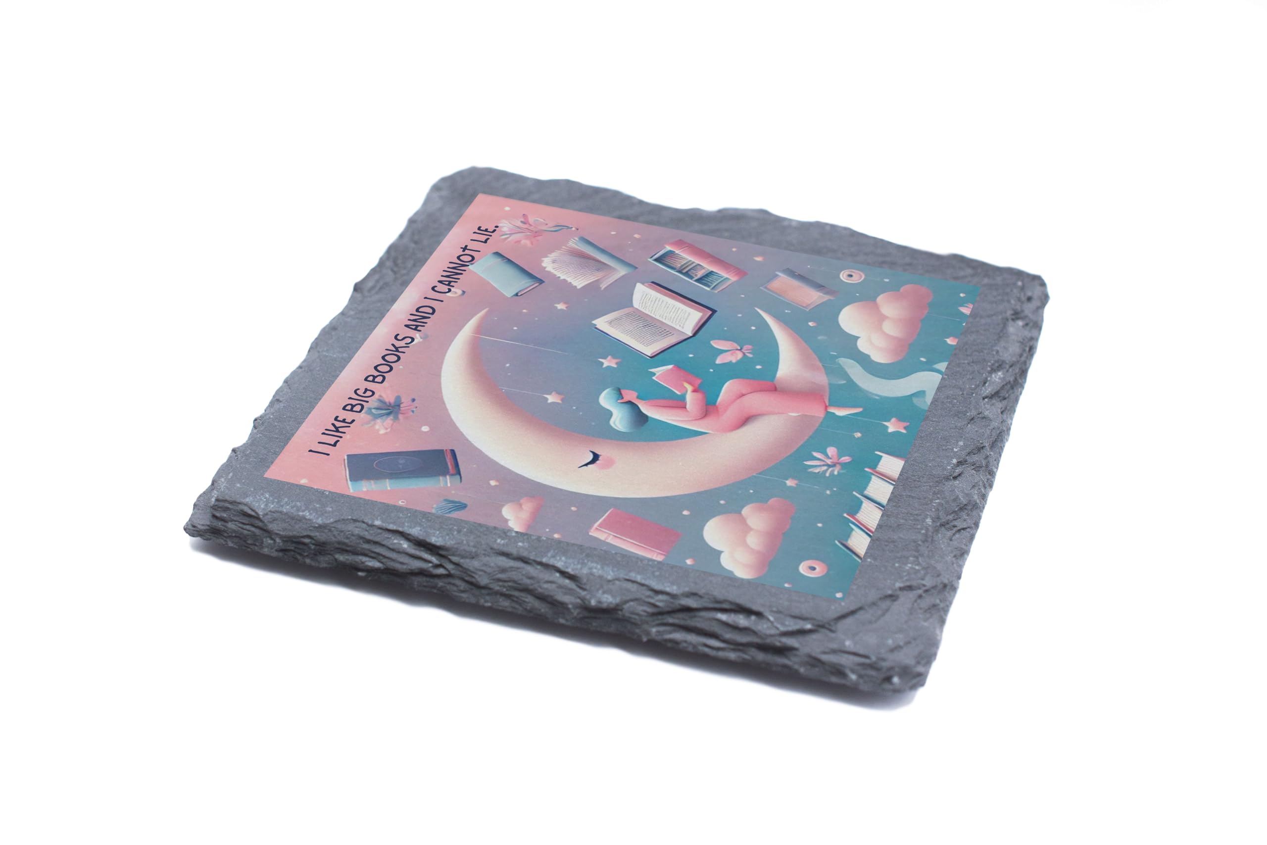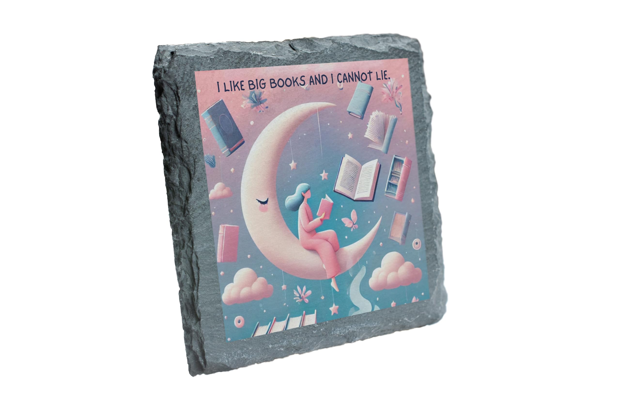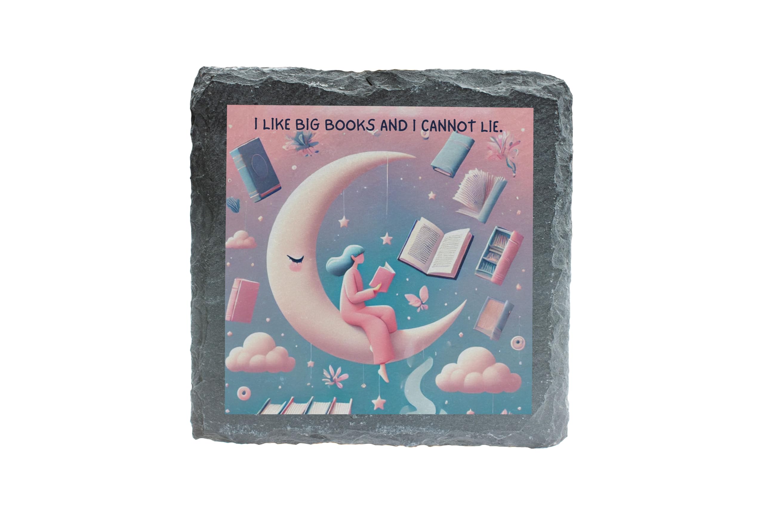 Celebrate your love of reading with this enchanting slate coaster featuring the playful phrase "I Like Big Books and I Cannot Lie." Paired with a celestial-themed illustration of a reader perched on a crescent moon, this design is perfect for bibliophiles who love to immerse themselves in magical stories. Crafted from durable natural slate, this coaster combines functionality with whimsical charm. It protects your furniture from spills, scratches, and heat, making it both practical and decorative. Its rustic texture and elegant design make it a versatile accessory for your living room, study, or reading nook. This slate coaster makes an excellent gift for book enthusiasts, whether for birthdays, holidays, or special occasions. Bring a touch of literary magic to your space or surprise a fellow book lover with this delightful and functional piece!