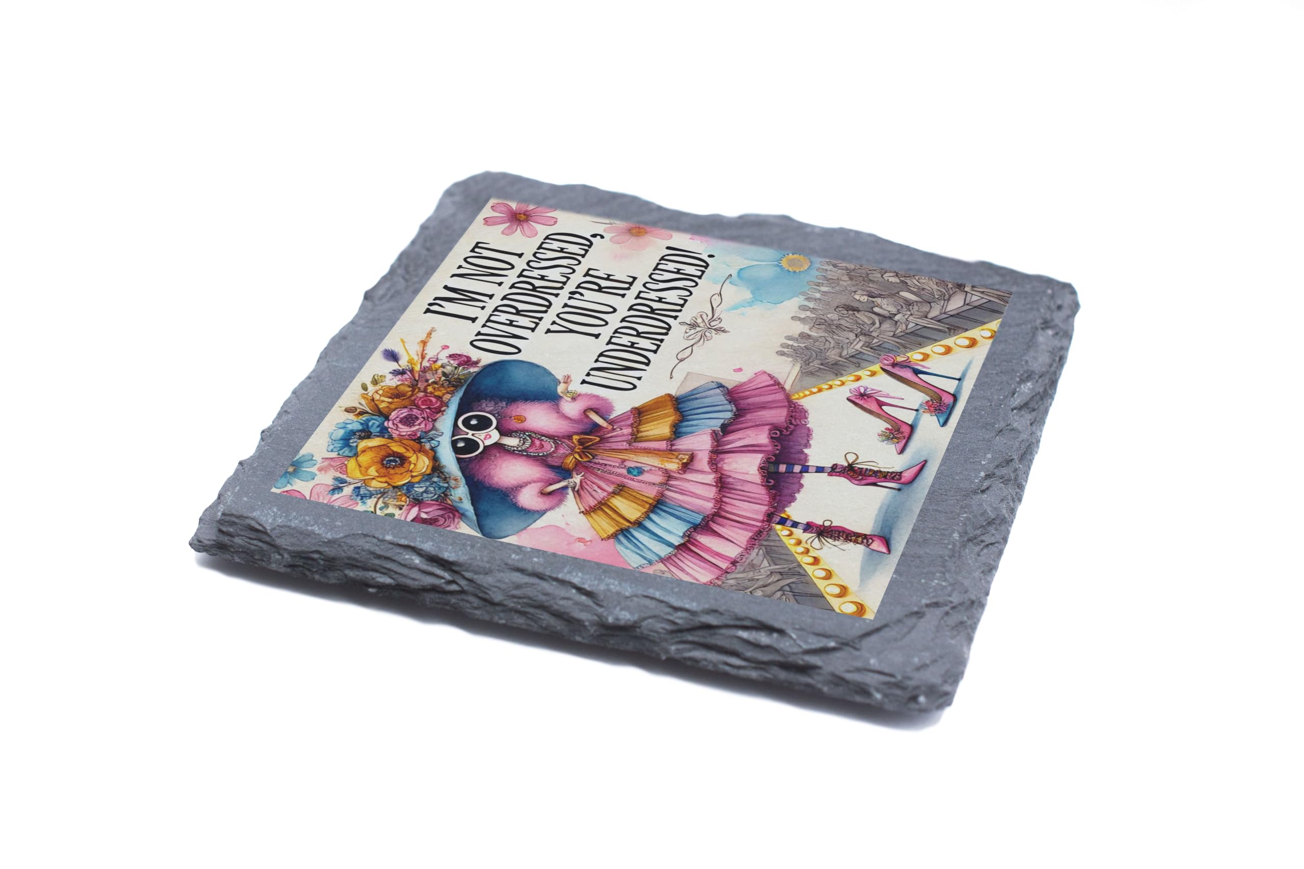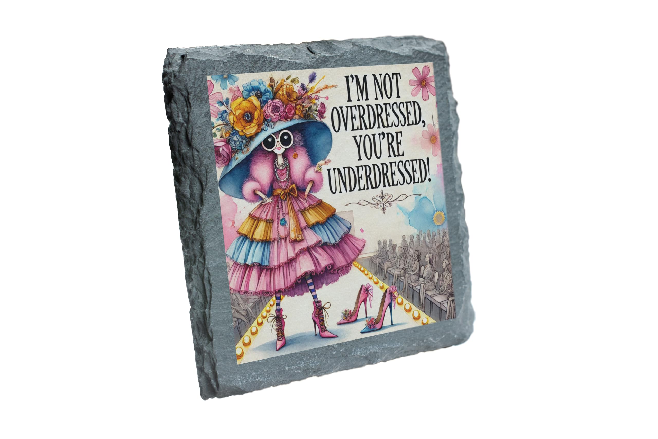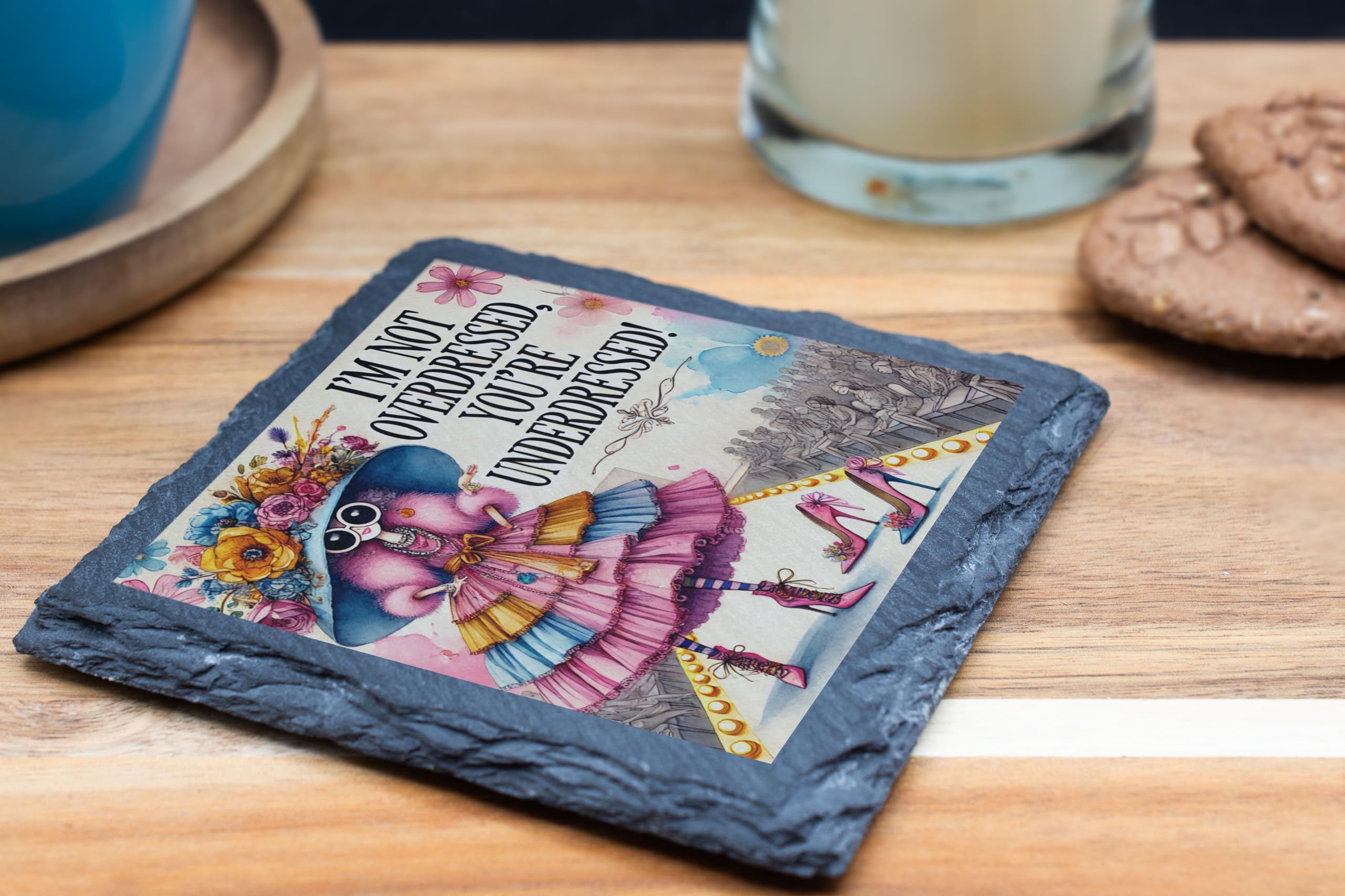 Add a dash of bold humor to your home with this unique slate coaster featuring the statement, "I'm Not Overdressed, You're Underdressed!" The vibrant, eye-catching illustration of a colorful and extravagantly dressed character is sure to make a statement and bring a smile to anyone's face. Crafted from natural slate, this coaster is not only durable and functional but also a stylish accessory for your coffee table, desk, or kitchen counter. Whether protecting your surfaces or sparking a conversation, it?s a must-have for anyone who embraces their unique style. This coaster makes for a fabulous gift for friends, family, or colleagues who love fashion and enjoy a good laugh. Durable, heat-resistant, and easy to clean, it's a charming and practical addition to any space.