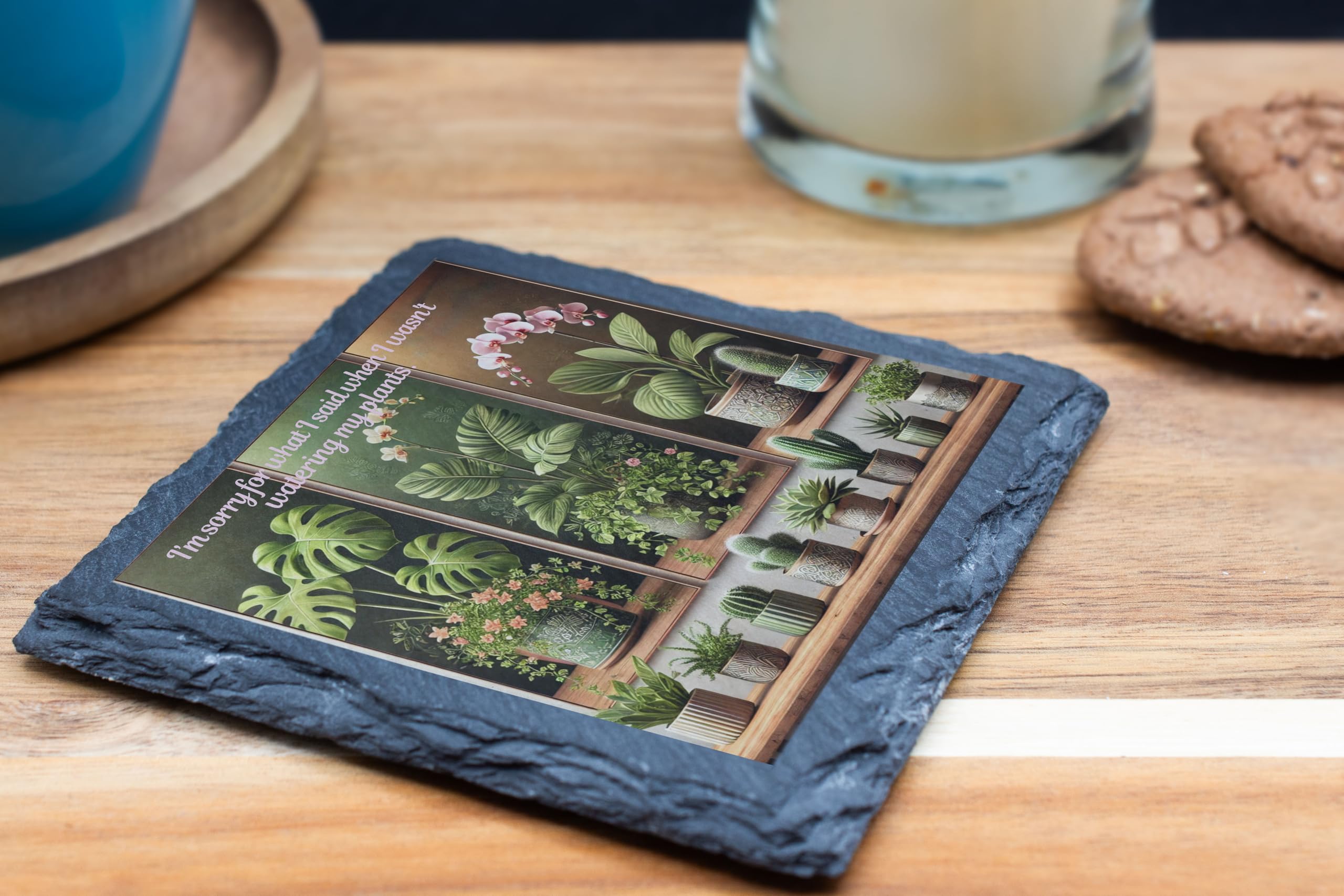 For plant lovers who appreciate a touch of humor, this slate coaster brings both style and functionality to your home. The witty text, "I'm Sorry for What I Said While Watering My Plants," perfectly complements the beautifully illustrated potted plants, making it a delightful addition to any coffee table, desk, or plant shelf. Crafted from premium natural slate, this coaster not only protects your surfaces but also enhances your decor with its rustic charm. It's the perfect gift for anyone who finds joy in nurturing their indoor garden or simply loves unique home accents. Whether you're sipping tea next to your favorite monstera or sharing laughs with friends, this coaster is a wonderful way to celebrate your love for plants and all the quirks that come with them.