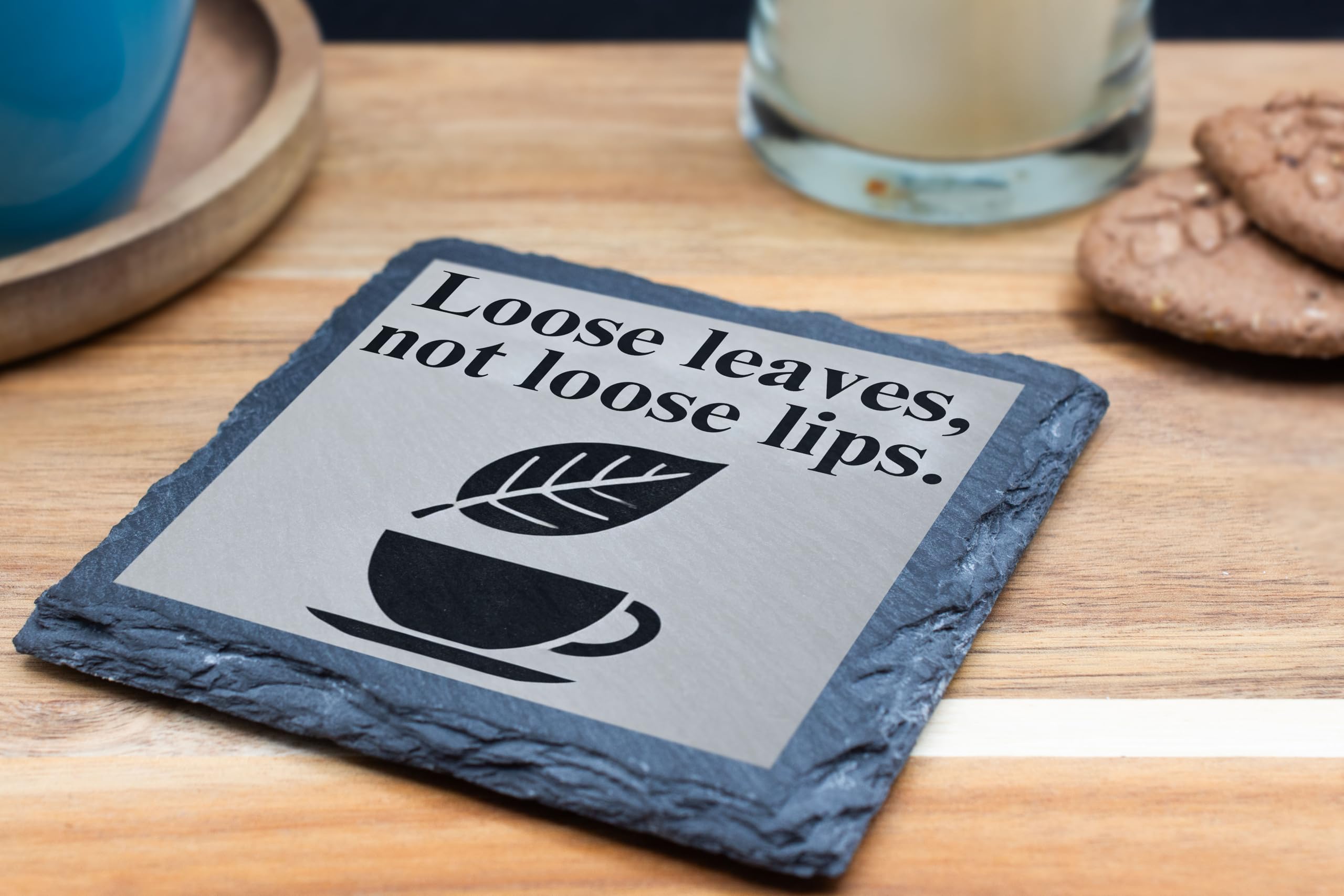 Add a touch of humor to your tea time with this elegant slate coaster featuring the witty phrase "Loose Leaves, Not Loose Lips." Designed for tea enthusiasts, this coaster combines functionality with a minimalist aesthetic, making it a charming addition to any space. Crafted from premium natural slate, this coaster is both stylish and durable. Its rustic texture and unique design make it a standout piece for protecting your surfaces from spills and scratches. Whether you're sipping tea solo or hosting a tea party, this coaster brings a smile to every cup. It also makes a thoughtful gift for tea lovers and connoisseurs alike.