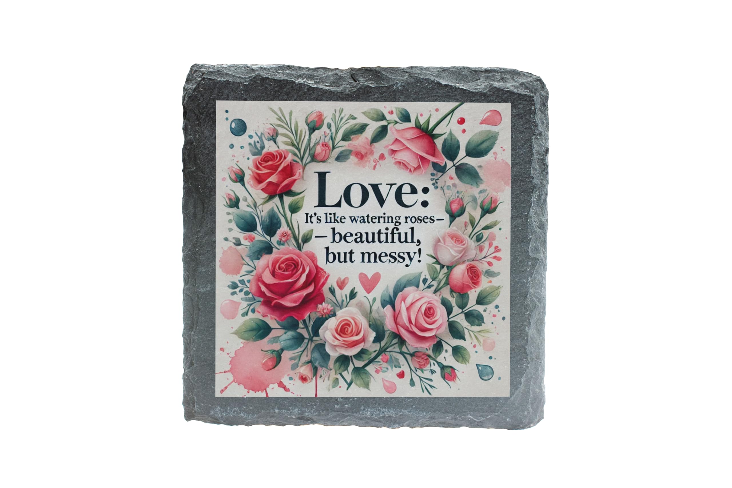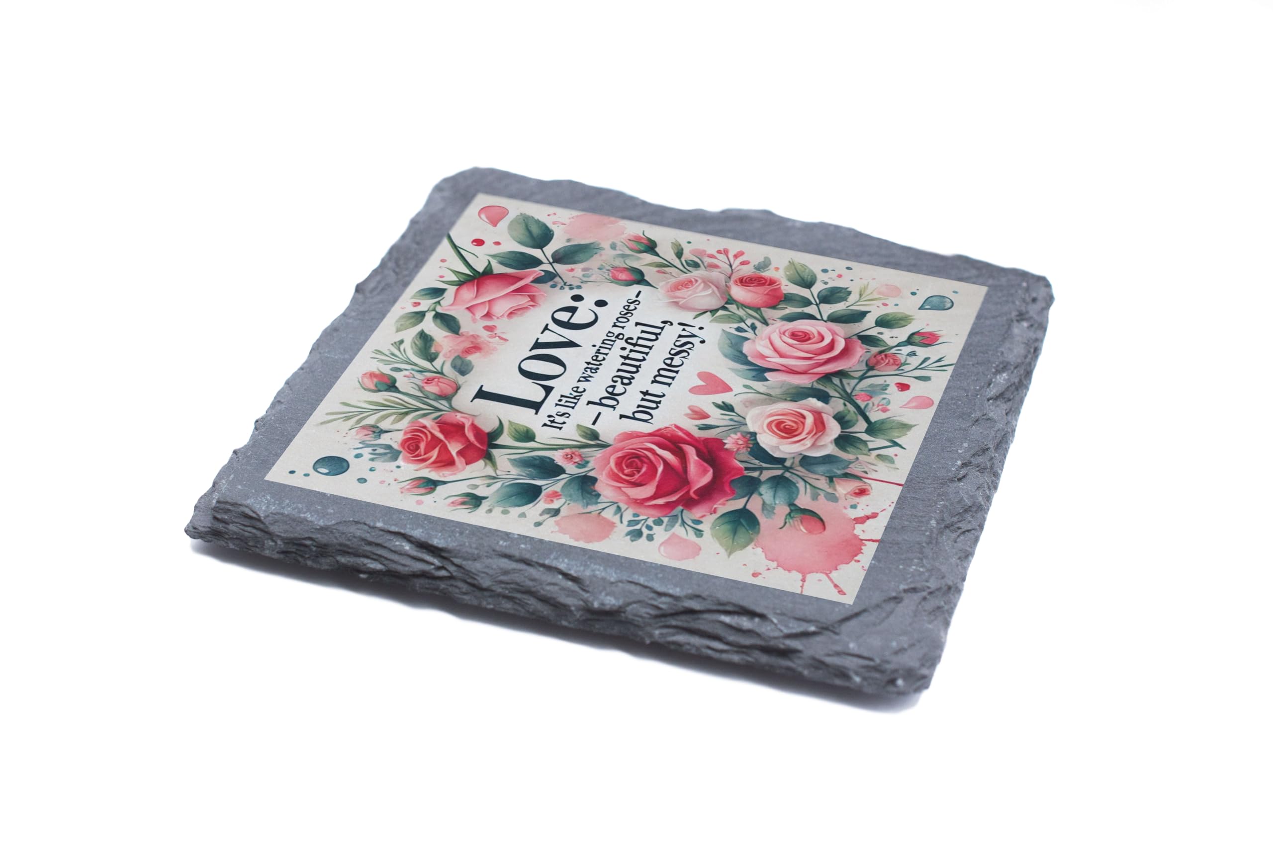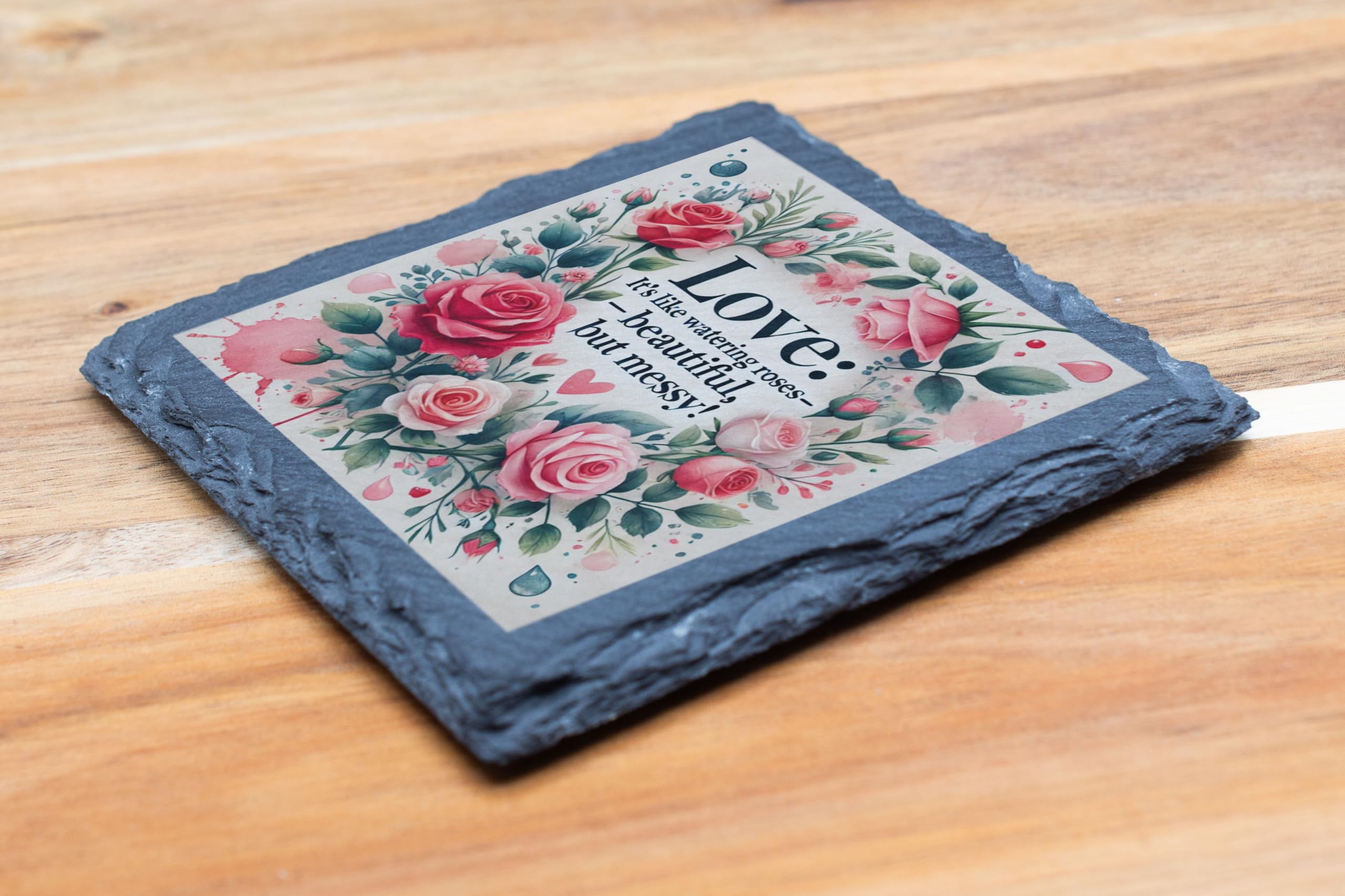 Celebrate the beauty and complexity of love with this exquisite slate coaster featuring a romantic floral design and the thoughtful phrase, "Love: It's like watering roses?beautiful but messy." Crafted from premium natural slate, this coaster is both practical and decorative, bringing a touch of elegance to your coffee table or dining area. The intricate watercolor-inspired rose motif makes it a meaningful gift for anniversaries, weddings, or any occasion celebrating love. Whether as a functional drink coaster or a decorative keepsake, this piece is a testament to life's beautifully messy moments.