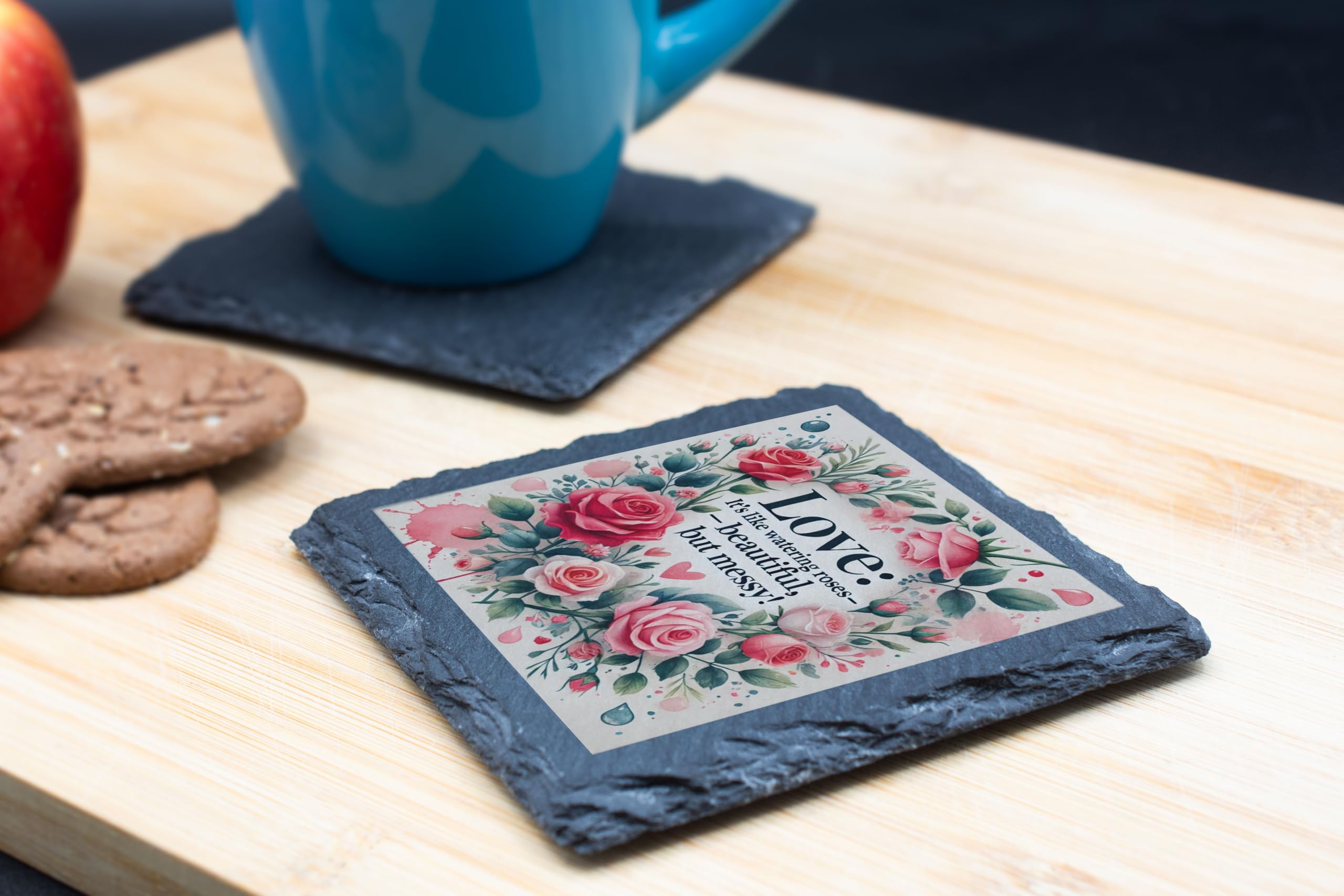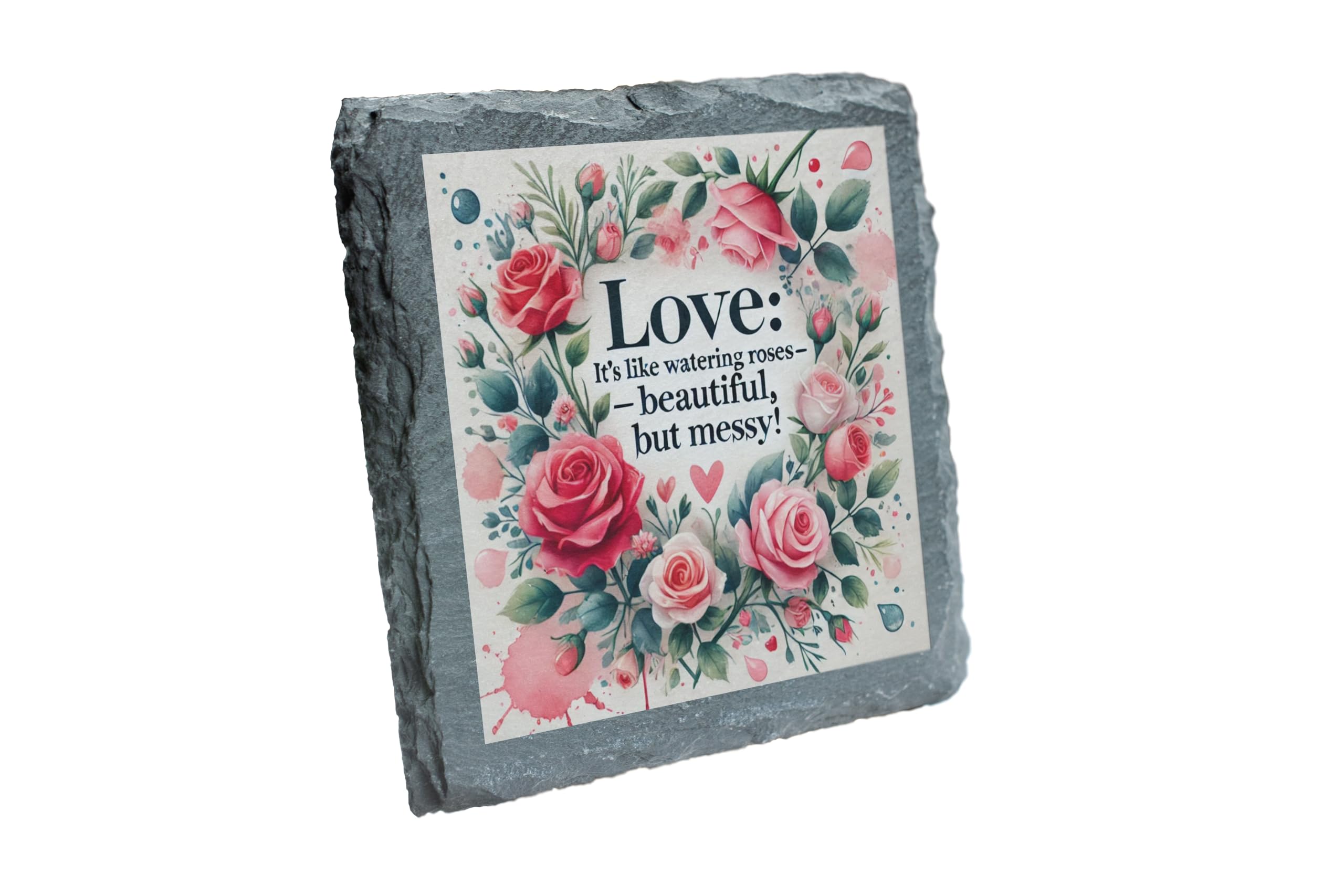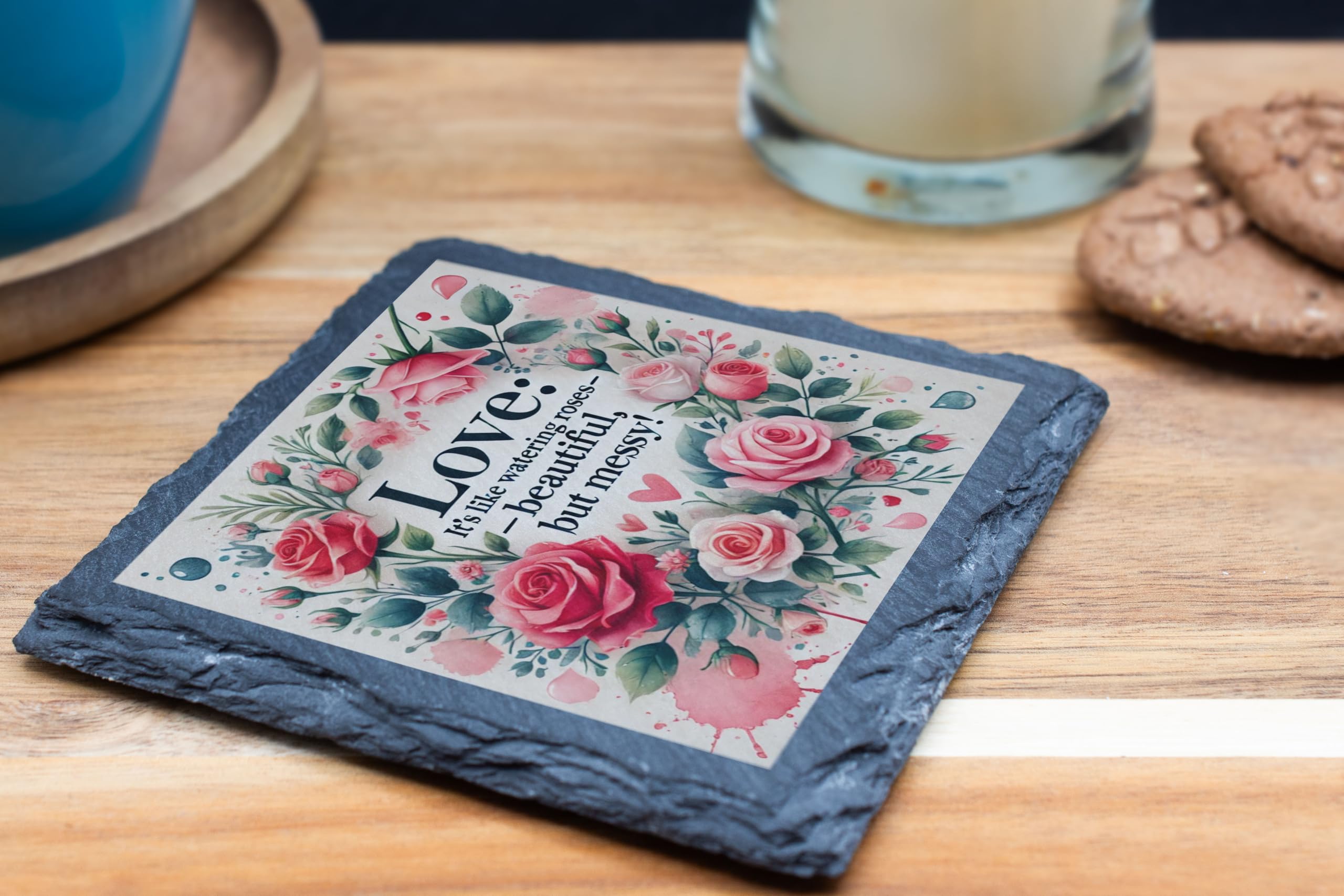 Celebrate the beauty and complexity of love with this exquisite slate coaster featuring a romantic floral design and the thoughtful phrase, "Love: It's like watering roses?beautiful but messy." Crafted from premium natural slate, this coaster is both practical and decorative, bringing a touch of elegance to your coffee table or dining area. The intricate watercolor-inspired rose motif makes it a meaningful gift for anniversaries, weddings, or any occasion celebrating love. Whether as a functional drink coaster or a decorative keepsake, this piece is a testament to life's beautifully messy moments.