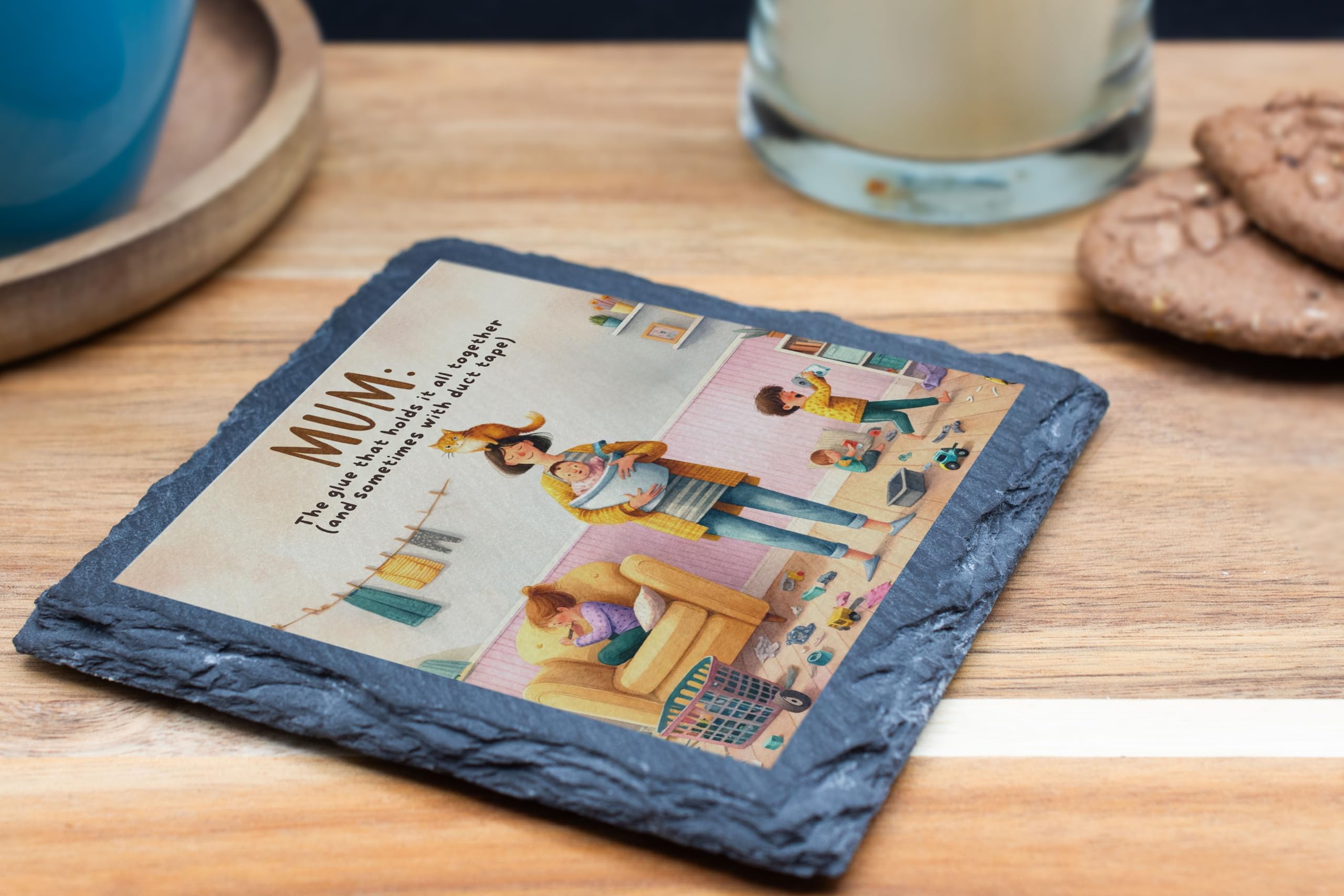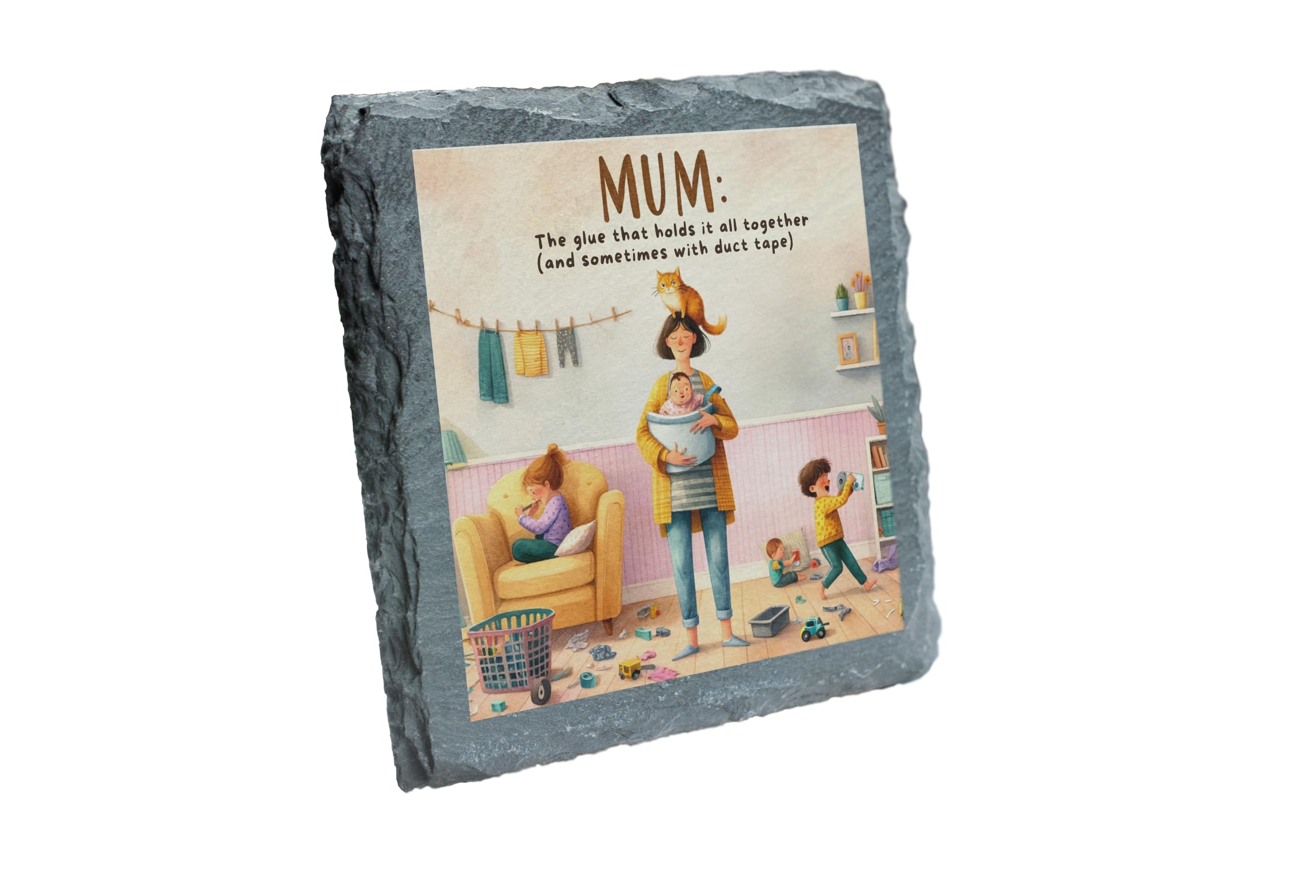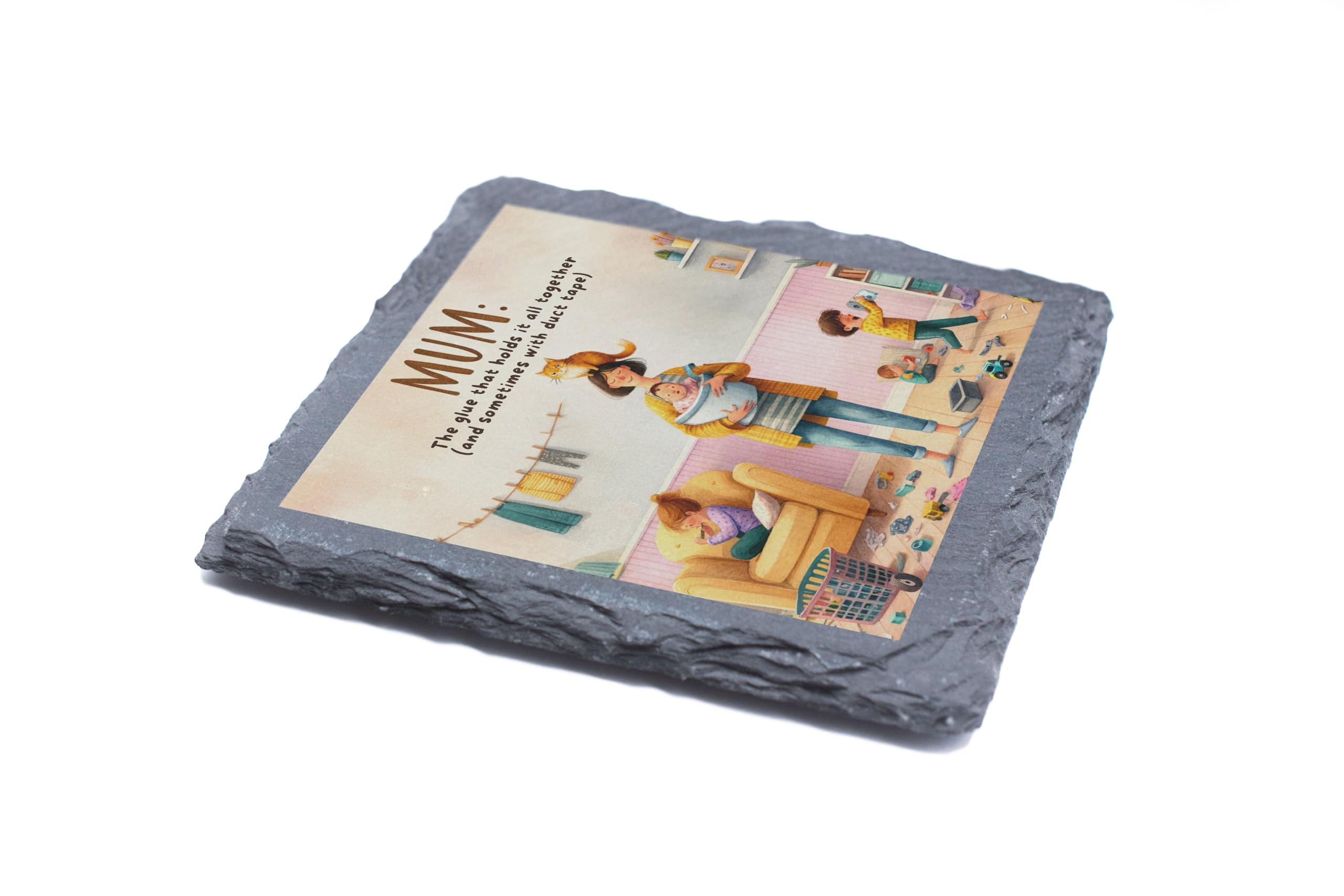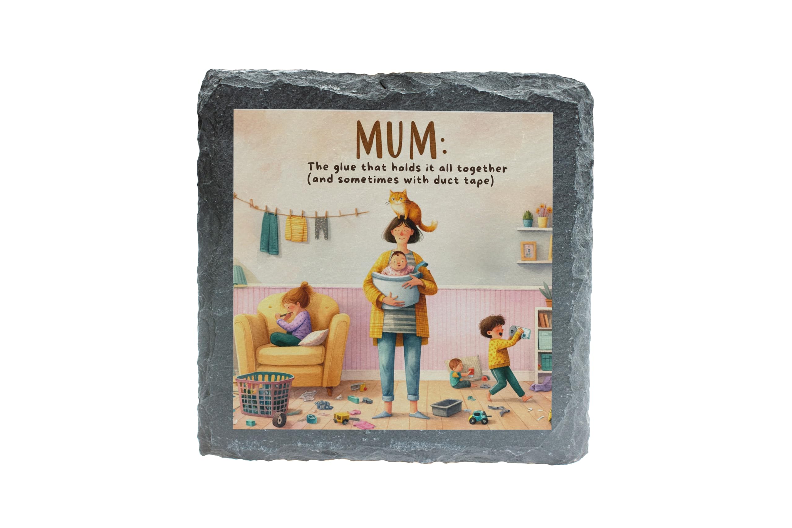 Celebrate the strength, humor, and love of motherhood with this delightful slate coaster featuring the phrase "Mum: The Glue That Holds It All Together (and Sometimes with Duct Tape)." Paired with a colorful and heartwarming illustration of family life, this coaster is a perfect tribute to the multitasking marvels we call mums. Crafted from durable natural slate, this coaster is designed to protect your surfaces from spills, heat, and scratches while adding charm and personality to your home. Its rustic texture and playful design make it a unique addition to coffee tables, kitchens, or any room that celebrates family life. This coaster makes an ideal gift for Mother?s Day, birthdays, or any occasion to show appreciation for mums who do it all. Whether for your own mum or a mum-to-be, this thoughtful and practical accessory is sure to bring a smile. Add warmth and humor to your space with this beautifully designed slate coaster!