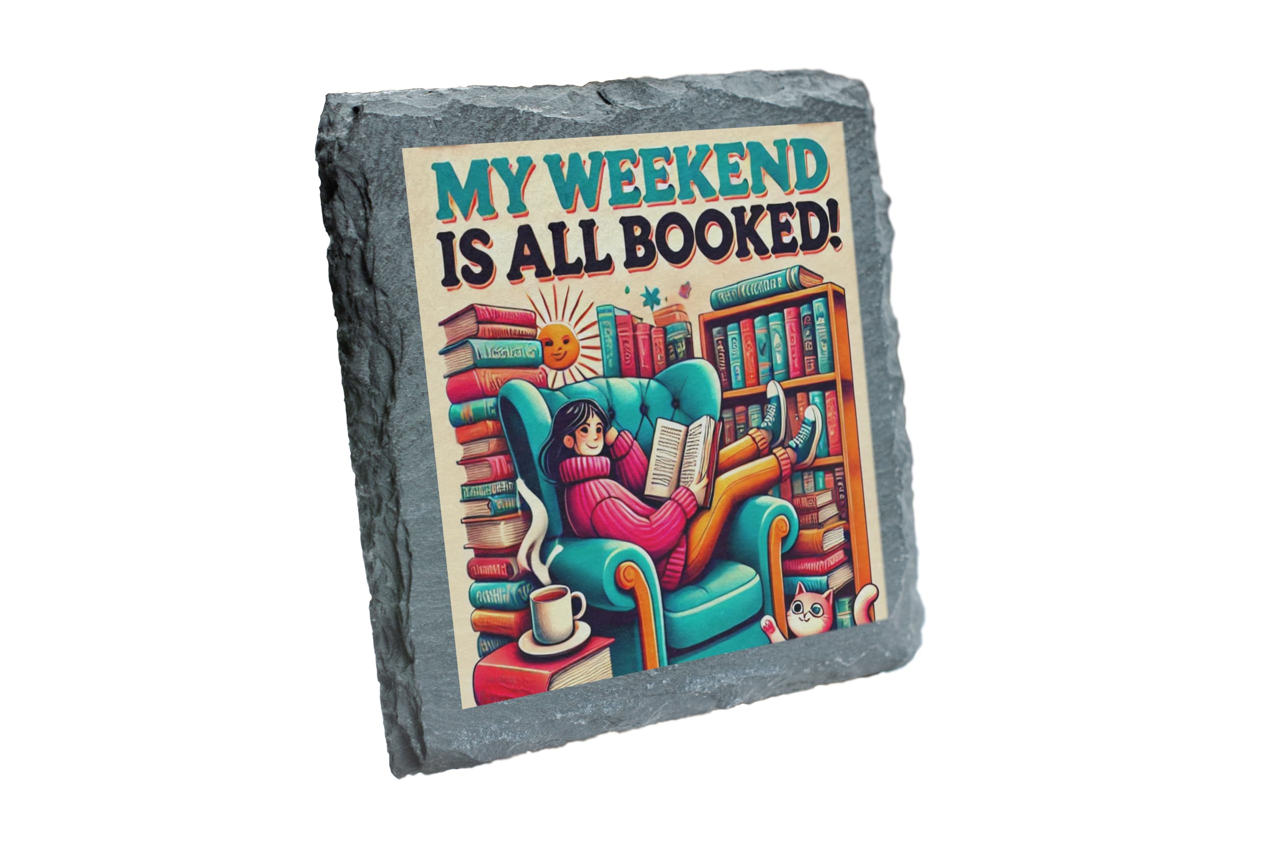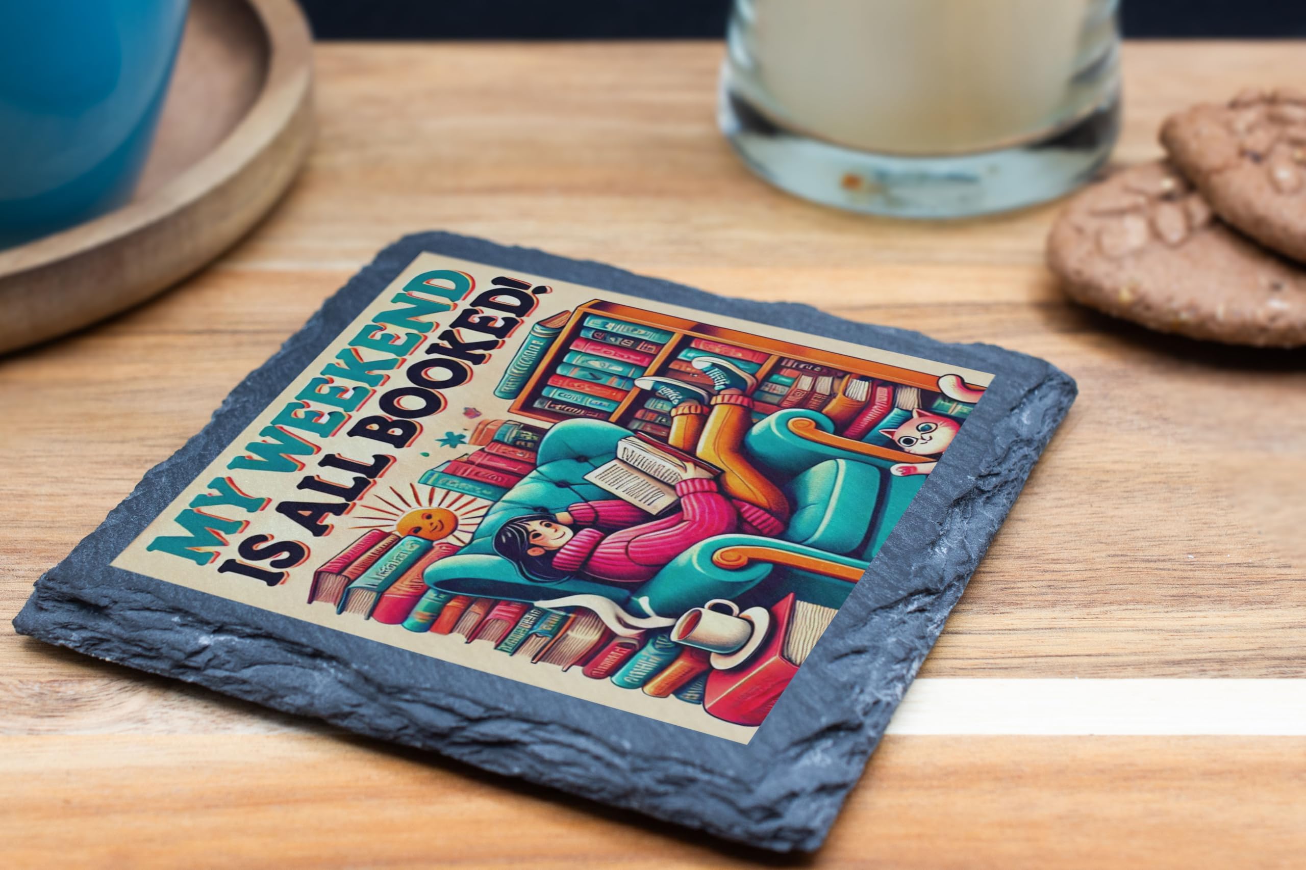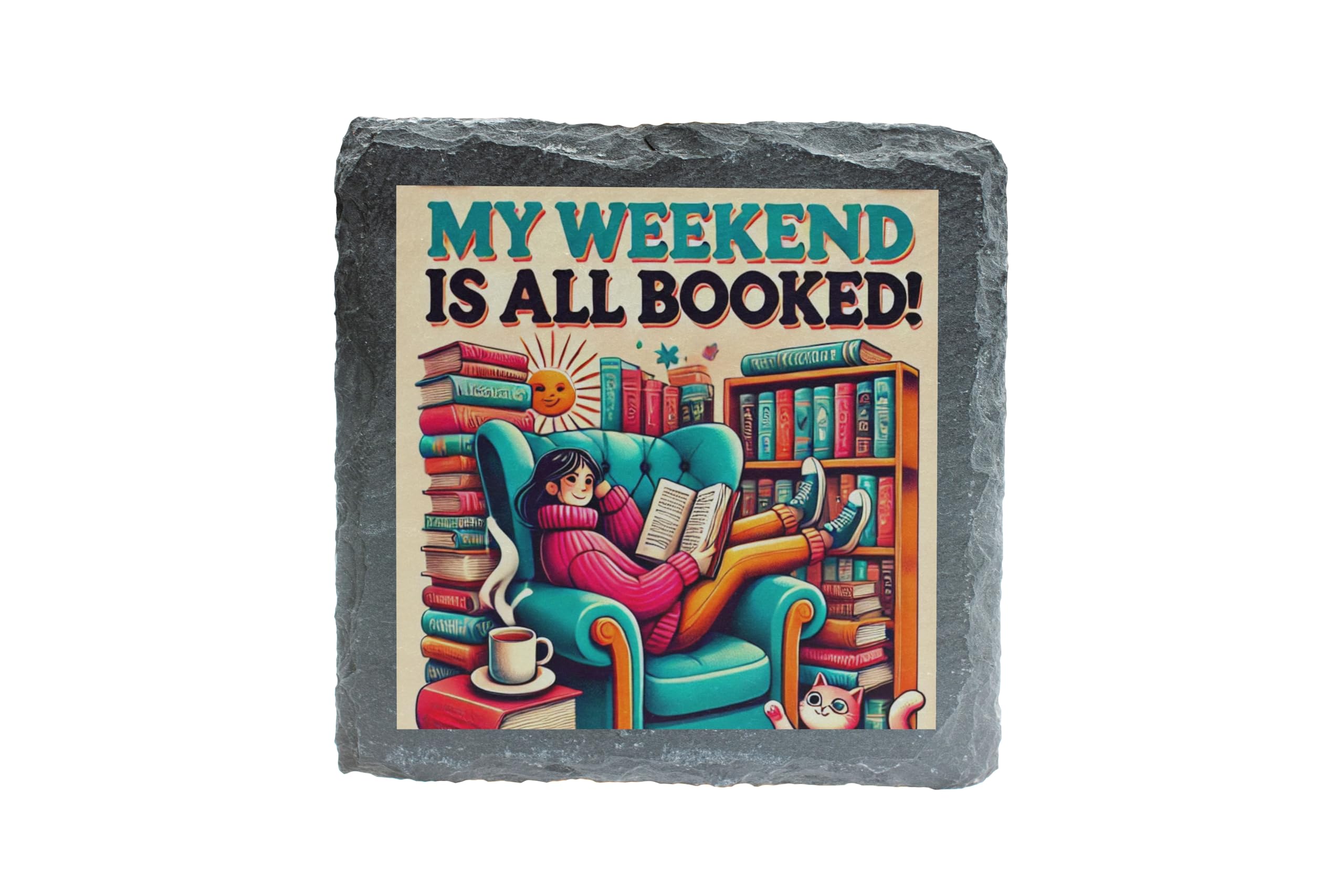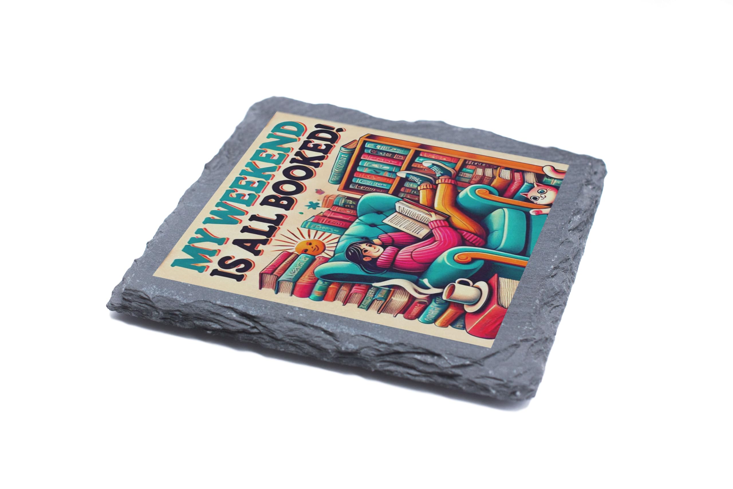 Celebrate your love of books with this delightful slate coaster, showcasing the witty phrase "My Weekend is All Booked!" Paired with a colorful and cozy illustration of a perfect reading nook, this coaster is a must-have for book lovers who enjoy a relaxing weekend with their favorite novels. Crafted from high-quality natural slate, this coaster is as functional as it is stylish. It provides excellent protection for your furniture from heat, spills, and scratches, while its rustic texture adds an elegant touch to the whimsical design. Perfect for a reading nook, study, or coffee table, this coaster is a book lover's dream accessory. This coaster makes an excellent gift for friends and family who are passionate about reading, whether for birthdays, holidays, or just because. Add a touch of personality to your space and celebrate the joy of getting lost in a good book with this unique and durable slate coaster!