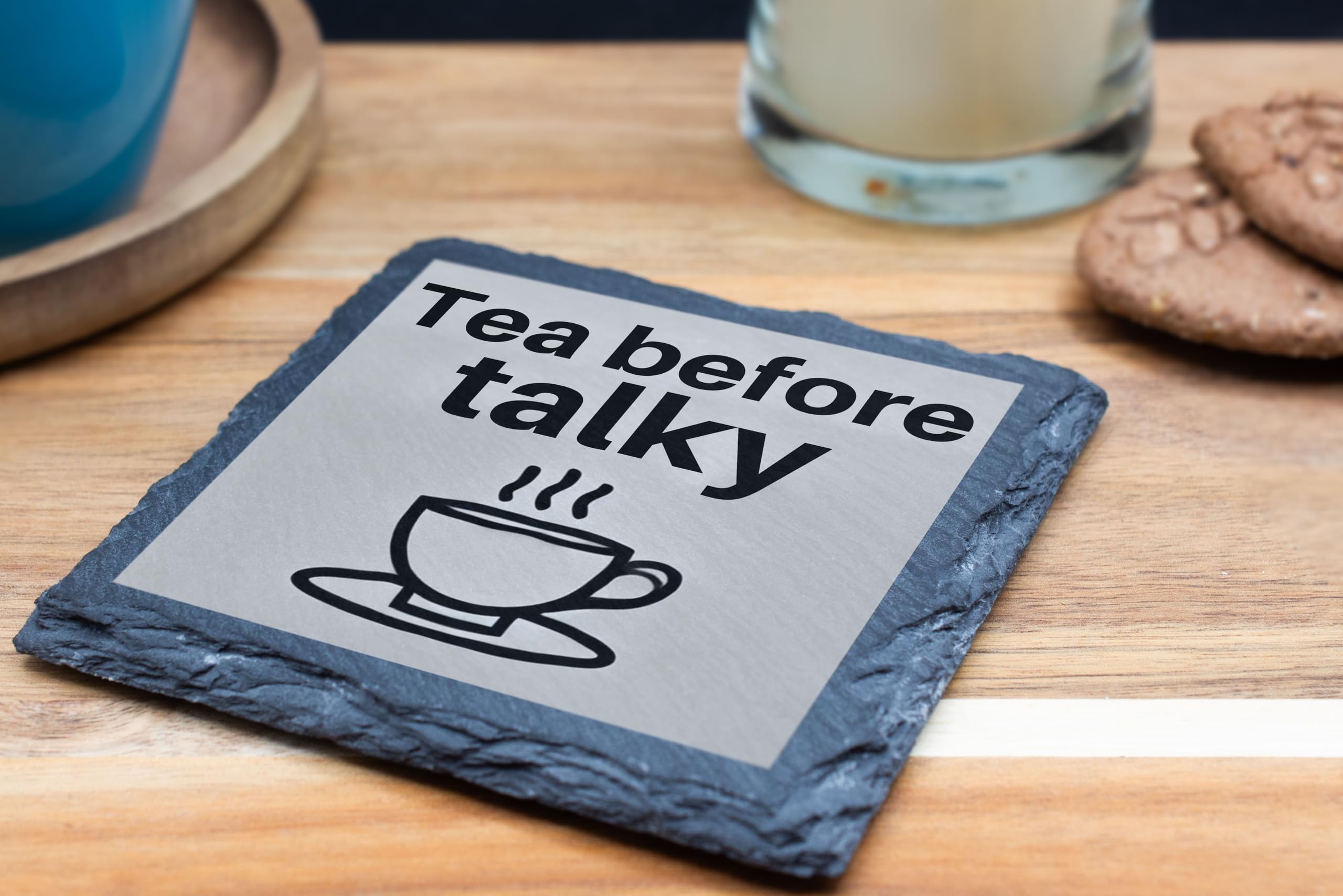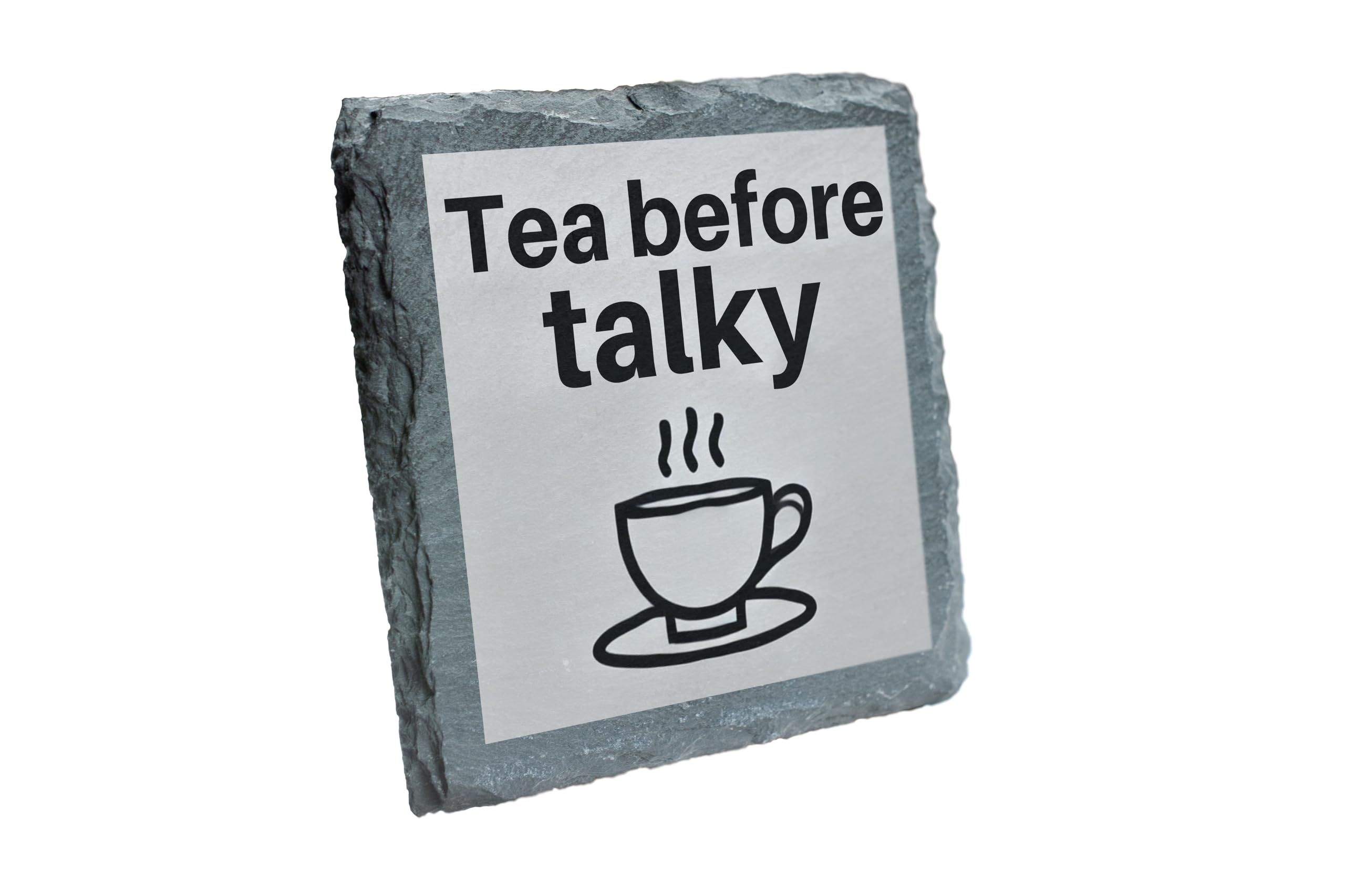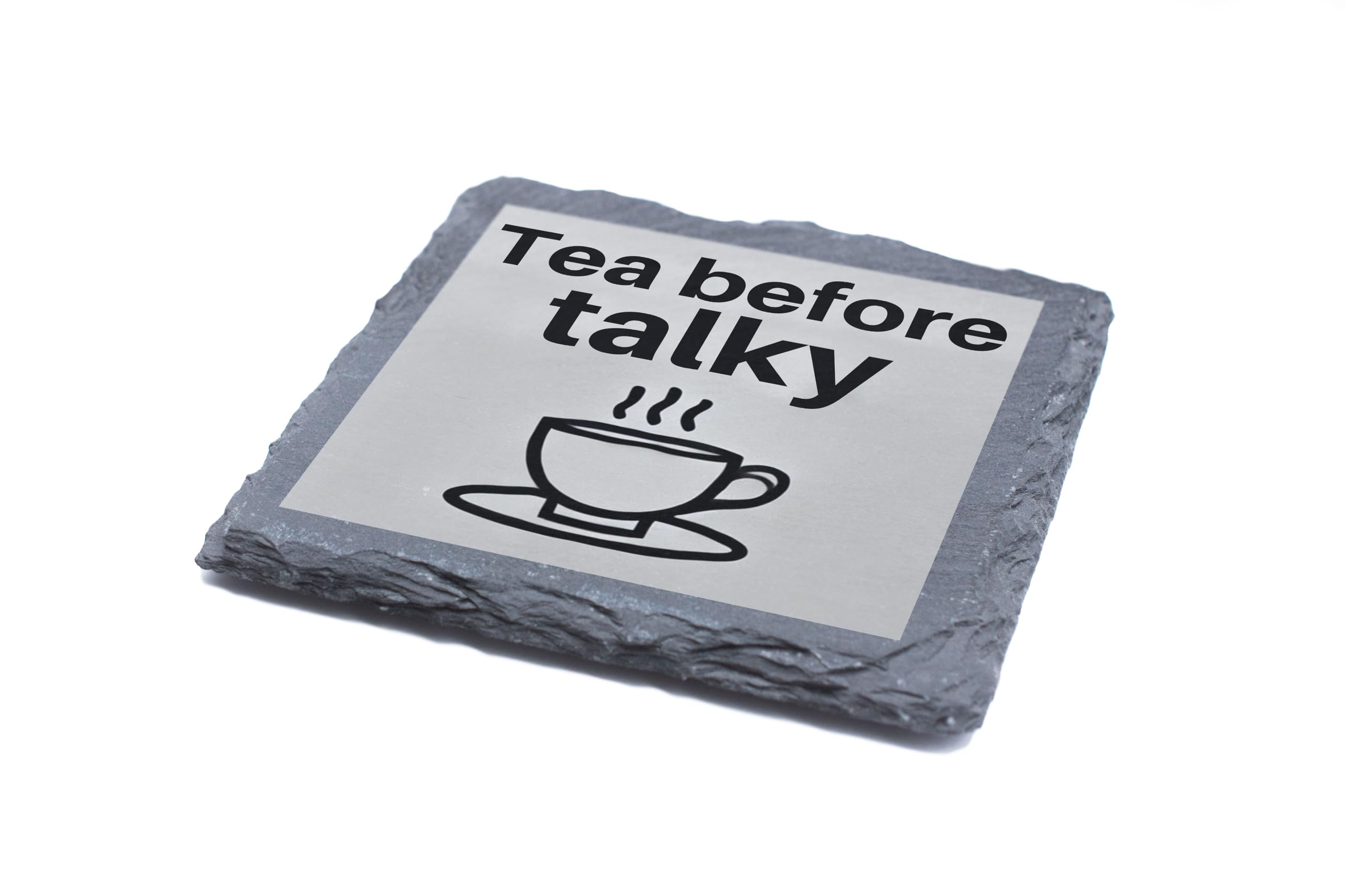 Slate Coaster - "Tea Before Talky" Witty and Functional Beverage Accessory (slco-ds24-talkyrg)