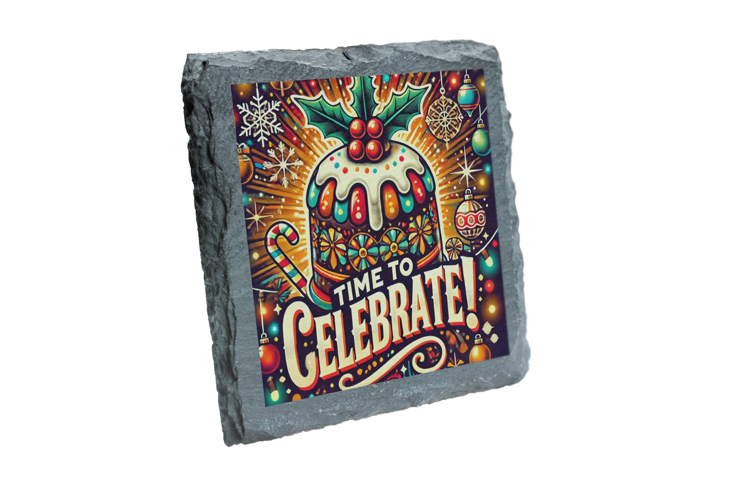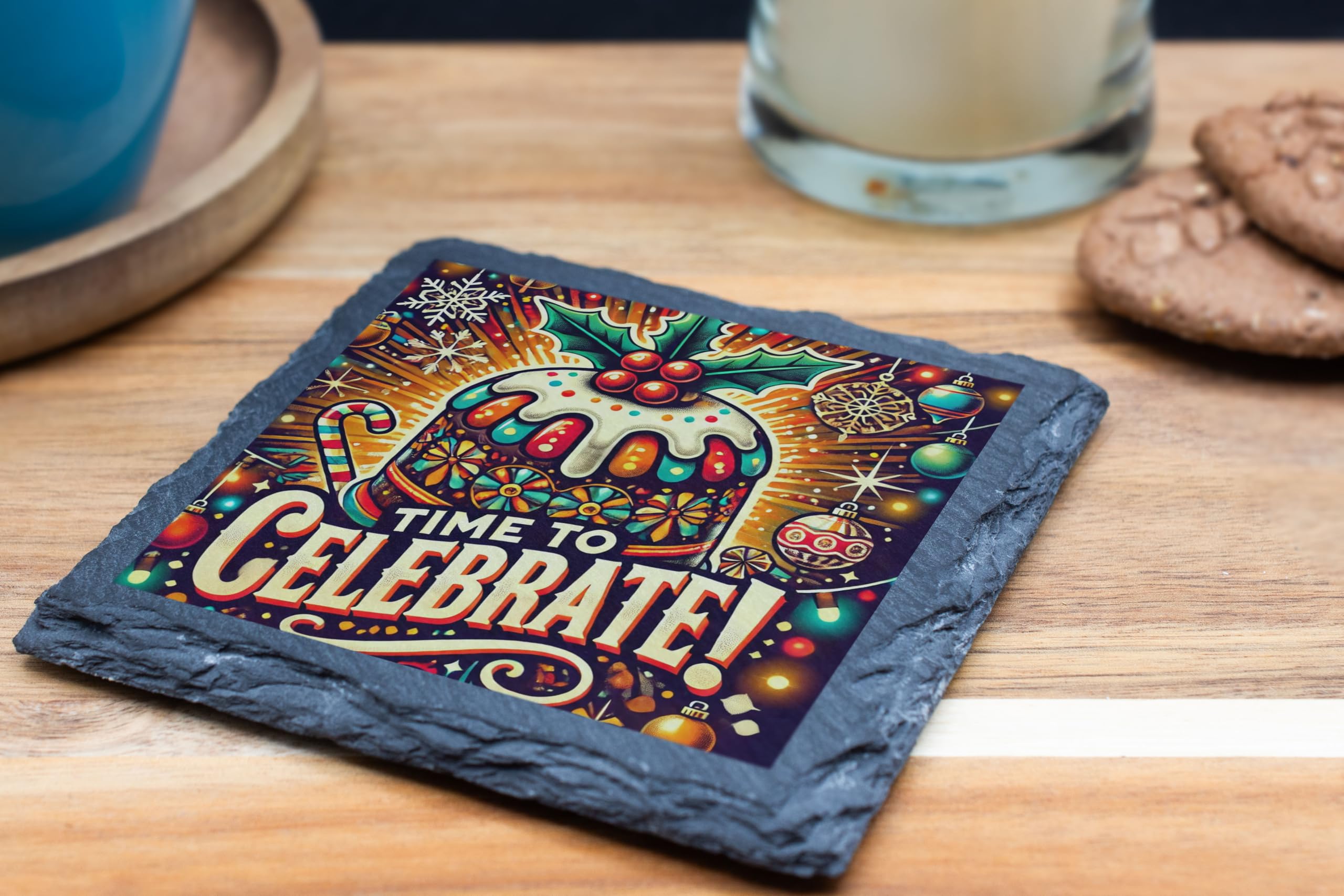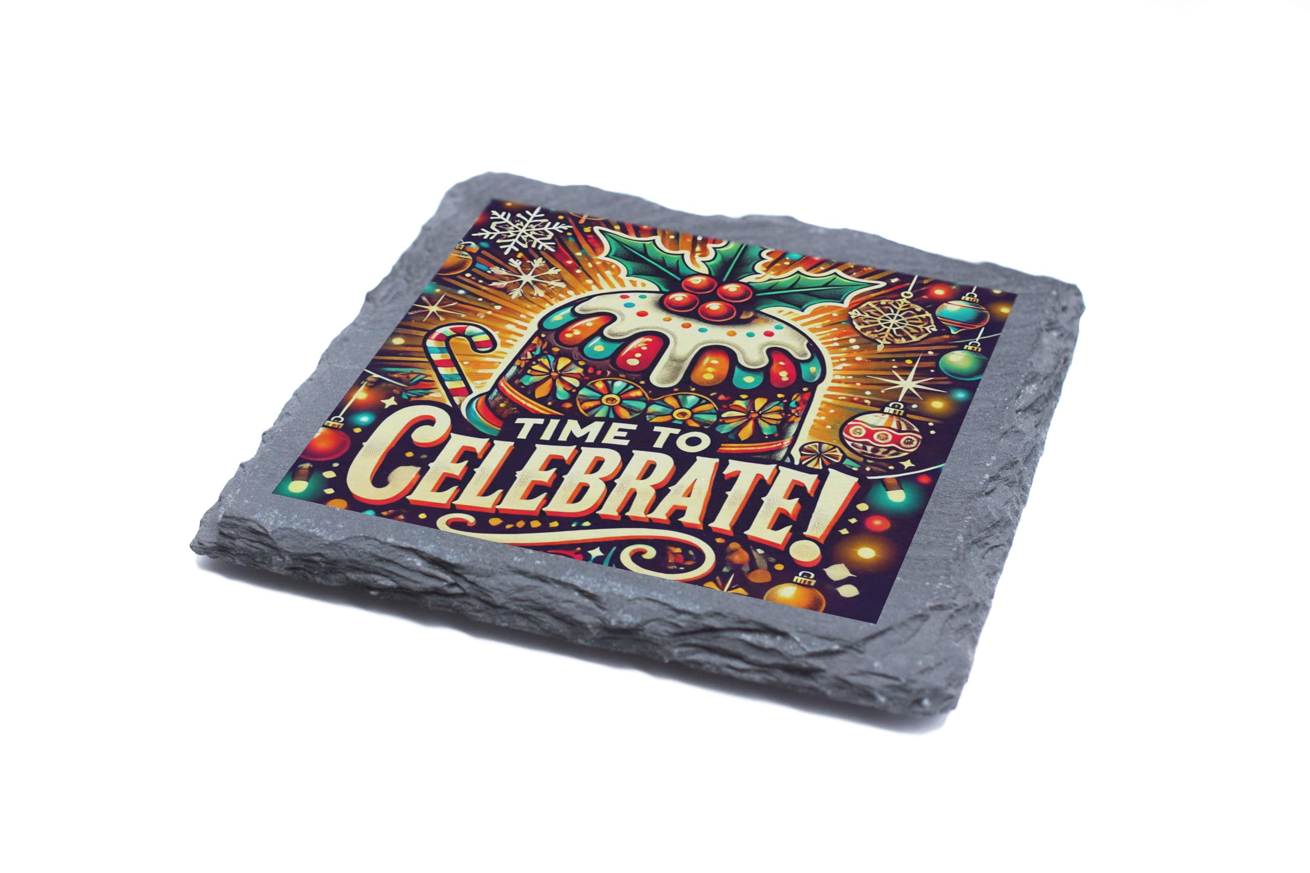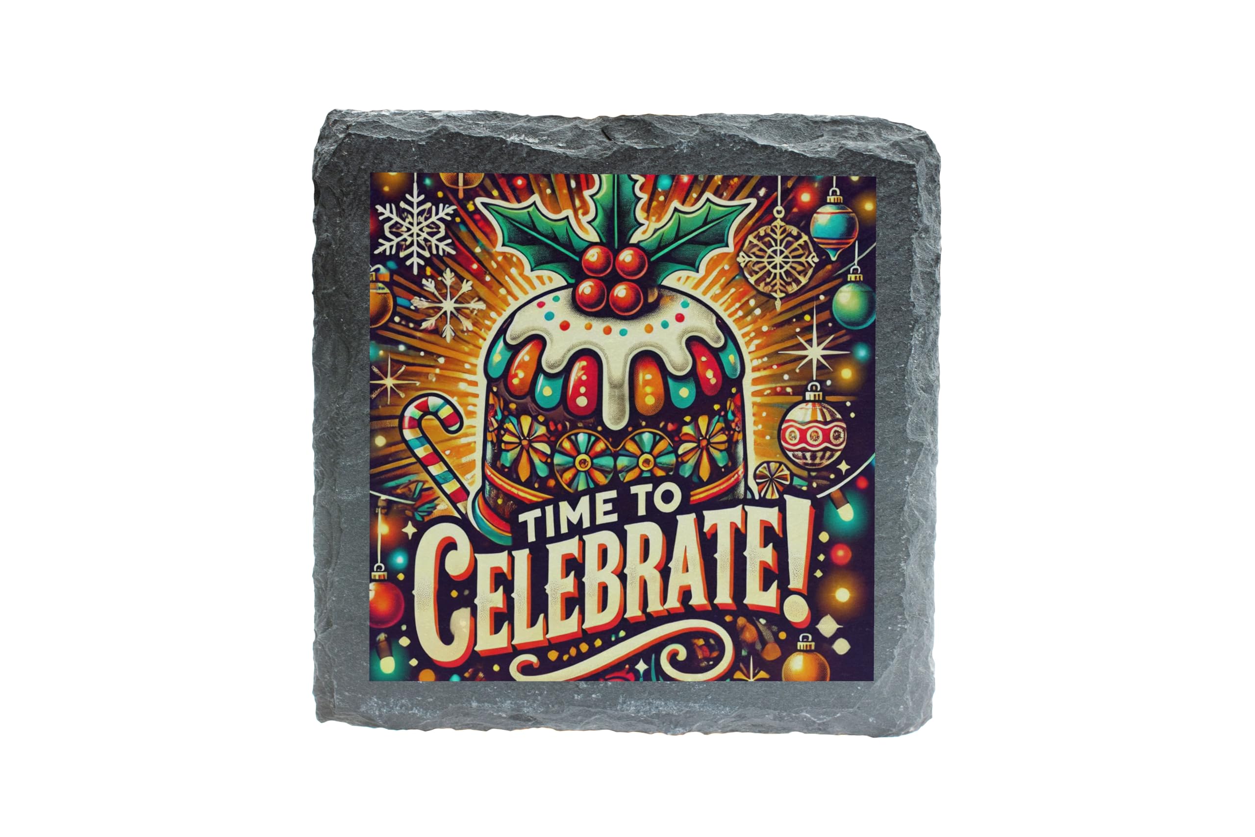 Celebrate the holiday season in style with this eye-catching "Time to Celebrate!" slate coaster. Designed with a rich and colorful depiction of a traditional Christmas pudding, this coaster adds warmth and joy to any festive occasion. Crafted from durable slate, it serves as both a decorative and functional addition to your holiday table, preventing water rings and spills while spreading holiday cheer. Whether you?re hosting a Christmas dinner or looking for a unique stocking filler, this coaster is the perfect blend of practicality and festive charm. Make every holiday moment special with this beautifully designed coaster that reminds everyone it's time to celebrate!