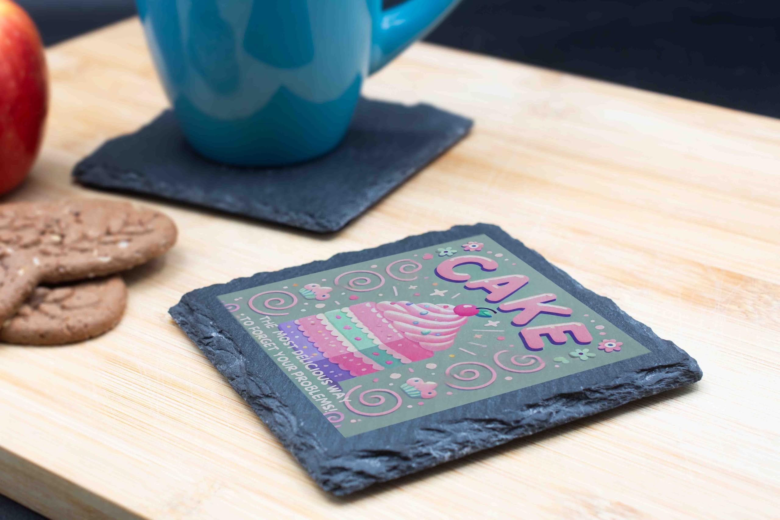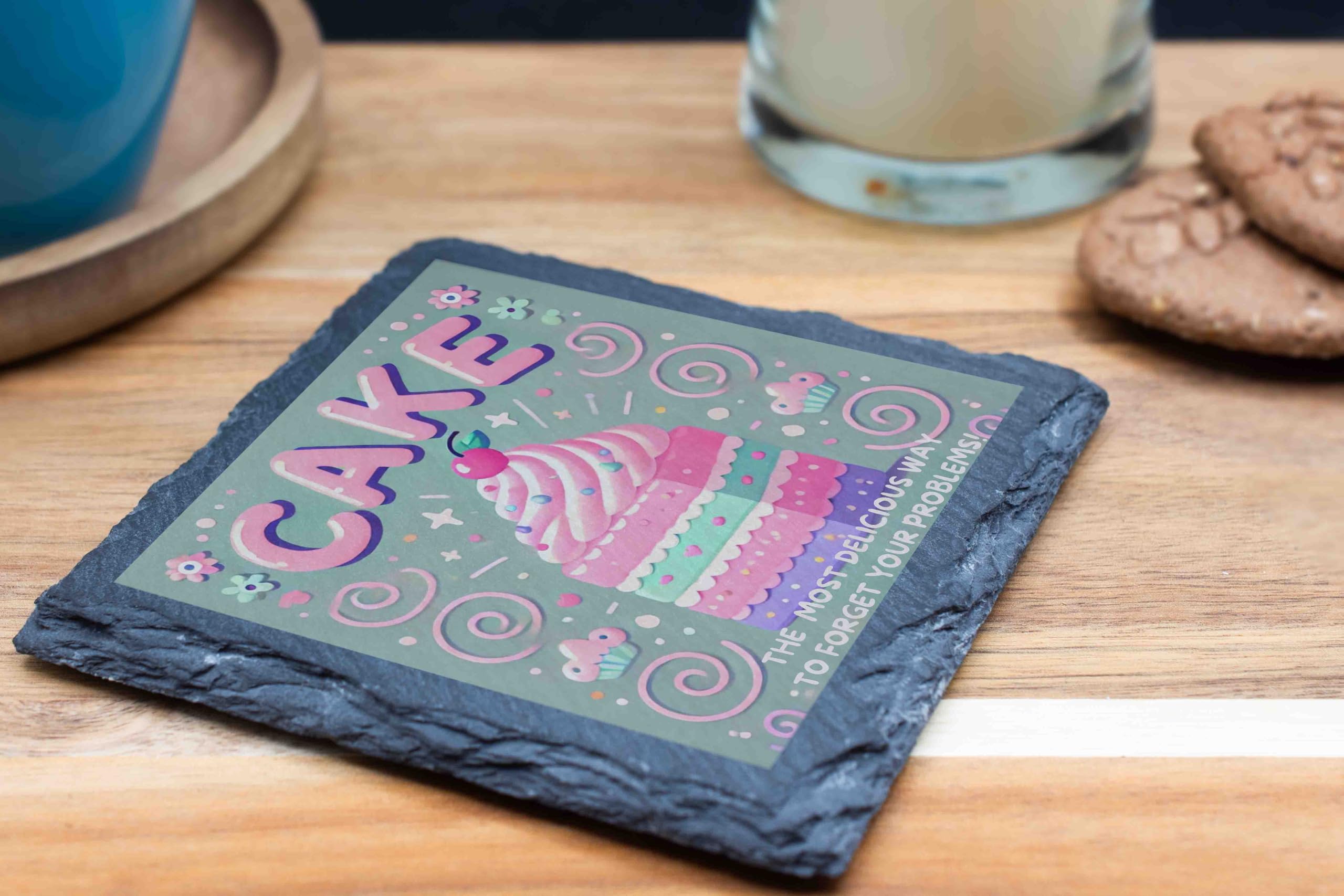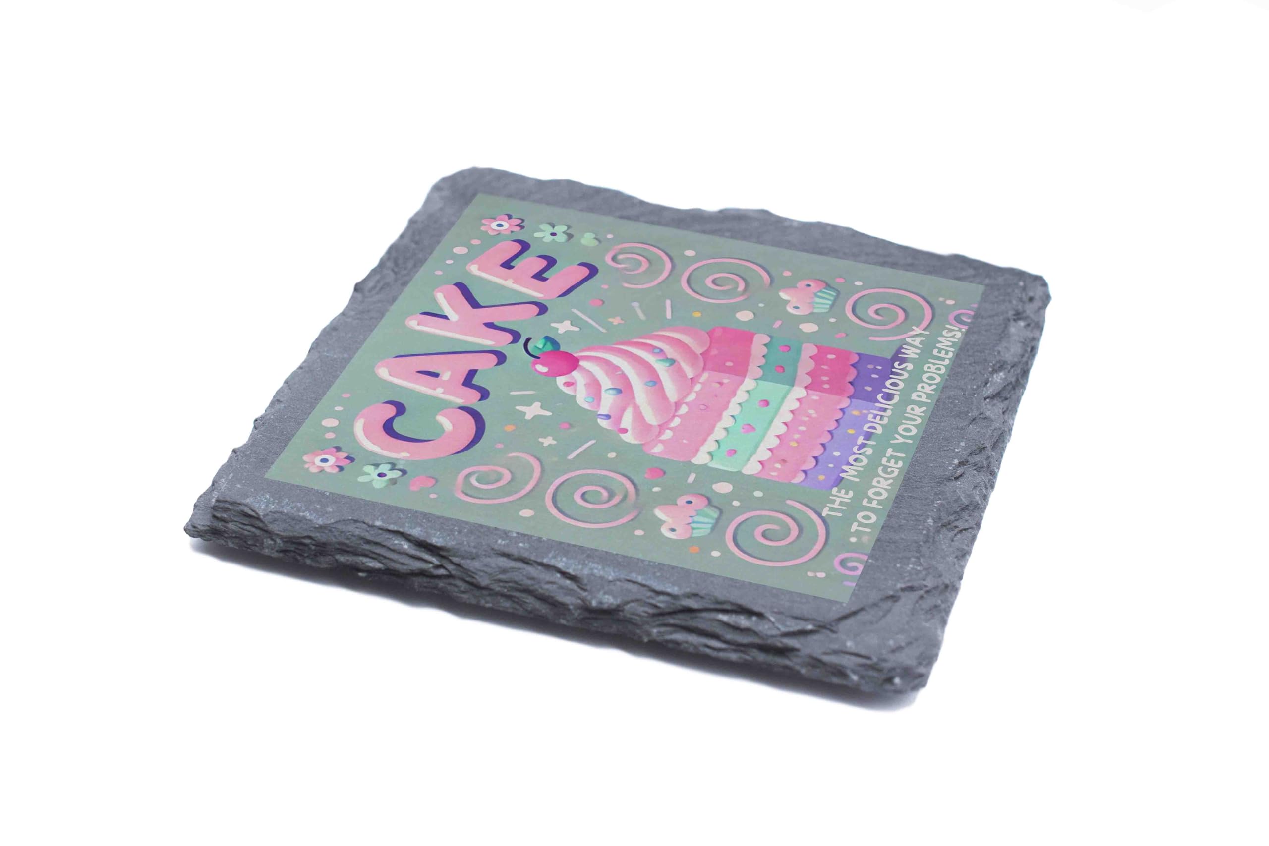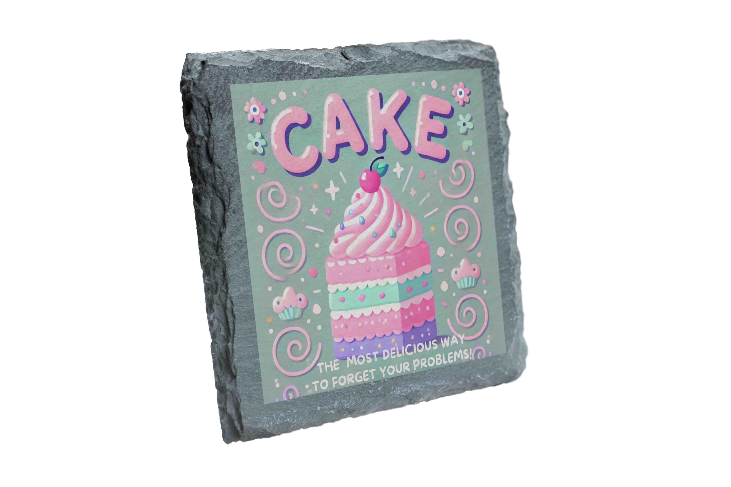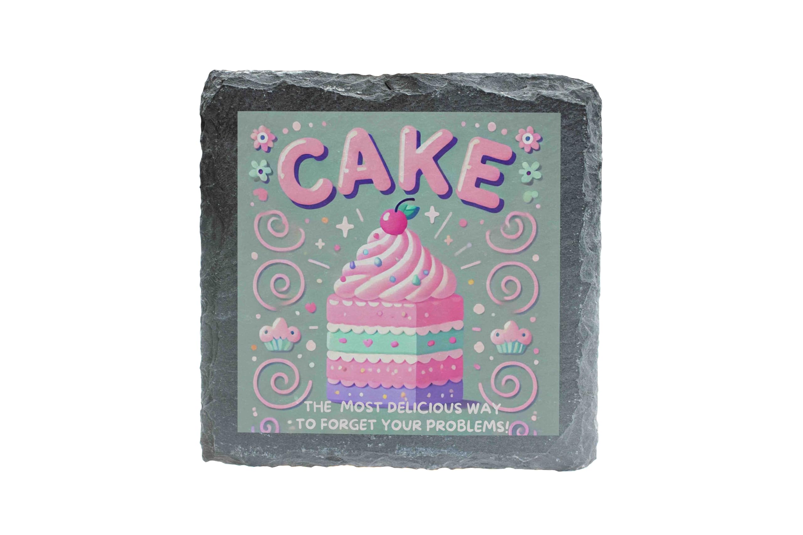 Brighten up your coffee table or dining area with this whimsical Cake-Themed Slate Coaster, designed to bring joy to any dessert lover. Showcasing a beautifully illustrated pastel cake surrounded by fun decorations and the witty phrase: "The Most Delicious Way to Forget Your Problems," this coaster is the perfect blend of functionality and charm. Crafted from natural slate with rough-hewn edges, it adds a rustic elegance to any setting while protecting your surfaces from heat, condensation, and spills. Whether you're enjoying a slice of your favorite cake or sipping a cup of tea, this coaster is sure to make you smile. Perfect as a gift for bakers, cake enthusiasts, or anyone with a love for sweet treats, this coaster is an ideal pick for birthdays, housewarmings, or just because!