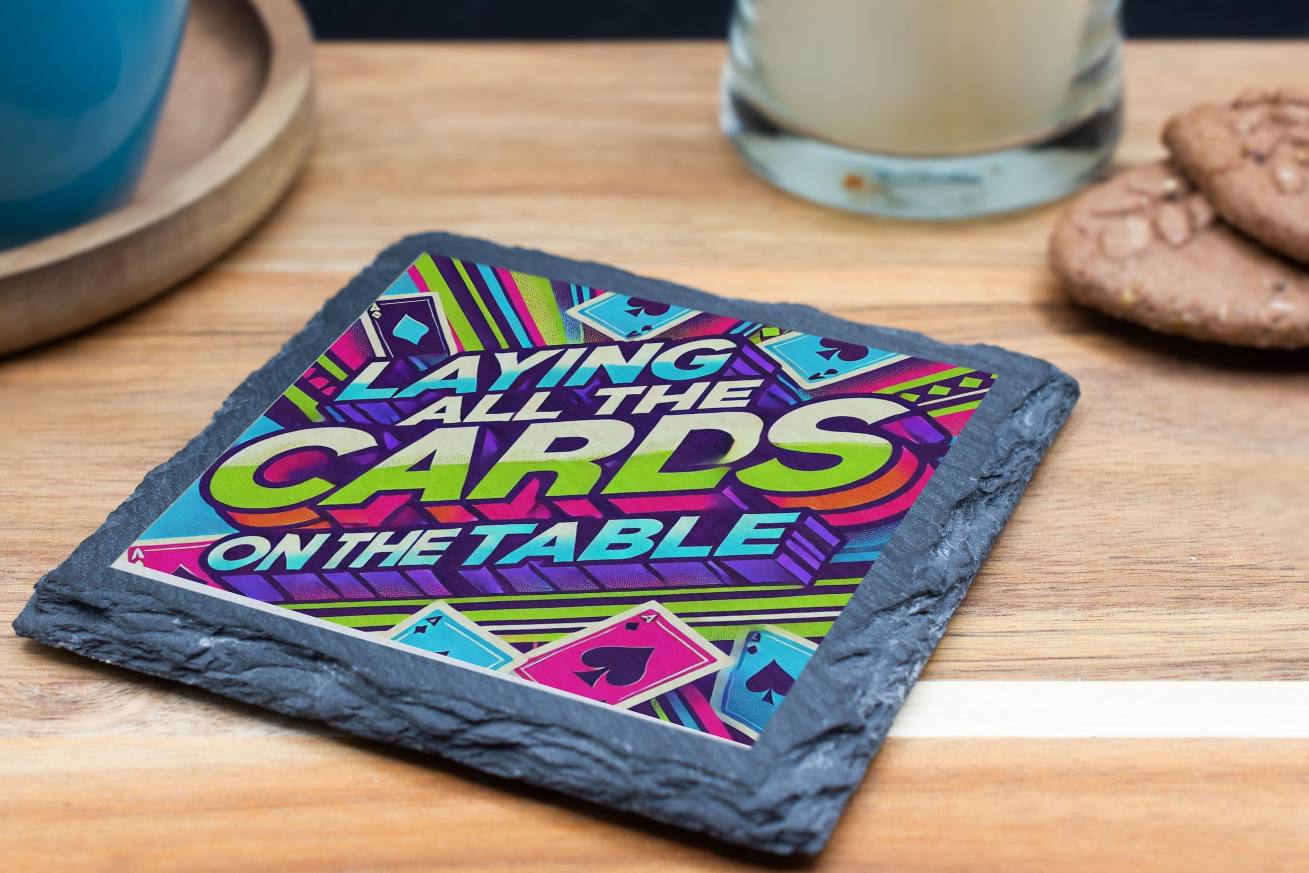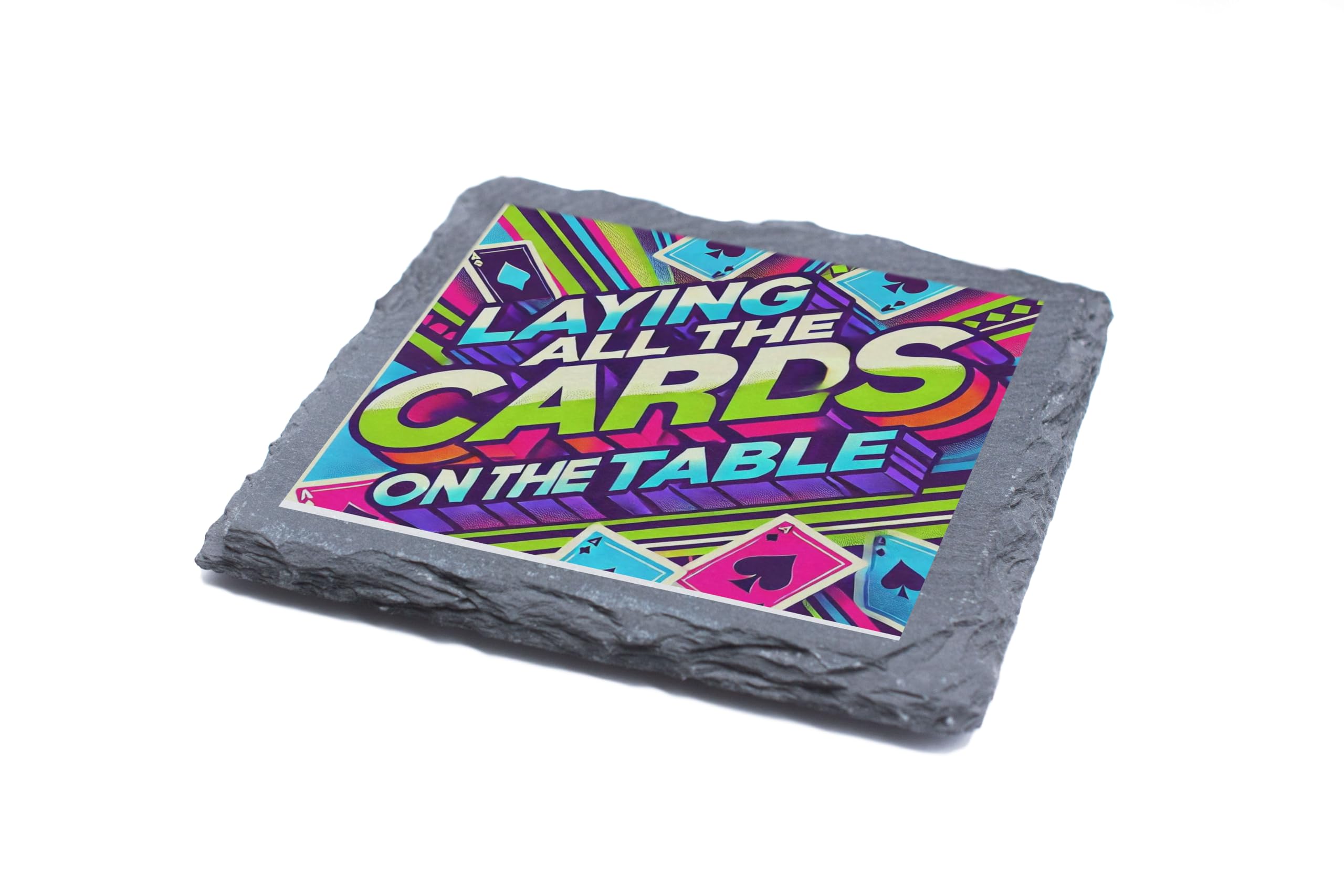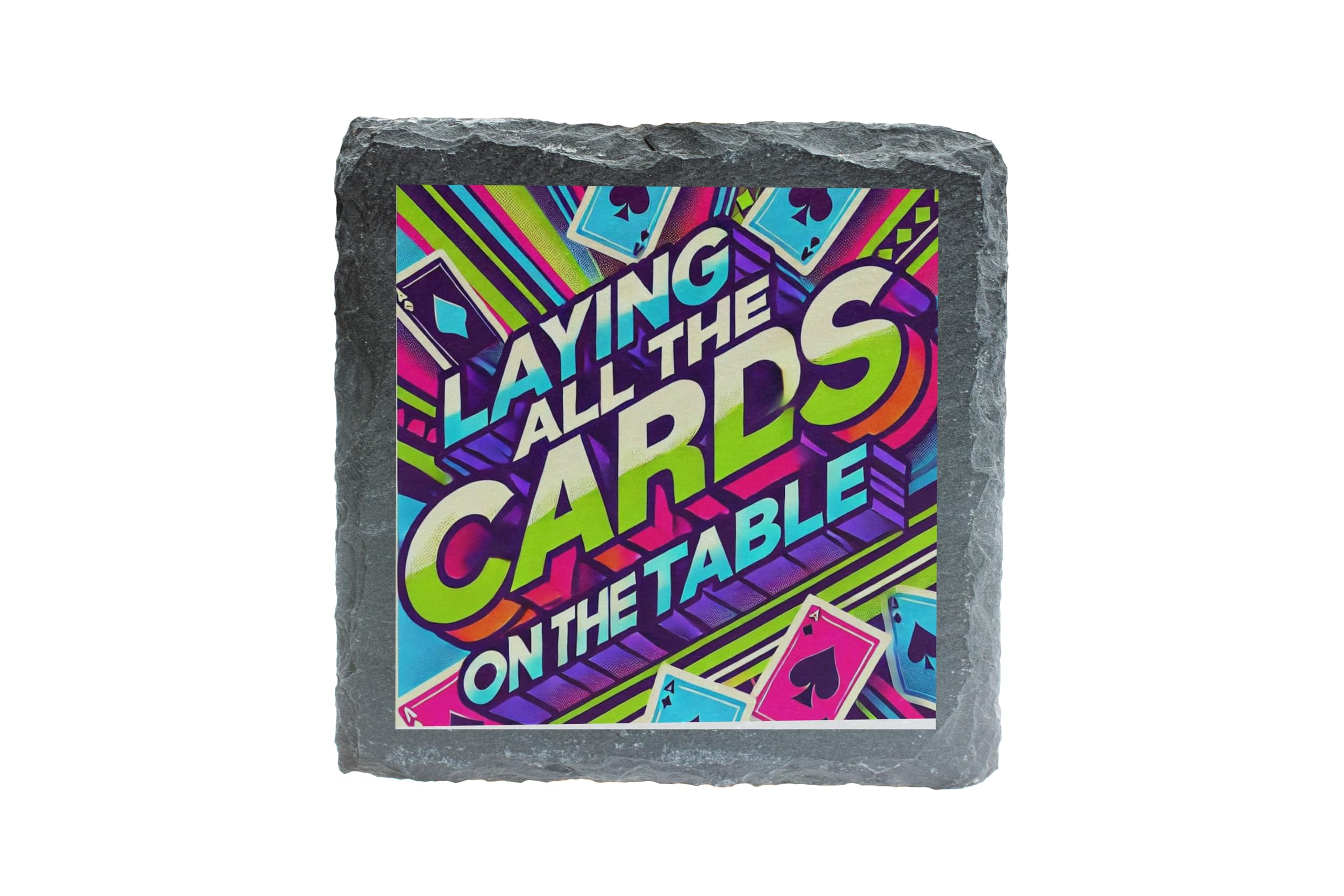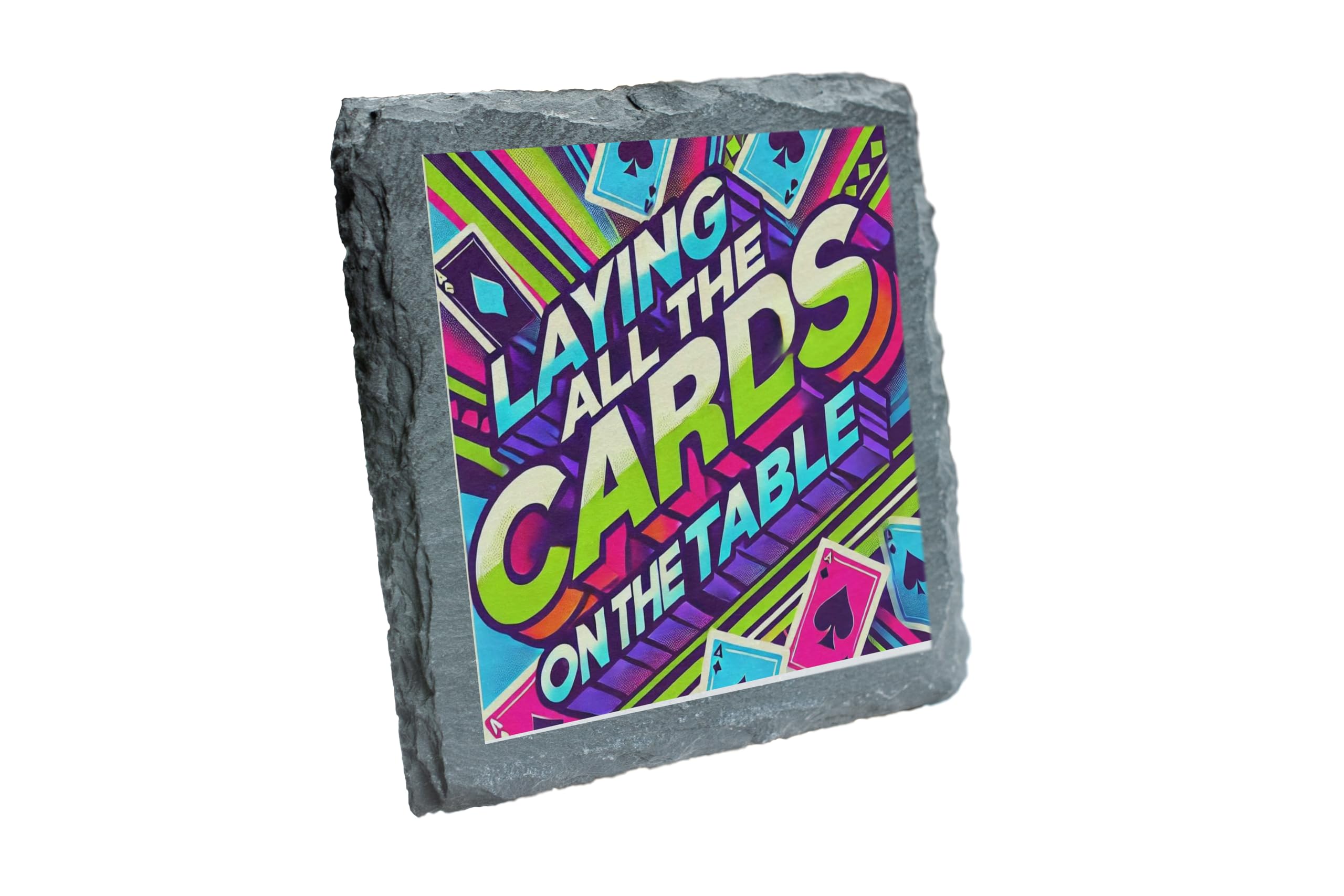 Add a touch of vibrant personality to your space with this slate coaster featuring a bold and colorful "Laying All the Cards on the Table" design. Perfect for card enthusiasts and game lovers, this unique coaster combines functionality with eye-catching decor. Made from premium natural slate, this coaster is designed to protect your surfaces from heat, moisture, and scratches. Its natural texture and rustic edges provide a stylish yet practical addition to any room. Whether you're hosting a poker night or enjoying a quiet cup of coffee, this coaster makes a statement. Lightweight, compact, and easy to clean, it fits seamlessly into any setting, from living rooms to home bars. It also makes a fantastic gift for anyone who loves card games or bold, colorful designs. Elevate your decor and show your hand with this unique slate coaster!