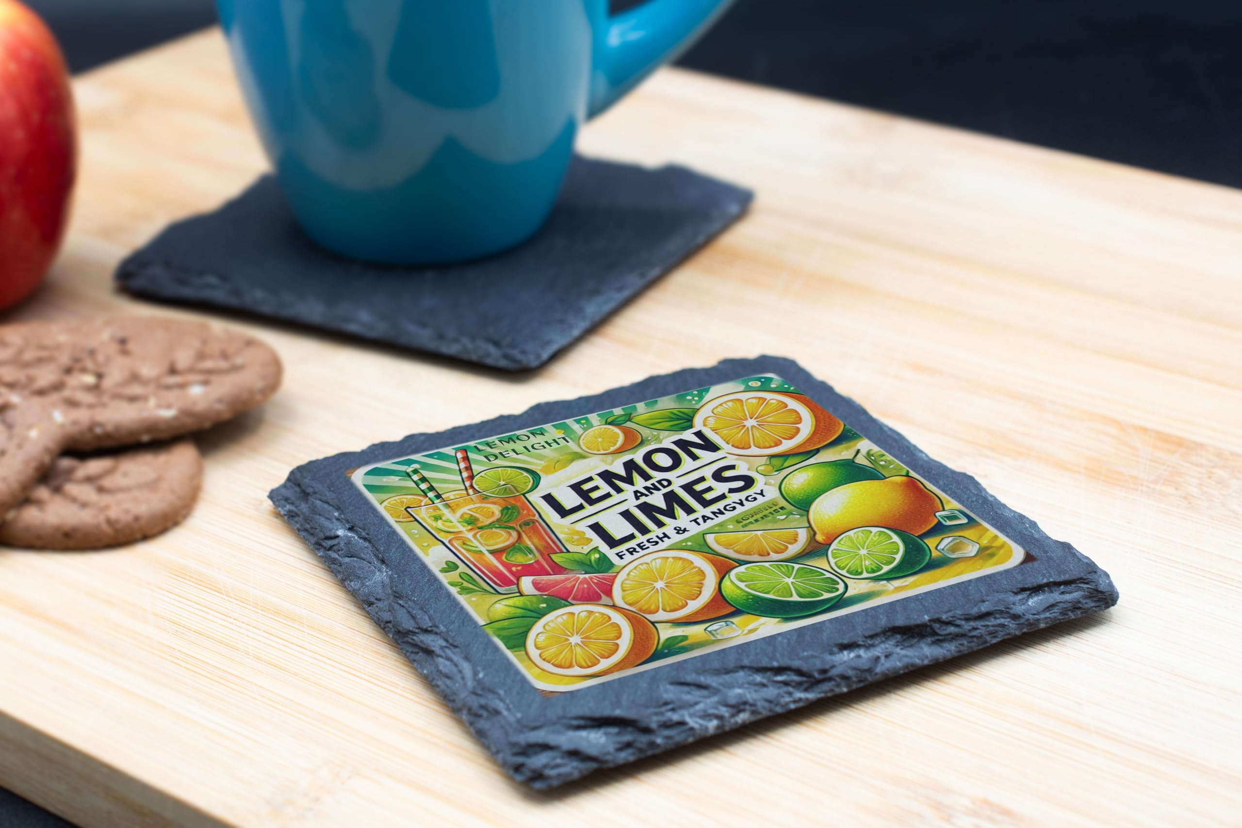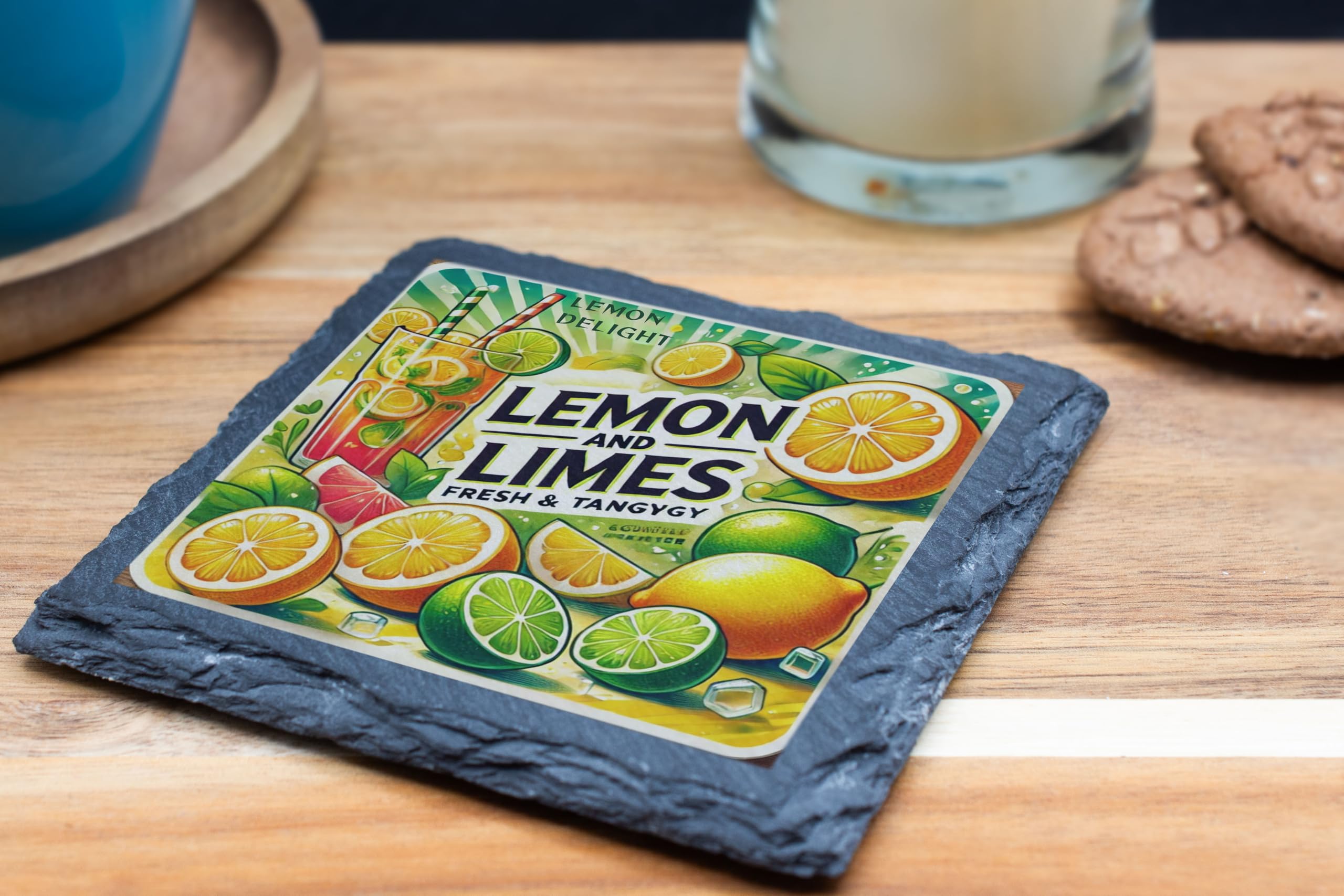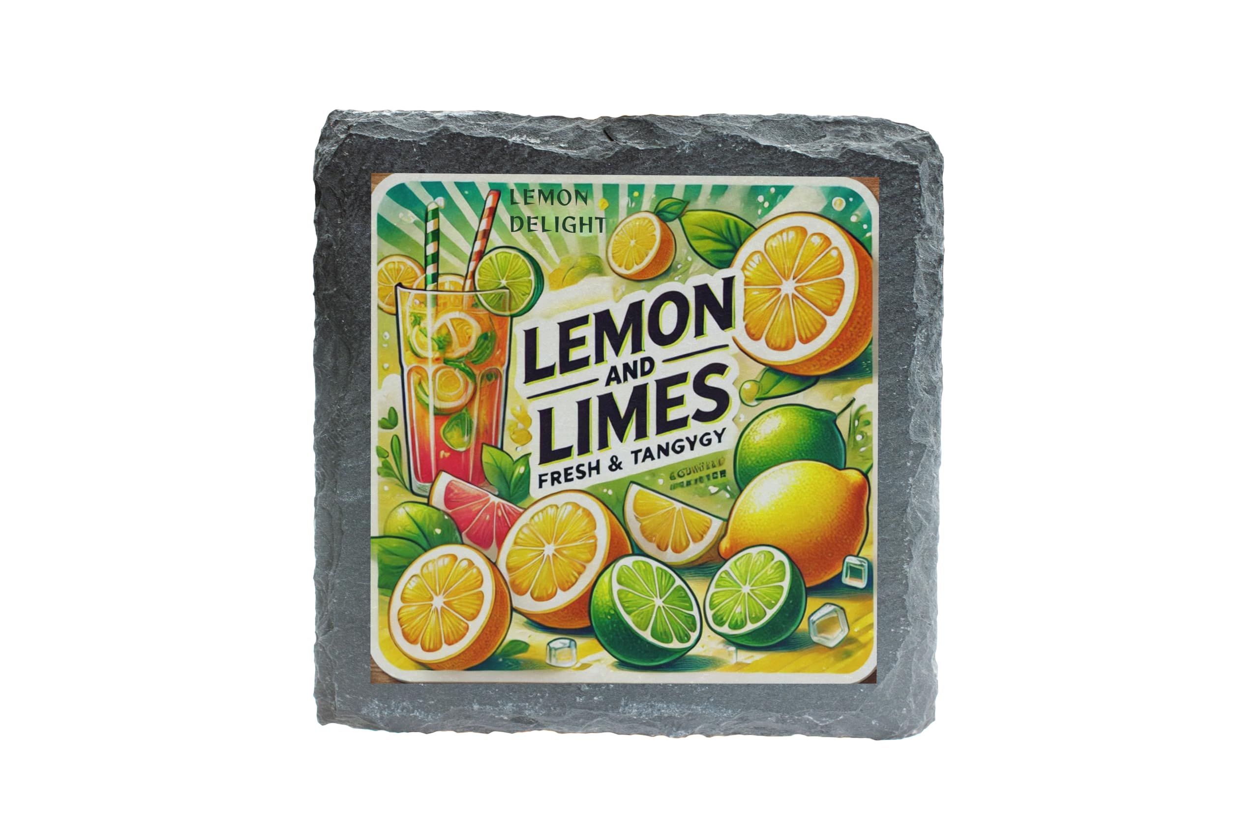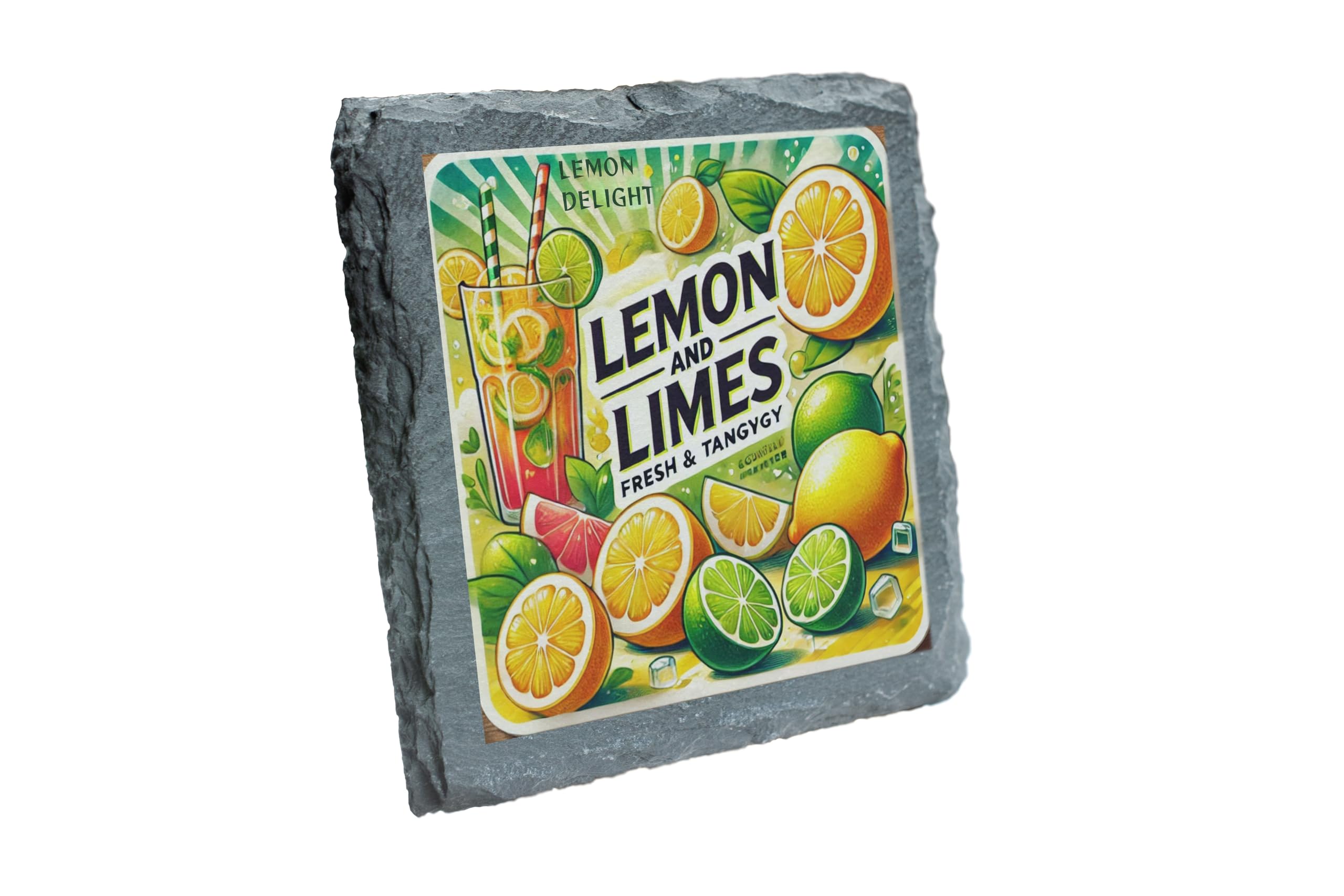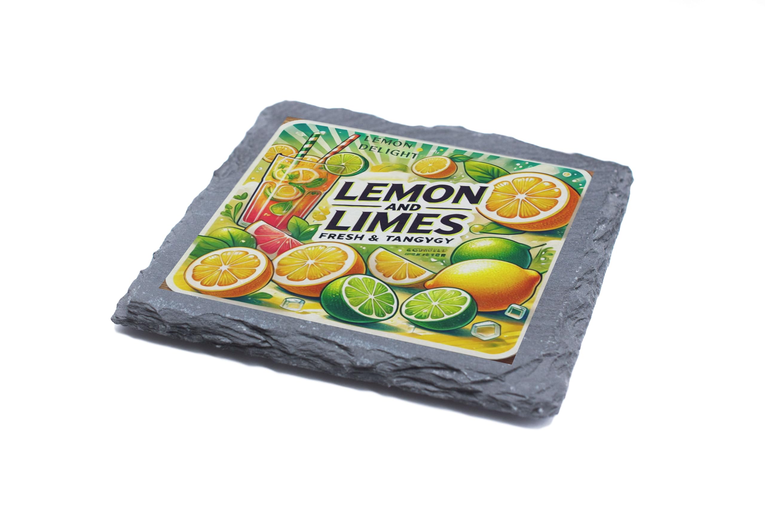 Infuse your space with the zest of summer with this slate coaster featuring a colorful lemon and lime design. The fresh and tangy citrus illustration brings an energizing burst of color to any room, making it the perfect accessory for summer gatherings or everyday use. Crafted from premium natural slate, this coaster combines durability with rustic charm. Its textured edges and smooth surface provide both protection and style, ensuring your furniture stays safe from spills, scratches, and heat. Whether used in your home, office, or patio setup, this coaster adds a lively touch to your decor. It also makes a delightful gift for friends and family who appreciate cheerful, vibrant designs or the refreshing taste of citrus. Brighten up your day and your decor with this charming lemon and lime slate coaster!