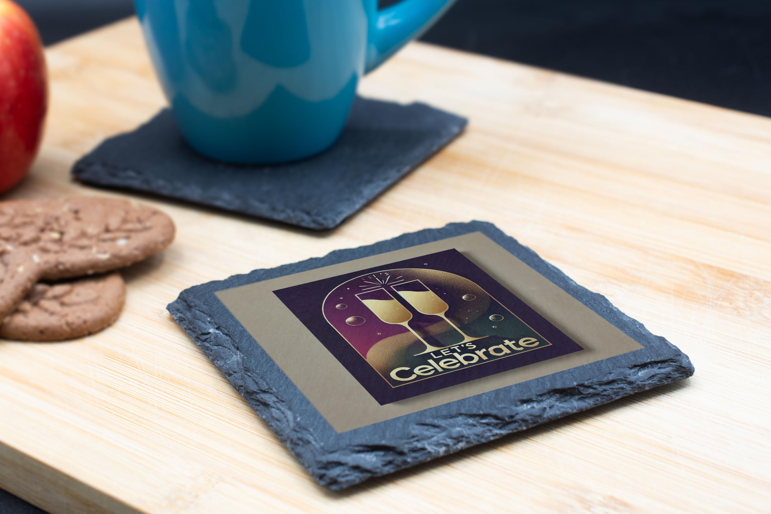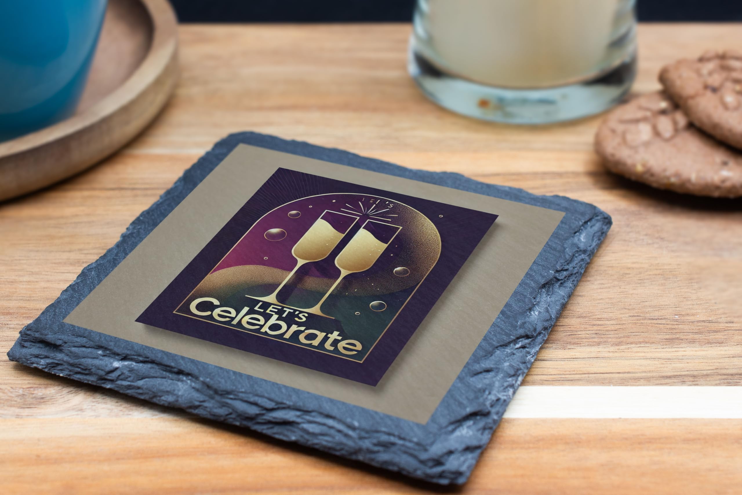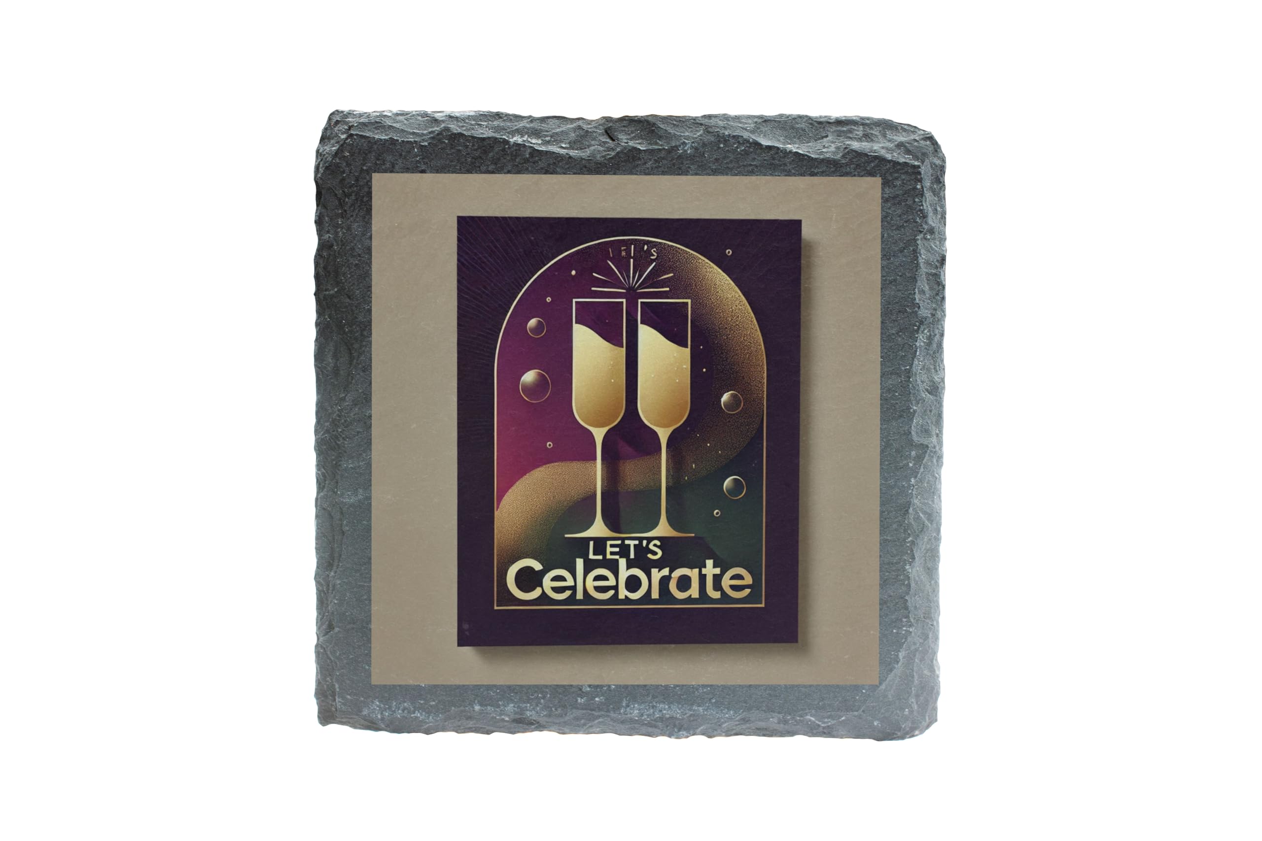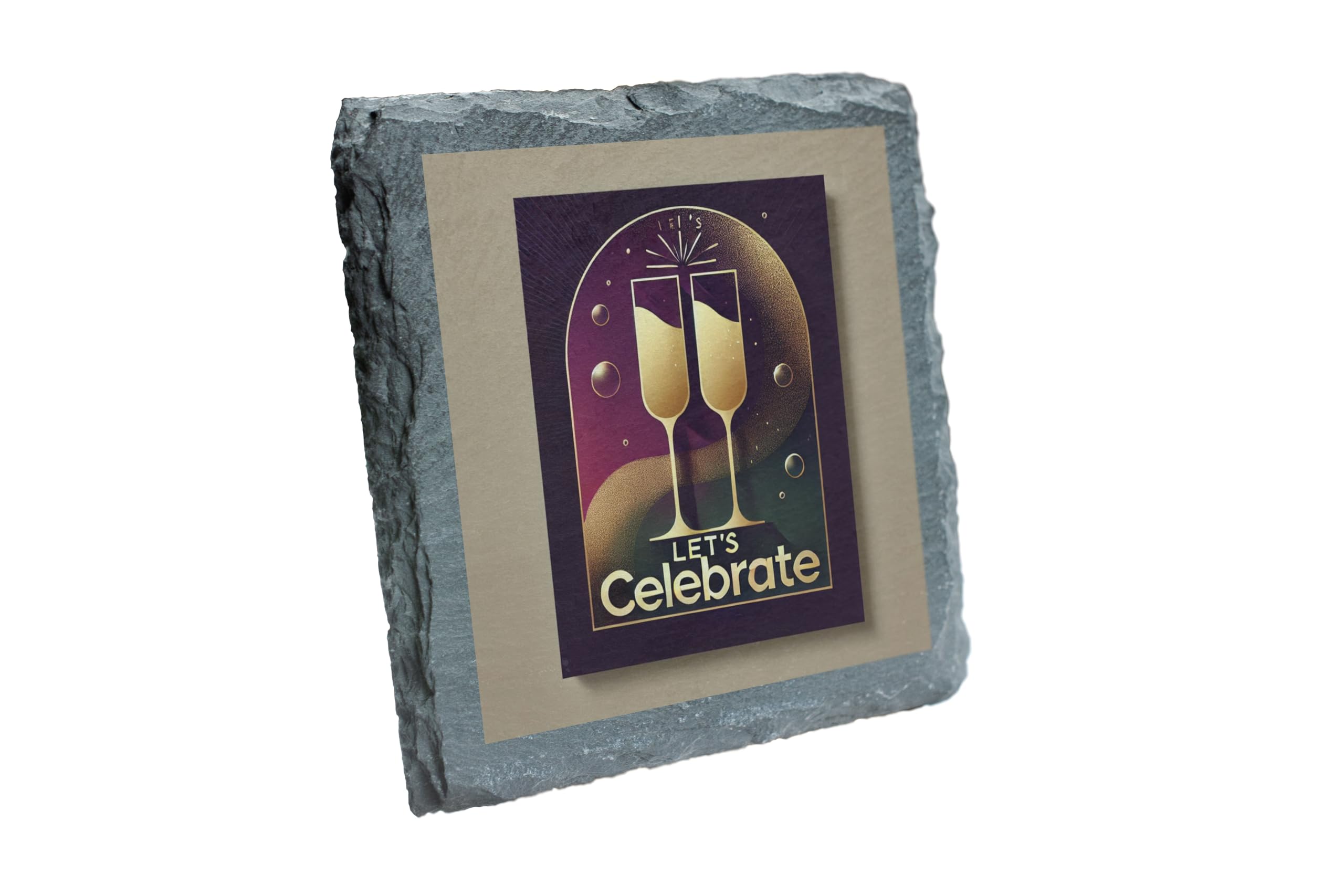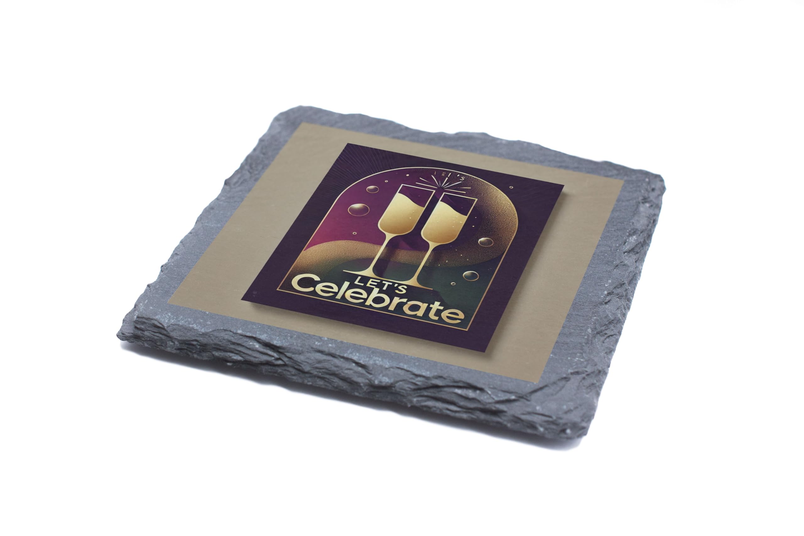 Celebrate in style with this slate coaster featuring a sleek and sophisticated "Let's Celebrate" design. Showcasing elegant champagne glasses and a festive vibe, this coaster is the perfect addition to any party, wedding, or anniversary. Made from premium natural slate, it combines durability and aesthetics. The rustic edges and smooth surface provide a stylish yet functional accessory that protects your furniture from moisture, scratches, and heat. Whether you're hosting a celebration or enjoying a quiet toast, this coaster brings an air of sophistication to any occasion. It also makes a memorable gift for loved ones during life's milestones. Raise your glass and elevate your decor with this beautiful slate coaster!