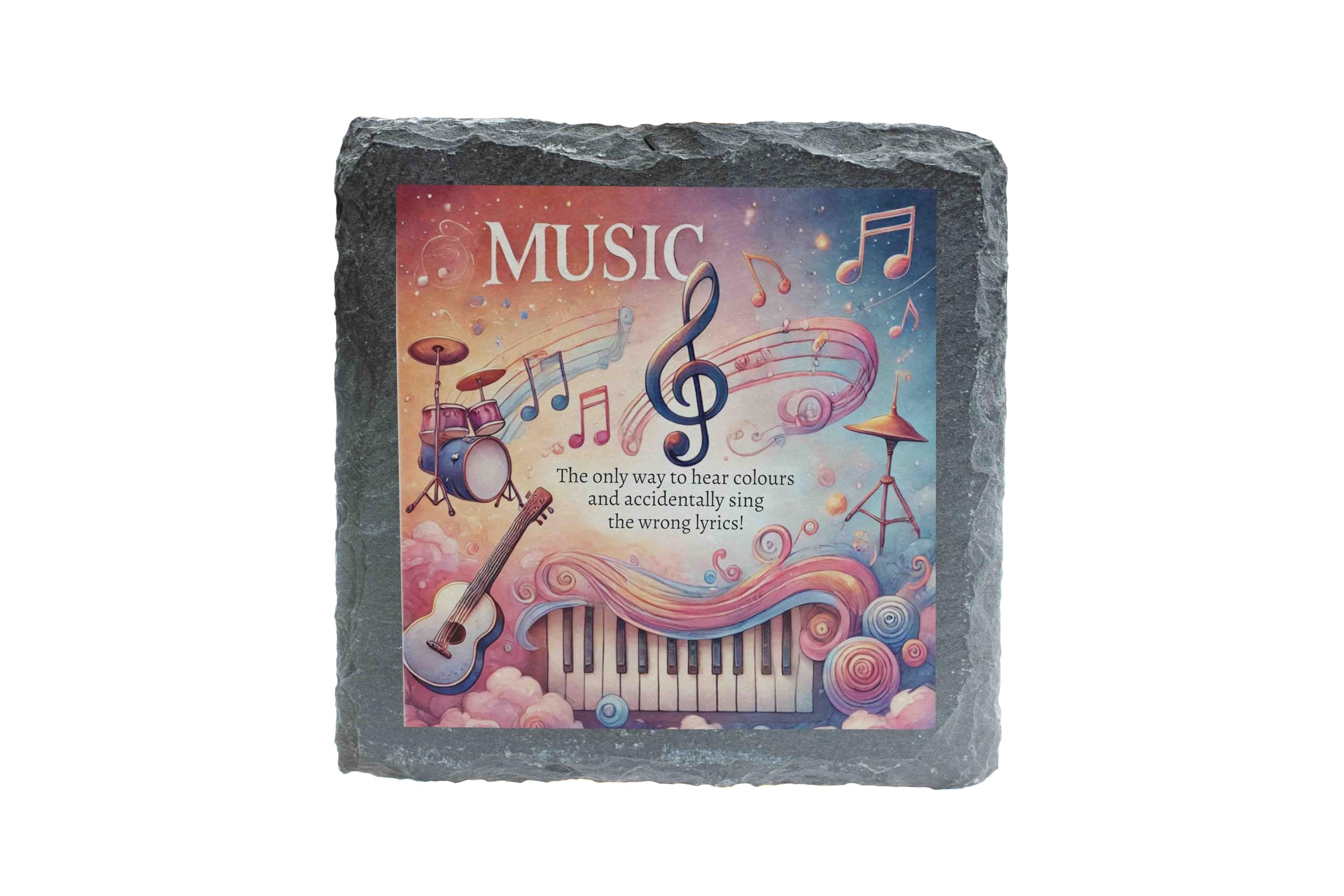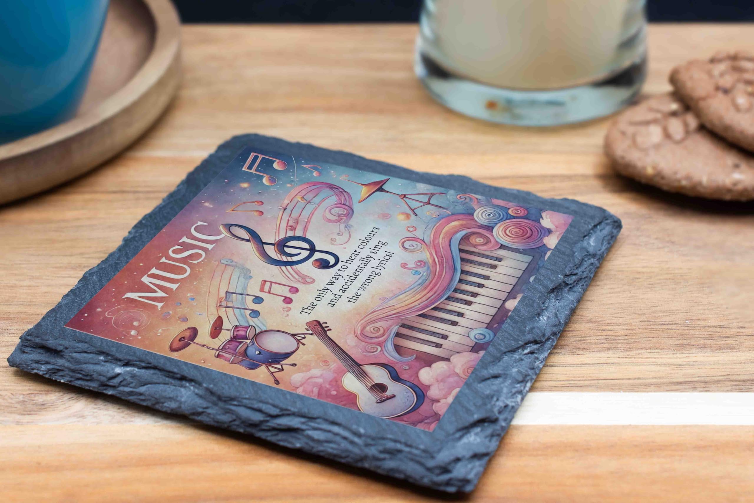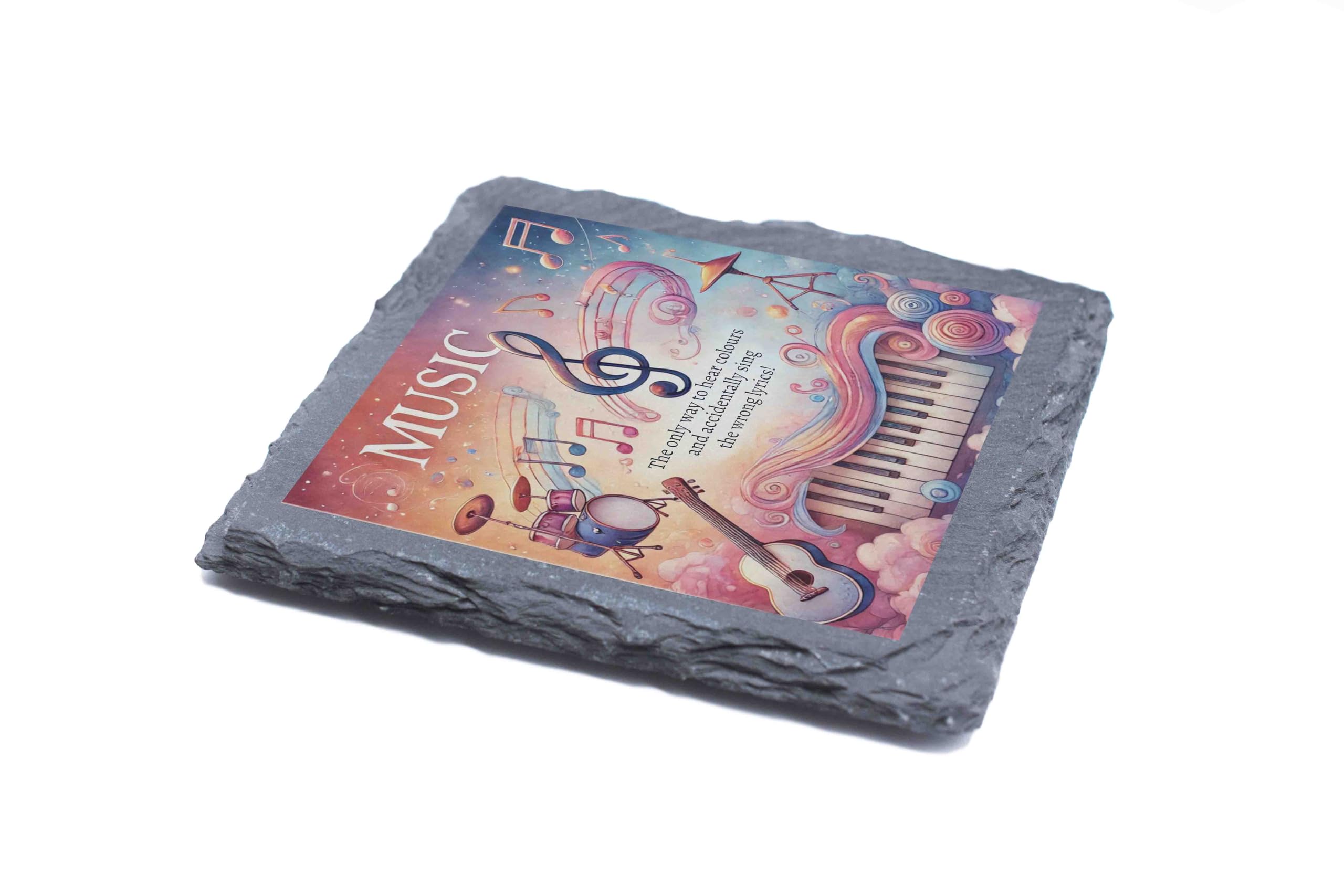 Celebrate your love for music with this Slate Coaster with Music Design, adorned with a creative and inspirational message: "The only way to hear colours and accidentally sing the wrong lyrics." The vibrant illustration features flowing musical elements, a piano, guitar, and drum set, creating a dreamy composition perfect for music enthusiasts. Handcrafted from durable natural slate, this coaster not only safeguards your surfaces but also enhances your decor with its artistic and rustic appeal. Whether you're enjoying a cup of coffee during practice or adding a touch of creativity to your studio, this coaster is both practical and beautiful. Gift it to your favorite musician, singer, or music lover for a memorable and thoughtful gesture that harmonizes style and sentiment.