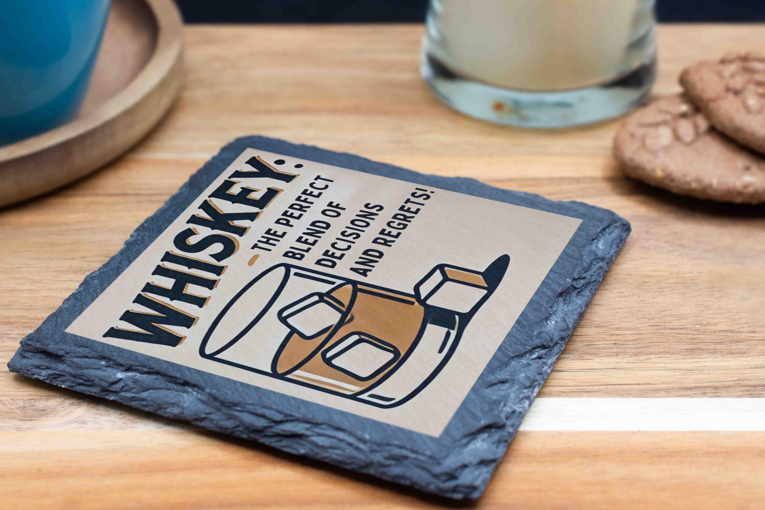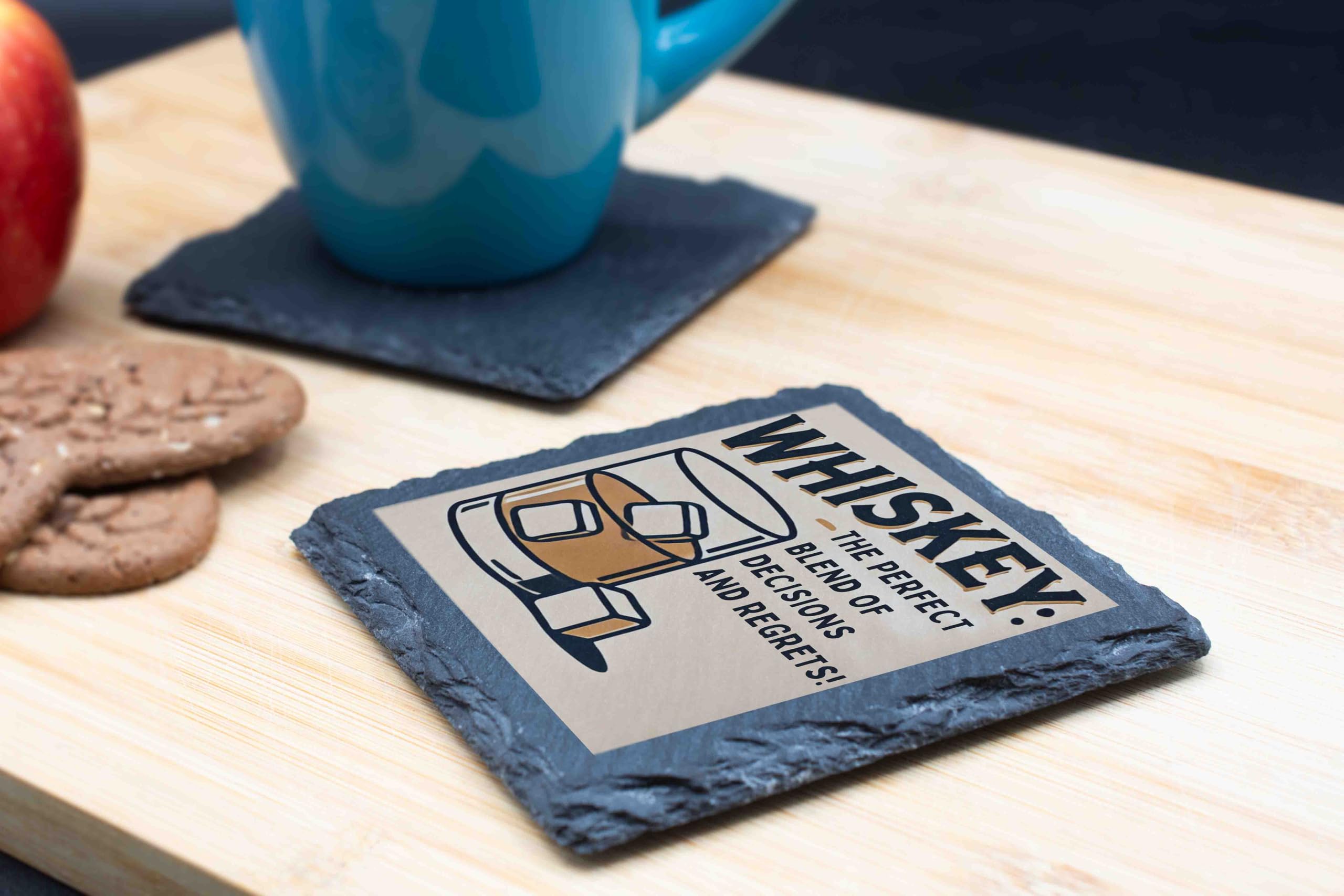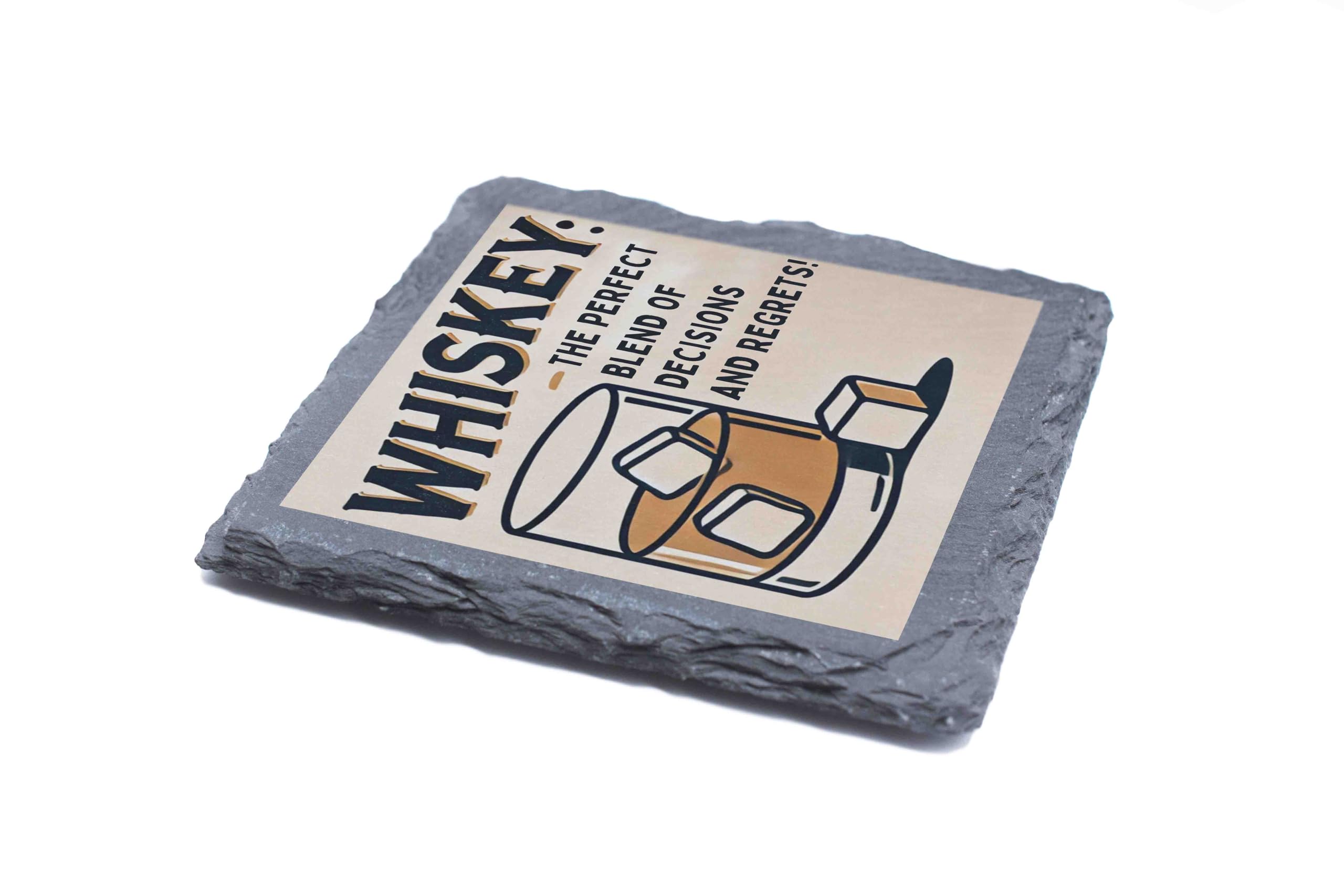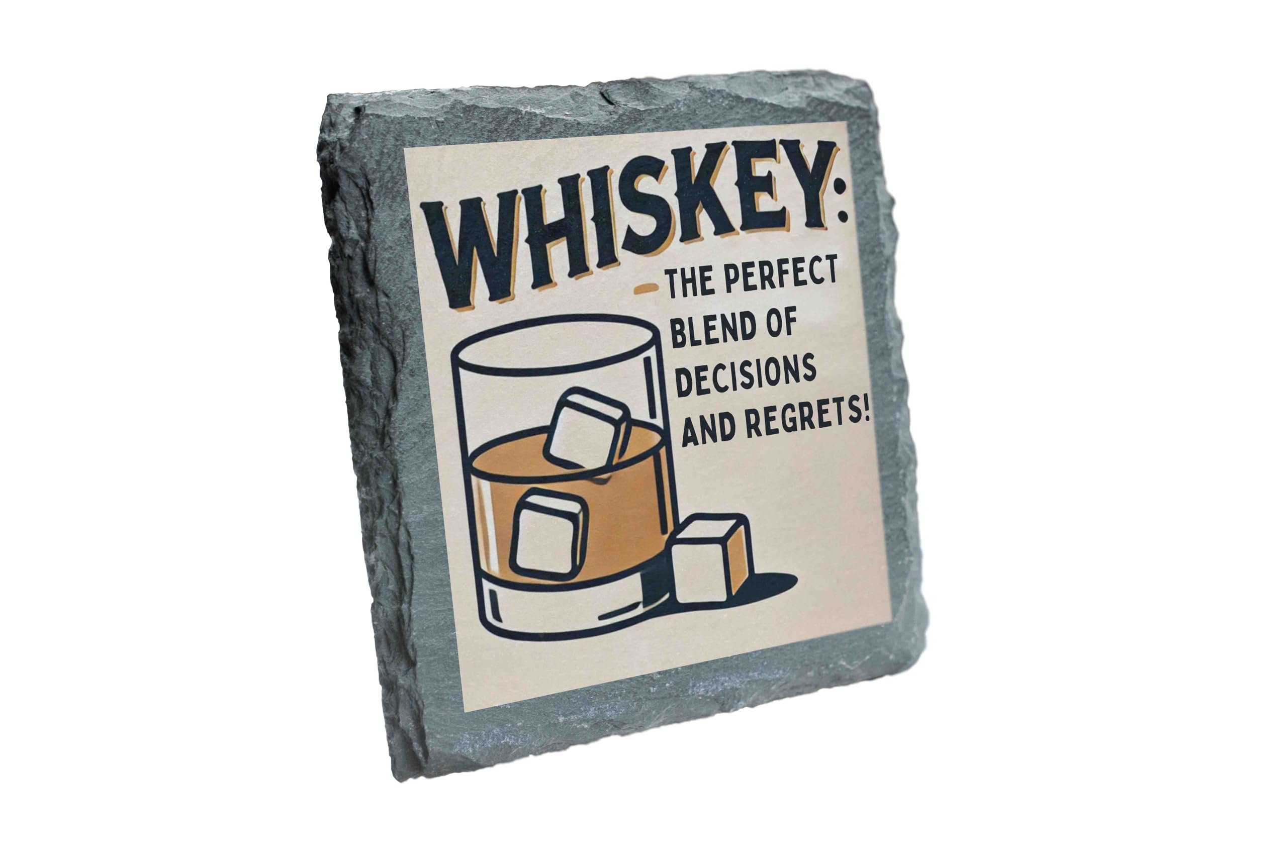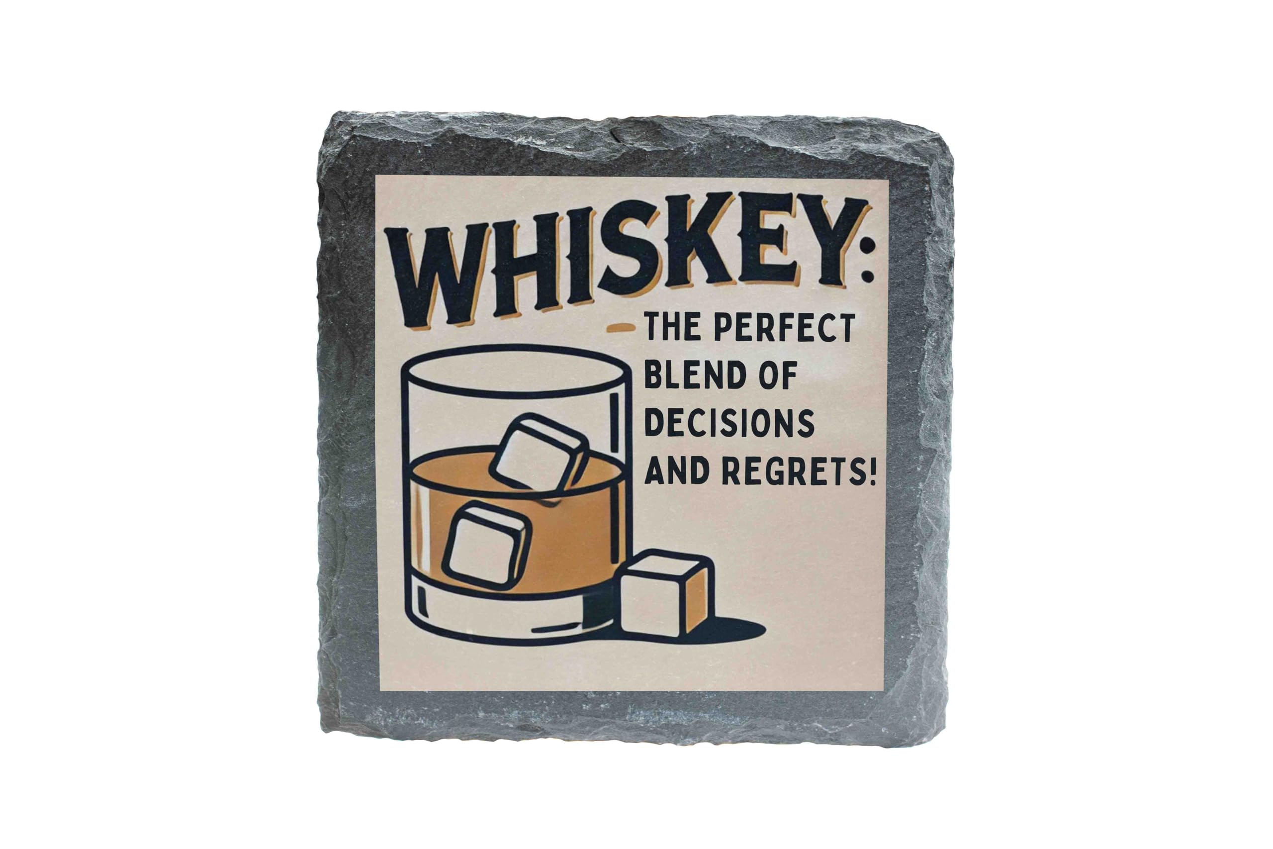 Celebrate your love for whiskey with this Whiskey-Themed Slate Coaster, designed to bring a smile to your face and protect your surfaces. Featuring an elegant illustration of a whiskey glass paired with the witty phrase: "Whiskey: The Perfect Blend of Decisions and Regrets," this coaster perfectly captures the essence of a good drink and great stories. Made from durable natural slate, its rugged edges and modern design make it a functional yet decorative addition to any table. Whether you're hosting a whiskey-tasting evening, enjoying a quiet drink at home, or looking for a unique gift, this coaster adds a touch of charm to every sip. A perfect gift for whiskey lovers, this slate coaster blends practicality with personality. Add it to your collection or surprise someone special with a thoughtful and stylish gift!