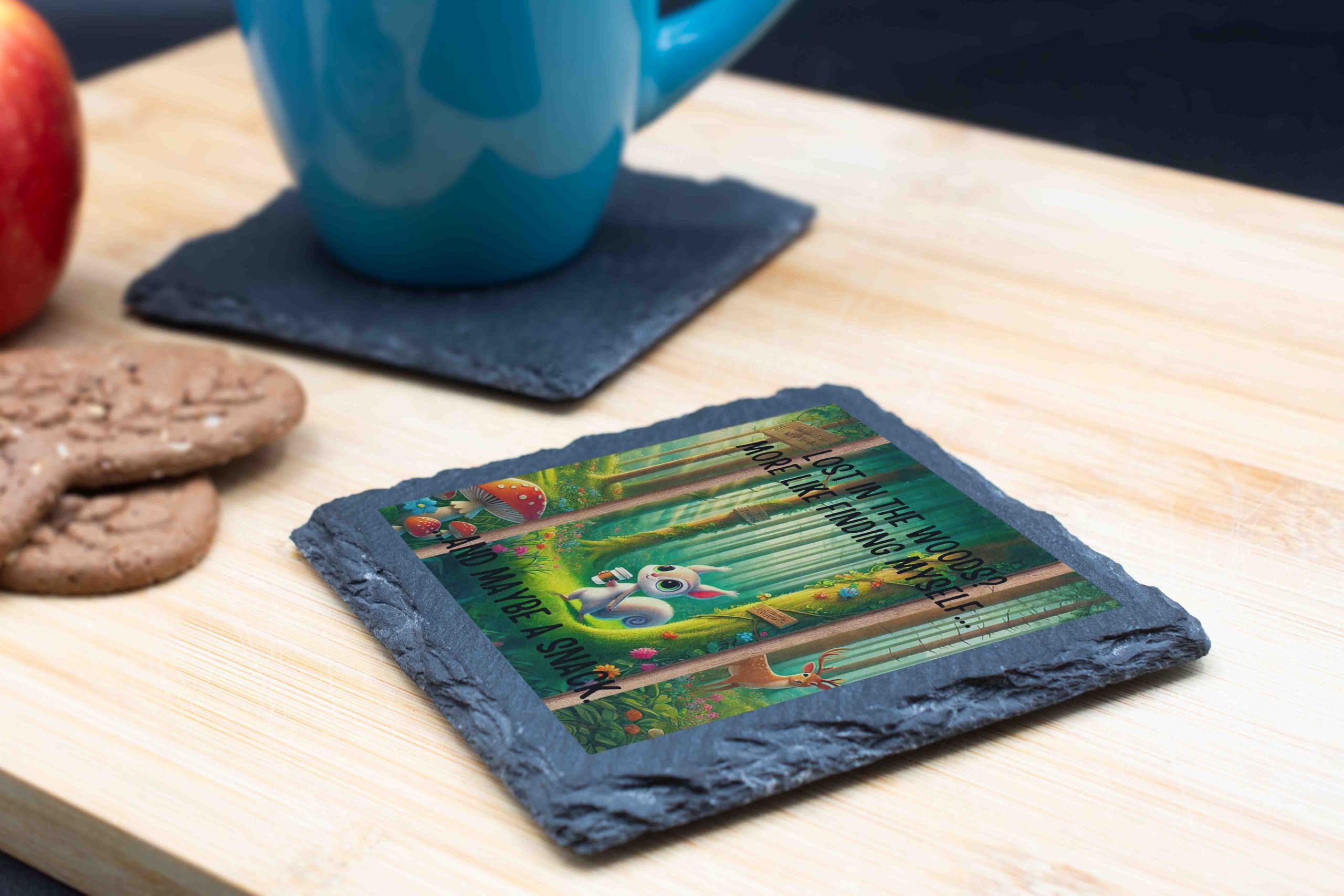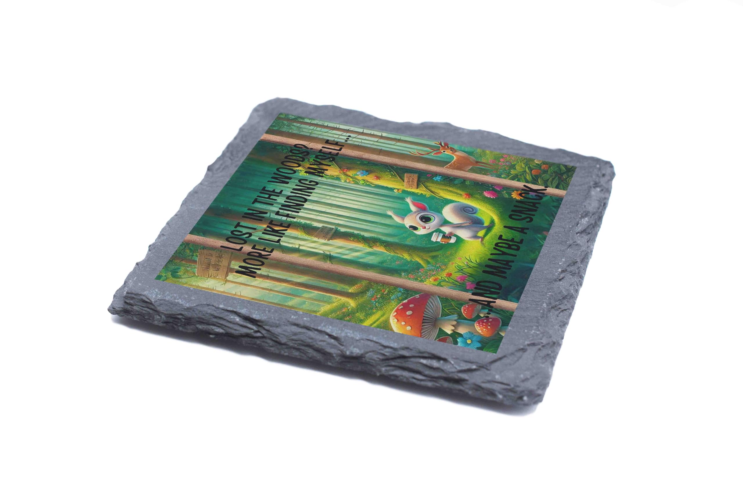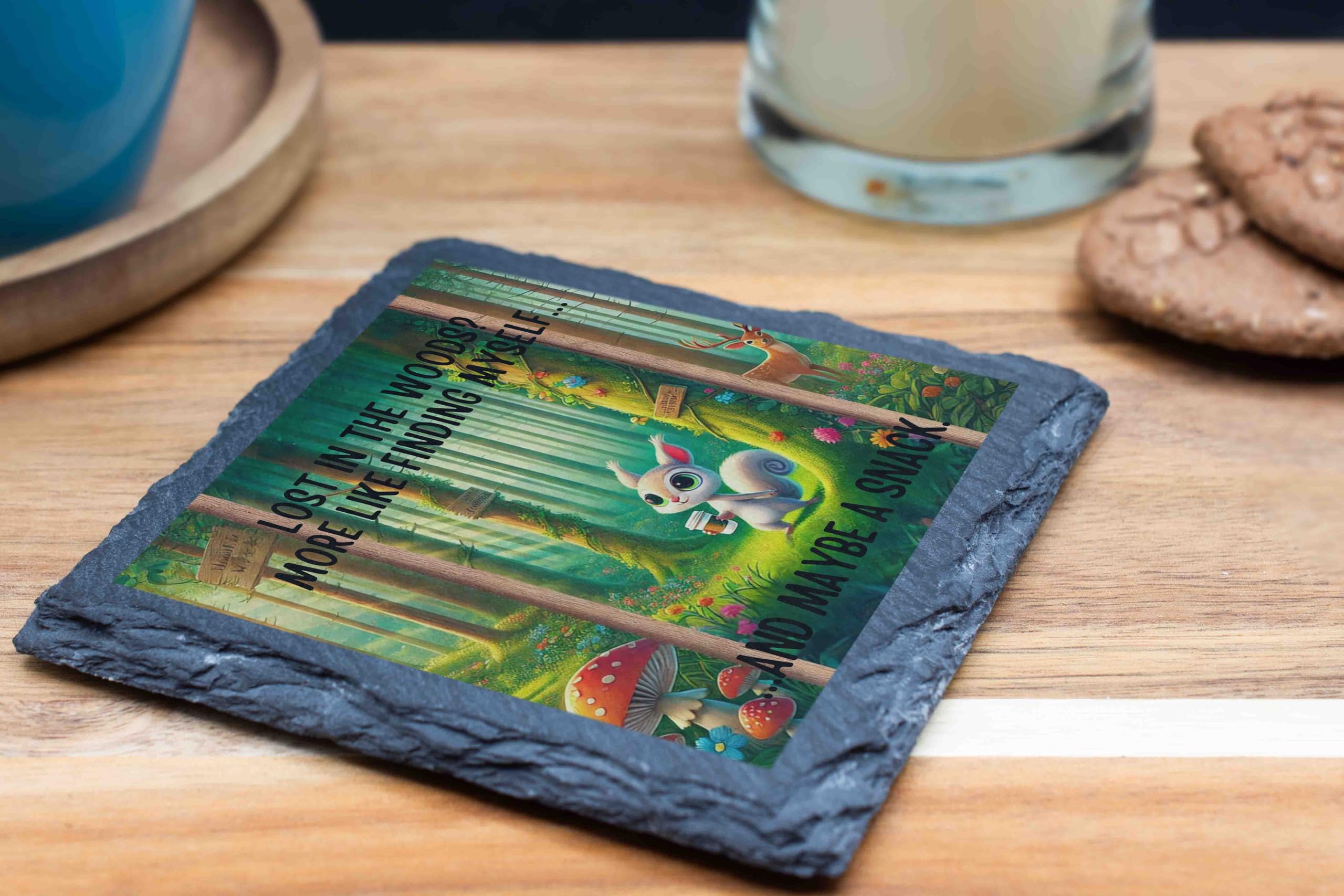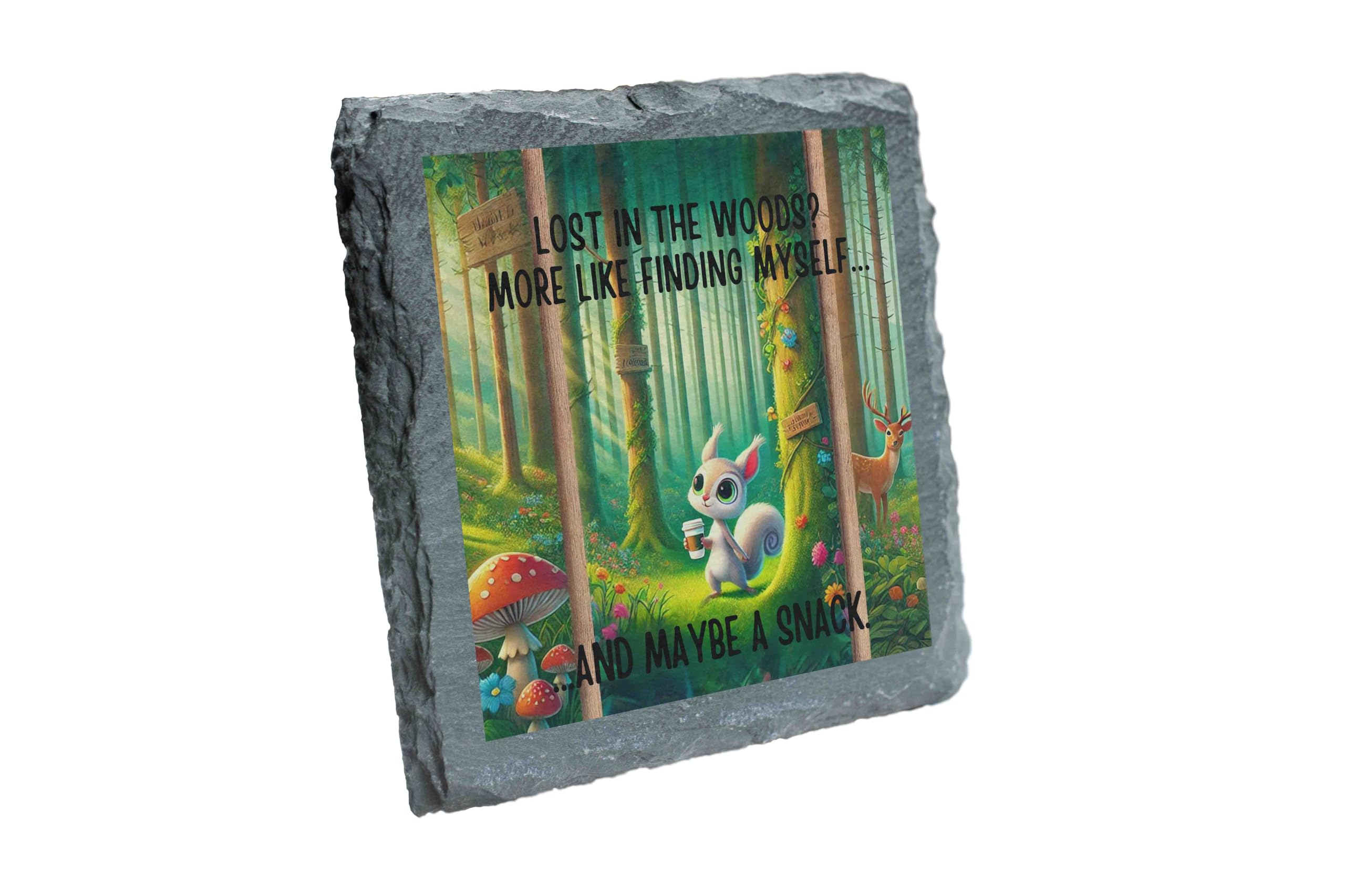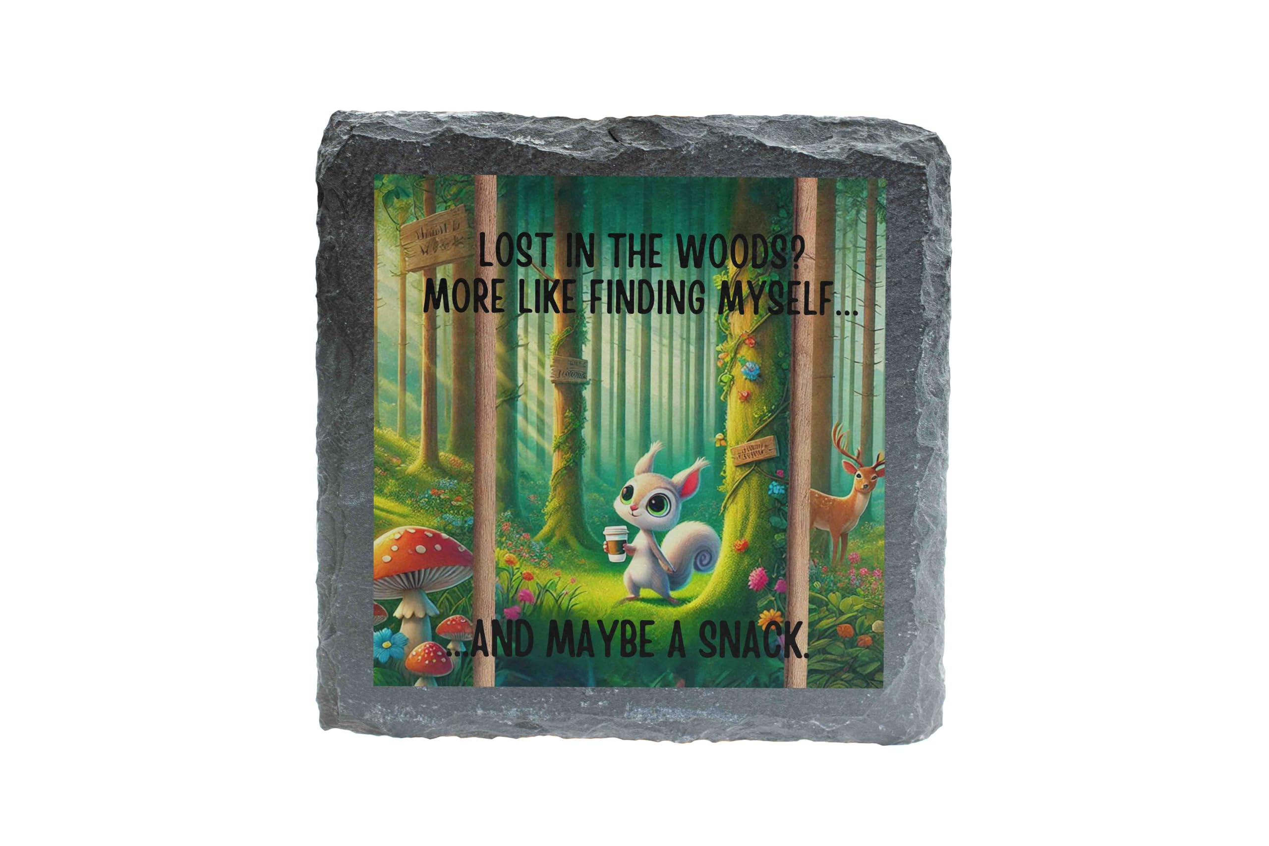 Celebrate the joy of nature and a bit of humor with this Slate Coaster with Woodland Illustration. Featuring a vibrant forest design complete with a quirky squirrel and the amusing phrase, "Lost in the Woods? More Like Finding Myself?and Maybe a Snack," this coaster combines practicality with charm. Made from high-quality natural slate, it is durable, functional, and uniquely styled, making it a perfect addition to any nature lover?s home. Whether you?re enjoying your favorite beverage or searching for a thoughtful gift for an outdoorsy friend, this coaster is a delightful and practical choice.