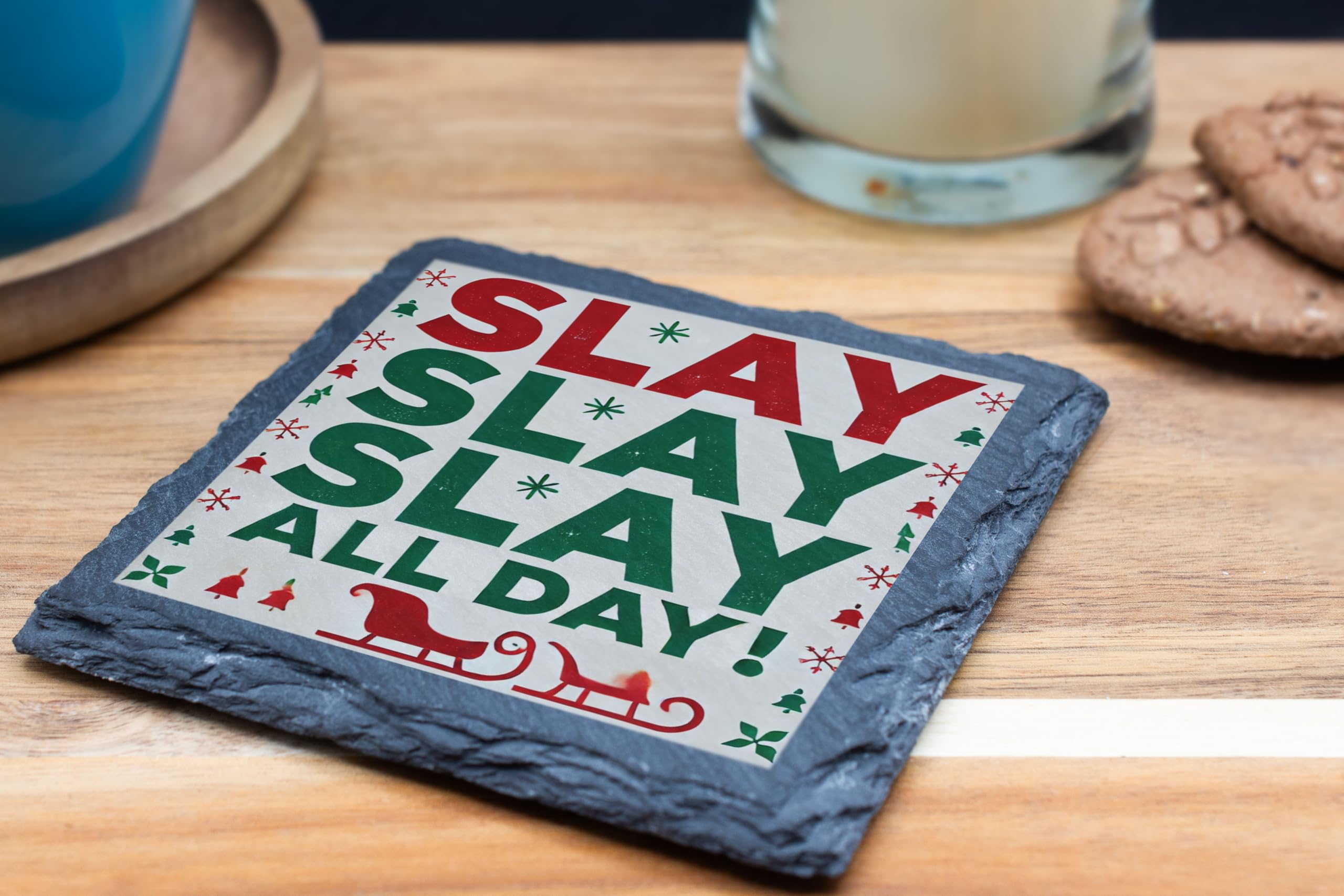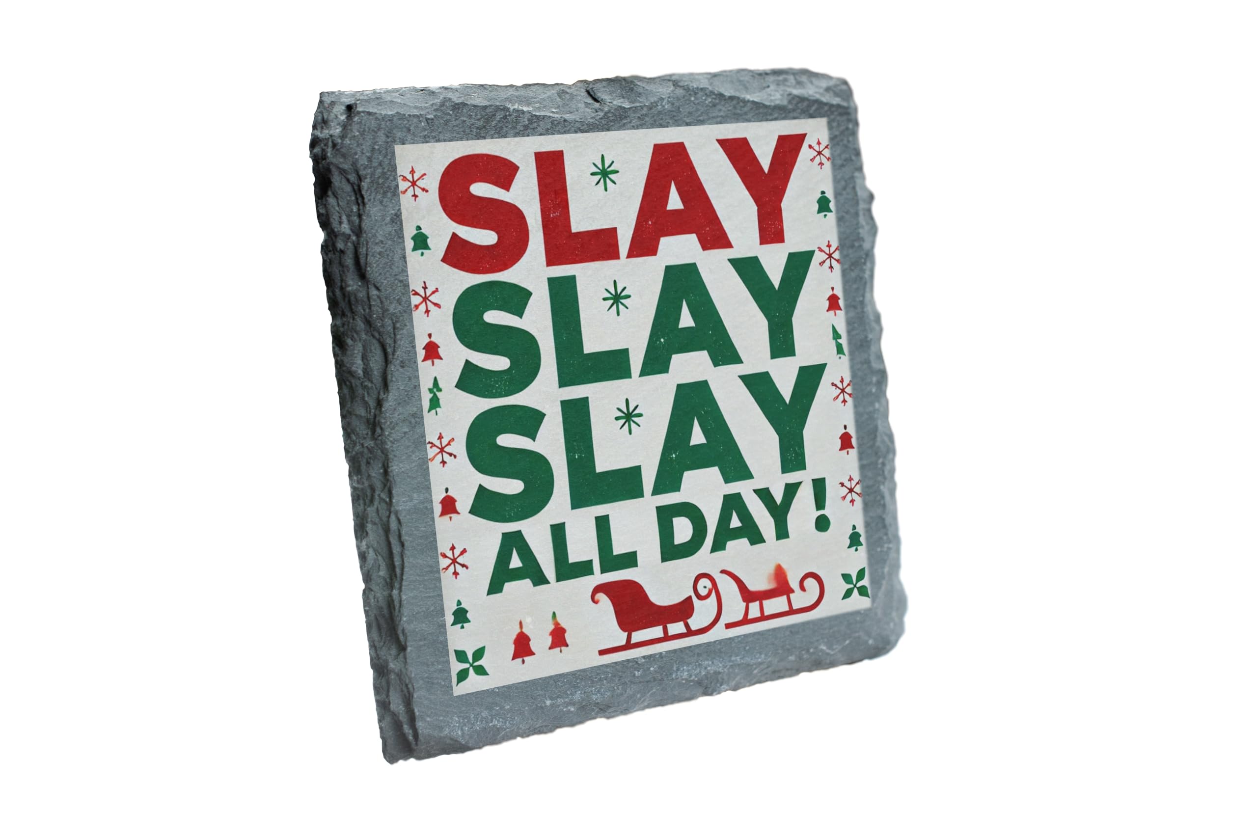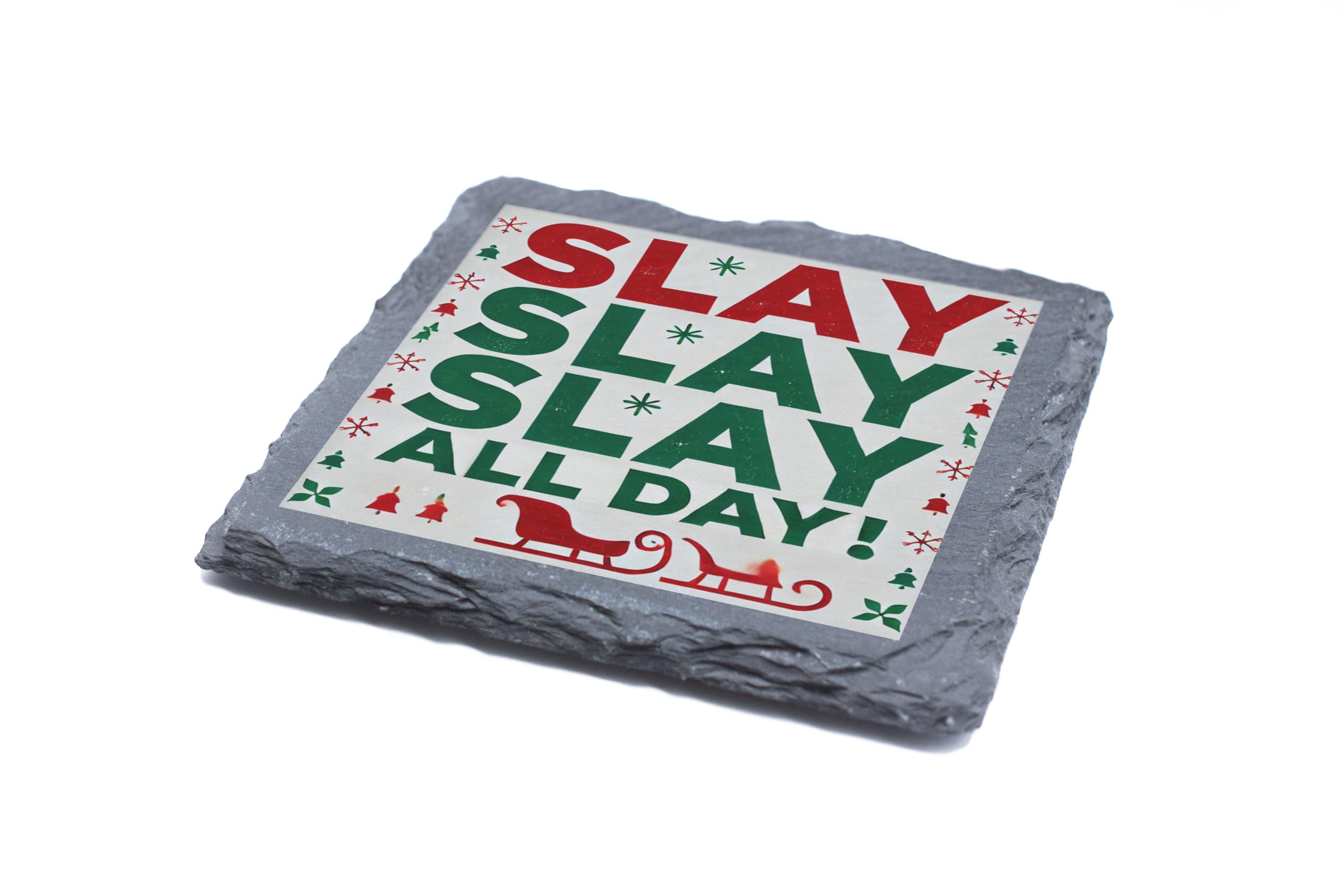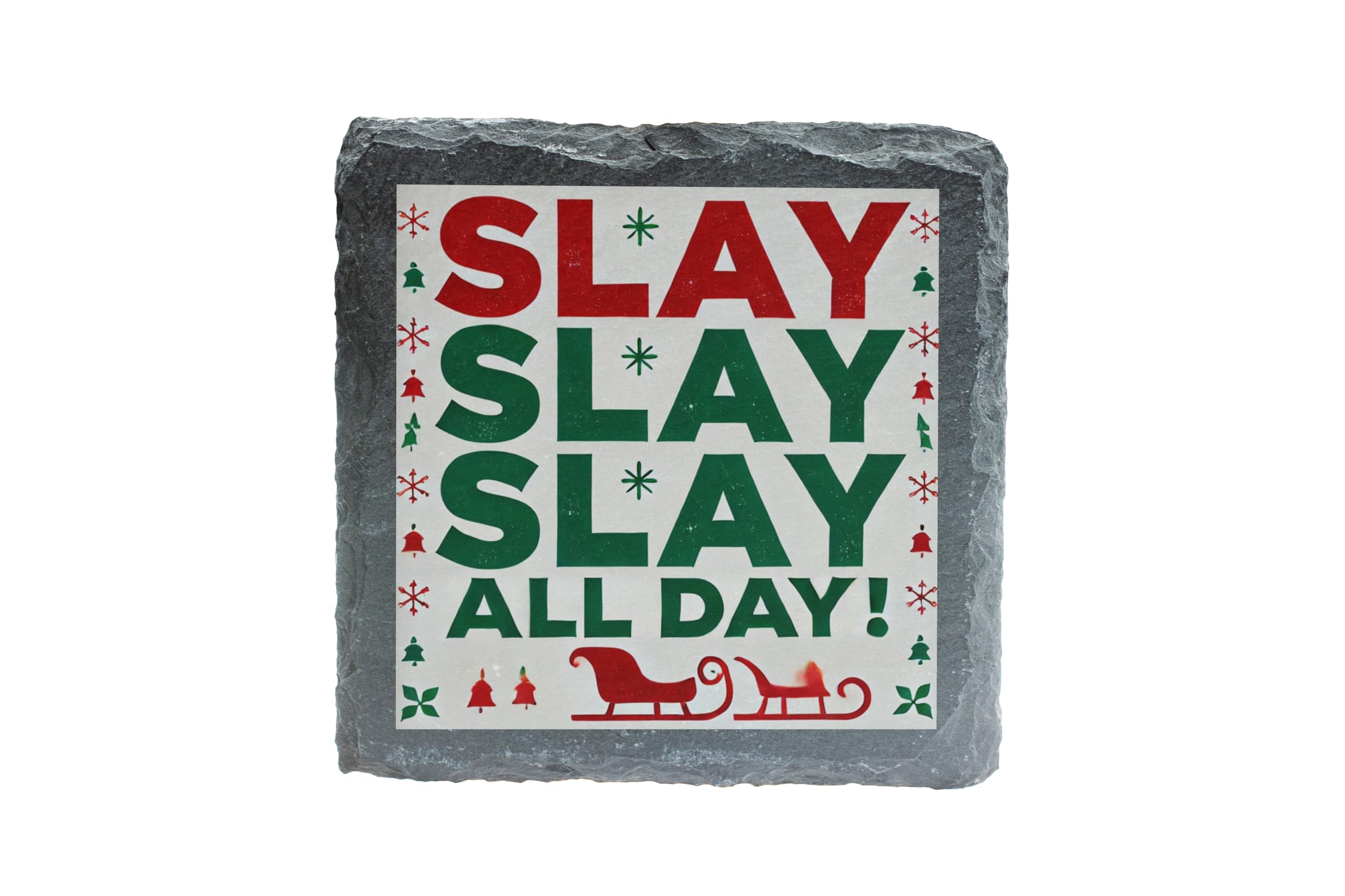 Bring holiday cheer to your home with the "Slay All Day" Christmas slate coaster. This festive coaster combines function and style, featuring a fun play on words with holiday-inspired designs like sleighs, bells, and snowflakes. Crafted from durable slate, this coaster is designed to protect your surfaces from spills and scratches while adding a touch of Christmas spirit to your decor. Its natural slate finish gives it a rustic and timeless look, making it a perfect conversation piece at any gathering. Whether as a thoughtful holiday gift or a delightful addition to your seasonal decorations, this coaster is the ultimate way to "sleigh" your holiday hosting game!