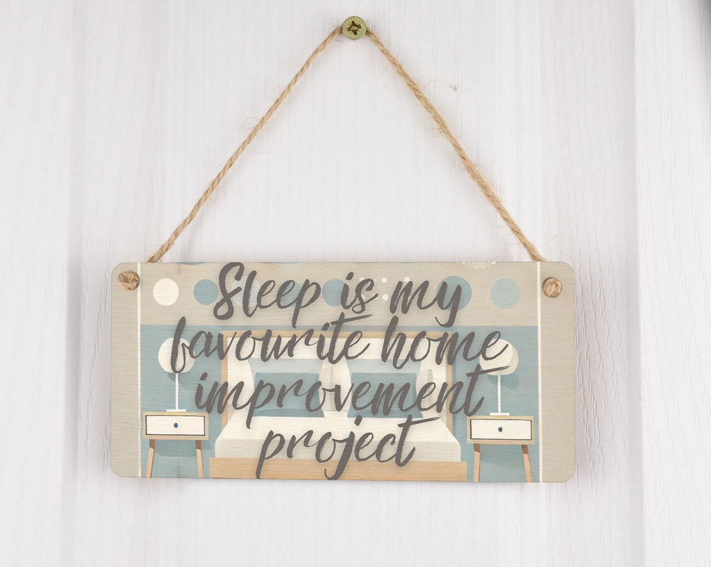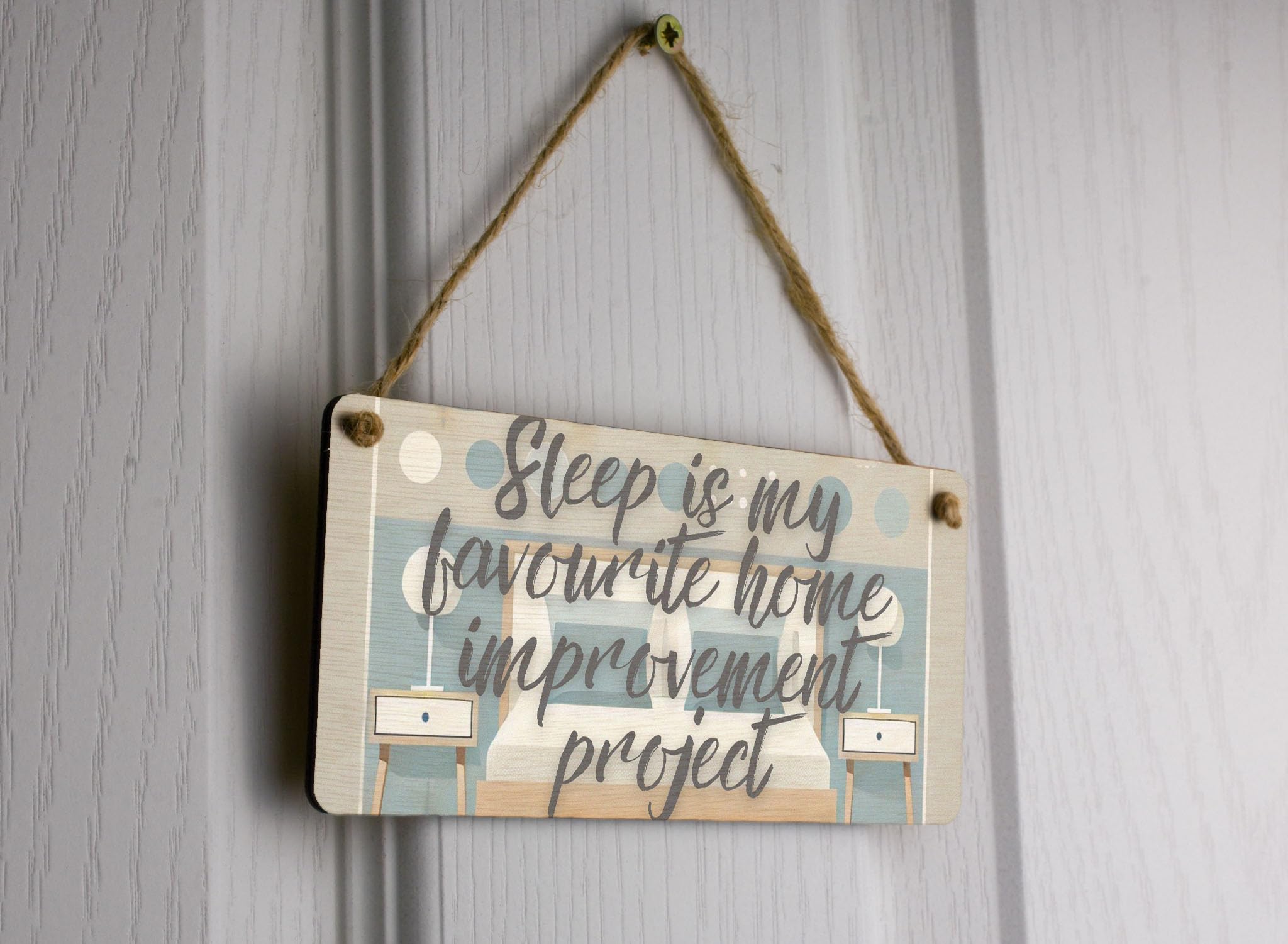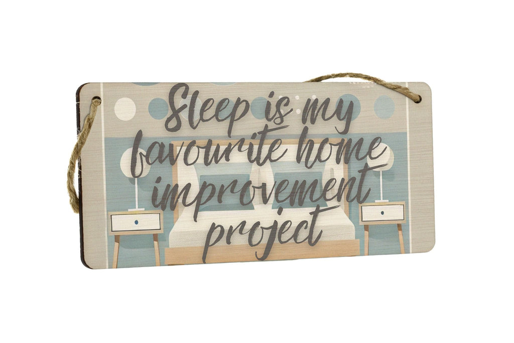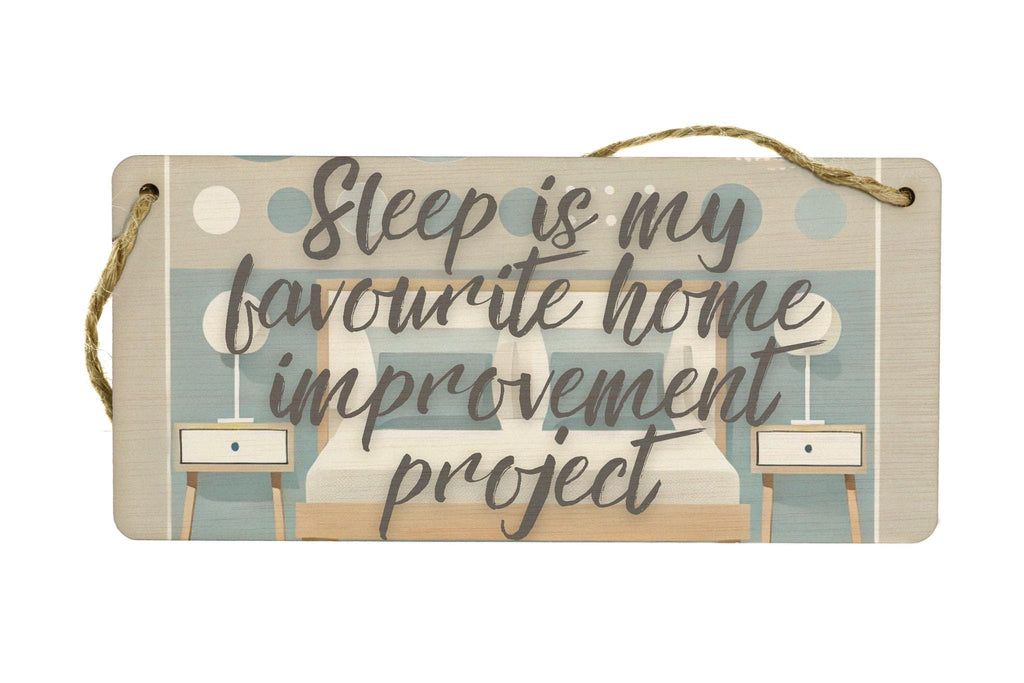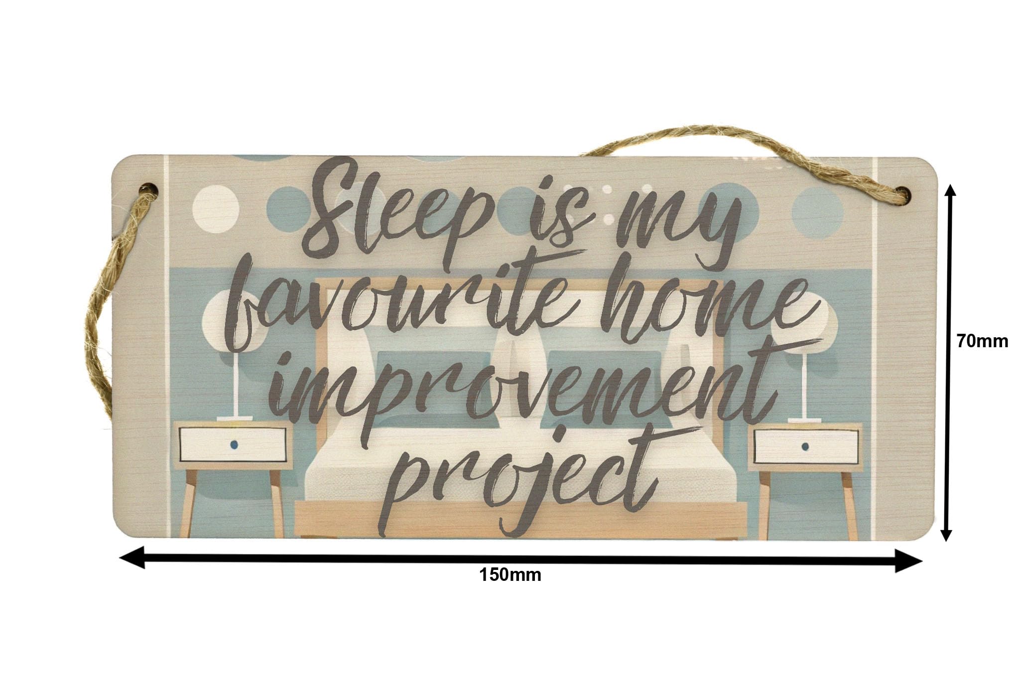 Upgrade your bedroom decor with this charming Plywood Hanging Sign that reads 'Sleep is my favourite home improvement project'. This inspirational quote will remind you to prioritise rest and relaxation in your cosy sanctuary. The full colour design features a neutral colour bedroom scene, perfect for creating a peaceful and modern atmosphere. Made with AI generated art and UV printed on handcrafted laser cut plywood, this minimalist wall art is both durable and stylish. The twine included makes it easy to hang up, adding a touch of comfort to your space. Enhance your home decor with this unique piece that brings a touch of sleep motivation to your walls.