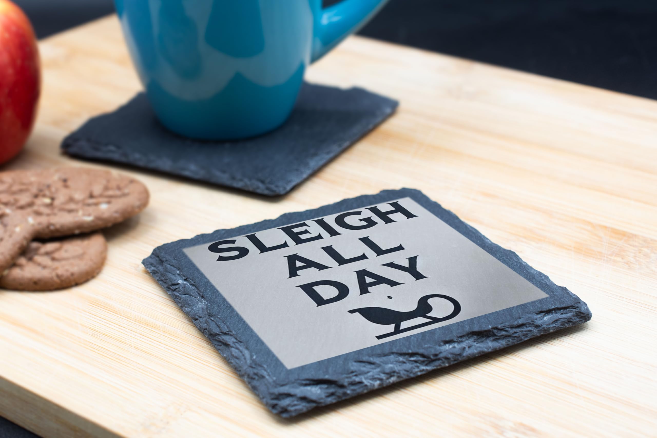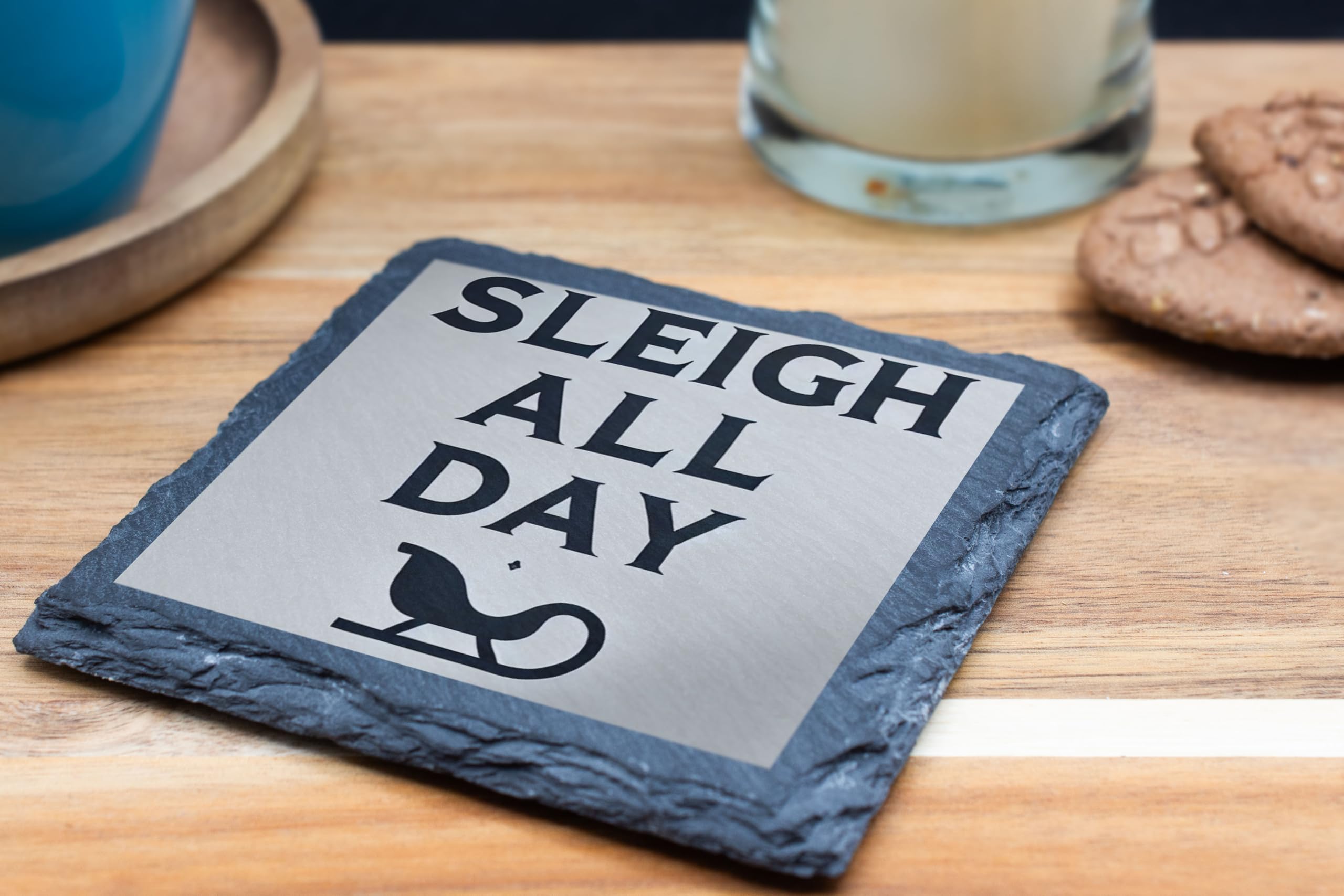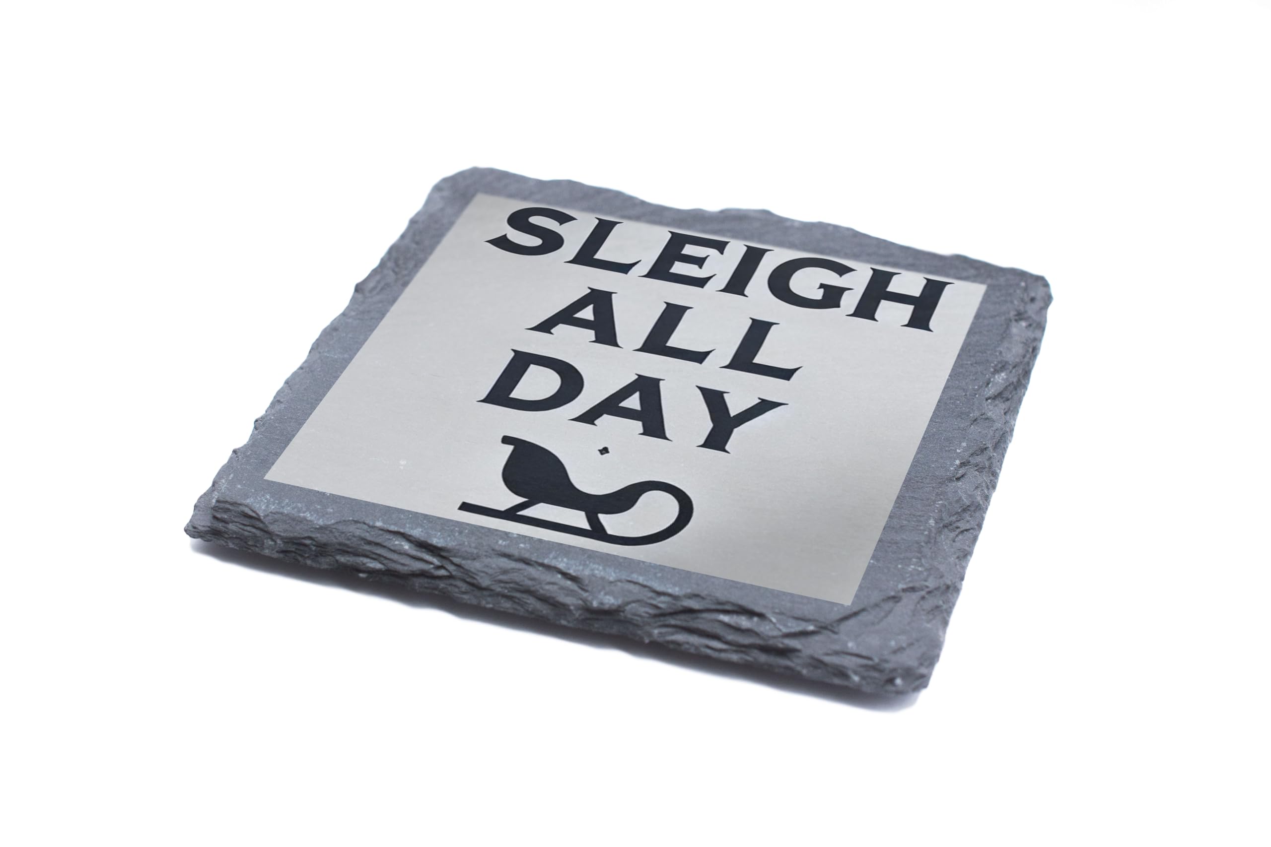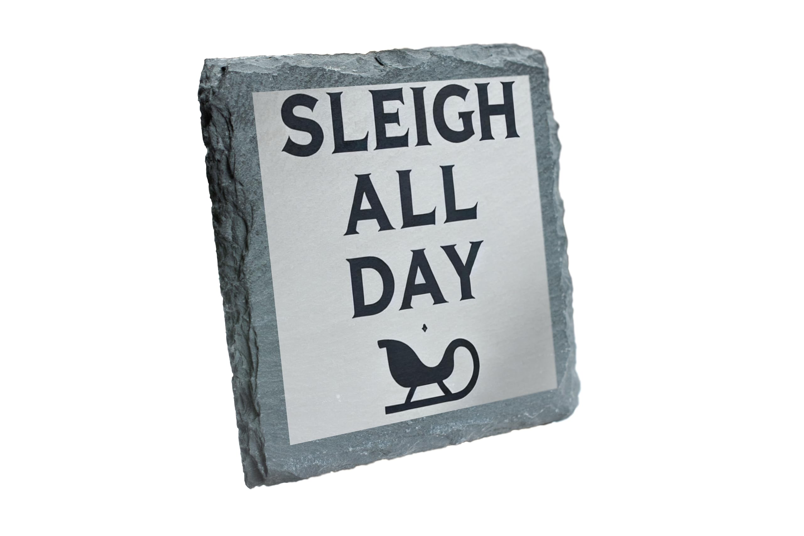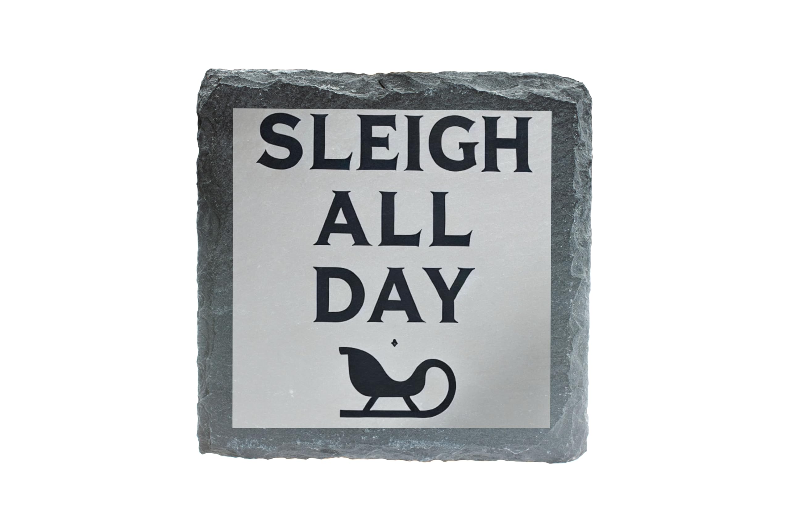 Celebrate the holiday season in style with the "Sleigh All Day" Christmas-Themed Slate Coaster. Designed for both function and festivity, this coaster showcases a sleek, minimalist design with a witty slogan and a timeless sleigh silhouette. Crafted from high-quality natural slate, it not only protects your surfaces from condensation and heat but also serves as a charming decorative piece for your Christmas gatherings. Its neutral color palette and understated elegance make it a perfect addition to any holiday setting, from cozy home decor to professional office setups. Whether you?re sipping eggnog by the fire or hosting a festive party, this coaster will add a touch of joy to every moment. It also makes a thoughtful and practical gift for friends, family, or colleagues who love the holiday spirit.