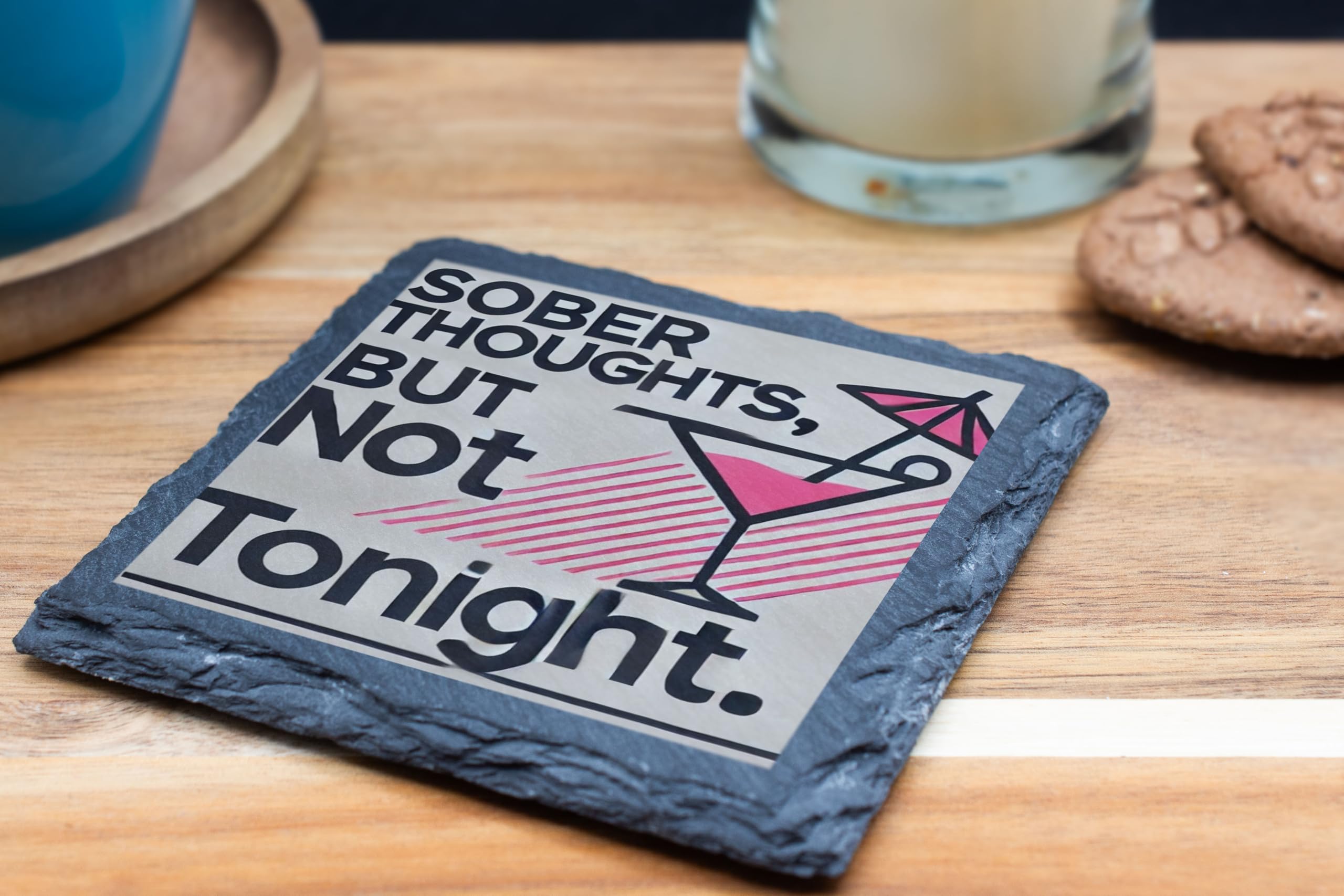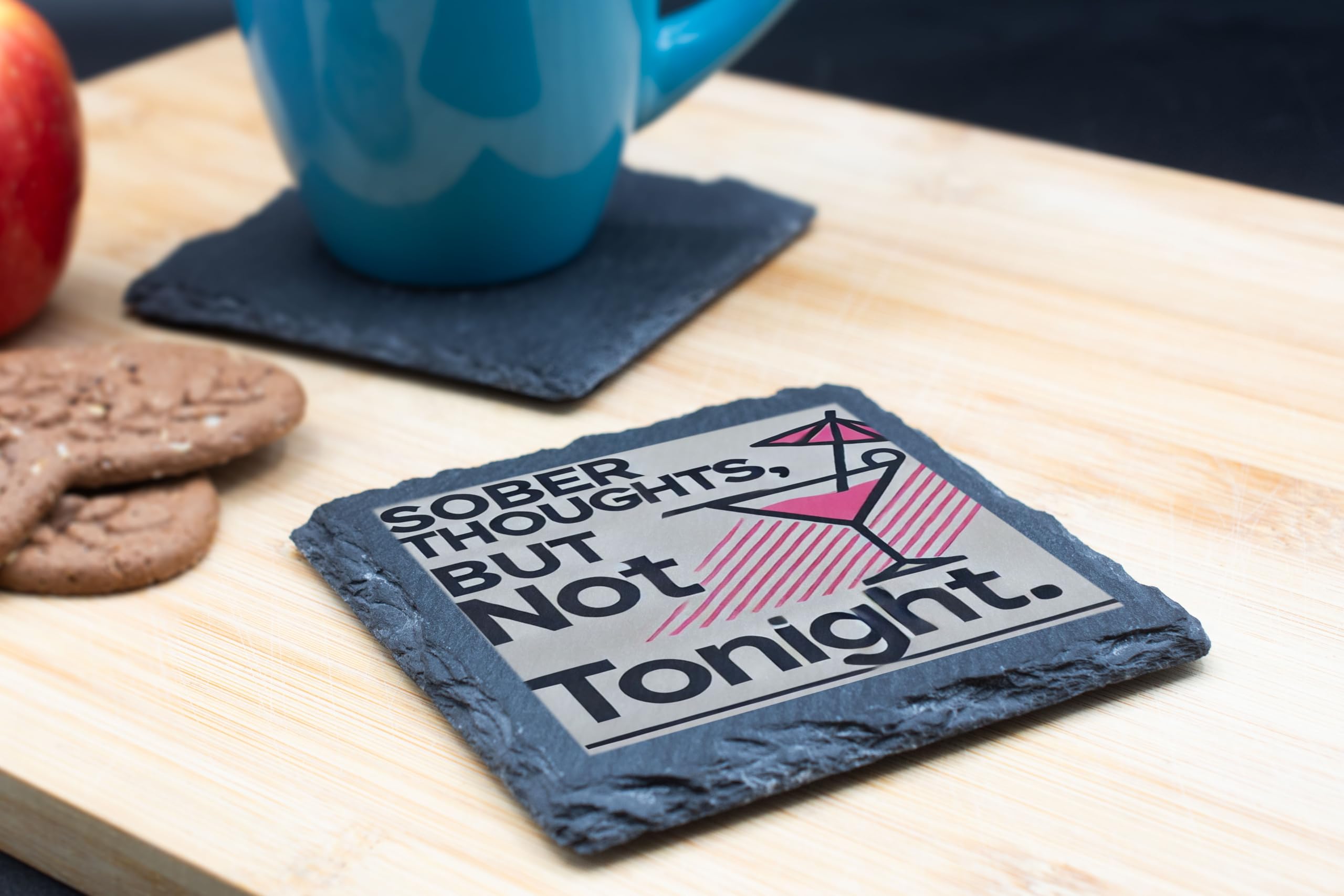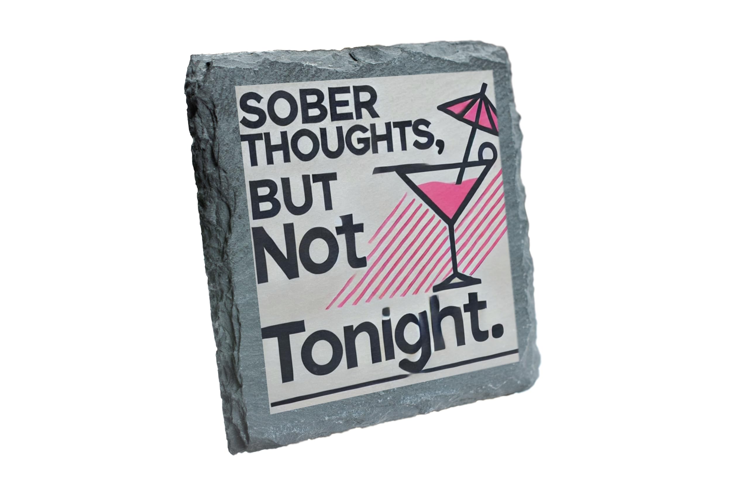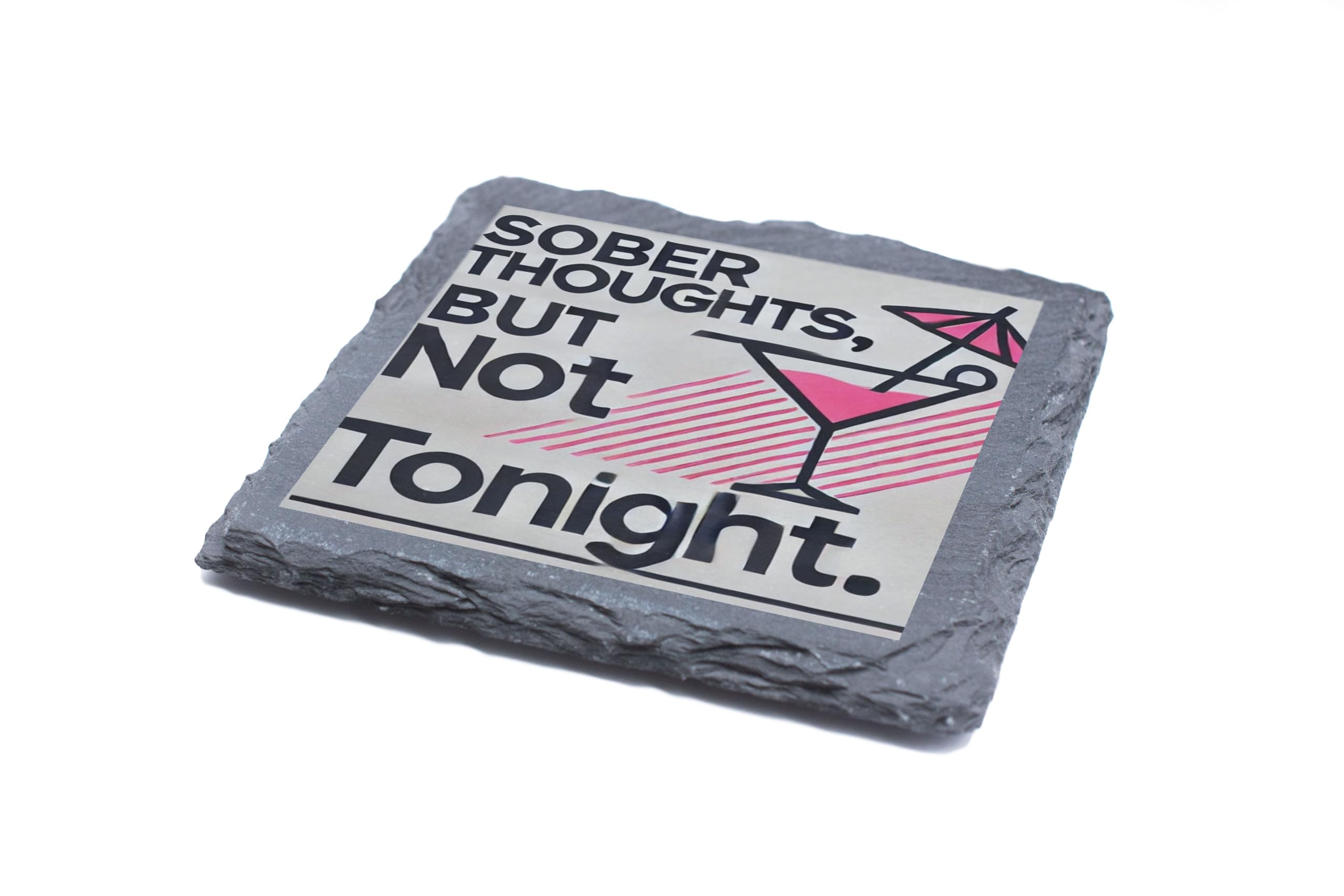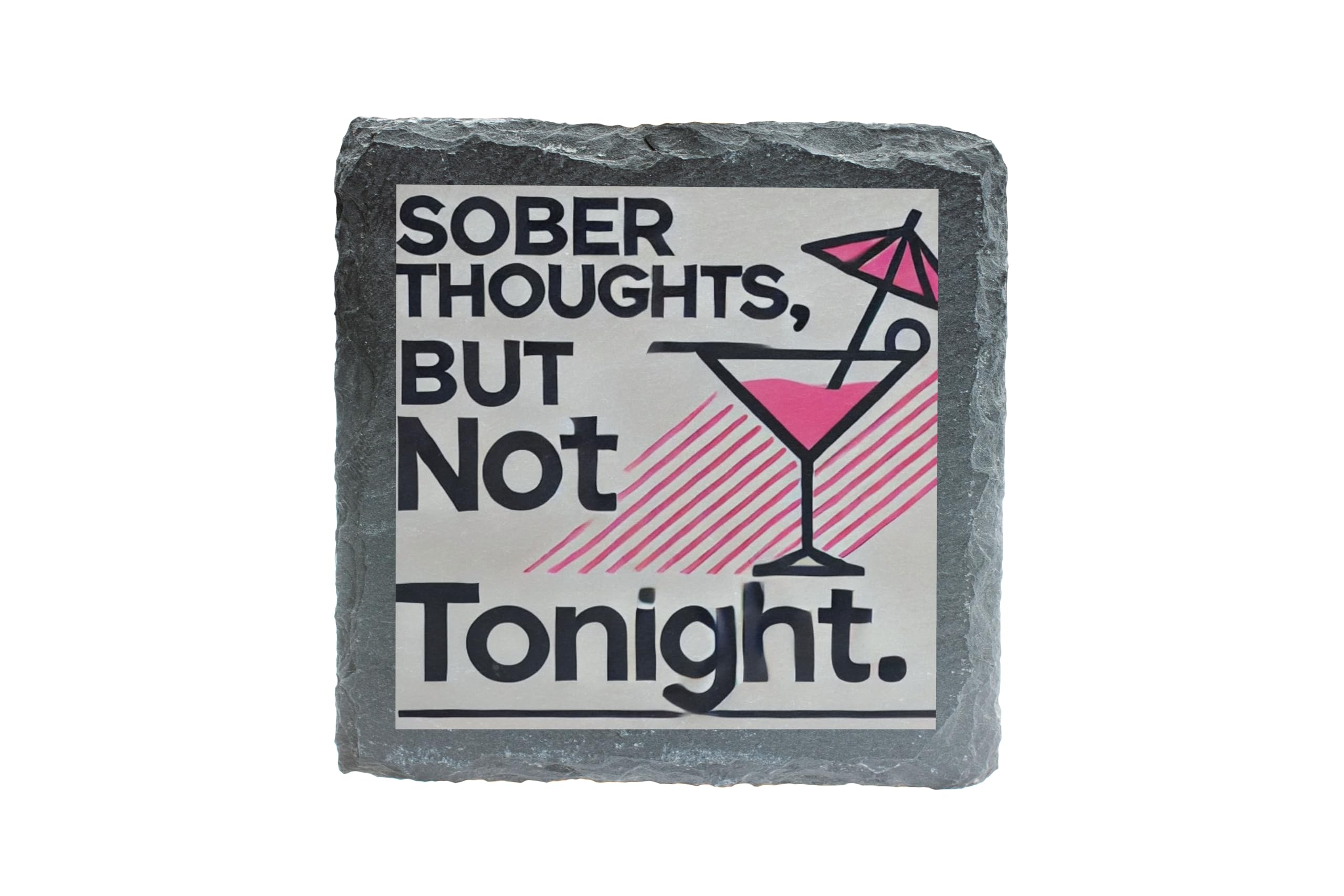 Make your party conversations more fun with the "Sober Thoughts, But Not Tonight" Slate Coaster. This cleverly designed coaster combines a humorous statement with a sleek and stylish martini glass illustration. Perfect for those who appreciate a good laugh and a good drink, this coaster is sure to add personality to any gathering. Crafted from premium natural slate, it not only provides reliable protection for your surfaces against heat, spills, and scratches but also serves as a charming decorative piece. Whether you're hosting a cocktail party, enjoying a casual drink, or searching for a playful gift, this coaster is the perfect choice.