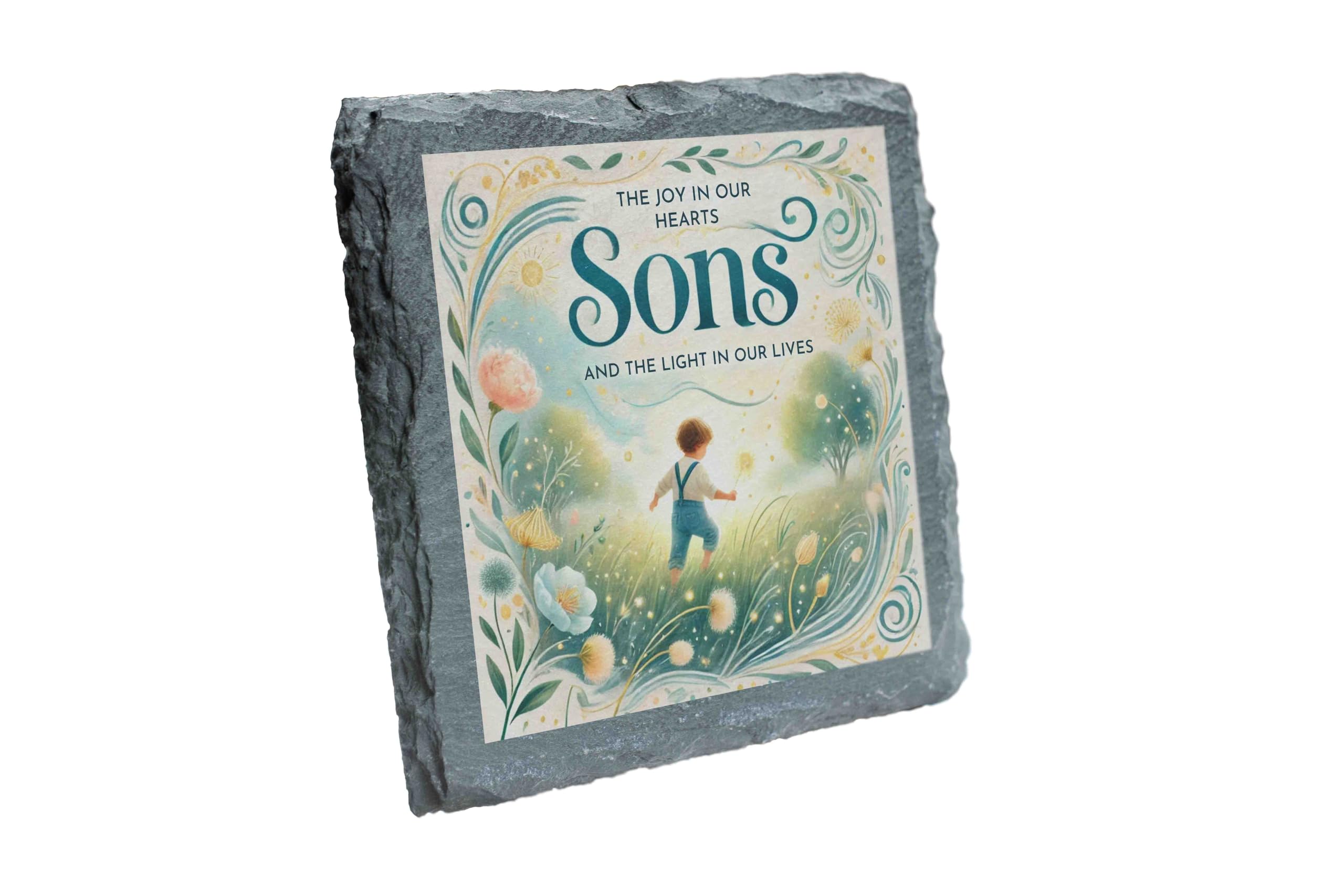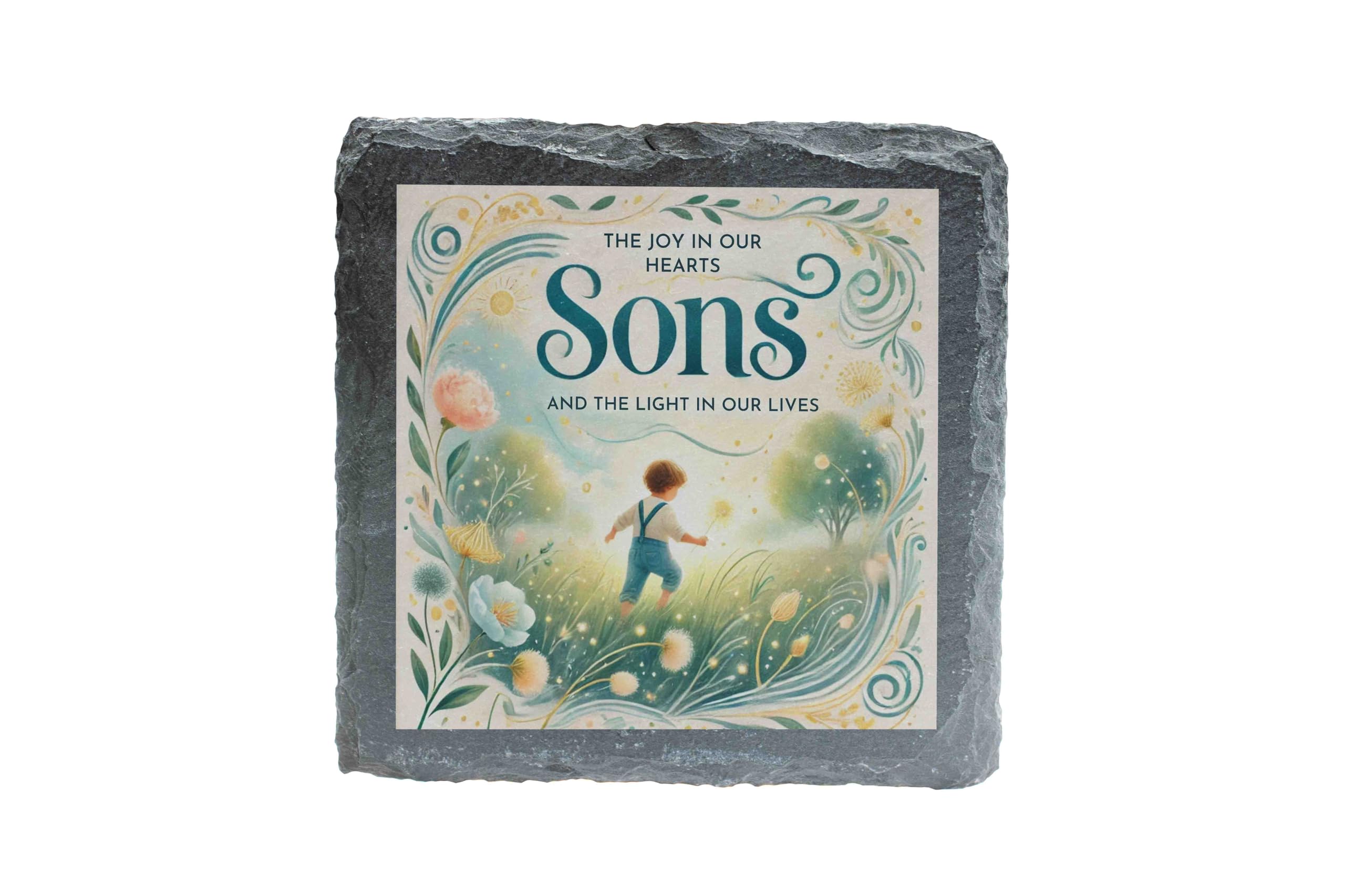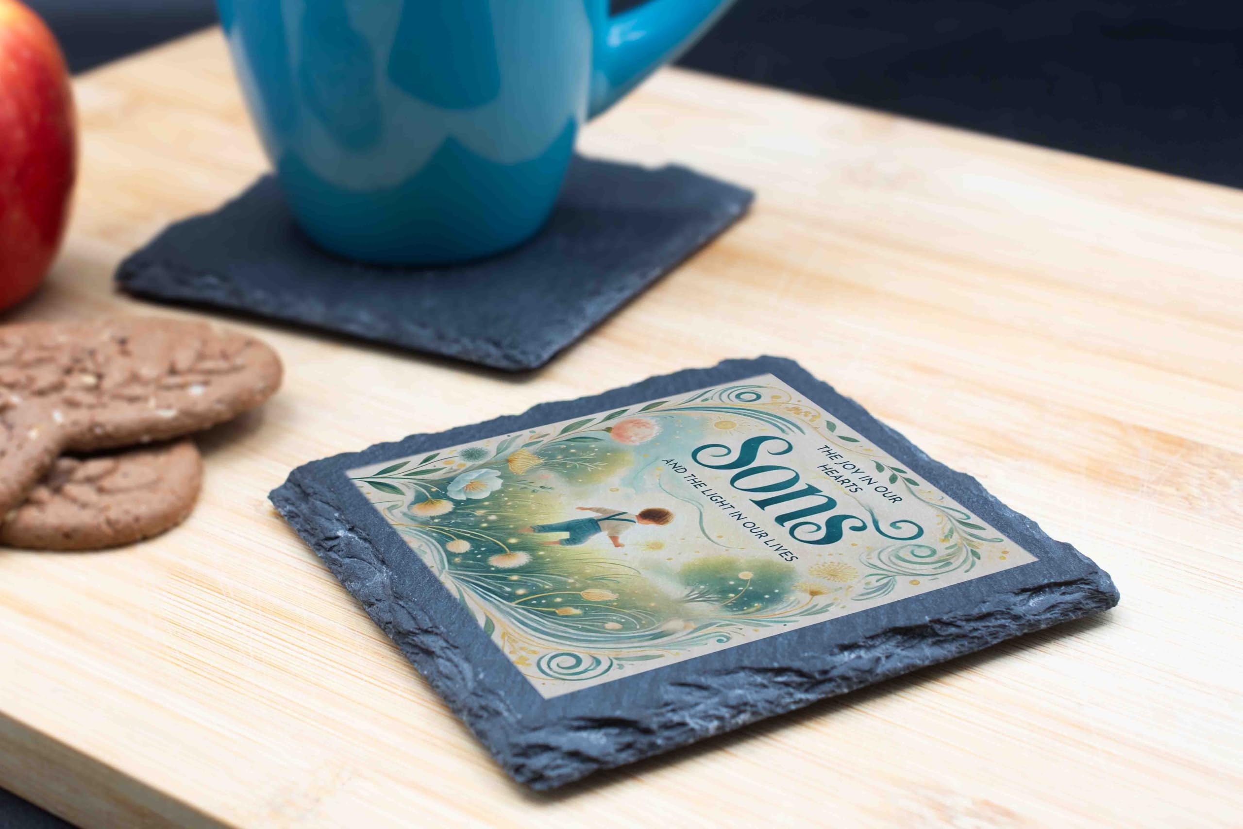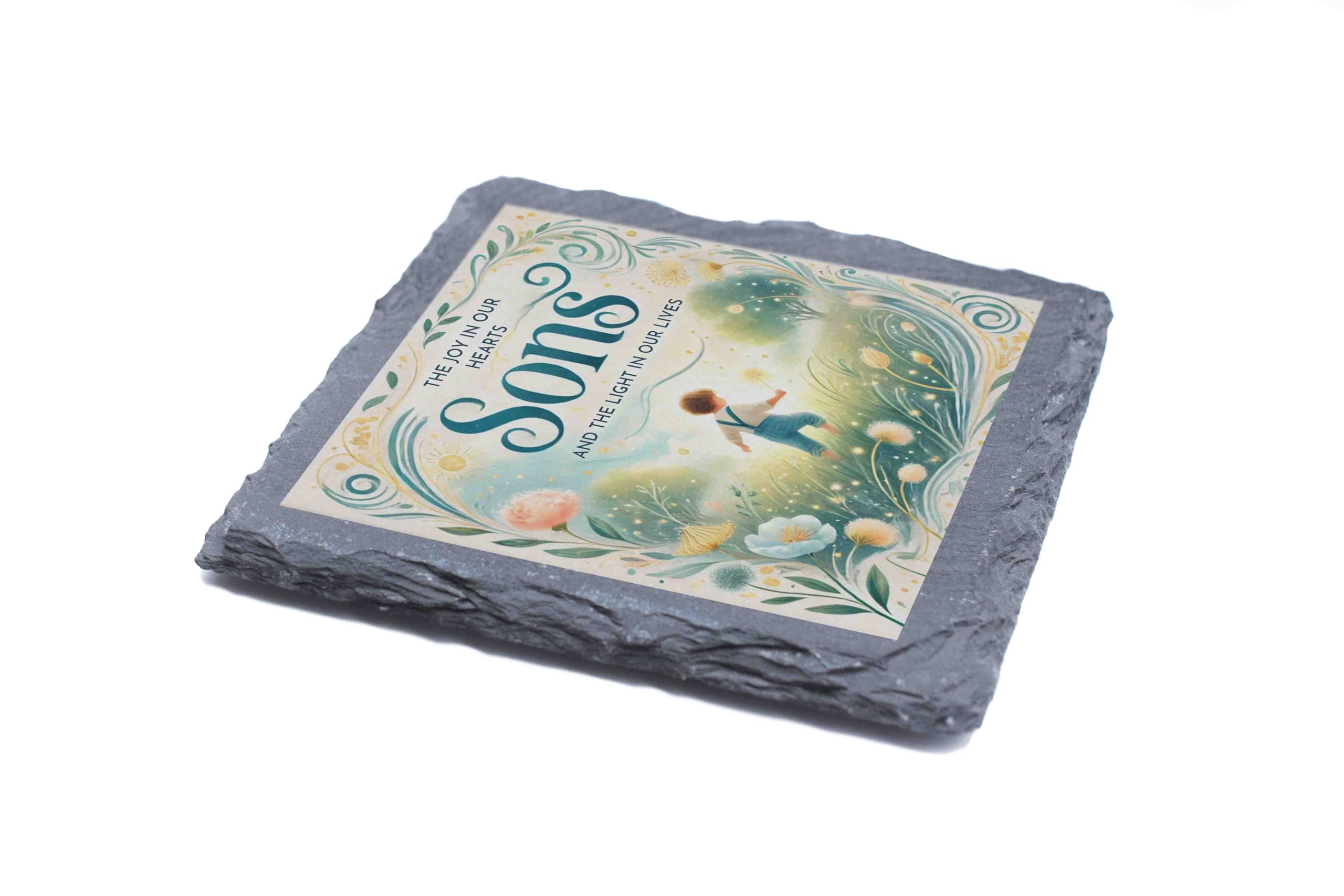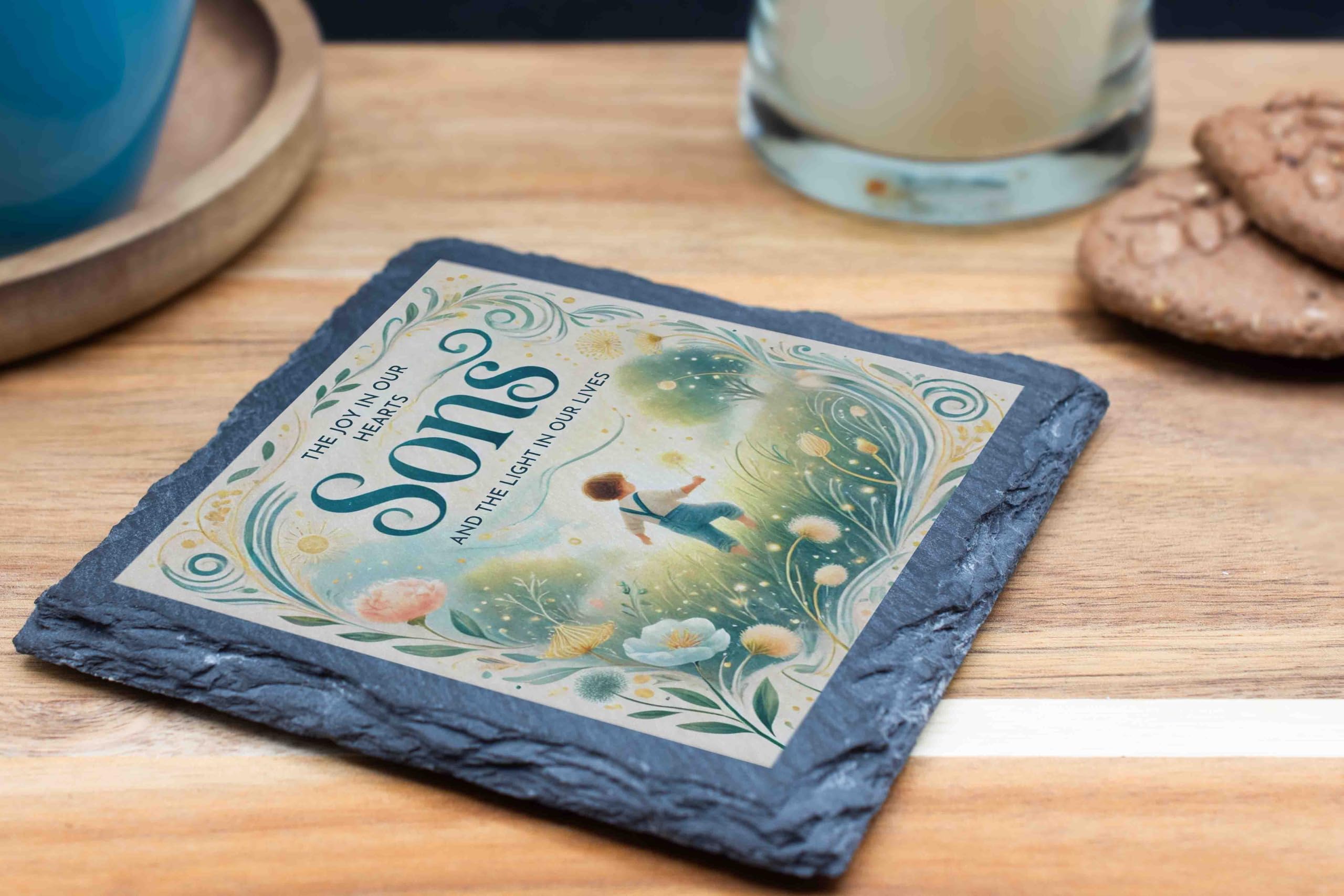 Celebrate the love and joy sons bring into our lives with this enchanting slate coaster. Featuring a delicate illustration of a child exploring a magical landscape and a heartfelt message, this coaster captures the essence of parenthood. Crafted from premium natural slate, this piece offers durability and a rustic charm, making it perfect for everyday use or as a decorative item. Whether you're looking for a unique gift for parents or a keepsake to cherish, this slate coaster is a meaningful choice that will bring warmth and beauty to any home.