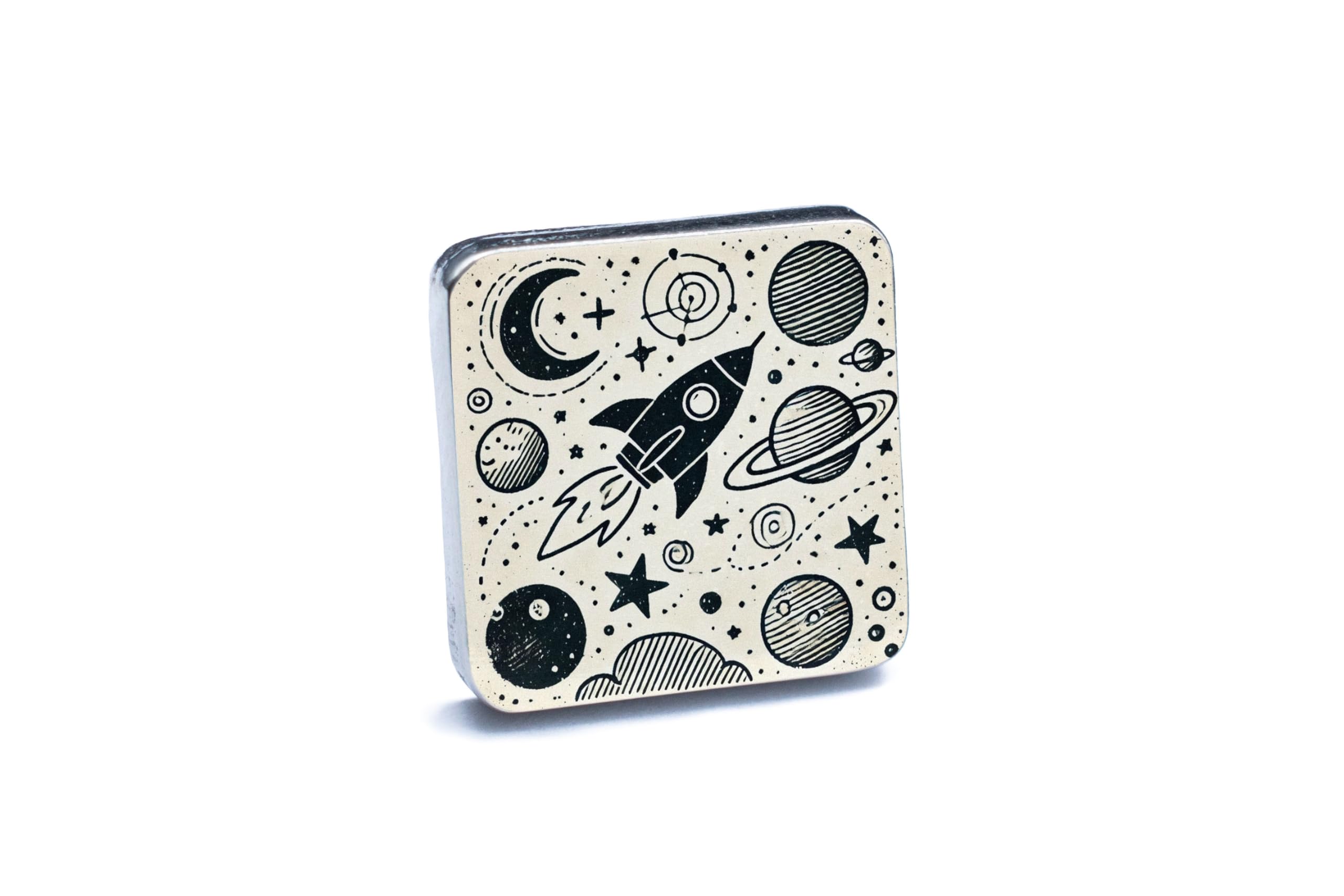 - Cosmic Design: Features a detailed rocket blasting off amidst planets, stars, and celestial bodies.