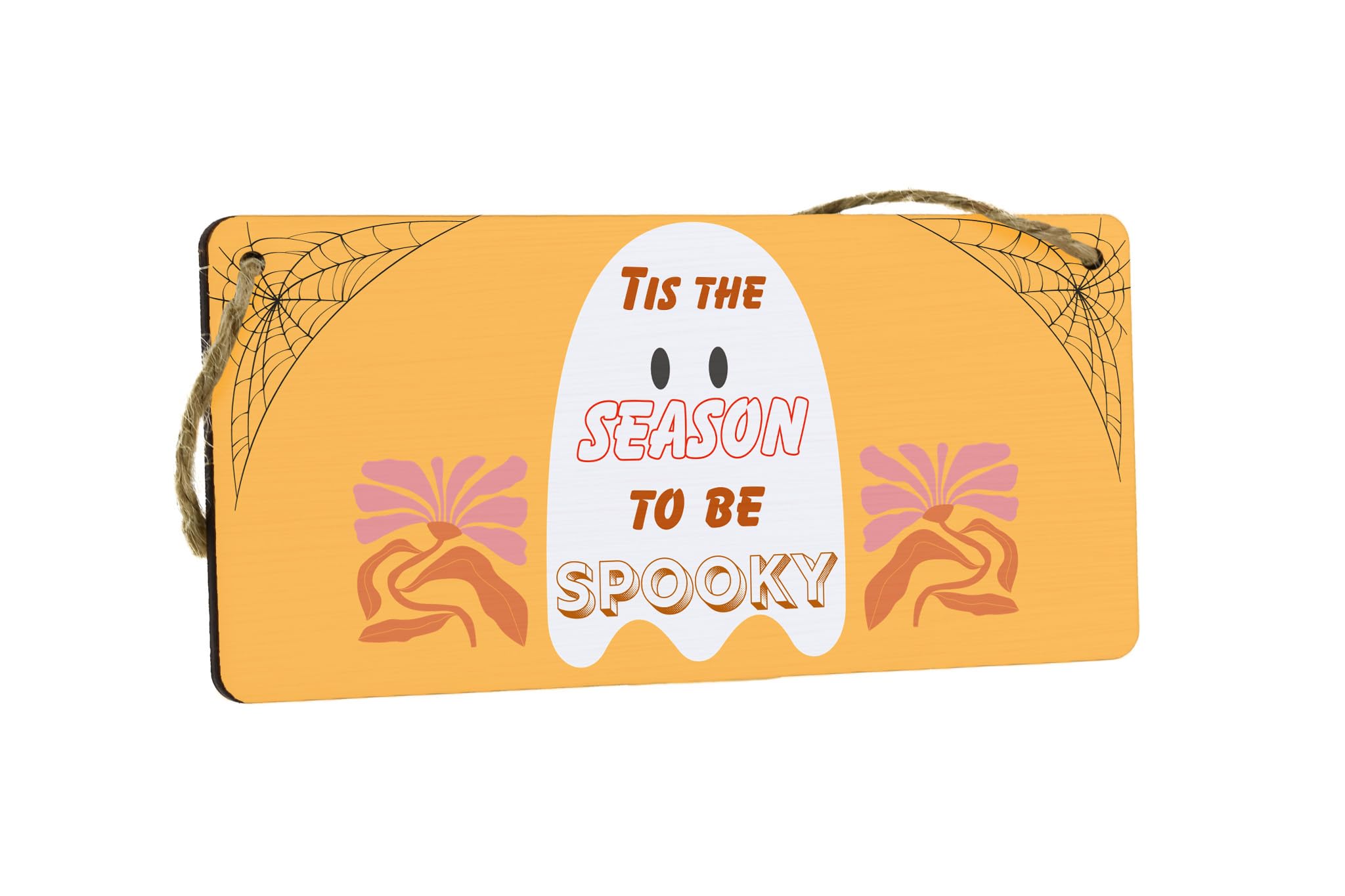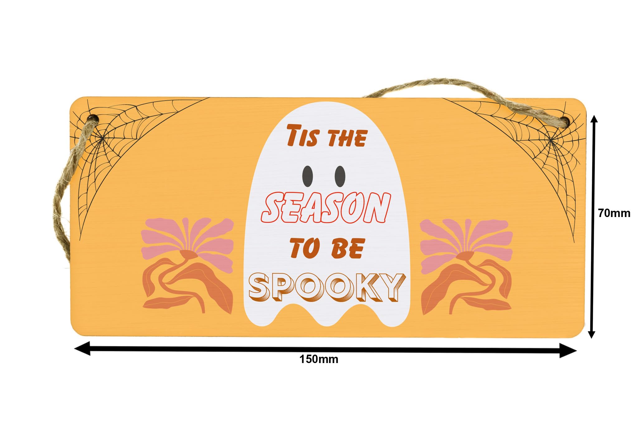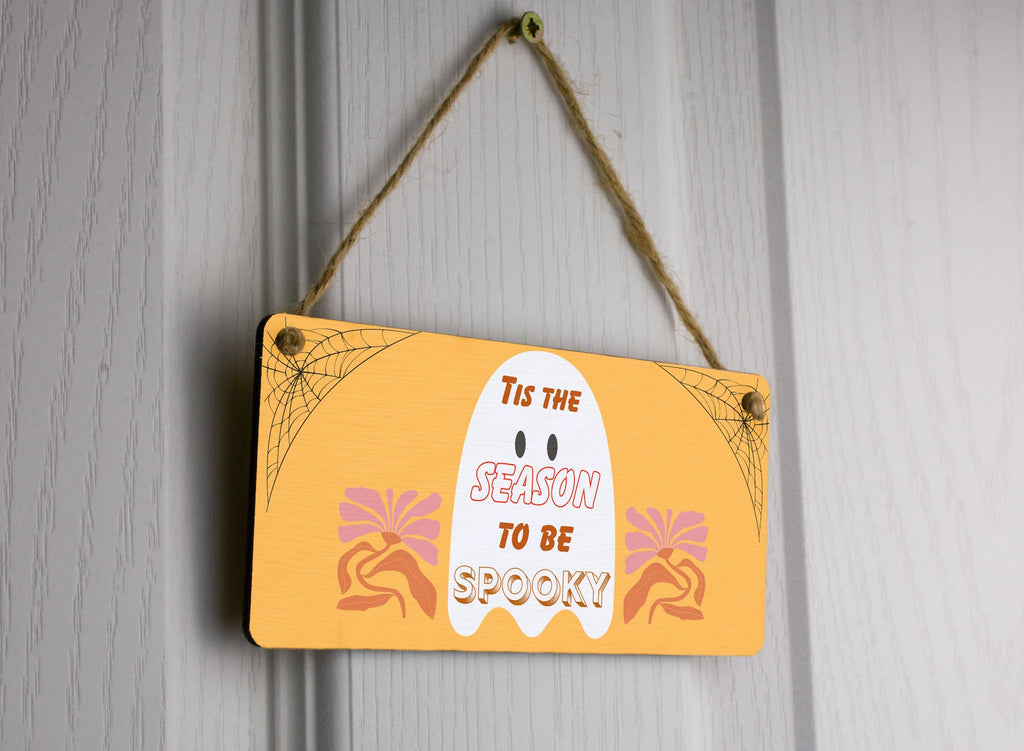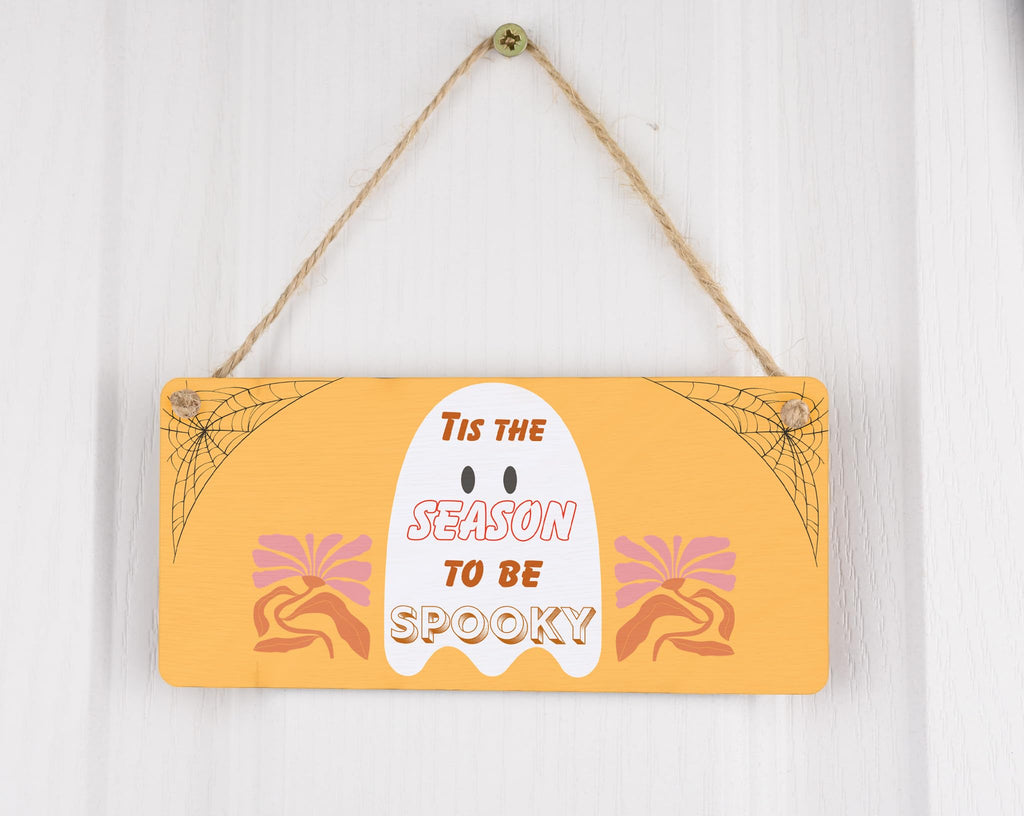 Get into the spooky spirit with this beautifully crafted Spooky Season Plywood Door Sign. Made from durable plywood, this hanging sign features a vibrant and full-color autumn design that will enhance your Halloween decor. With its charming and inviting message that reads 'Tis the season to be spooky', it will surely add a touch of Halloween magic to your home. Hang it on your front door or on a wall to create a spooky atmosphere that is perfect for Halloween parties or trick-or-treaters. Let this ghostly sign be the centerpiece of your decorations and set the stage for a fun and frightful autumn season!