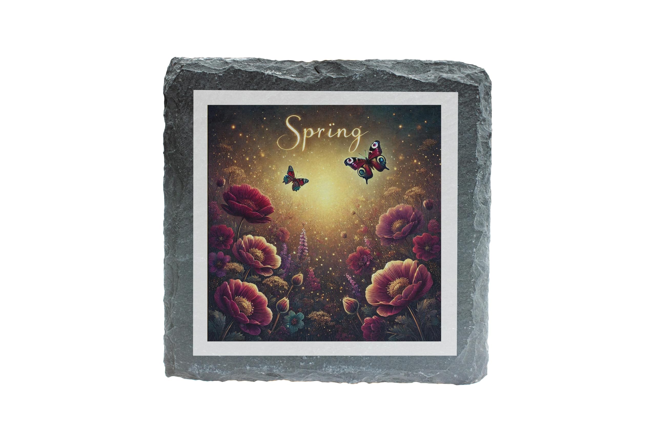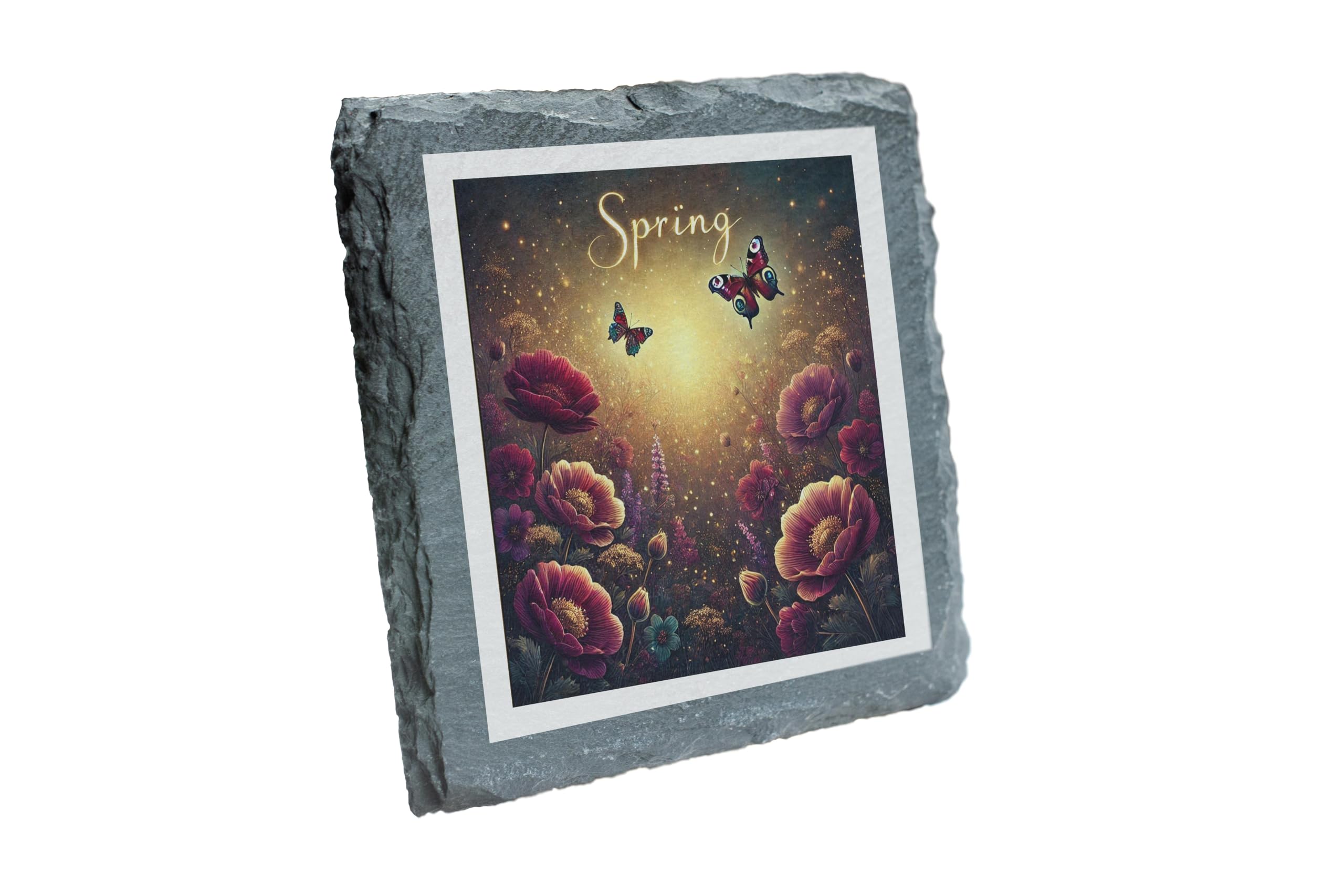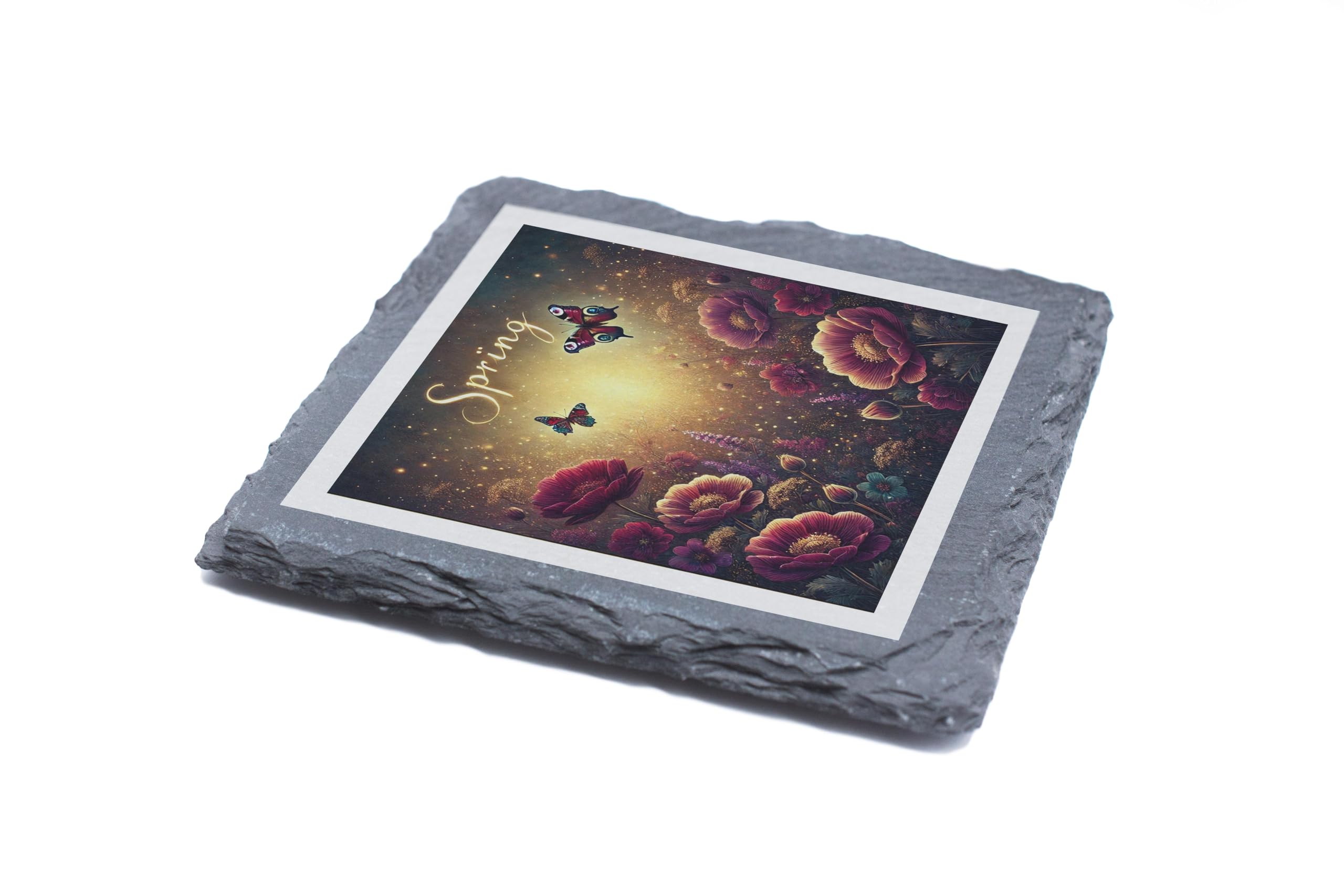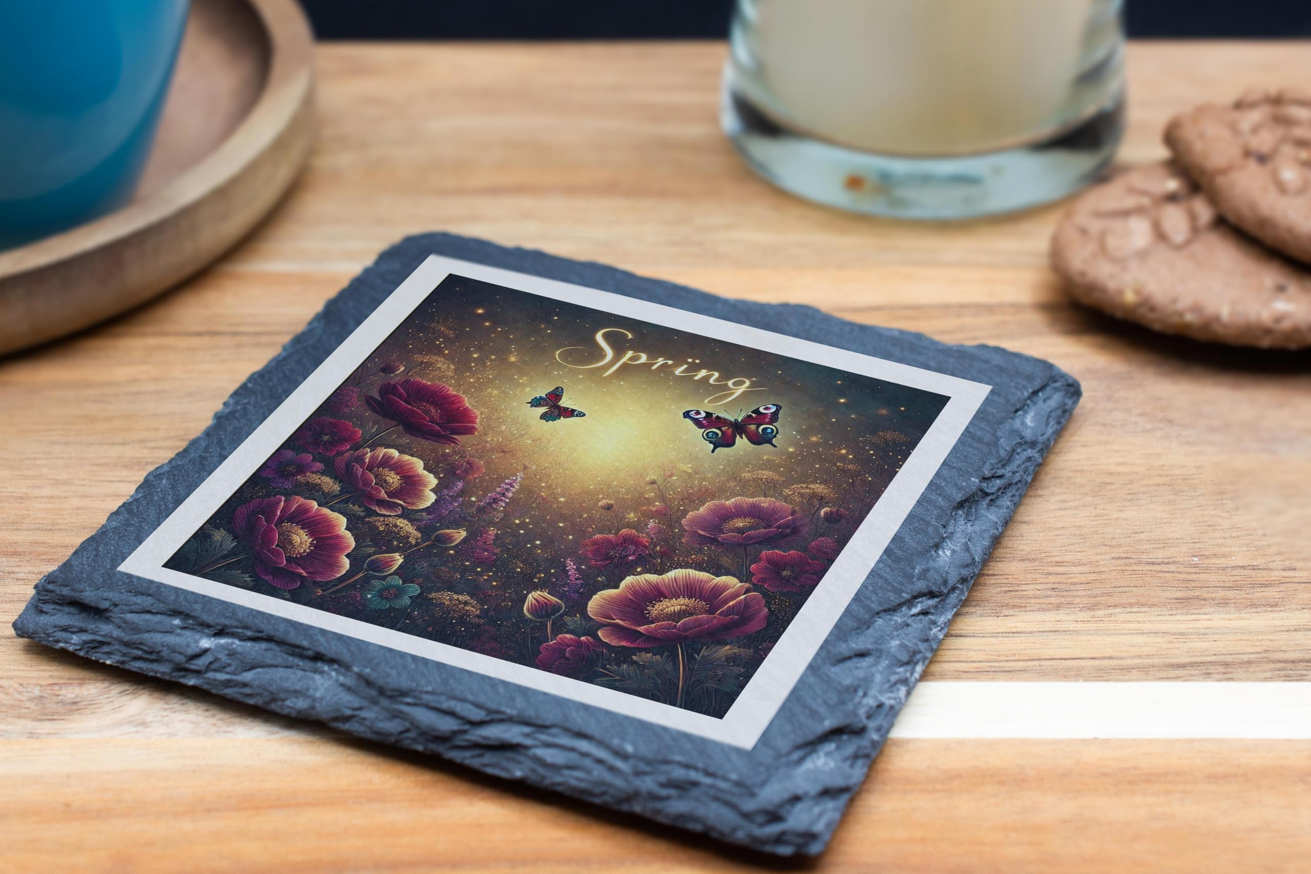 Celebrate the magic of spring with this beautifully crafted slate coaster featuring an exquisite design of vibrant flowers, radiant lighting, and delicate butterflies. The intricate details bring a touch of elegance and warmth to any space, perfect for welcoming the season or brightening your home decor. Made from high-quality natural slate, this coaster combines functionality with artistry. Its cork backing ensures your surfaces remain scratch-free while securely holding your favorite beverages. Whether for a special occasion or as a charming everyday accent, this coaster will elevate your spring decor effortlessly. Surprise a loved one or treat yourself to this enchanting piece?it?s a celebration of springtime beauty in every detail.
