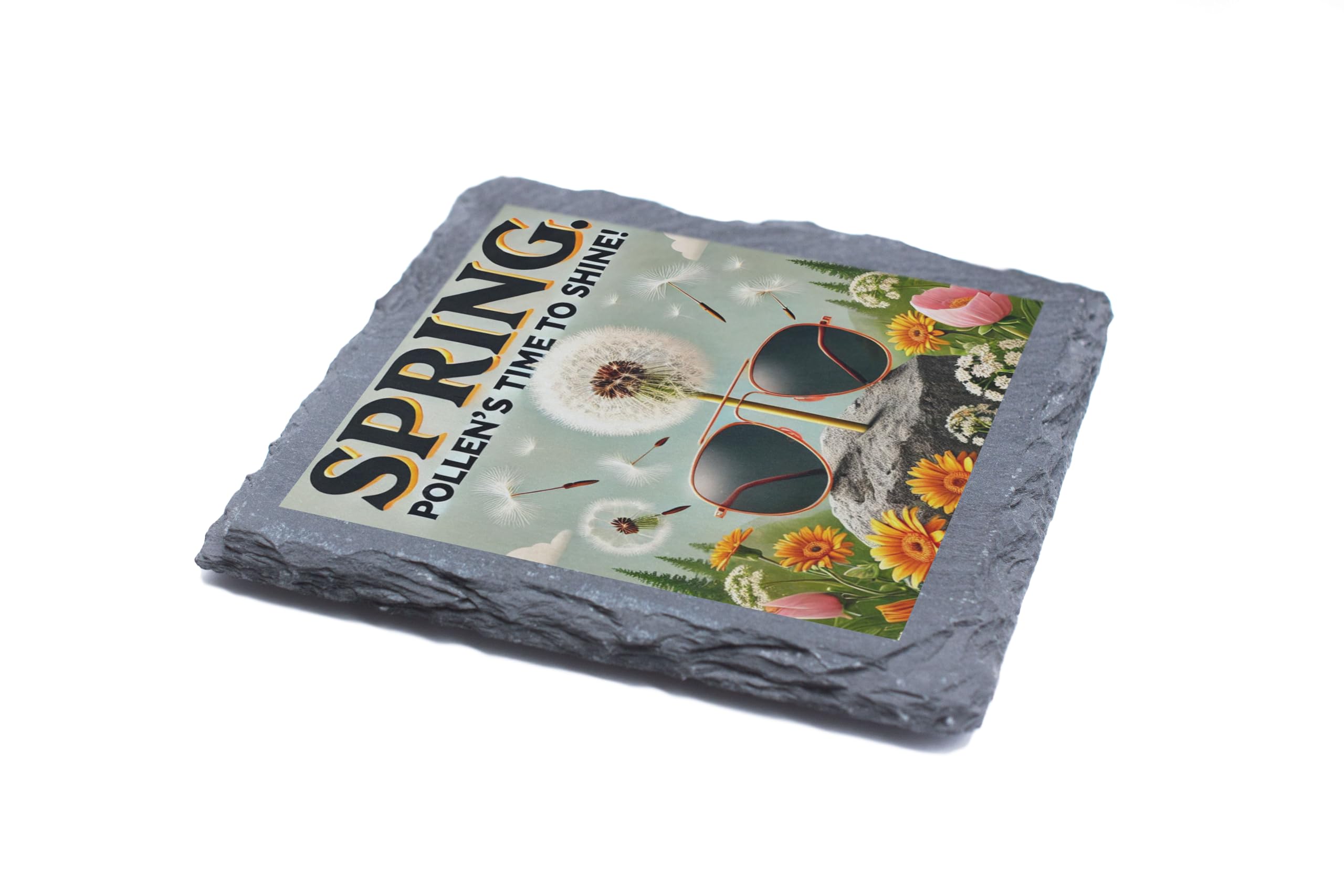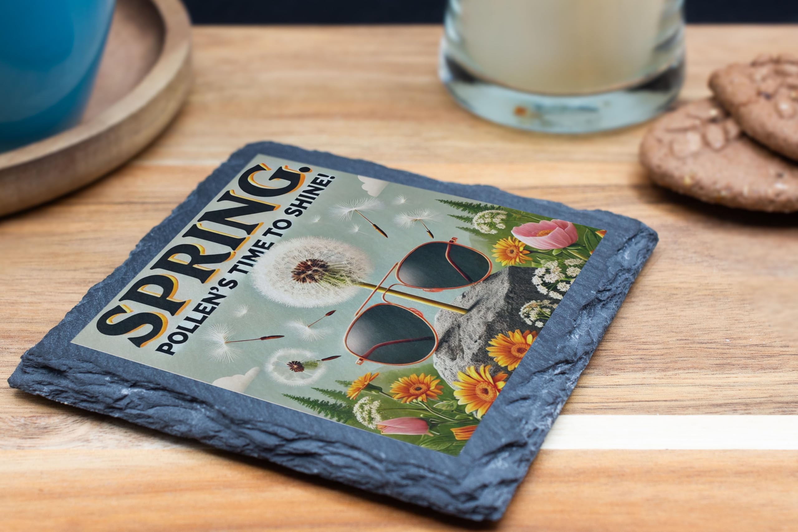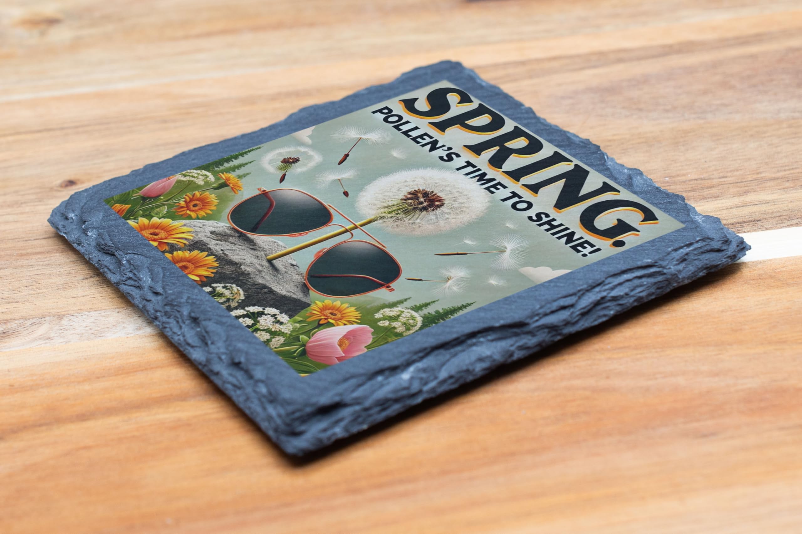 Welcome the freshness of spring with our "Spring: Pollen's Time to Shine!" Nature-Inspired Slate Coaster. This charming piece is adorned with whimsical dandelions, vibrant sunglasses, and a touch of blooming florals, capturing the essence of the season. Crafted from premium natural slate, this coaster not only protects your surfaces but also enhances your space with a unique and stylish touch. The fade-resistant, vivid print ensures lasting beauty, making it a delightful addition to your home decor. Perfect for spring gatherings, seasonal decor, or simply enjoying a touch of nature indoors, this coaster is a thoughtful and practical gift for any occasion. Celebrate the beauty of springtime with this one-of-a-kind accessory!