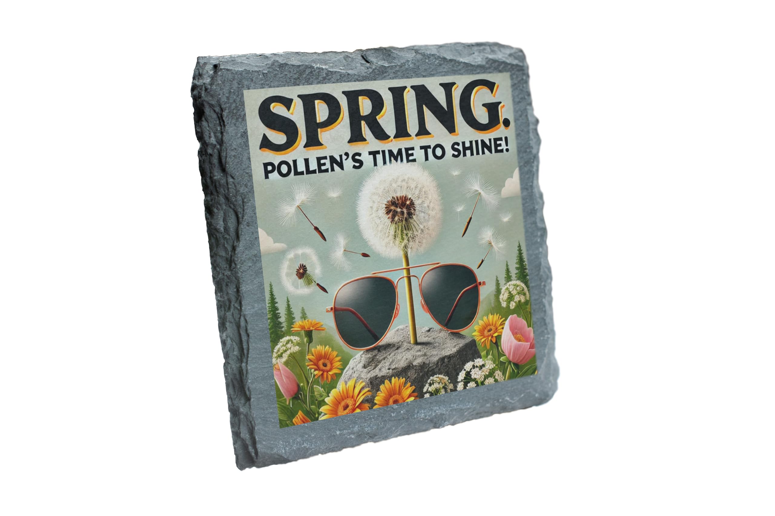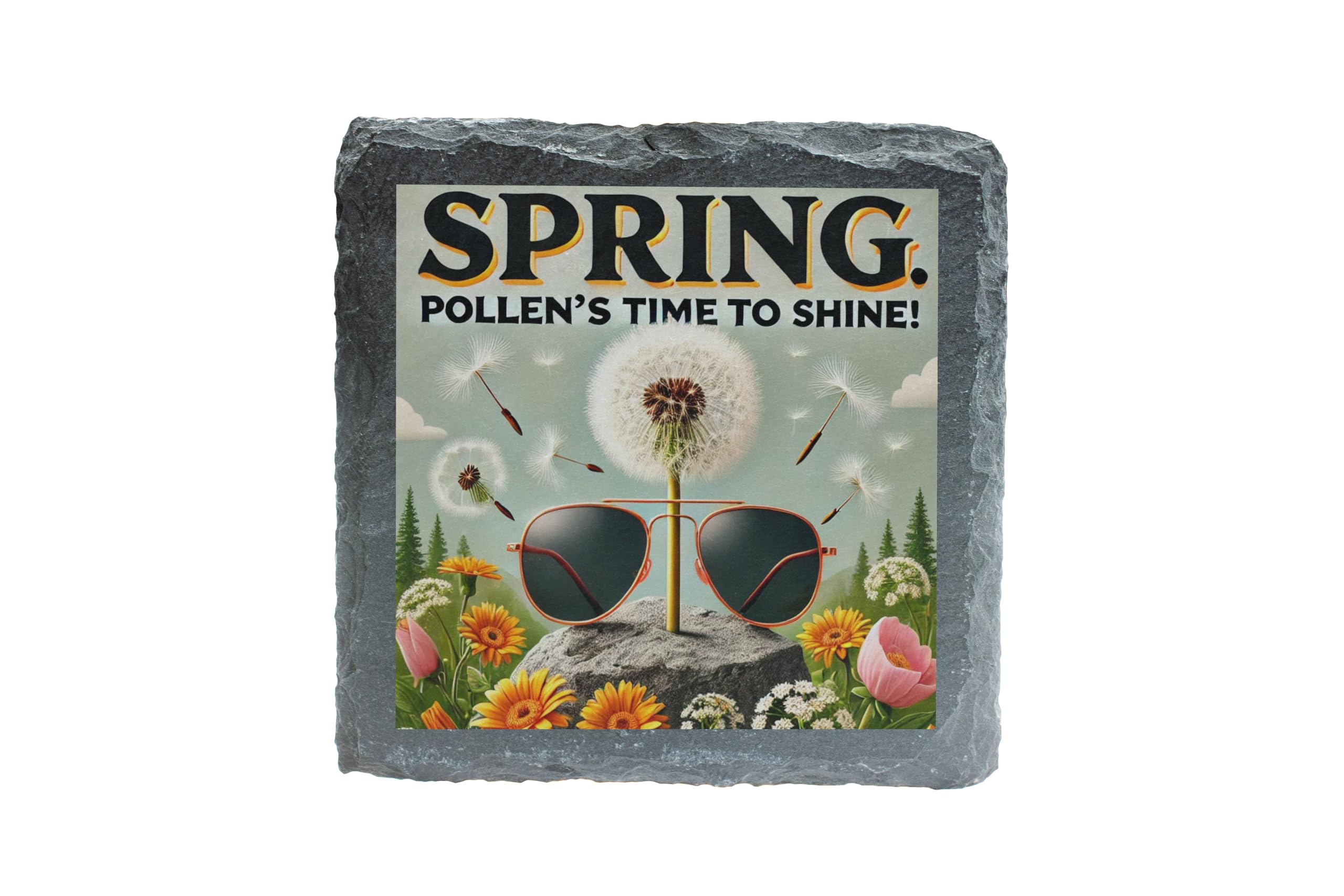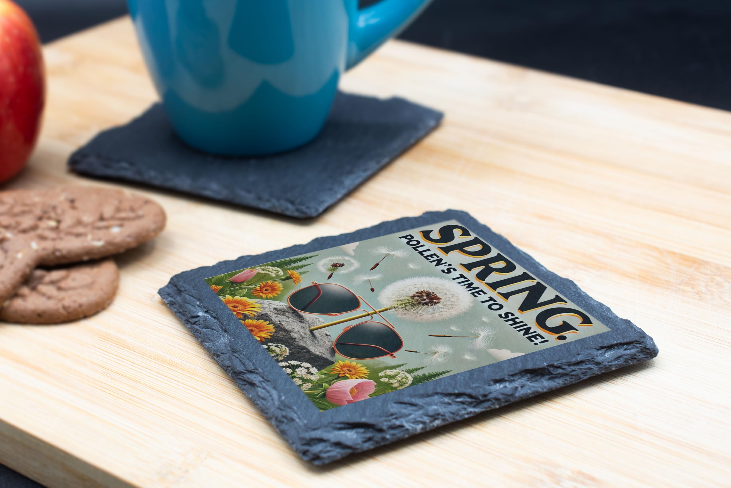 Welcome the freshness of spring with our "Spring: Pollen's Time to Shine!" Nature-Inspired Slate Coaster. This charming piece is adorned with whimsical dandelions, vibrant sunglasses, and a touch of blooming florals, capturing the essence of the season. Crafted from premium natural slate, this coaster not only protects your surfaces but also enhances your space with a unique and stylish touch. The fade-resistant, vivid print ensures lasting beauty, making it a delightful addition to your home decor. Perfect for spring gatherings, seasonal decor, or simply enjoying a touch of nature indoors, this coaster is a thoughtful and practical gift for any occasion. Celebrate the beauty of springtime with this one-of-a-kind accessory!