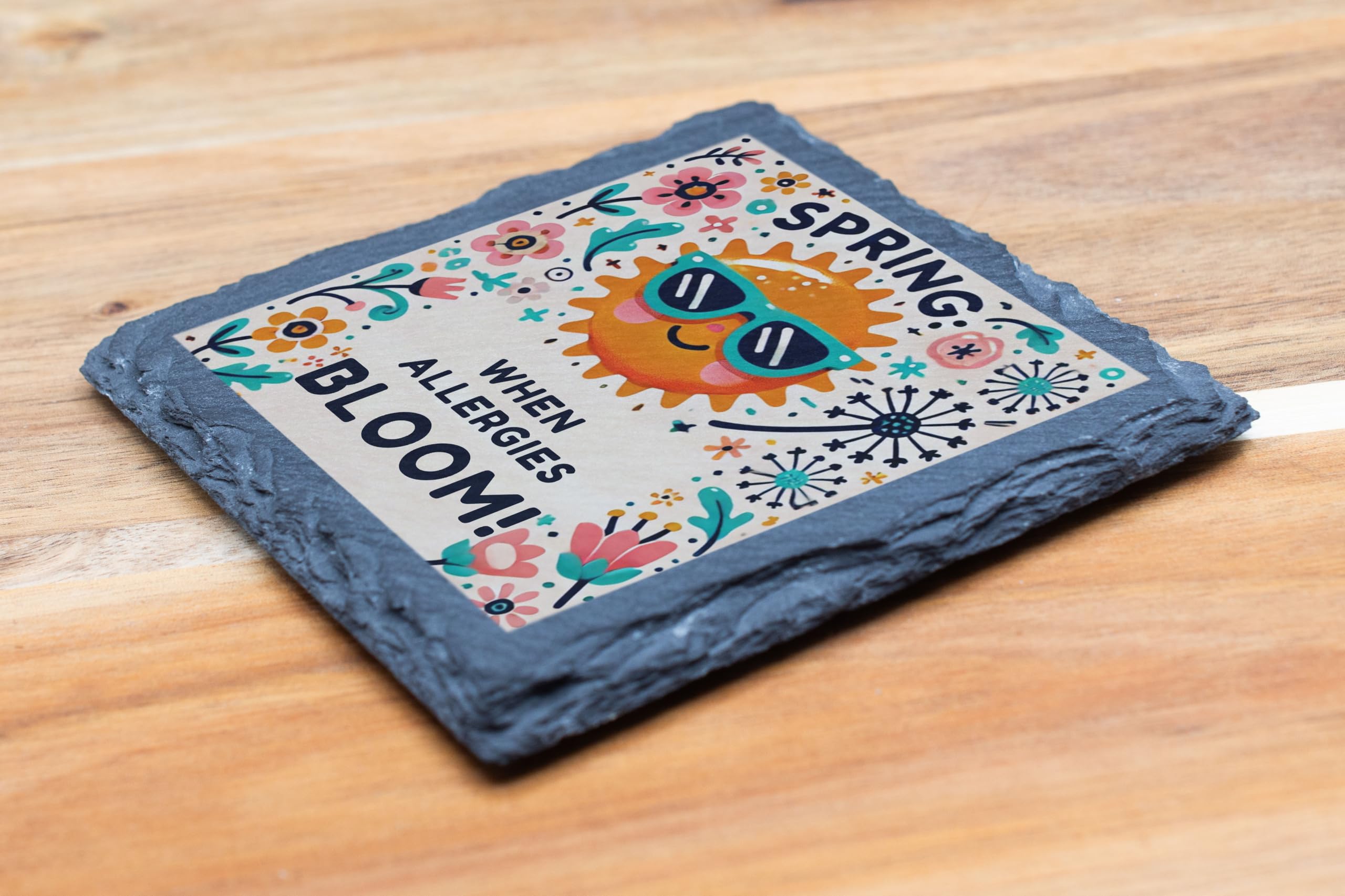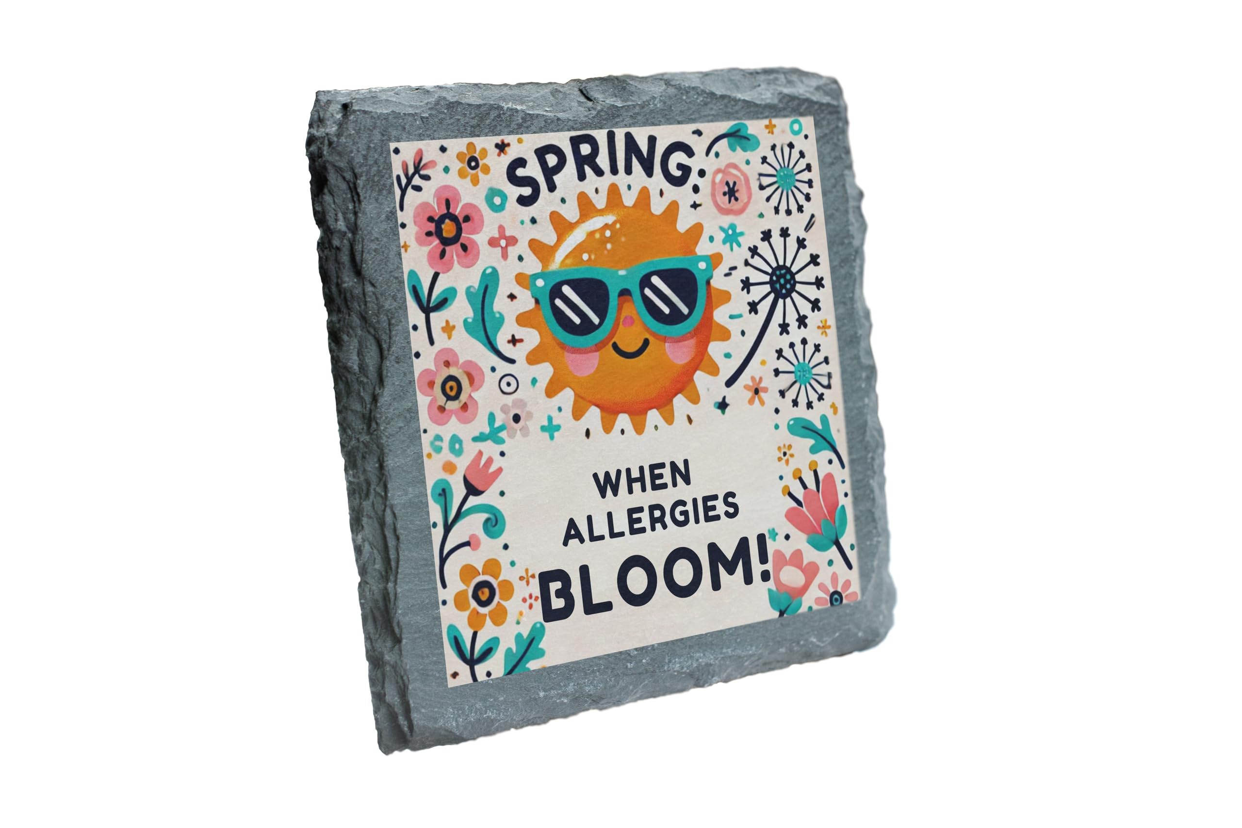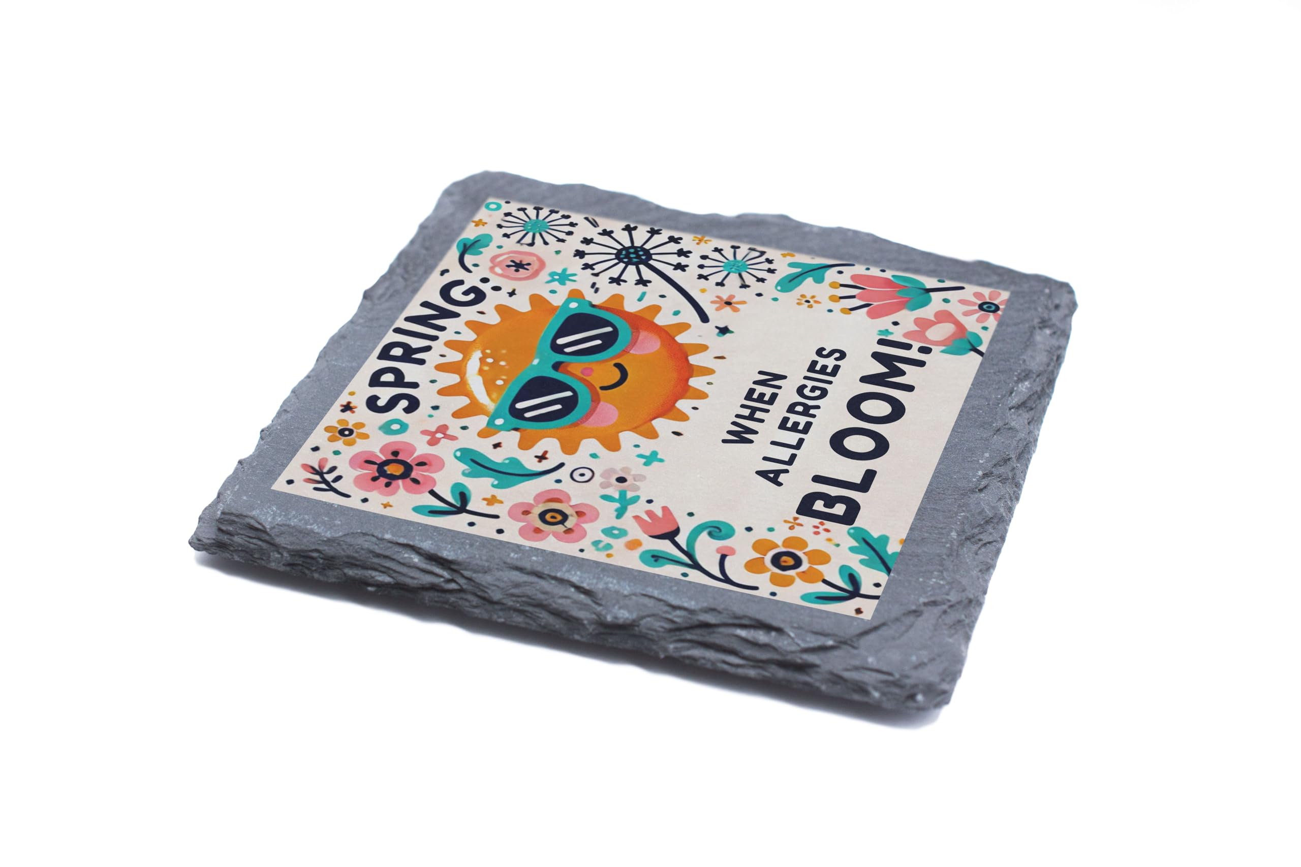 Celebrate spring with a smile (and maybe a sneeze) with this delightful slate coaster! Showcasing a sunny, flower-filled design and the humorous text "Spring ? When Allergies Bloom," this coaster is a fun and functional addition to your home. Crafted from high-quality natural slate, it?s not only stylish but also practical, keeping your surfaces safe from spills and scratches. Perfect for coffee tables, desks, or springtime gatherings, this coaster brings personality to any setting. It also makes a thoughtful and quirky gift for friends and family who enjoy a good laugh about seasonal woes. Add some humor to your home with this springtime must-have!