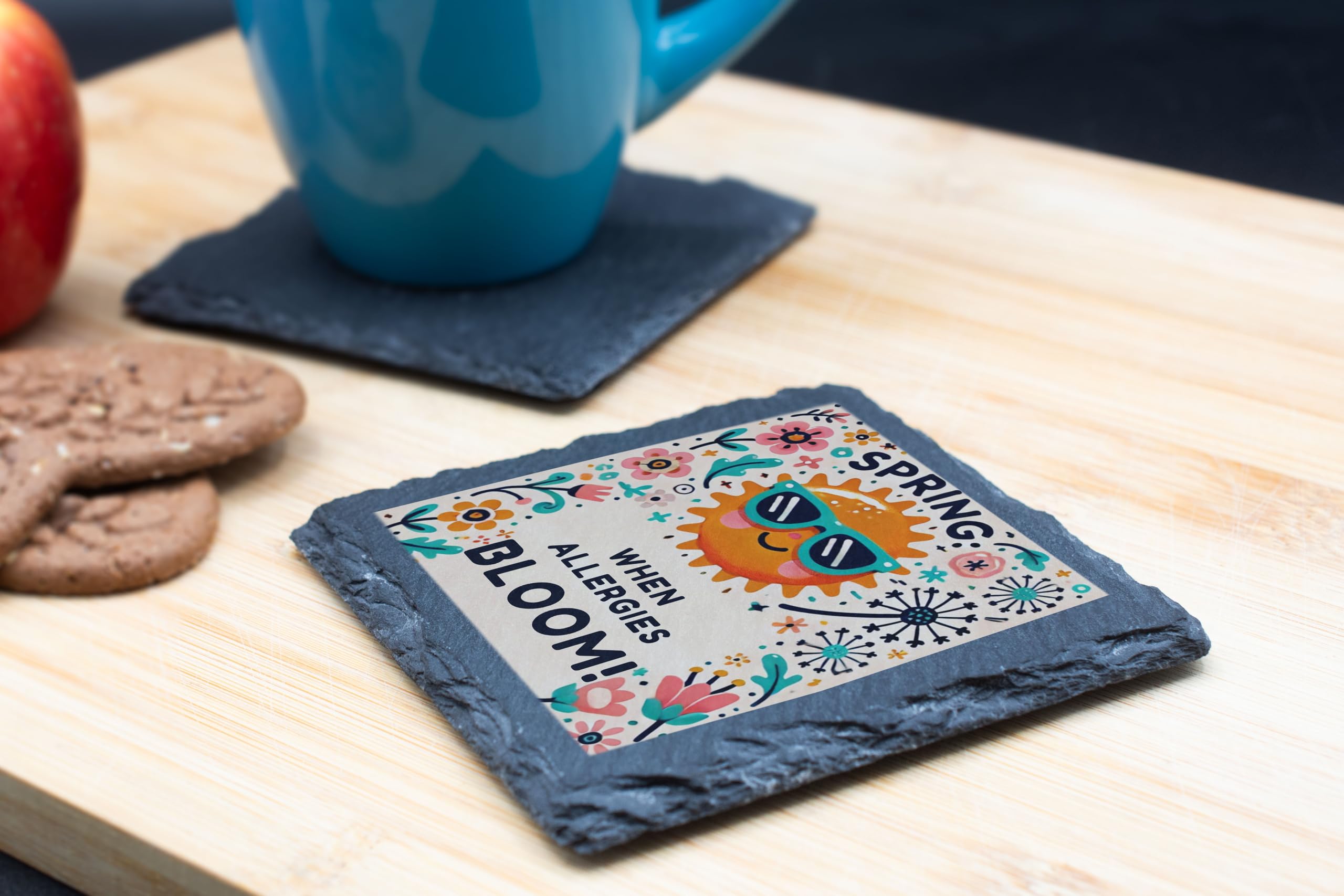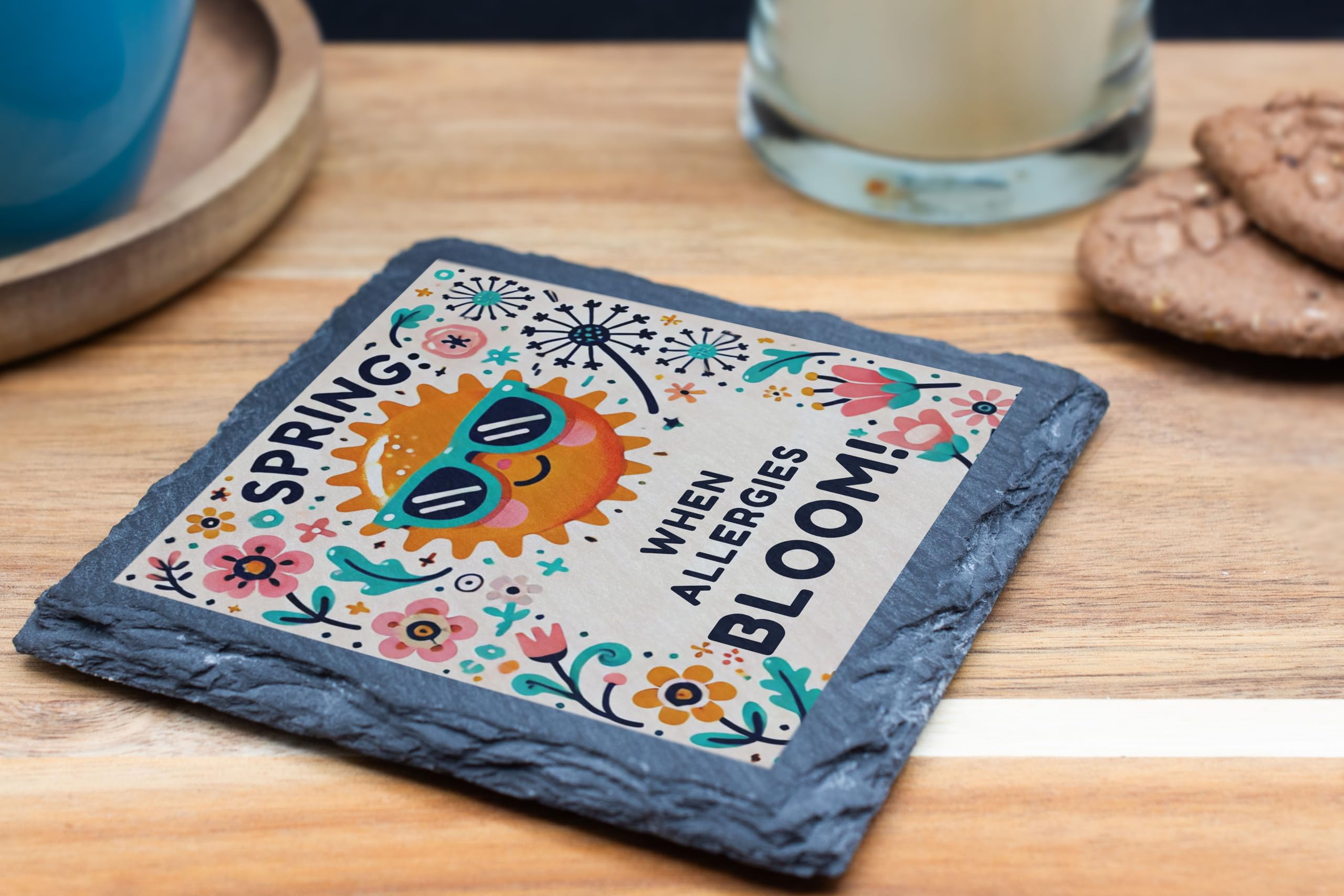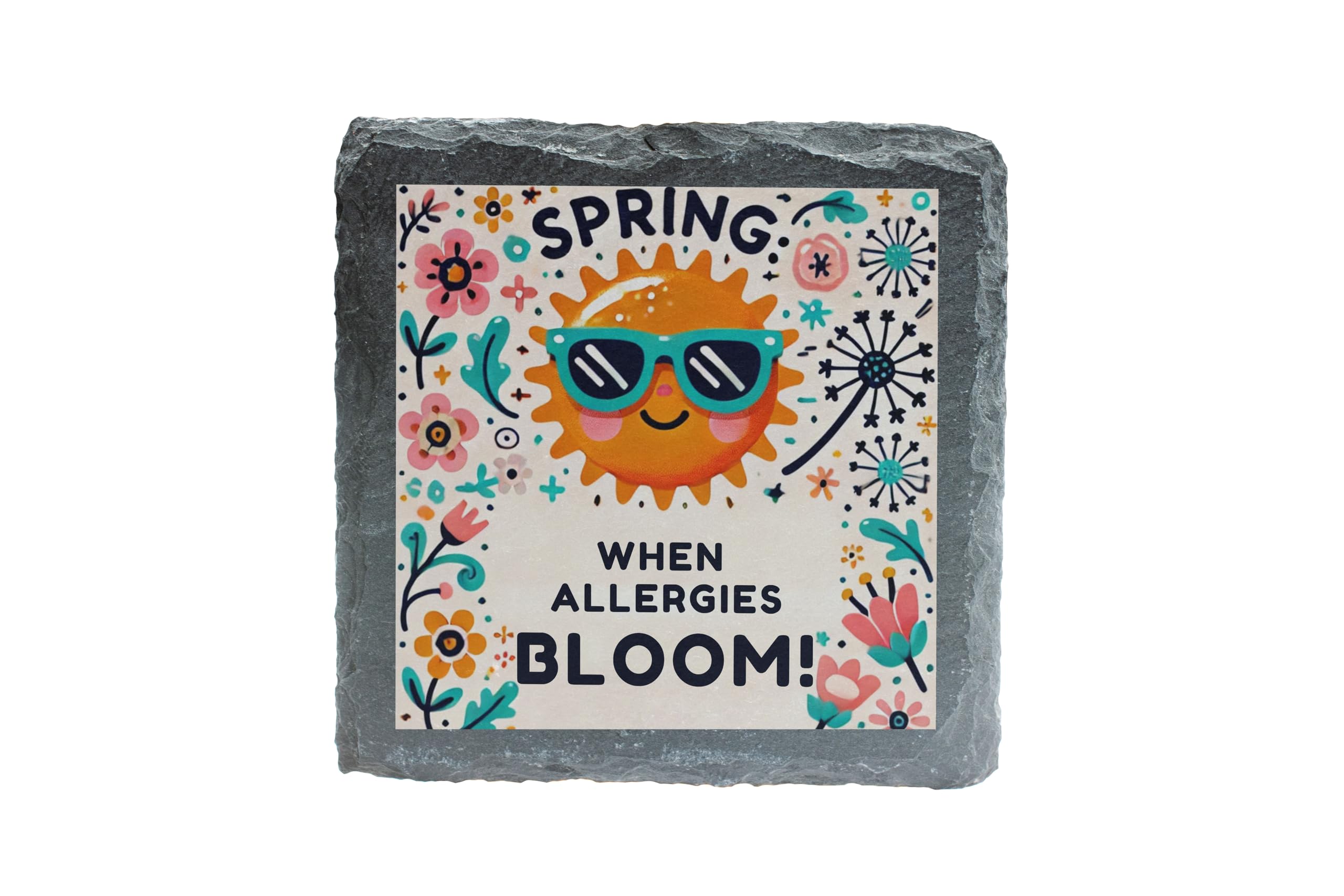 Celebrate spring with a smile (and maybe a sneeze) with this delightful slate coaster! Showcasing a sunny, flower-filled design and the humorous text "Spring ? When Allergies Bloom," this coaster is a fun and functional addition to your home. Crafted from high-quality natural slate, it?s not only stylish but also practical, keeping your surfaces safe from spills and scratches. Perfect for coffee tables, desks, or springtime gatherings, this coaster brings personality to any setting. It also makes a thoughtful and quirky gift for friends and family who enjoy a good laugh about seasonal woes. Add some humor to your home with this springtime must-have!