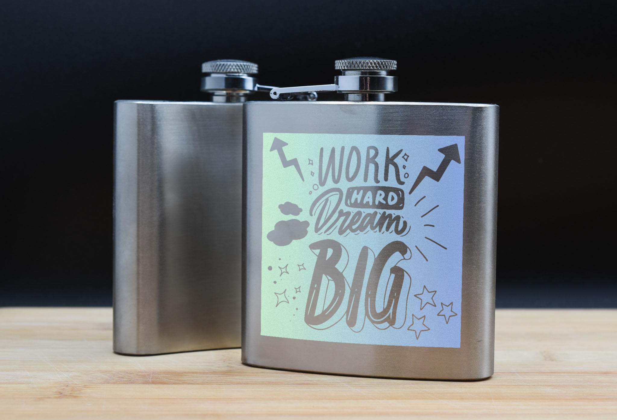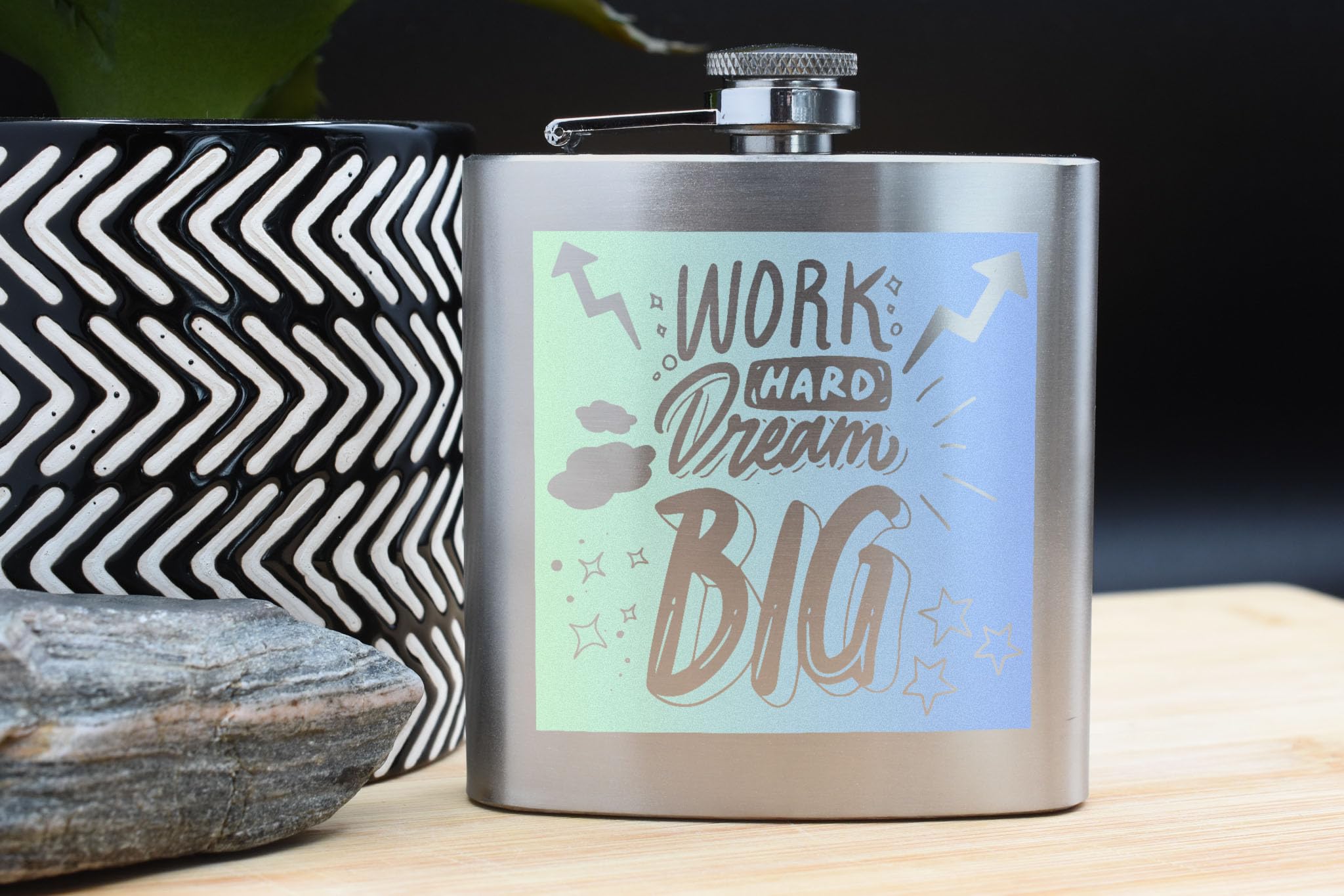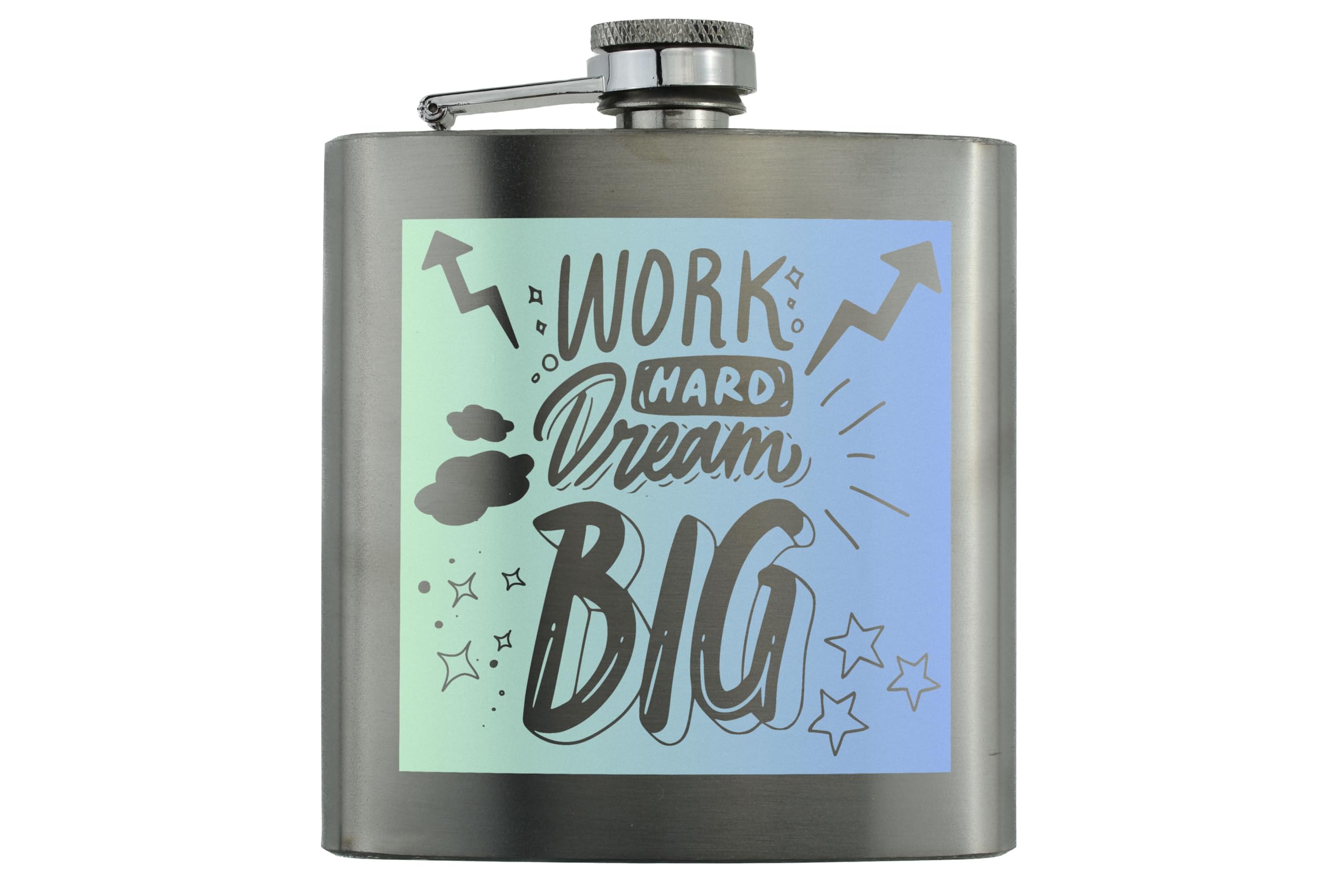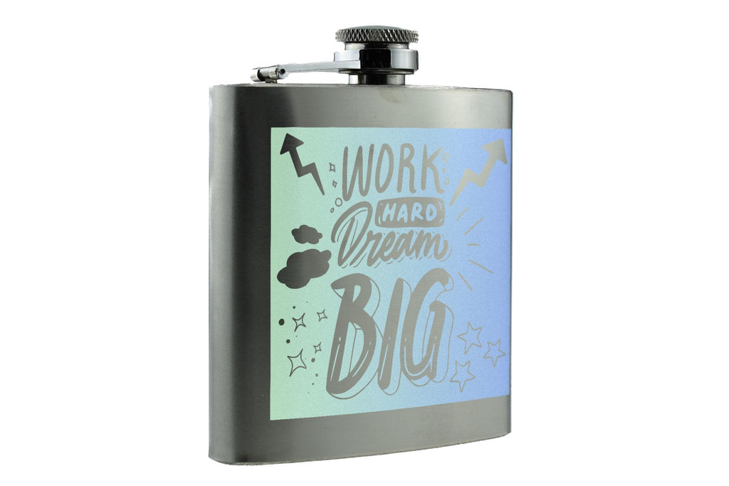 Introducing our Stainless Steel Gradient Dreamer's Flask with 'Work Hard - Dream Big' Design! This motivational flask is the perfect inspirational gift for anyone in your life who is a dreamer, a goal-setter, and a hard worker. With its uplifting quote and positive thinking design, this flask will be sure to encourage and empower the recipient. The full colour UV printed design features a calming blue gradient and fun text that reads 'work hard - dream big'. Made of quality stainless steel, this flask is not only stylish but also durable and long-lasting. Whether you're looking to boost your own success motivation or give a thoughtful achievement flask to a loved one, this dreamer's flask is the ideal choice. Let this unique piece be a constant reminder to stay goal-oriented and always strive for greatness.