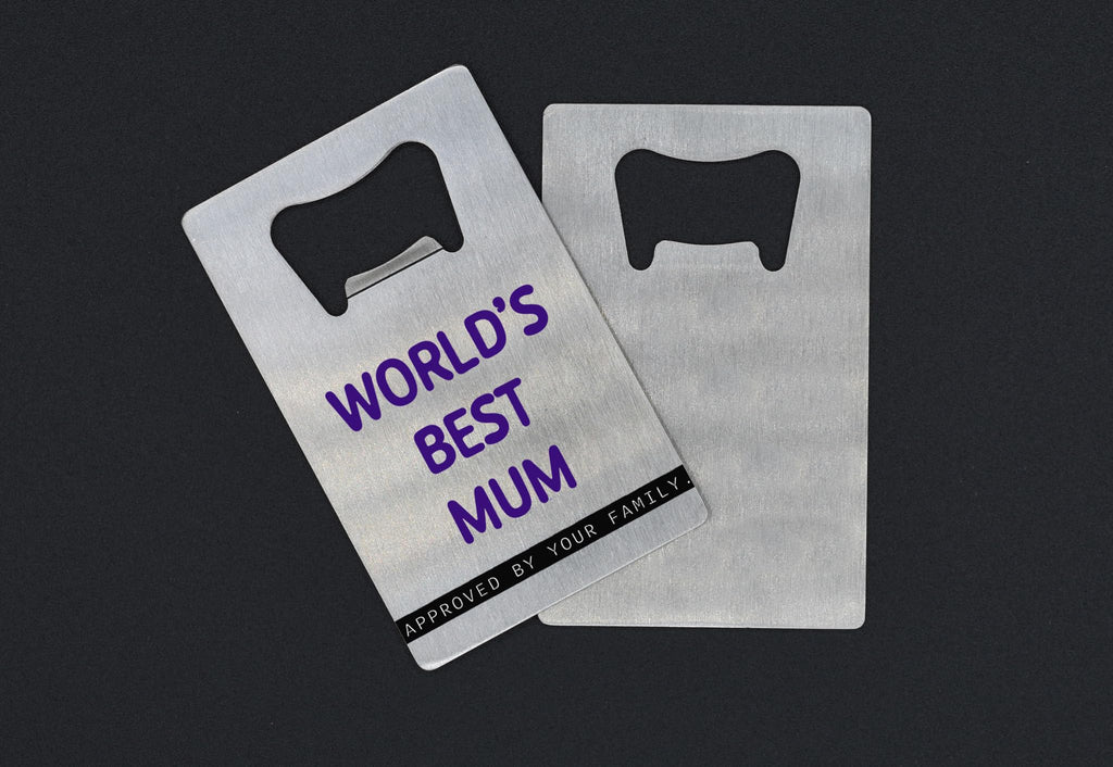 Introducing our Stainless Steel Wallet Size Bottle Opener with a Full Colour design that reads 'World's Best Mum'! This sleek and practical bottle opener is a must-have accessory for any kitchen or bar. Made from quality stainless steel, this flat bottle opener is durable and long-lasting. Its compact size, similar to that of a wallet or card, makes it portable and easy to carry with you wherever you go. Whether you're enjoying a refreshing beer or hosting a party, our wallet size bottle opener is the perfect tool for effortlessly opening all types of bottles. It also makes an ideal Mother's Day gift for all the amazing mums out there. Surprise your mum with this stylish and functional stainless steel bottle opener and show her how much you appreciate her. Get your hands on this kitchen and bar accessory now and enjoy the convenience it offers.
