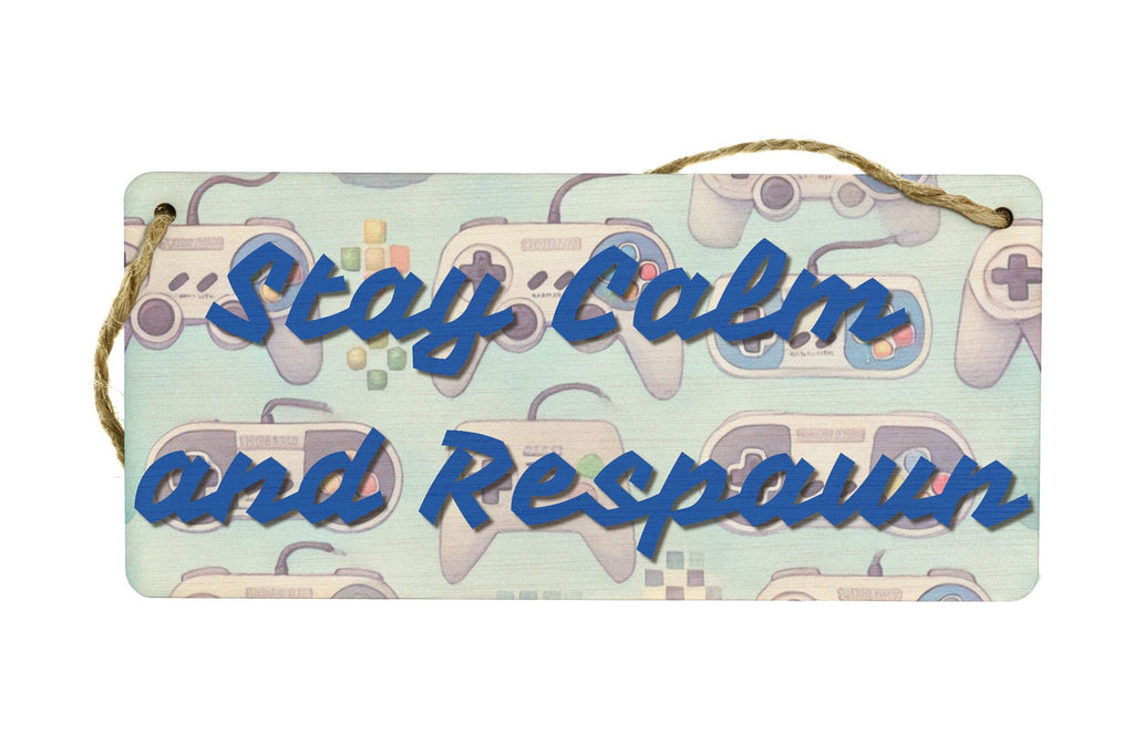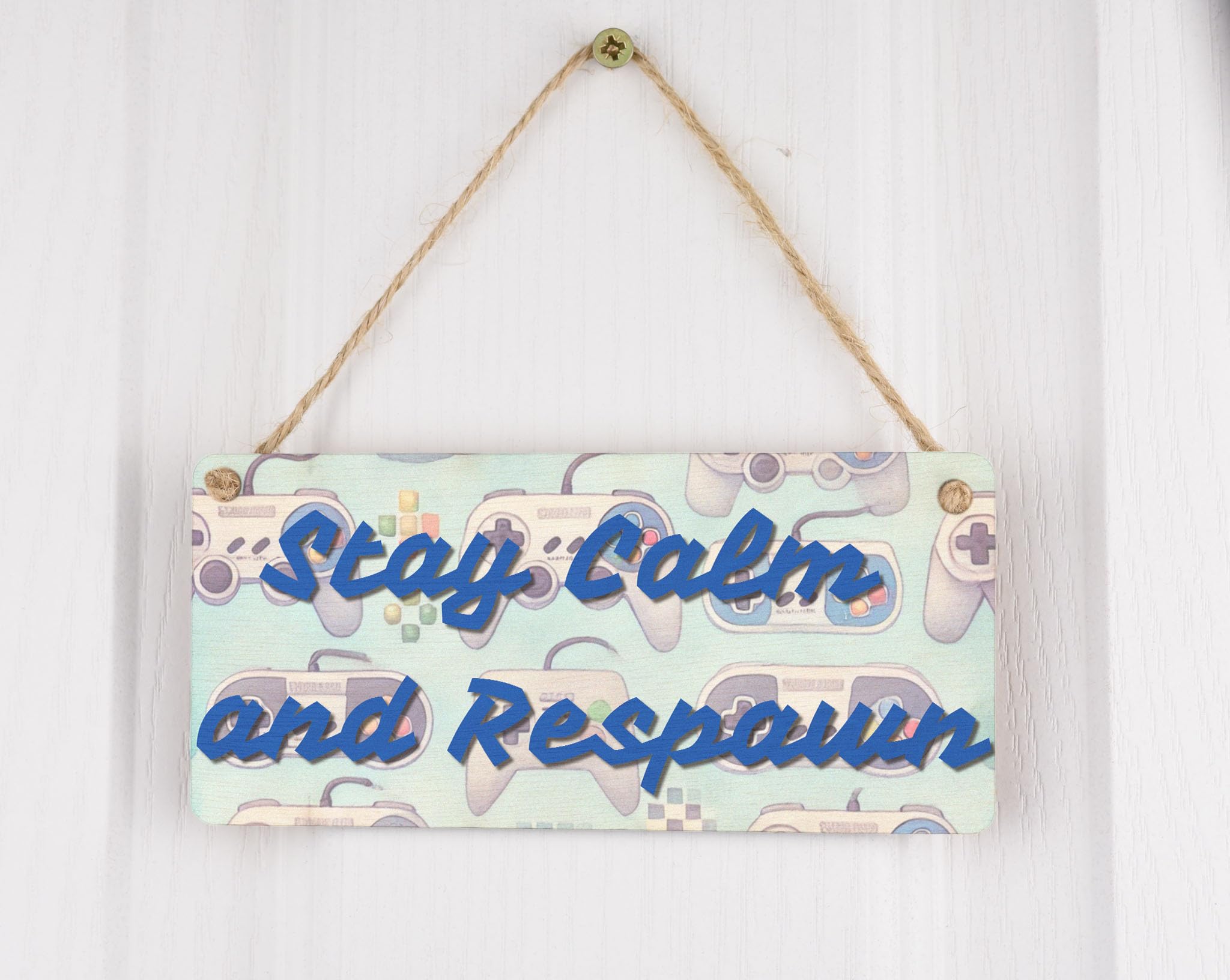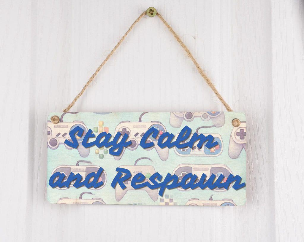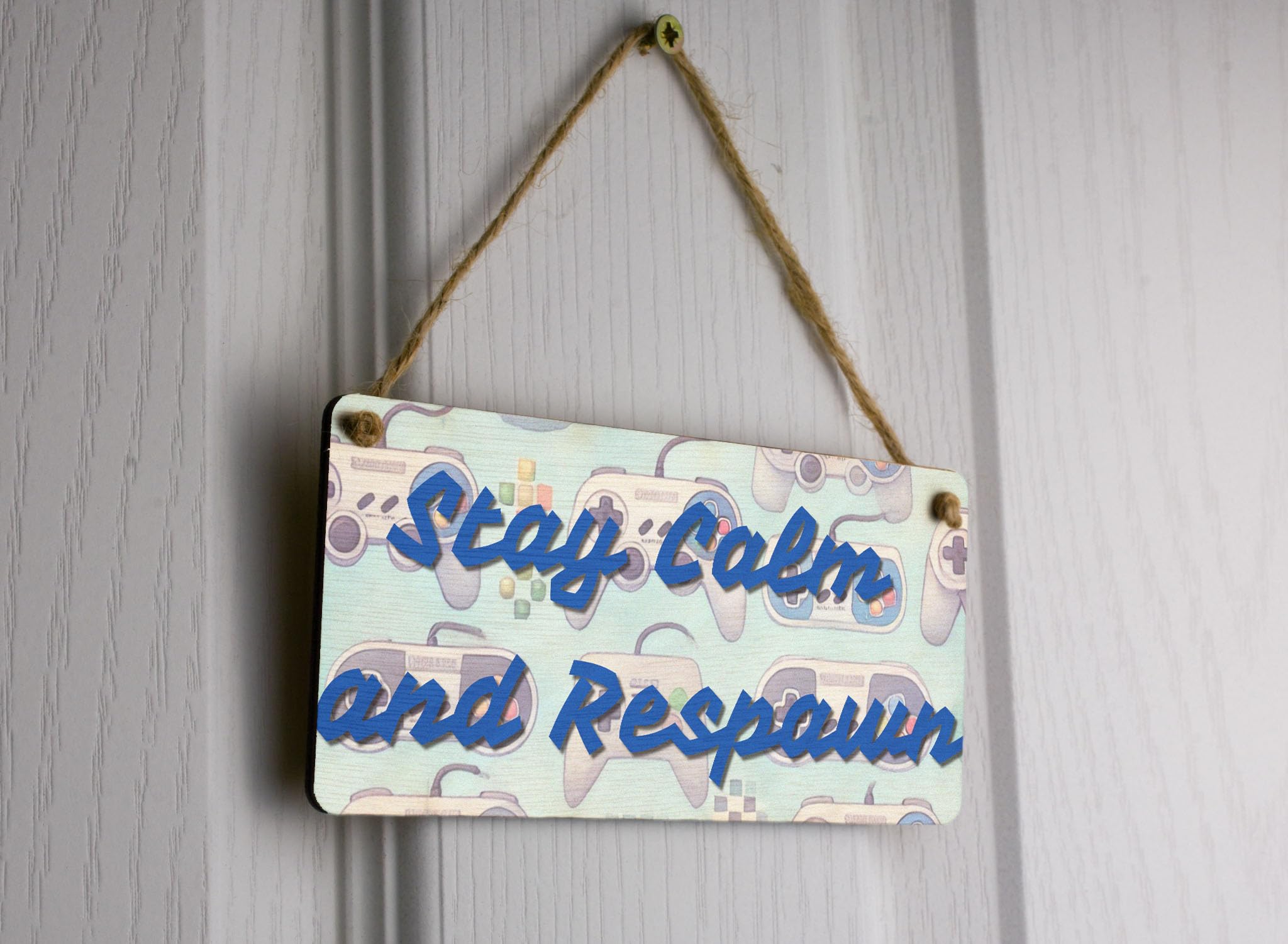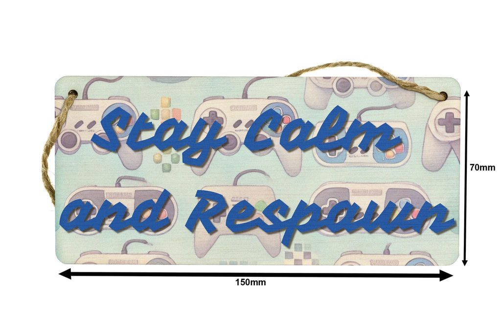 Add a touch of playful geekiness to your gaming space with our 'Stay Calm and Respawn' Wooden Hanging Sign. This retro style video game themed decor features a colourful full colour design showing a watercolour style pattern of game controllers on a blue background. The lighthearted and inspirational message reads 'Stay Calm and Respawn', perfect for any gamer who needs a reminder to keep calm during intense gaming sessions. The AI generated art on this UV printed design is a nod to nerd culture and will make a great addition to your wall art collection. Handcrafted from laser cut plywood, this hanging sign is both durable and stylish. Twine is included for easy hanging, making it a fantastic gift for any gaming enthusiast in your life.