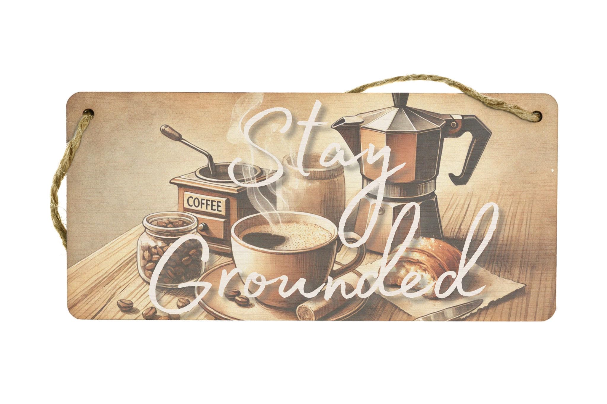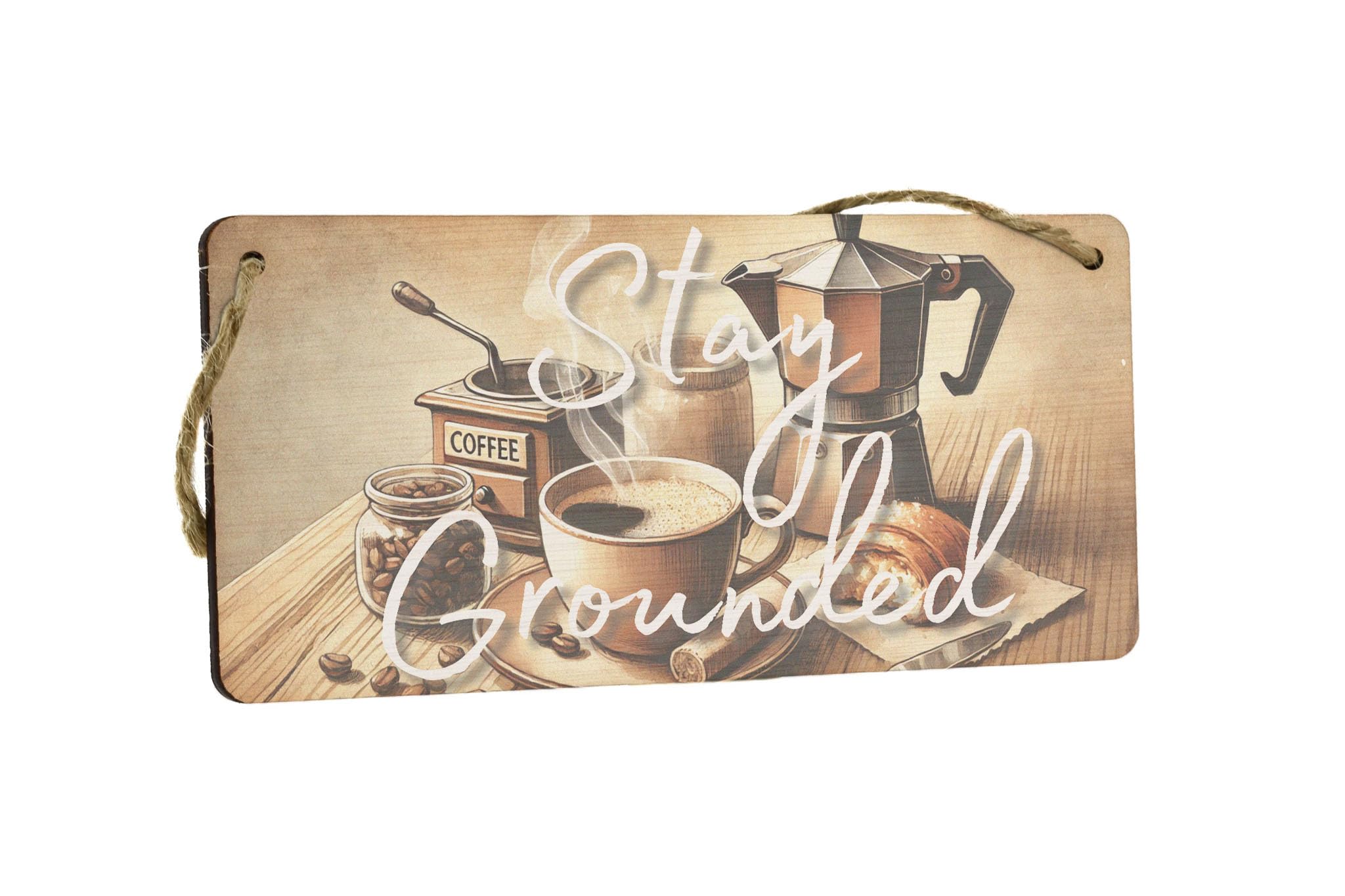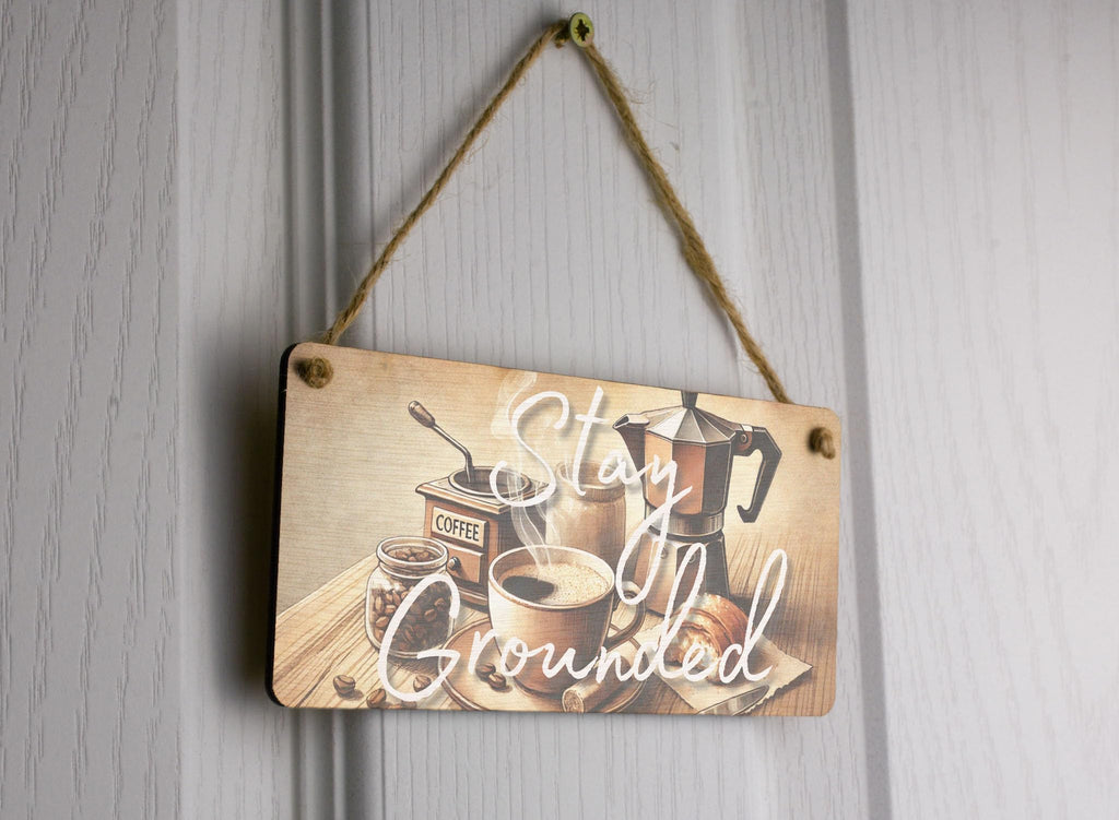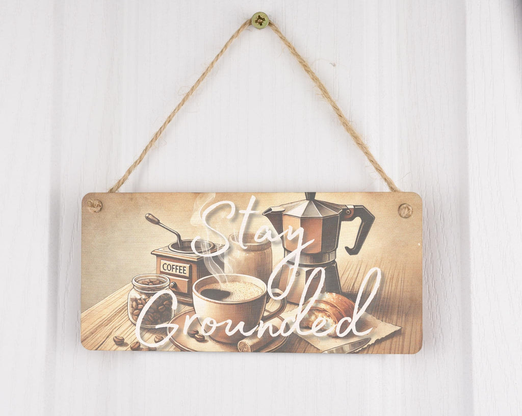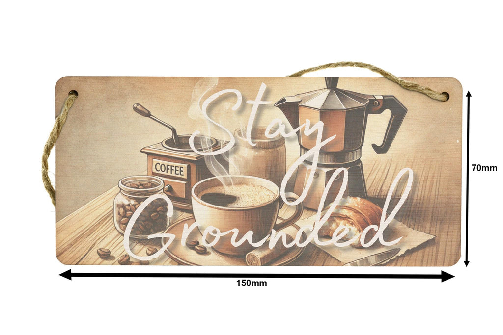 Transform your kitchen into a charming rustic cafe with our 'Stay Grounded: Rustic Cafe Decor Plywood Sign'. This inspirational wall art features a full colour design depicting a watercolour style coffee set, perfect for adding warmth and motivation to your morning routine. Showcasing a steaming cup, moka pot, beans, and espresso grinder, this handcrafted laser cut plywood sign reads 'Stay Grounded', reminding you to stay cosy and grounded as you start your day. The UV printed design is created using AI generated art, ensuring a quality finish that will brighten up any space. Complete with twine for easy hanging, this unique piece of home decor is ideal for coffee lovers looking to create a cosy cafe atmosphere right in their own home.
