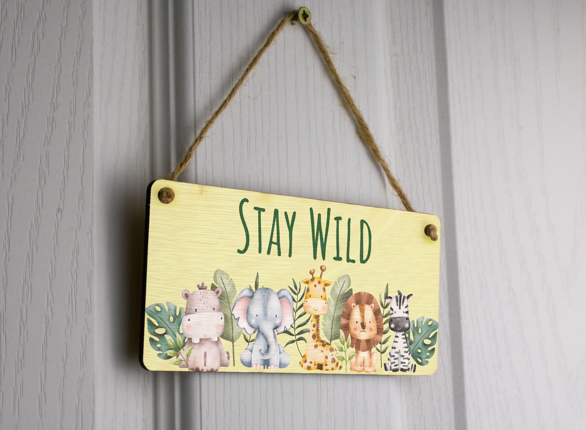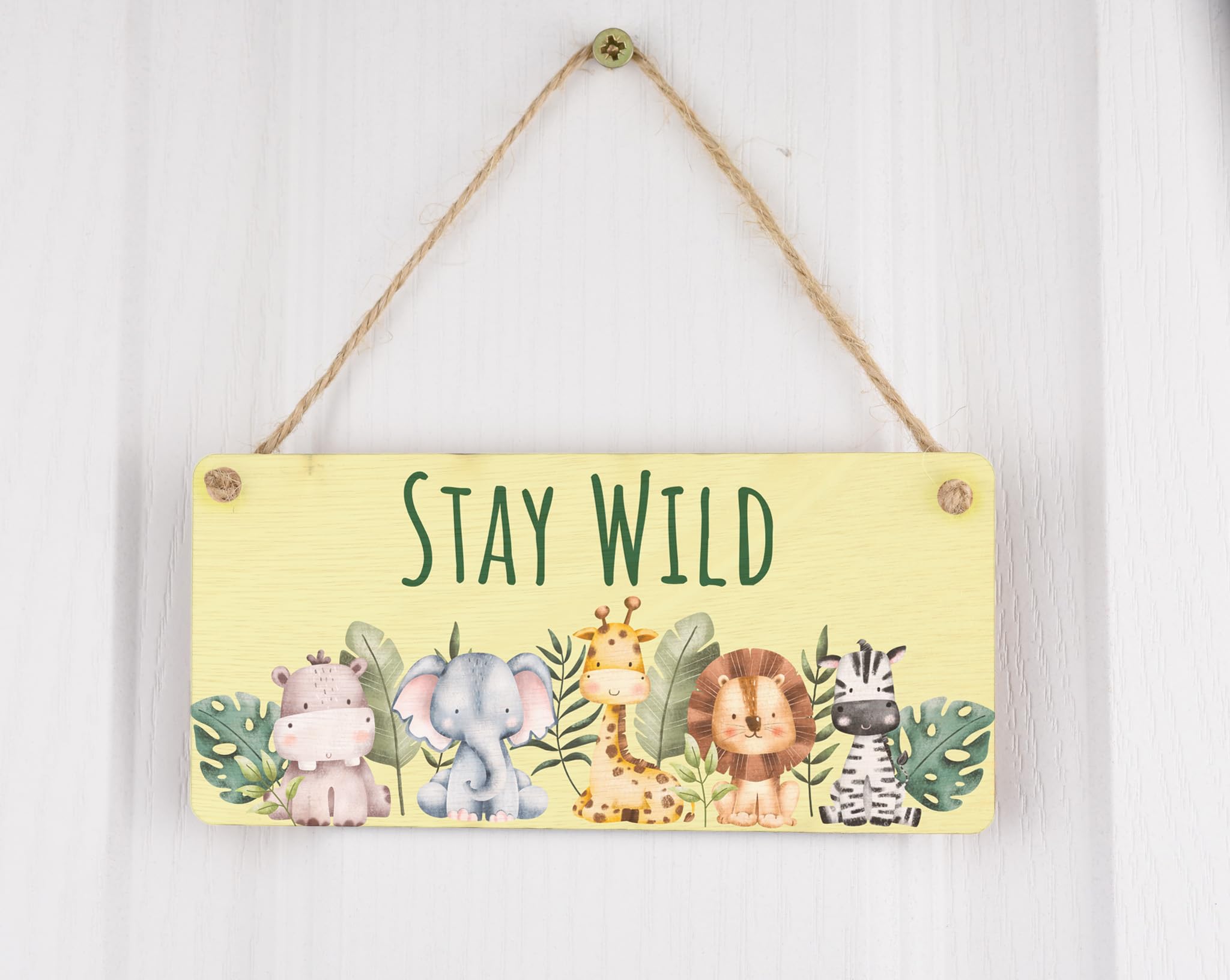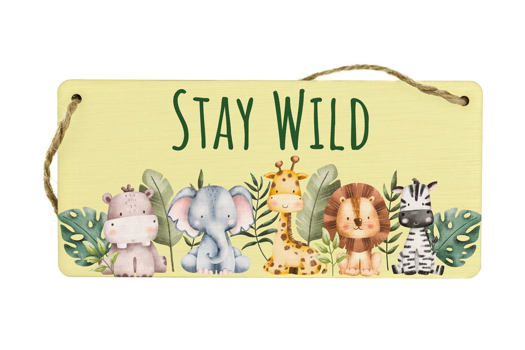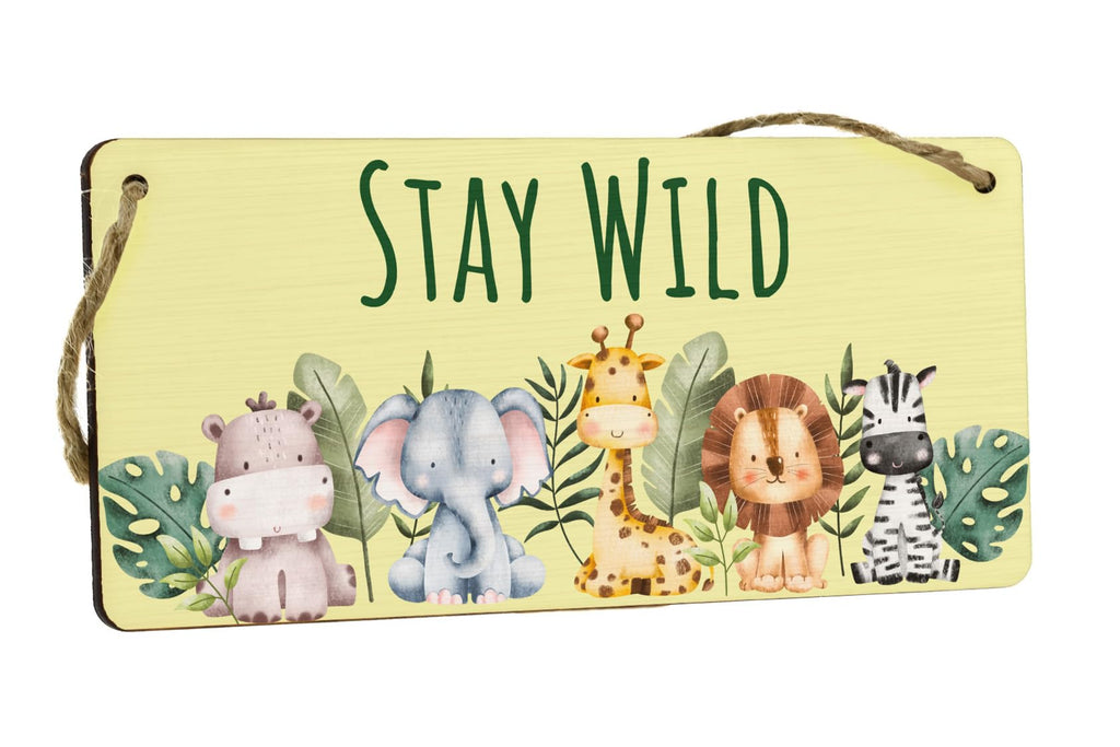 Add a touch of adventure to your little one's room with our Stay Wild Safari Full Color Plywood Hanging Sign. Made from high-quality plywood, this charming hanging sign features a delightful safari theme that will surely captivate your child's imagination. The vibrant full-color design adds a pop of excitement to any kids' animal room or nursery decor. The sign reads 'Stay Wild' in bold and playful lettering, reminding your child to embrace their inner explorer. Hang it on the wall or door to create a fun and inviting atmosphere in your home. This animal hanging sign is a perfect addition to any wild-inspired room decor, bringing a touch of nature indoors. Its sturdy construction ensures long-lasting durability, and the lightweight design makes it easy to hang anywhere. Let your child's imagination run wild with our Safari Nursery Decor, and turn their room into a whimsical safari adventure with this charming plywood hanging sign.