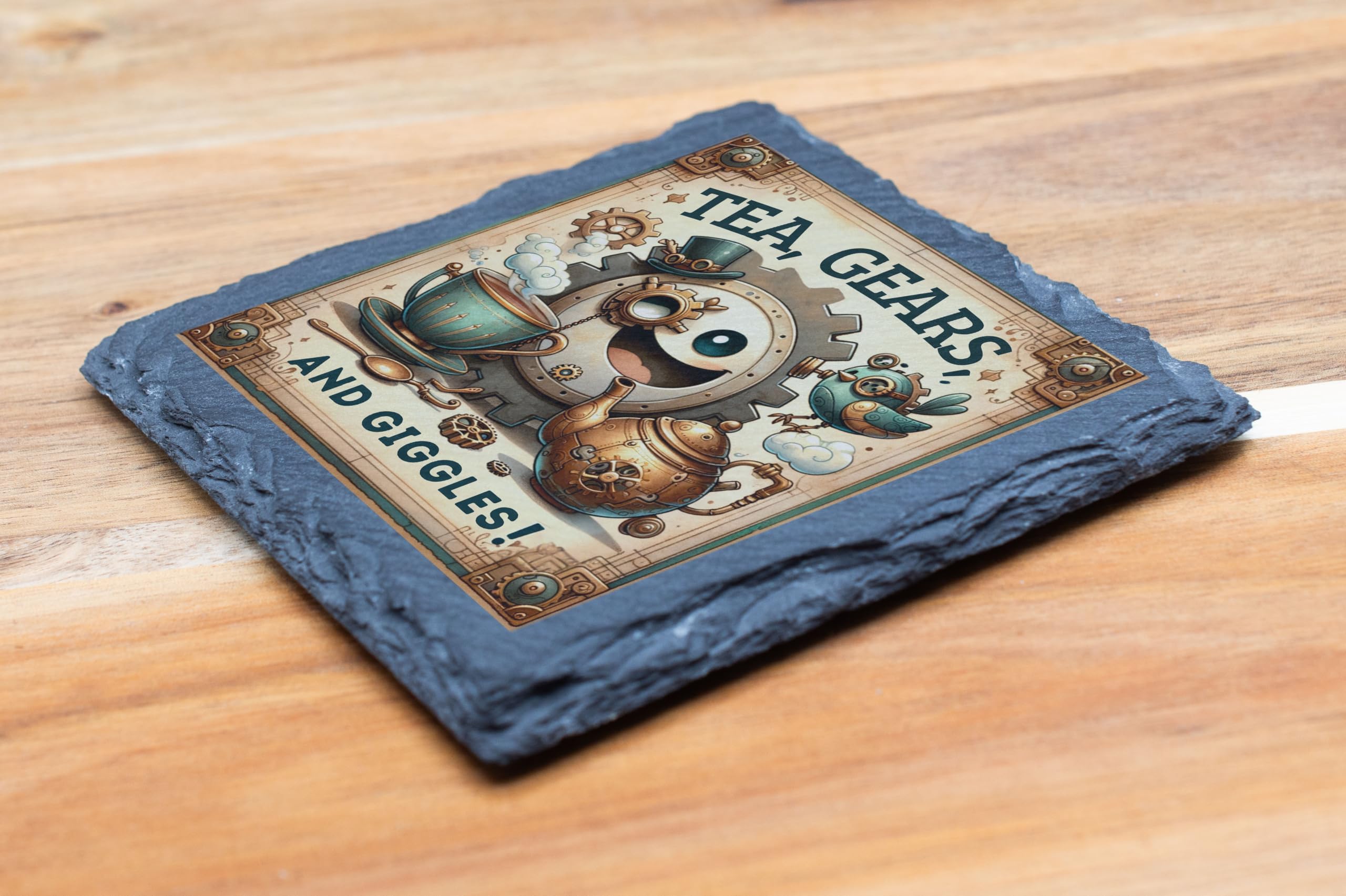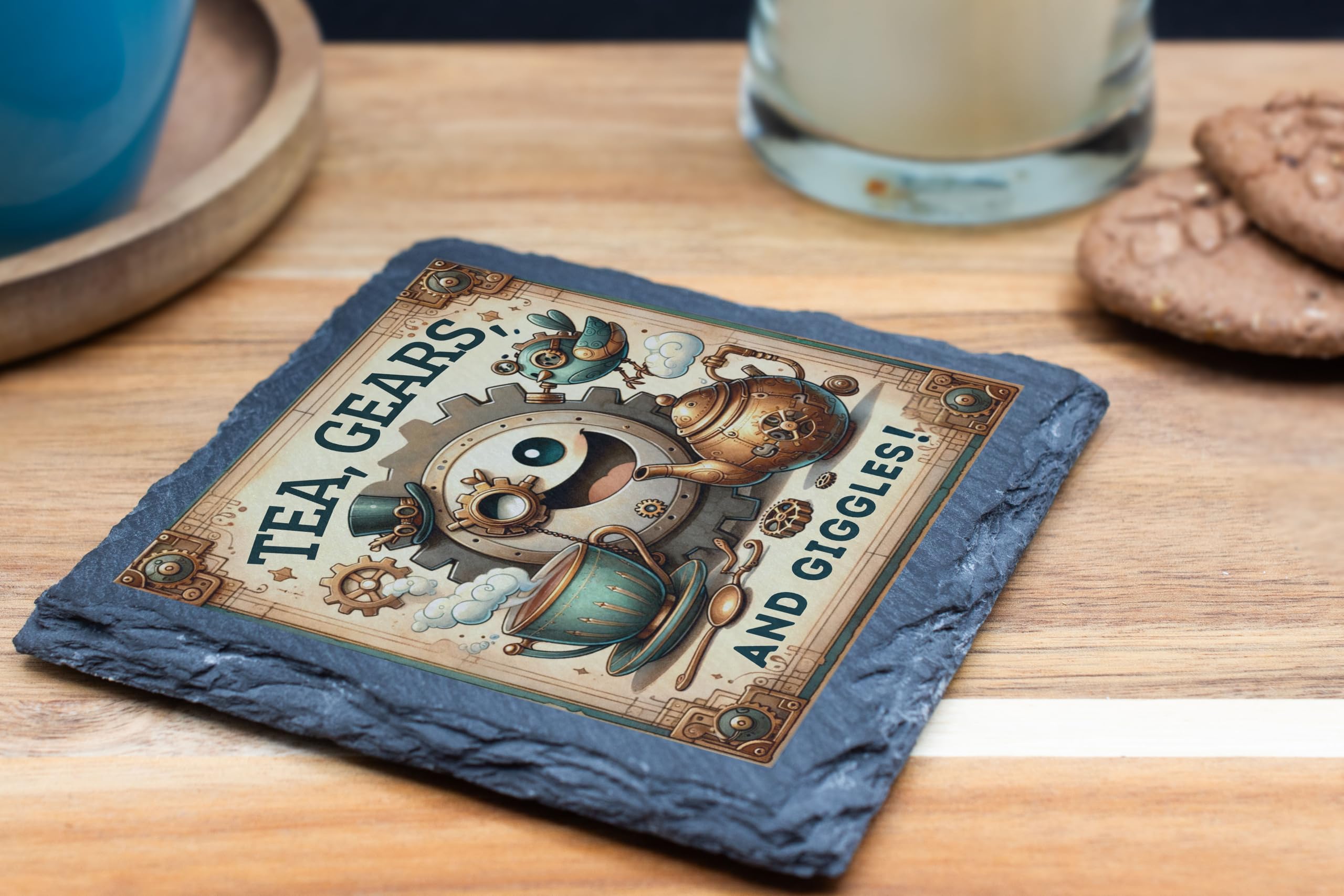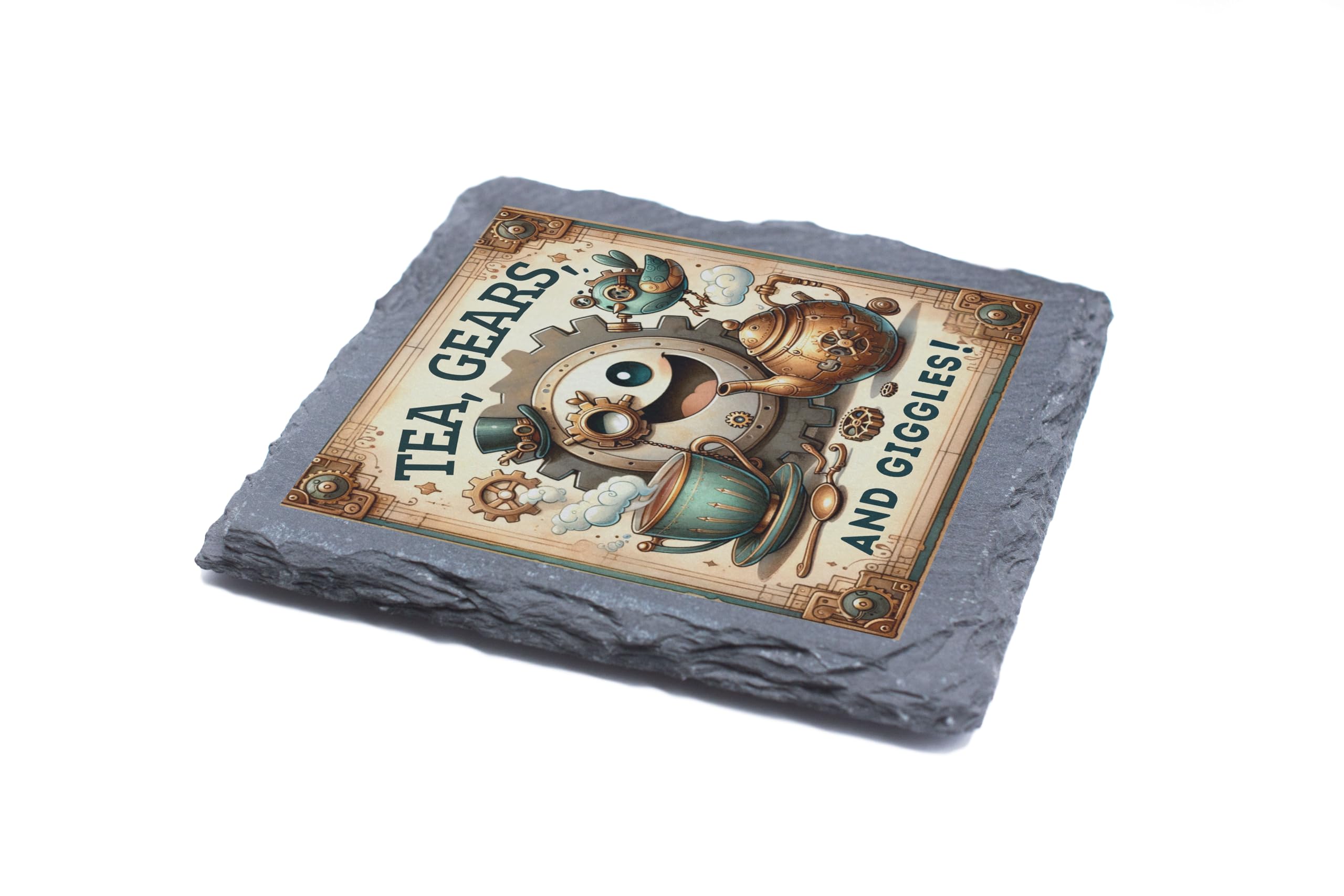 Add a touch of playful industrial charm to your space with the Steampunk Slate Coaster, "Tea, Gears, and Giggles." This intricately designed coaster captures the whimsy of steampunk culture, combining vintage teapots, gears, and lighthearted artistry. Crafted from premium slate, this coaster is as durable as it is delightful, providing heat resistance and surface protection. Whether you?re sipping tea or enjoying a steampunk-inspired gathering, this coaster is the perfect blend of functionality and decoration. It also makes a unique gift for fans of creative designs and steampunk aesthetics. Bring joy, style, and giggles to your home today!